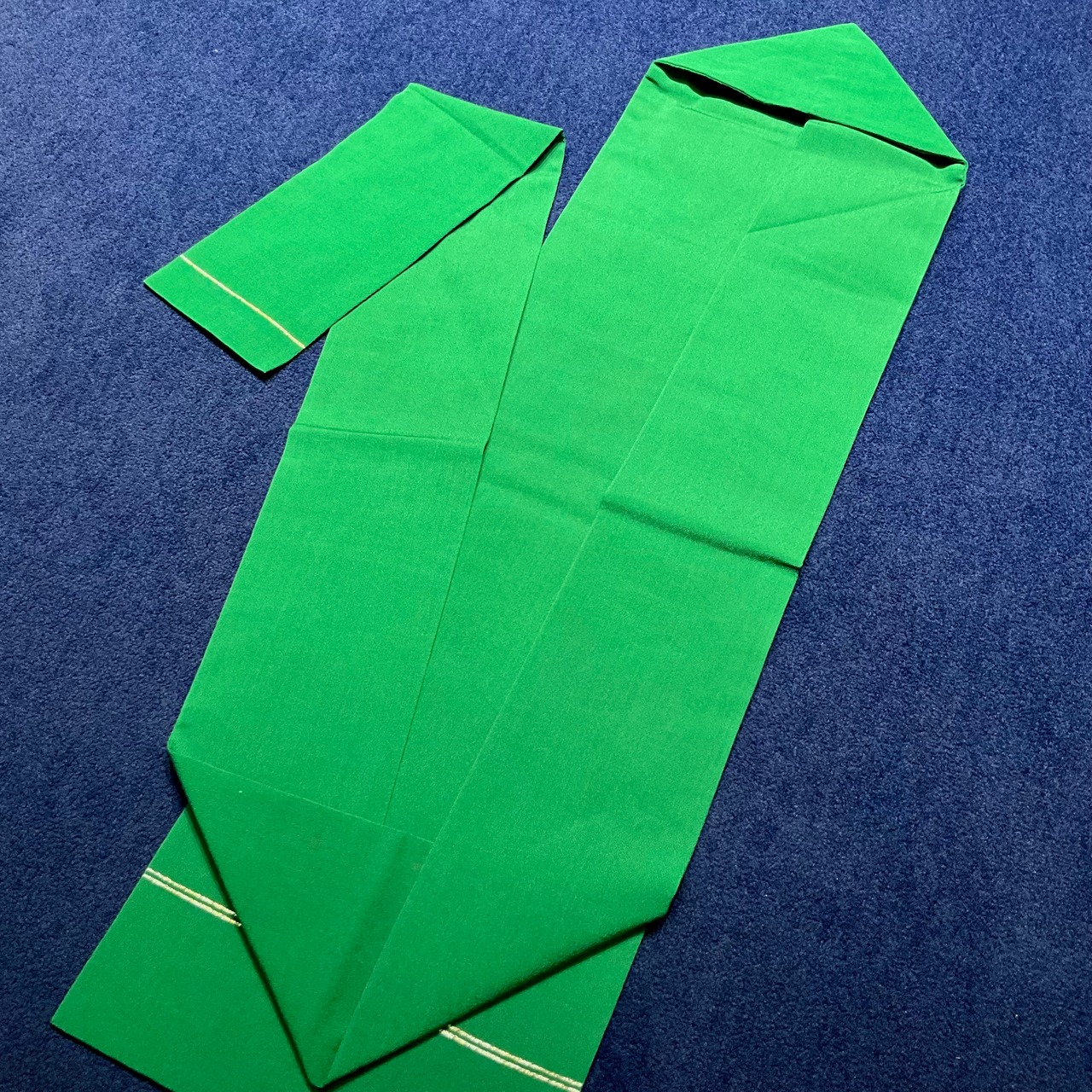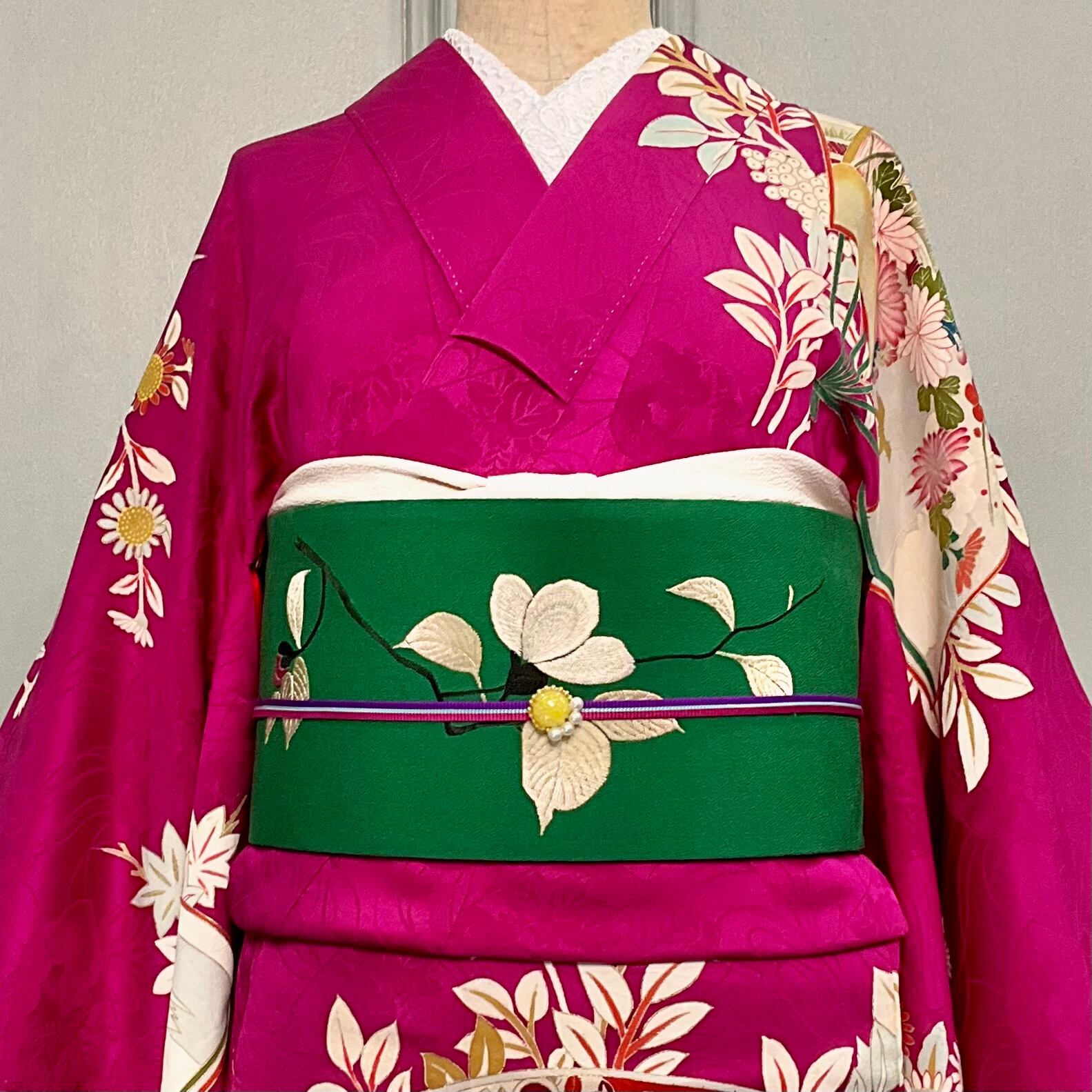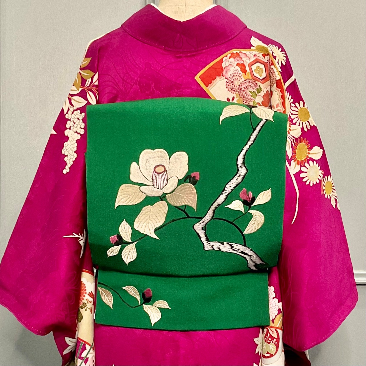 グリーン地に、白い椿の刺繍が美しいアンティーク名古屋帯です