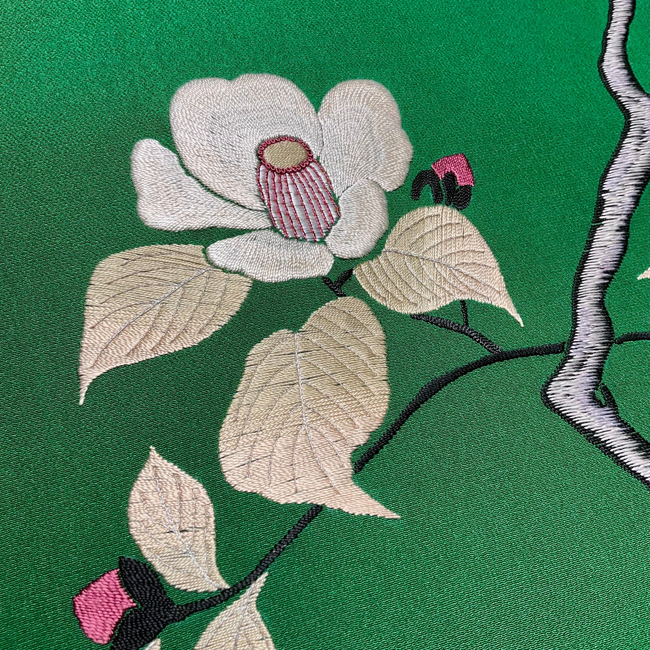 アンティークらしい発色の綺麗なグリーン地に、白い椿の花やローズピンクの蕾の刺繍が目を惹きます*