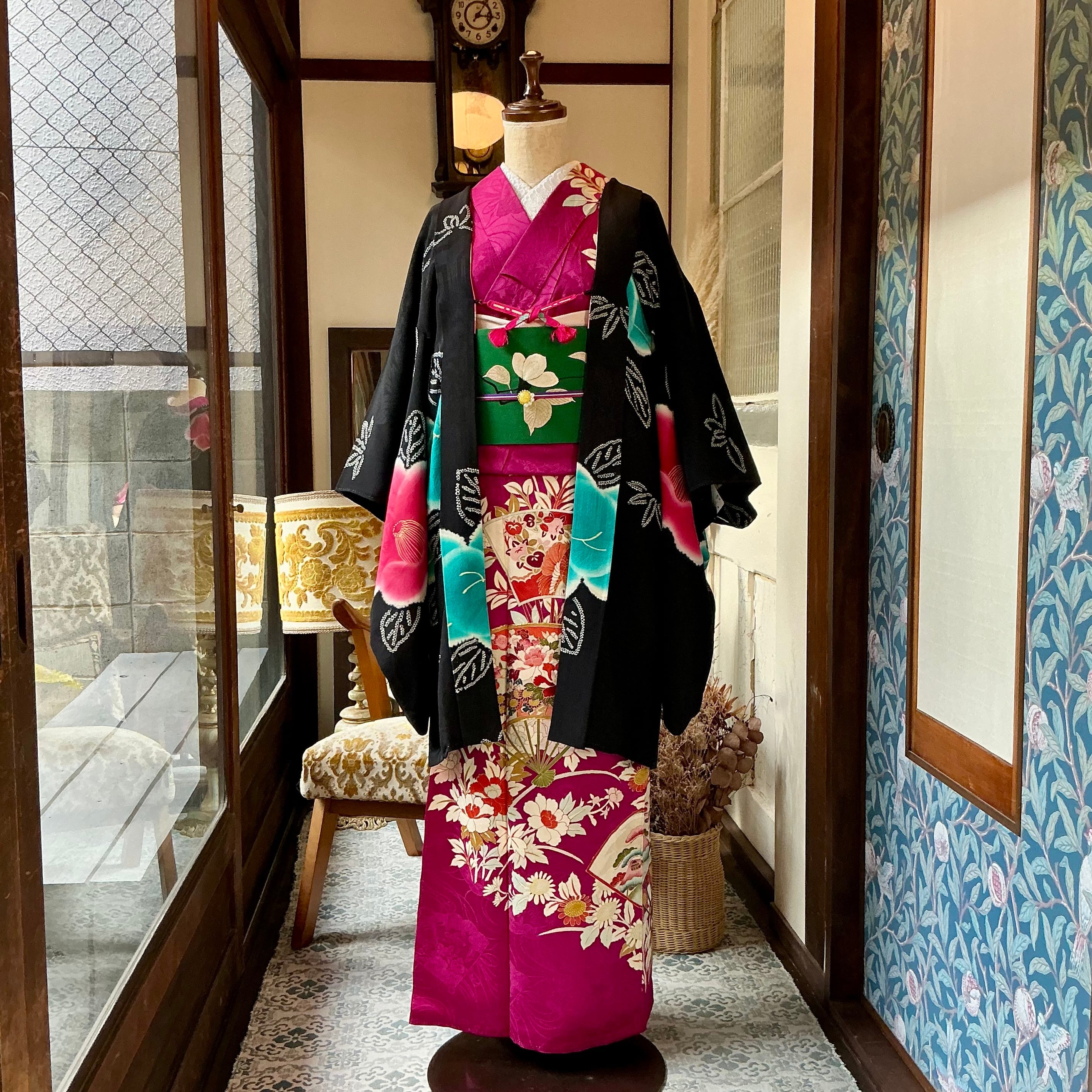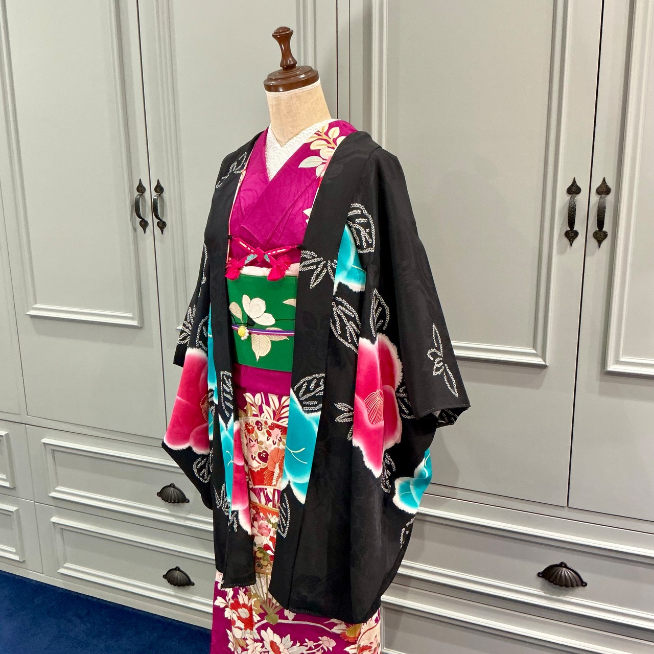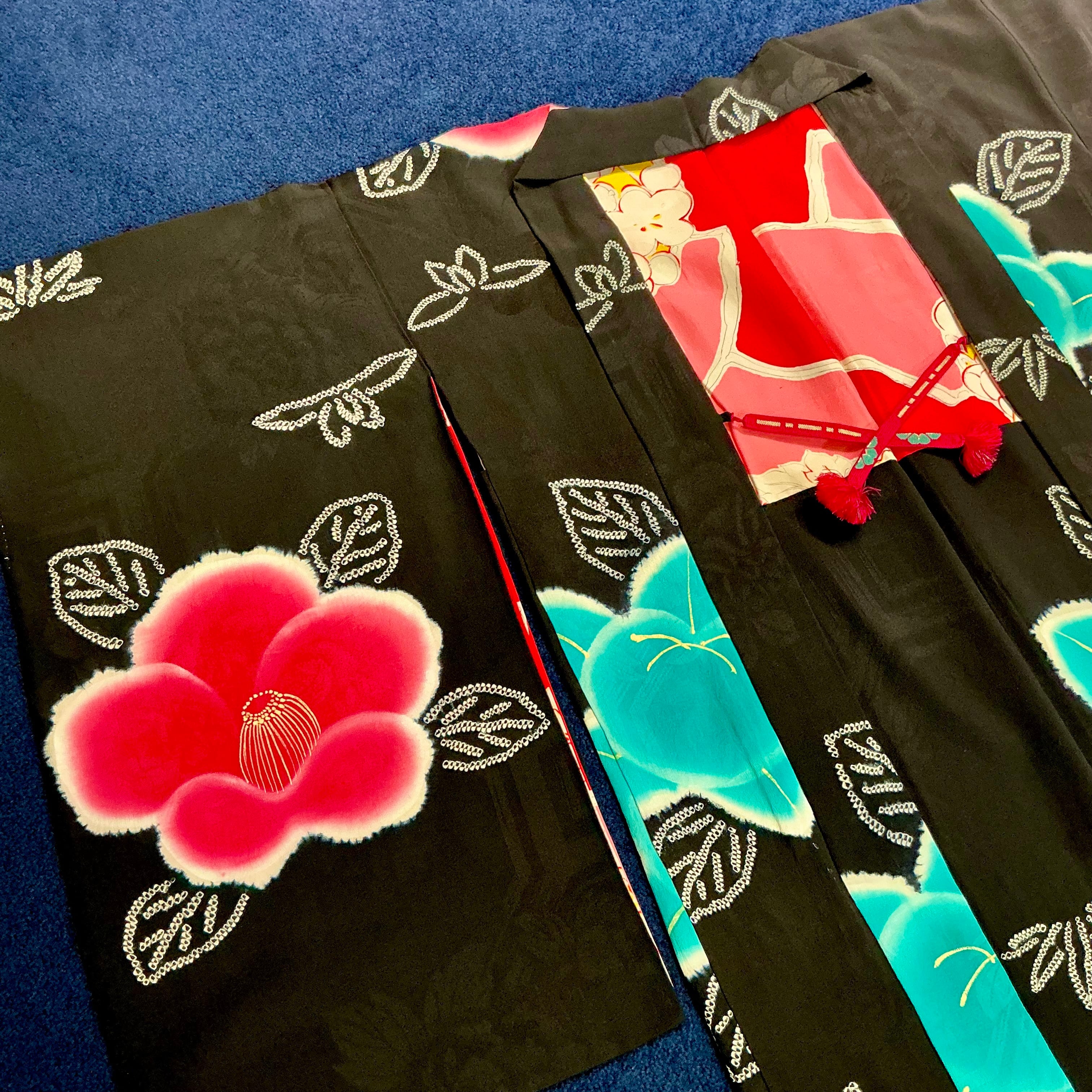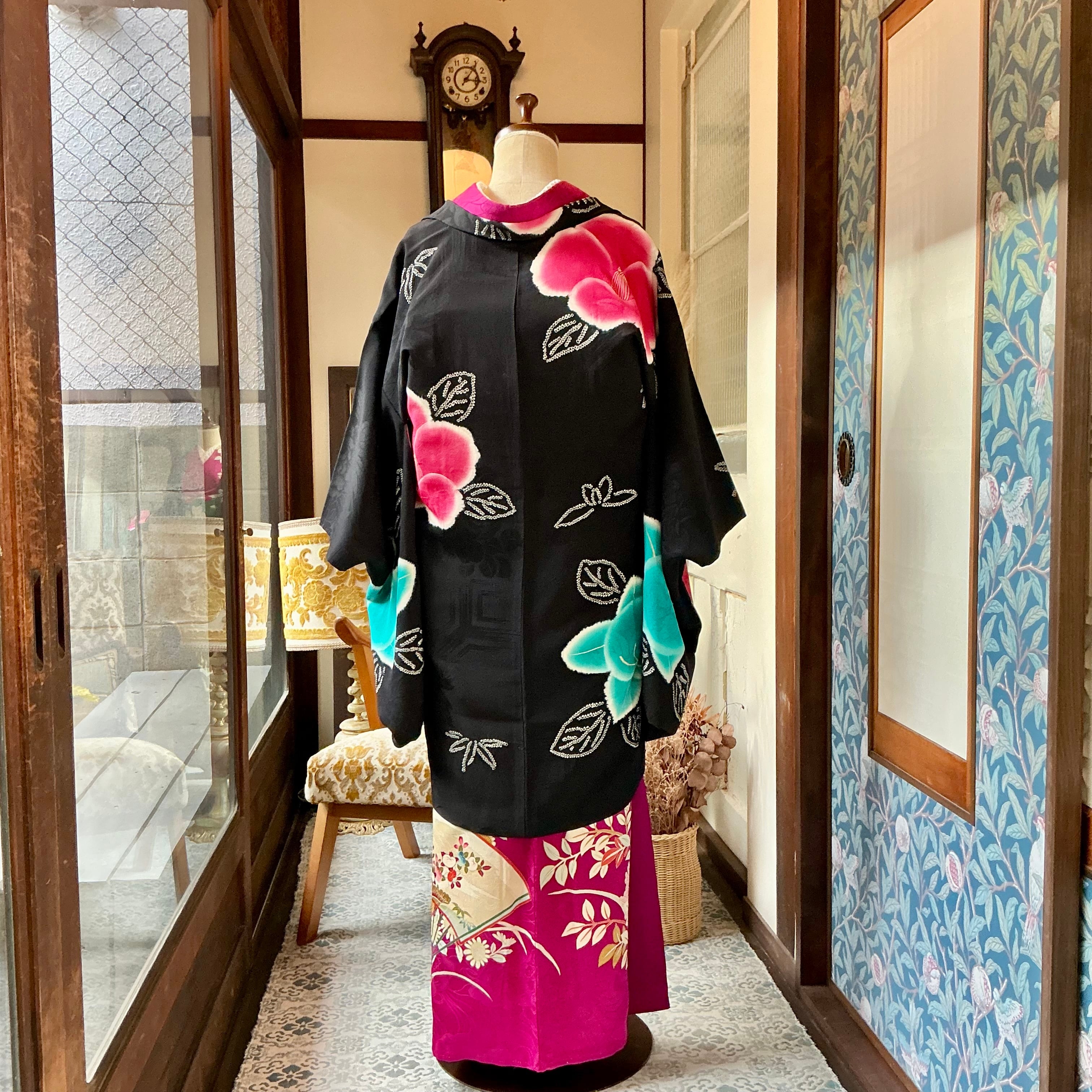 黒地に、紅色の椿と浅葱色の橘が大胆にも大きく描かれたアンティーク長羽織です