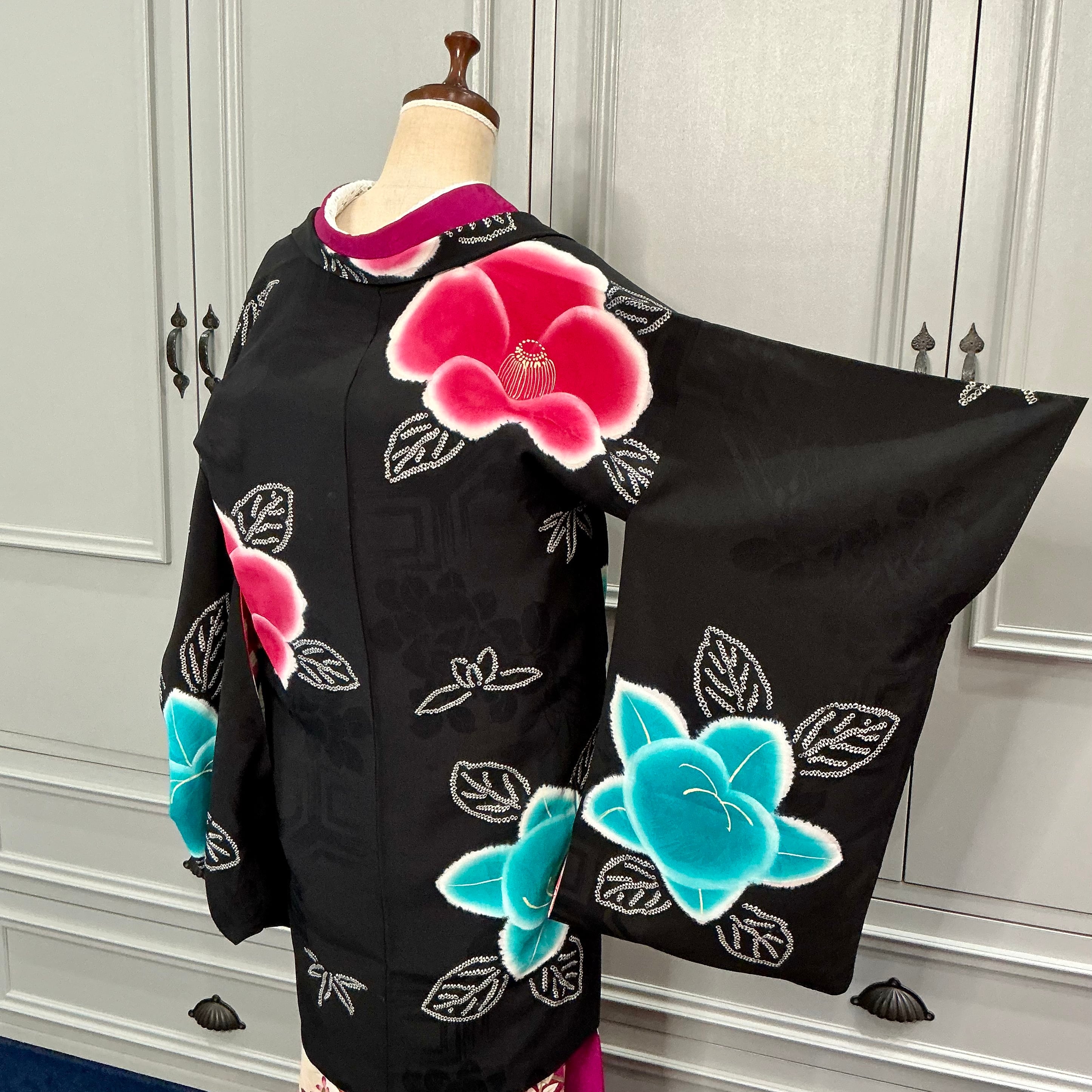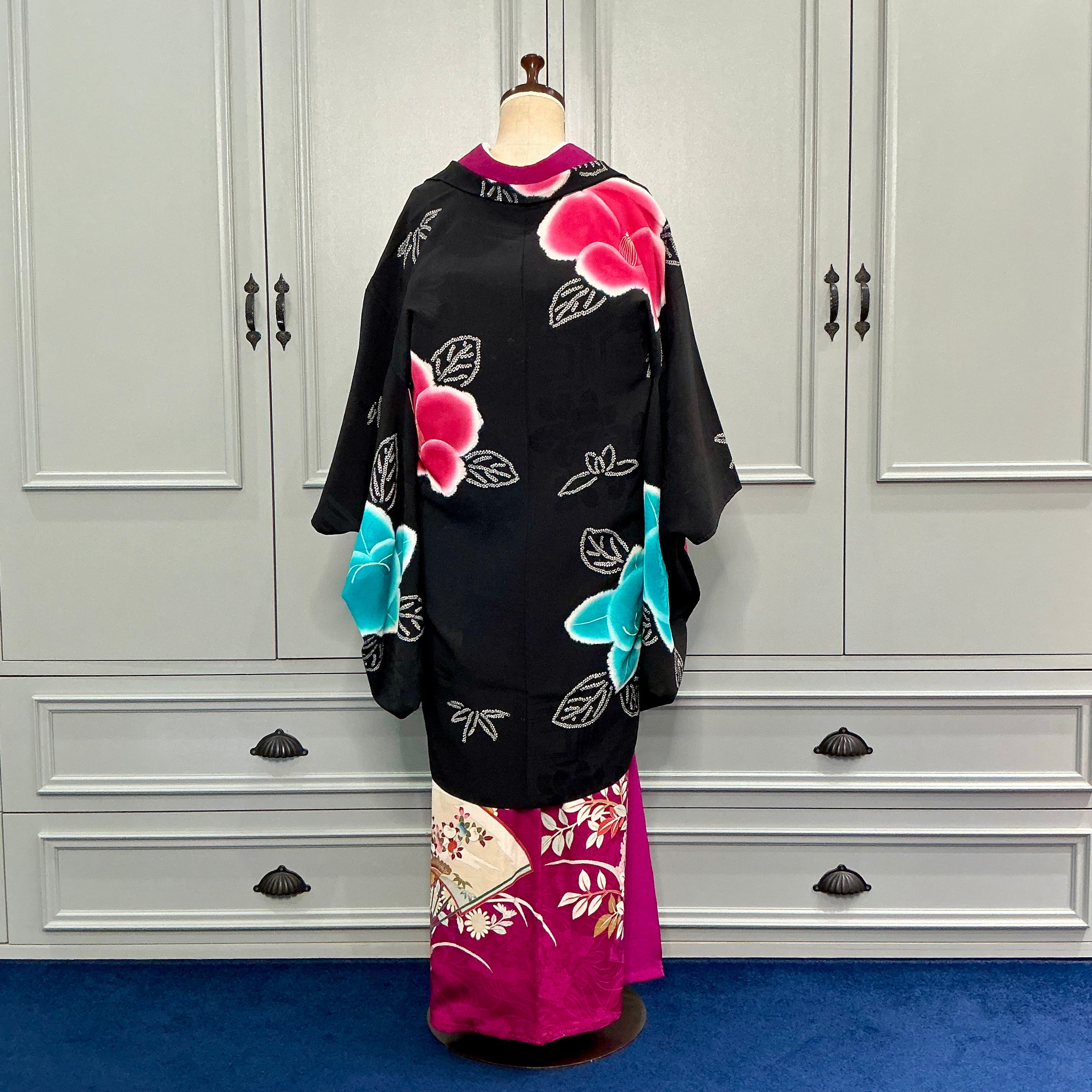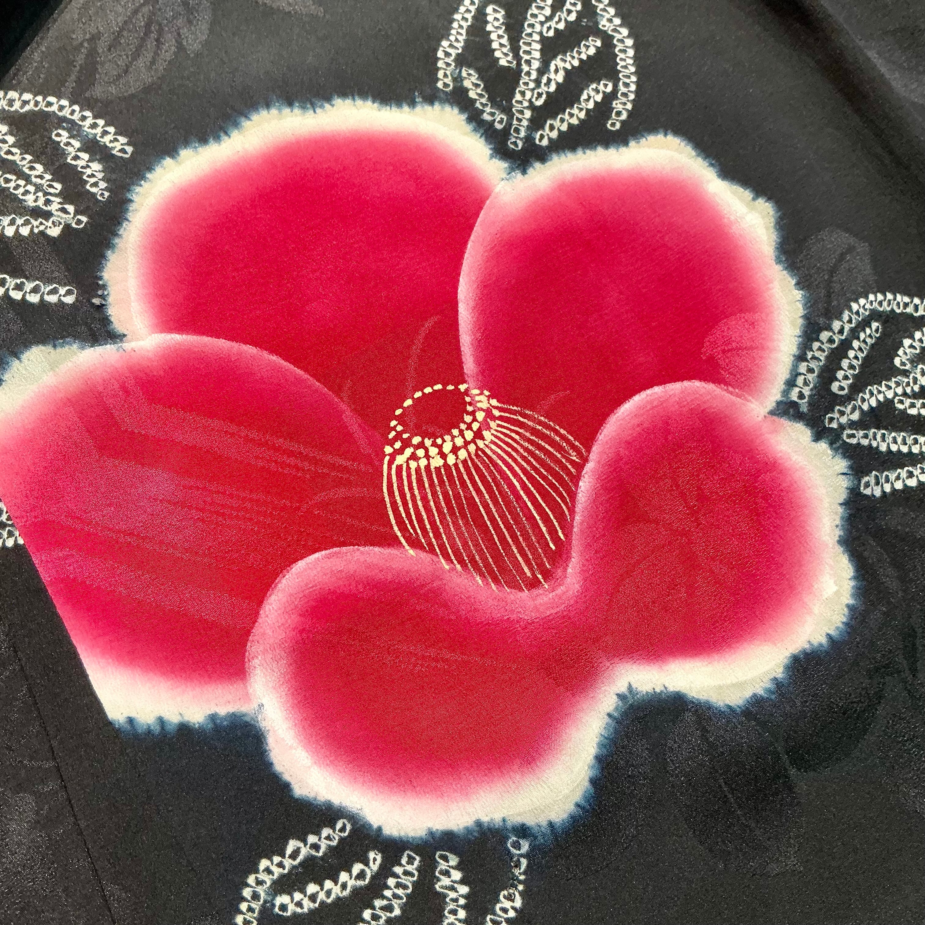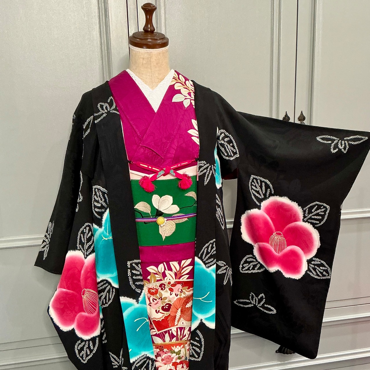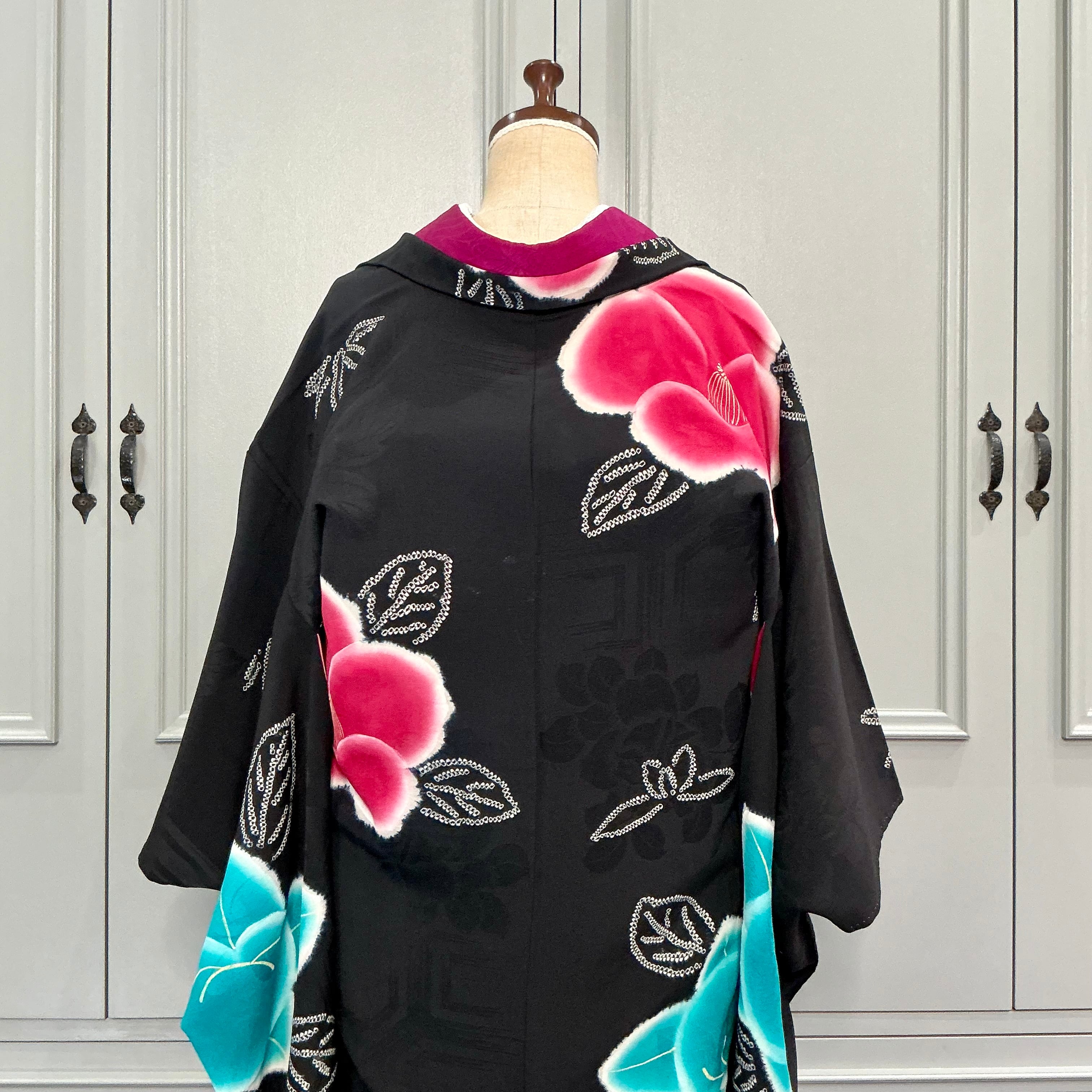 黒地に、紅色の椿と浅葱色の橘が大胆にも大きく描かれたアンティーク長羽織です