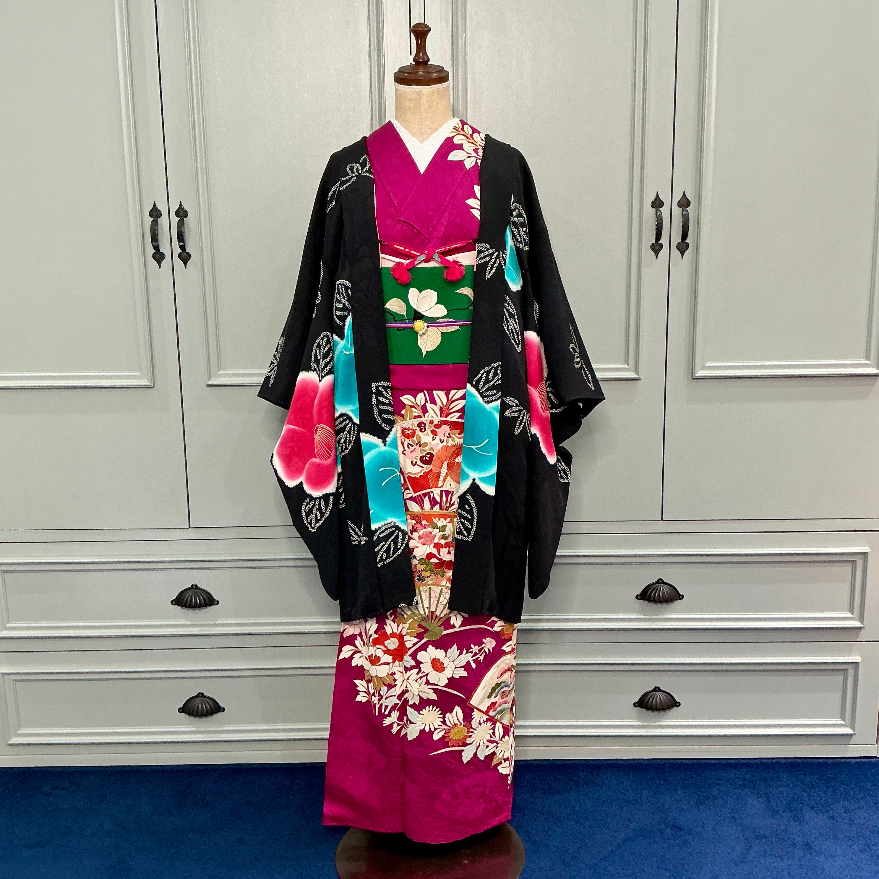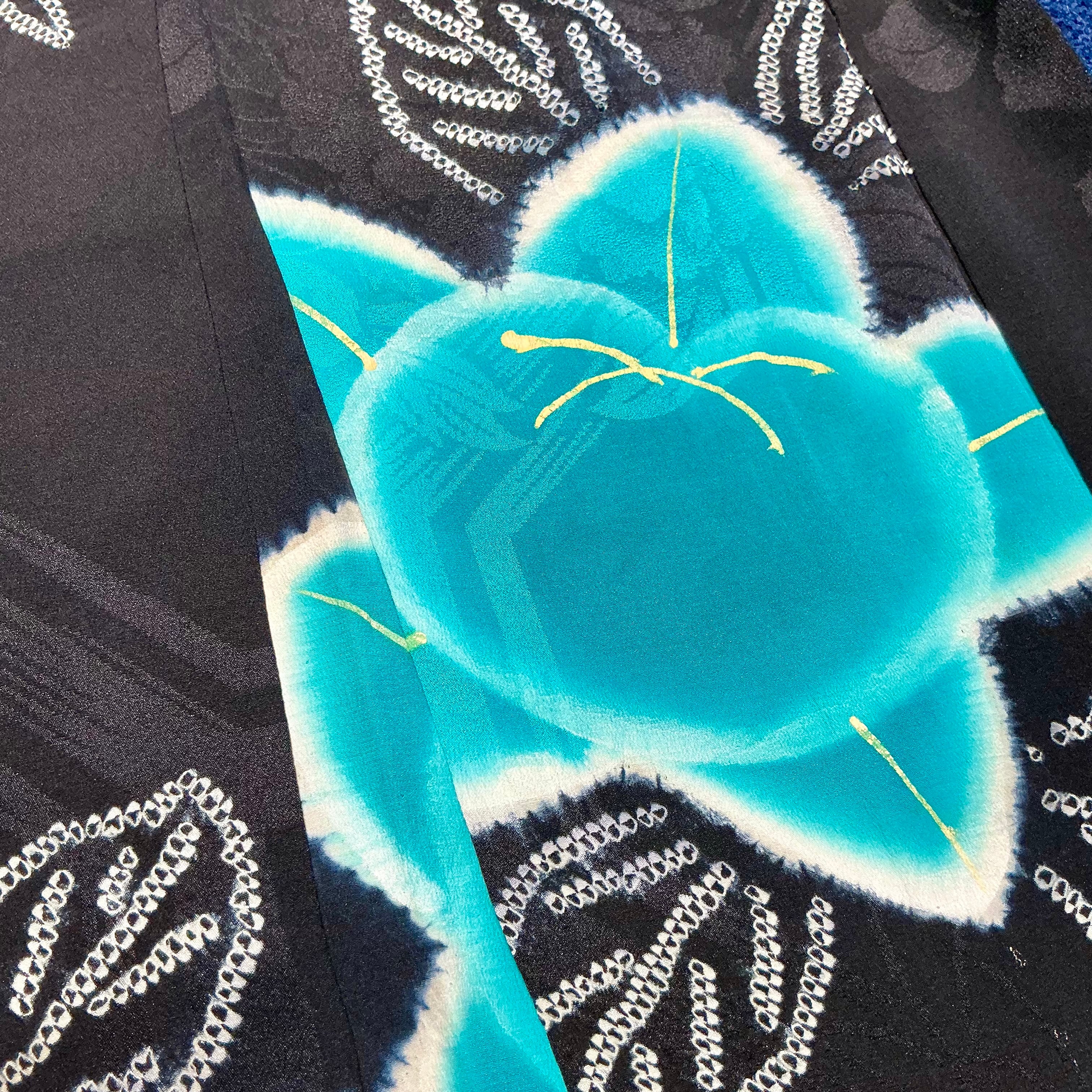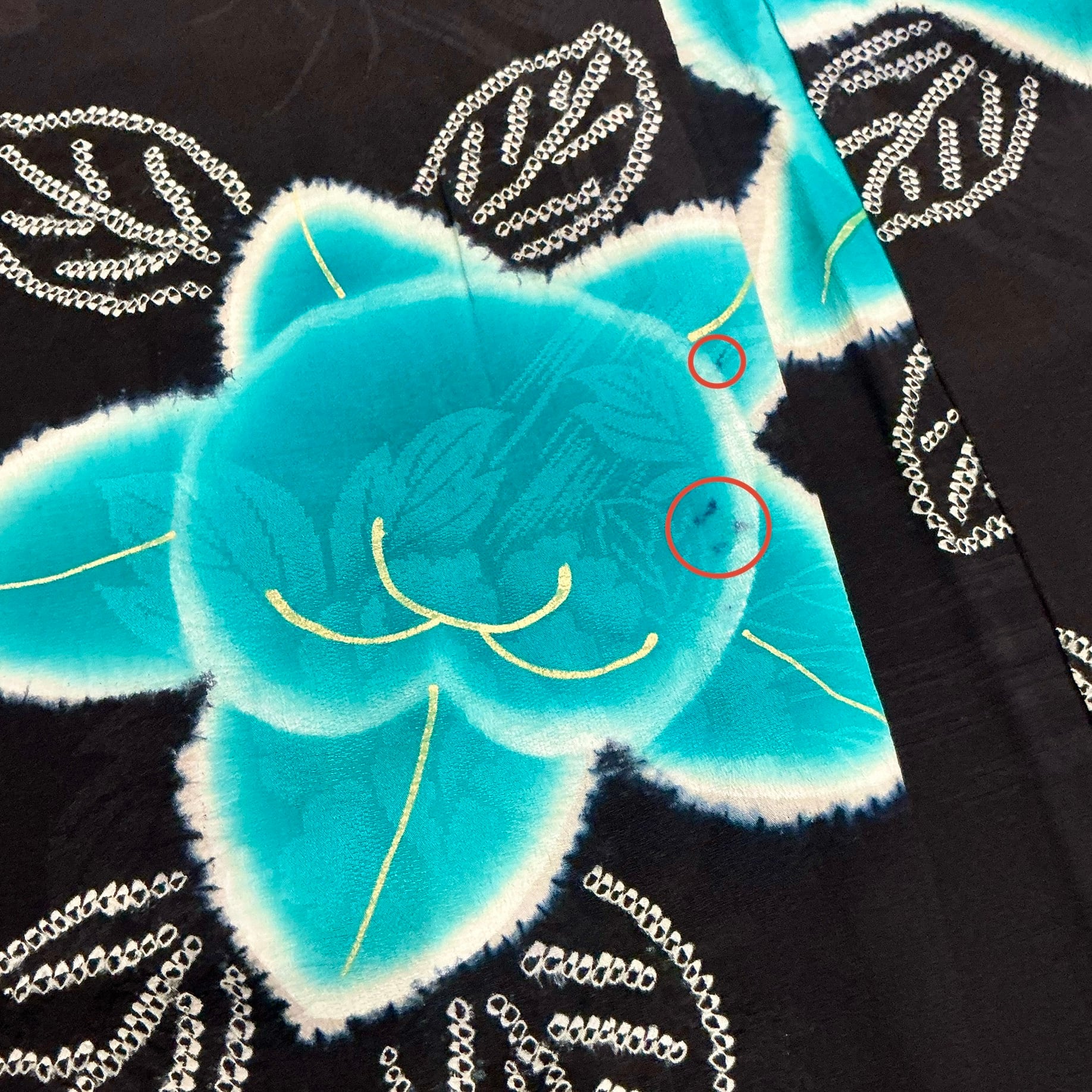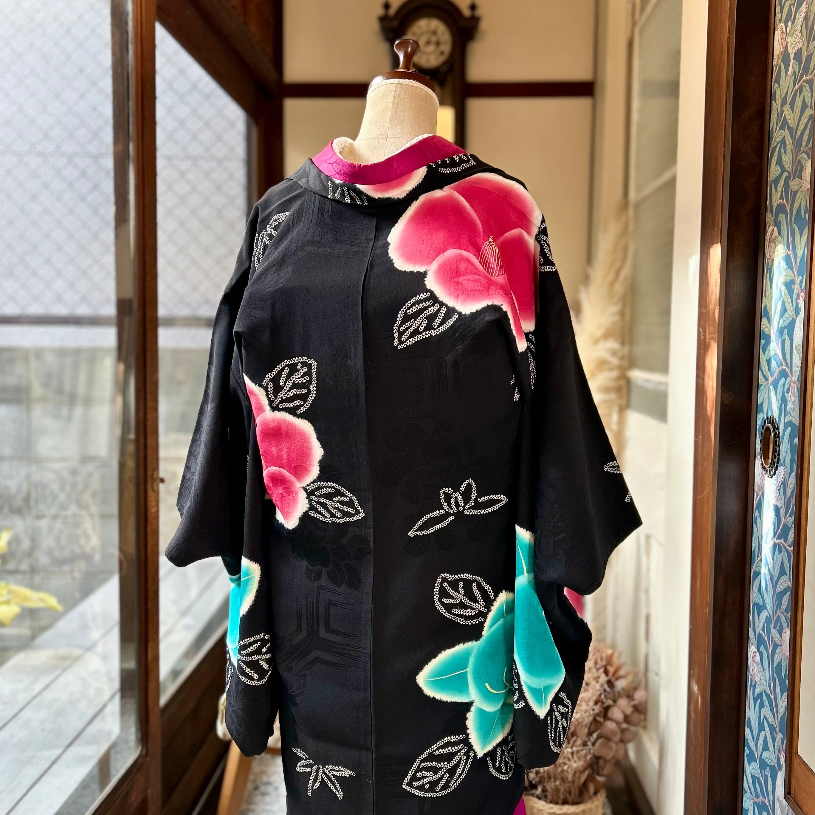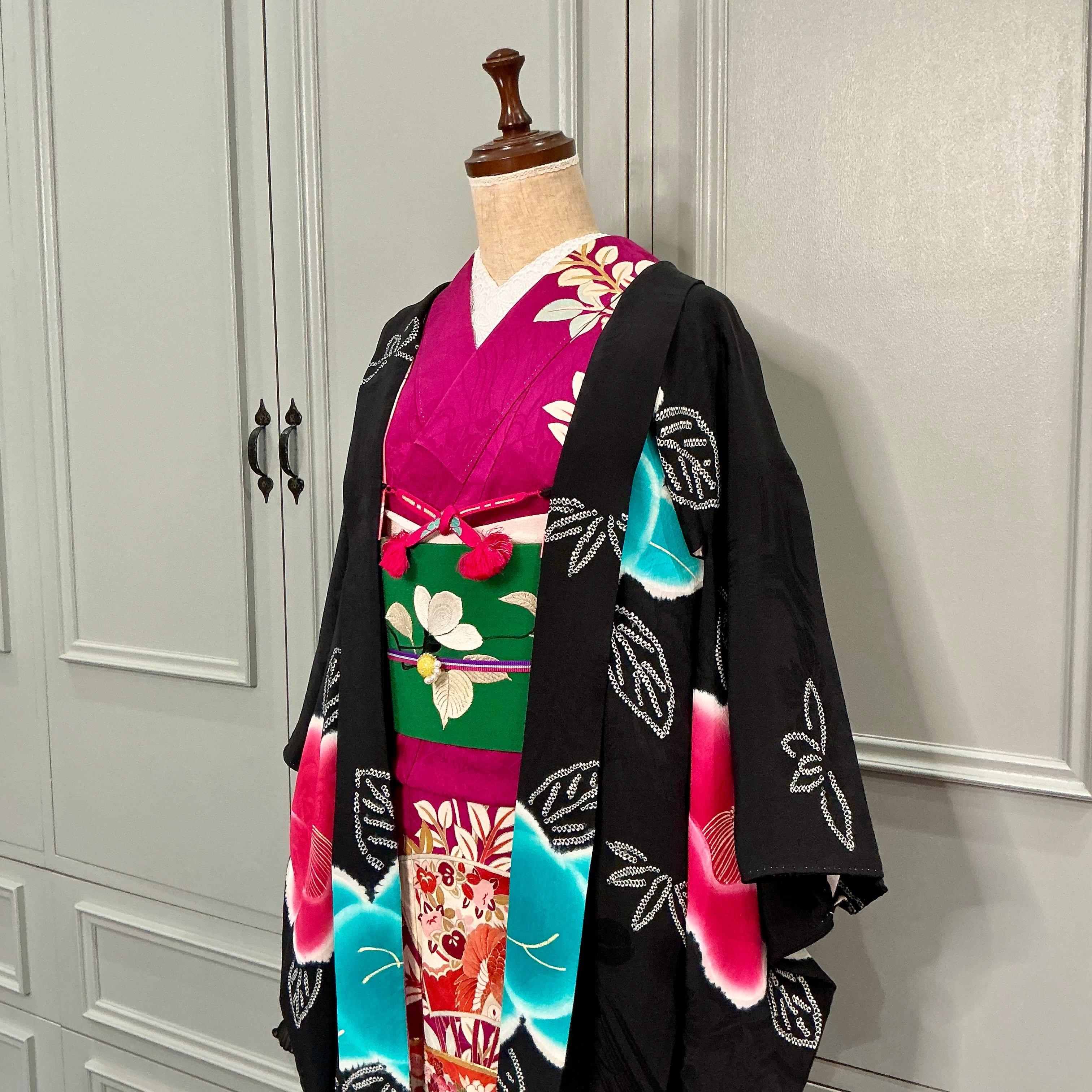 夜に咲く色彩*黒 椿 橘 絞り 大柄 紅 浅葱 アンティーク長羽織 B393