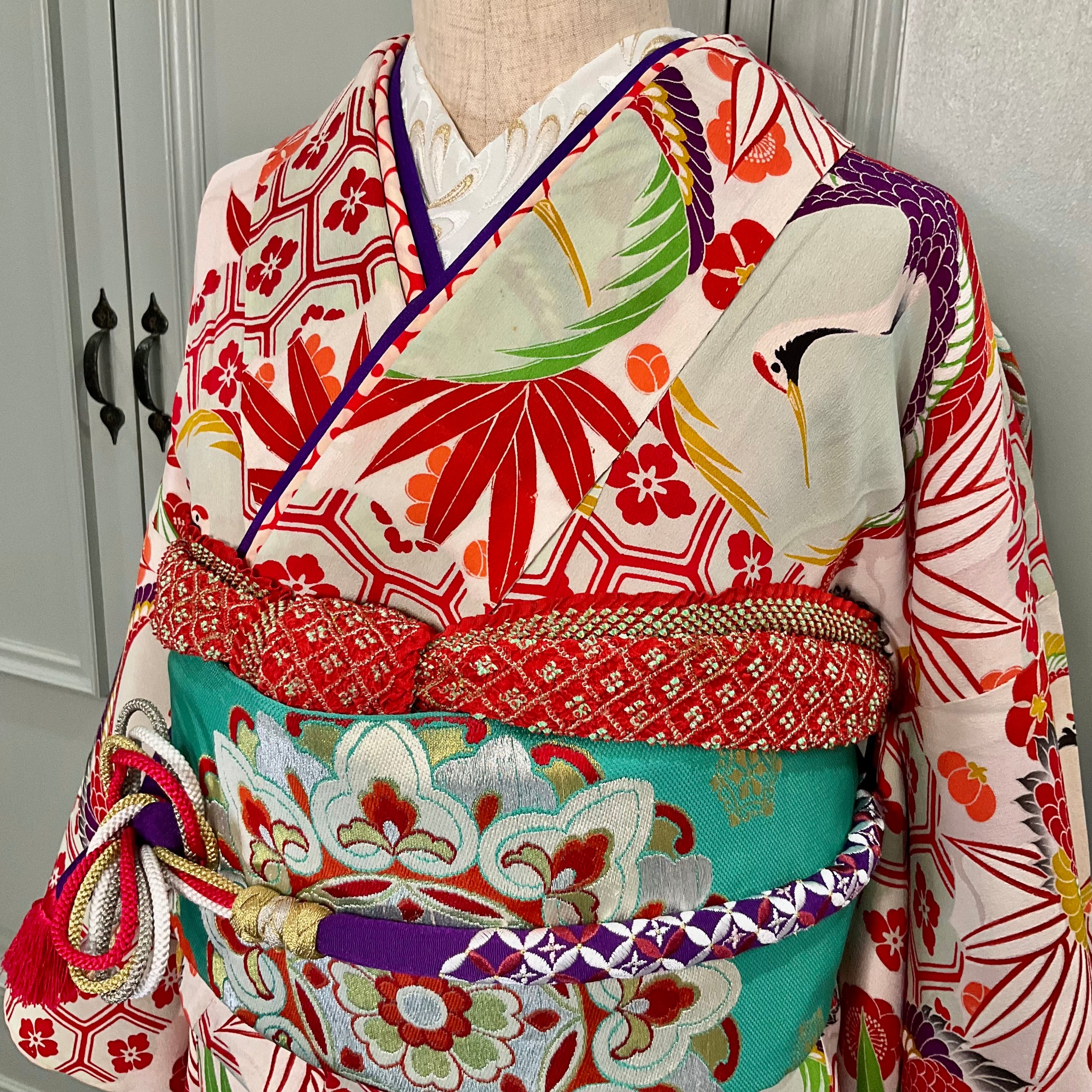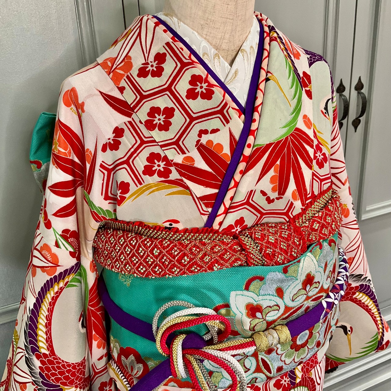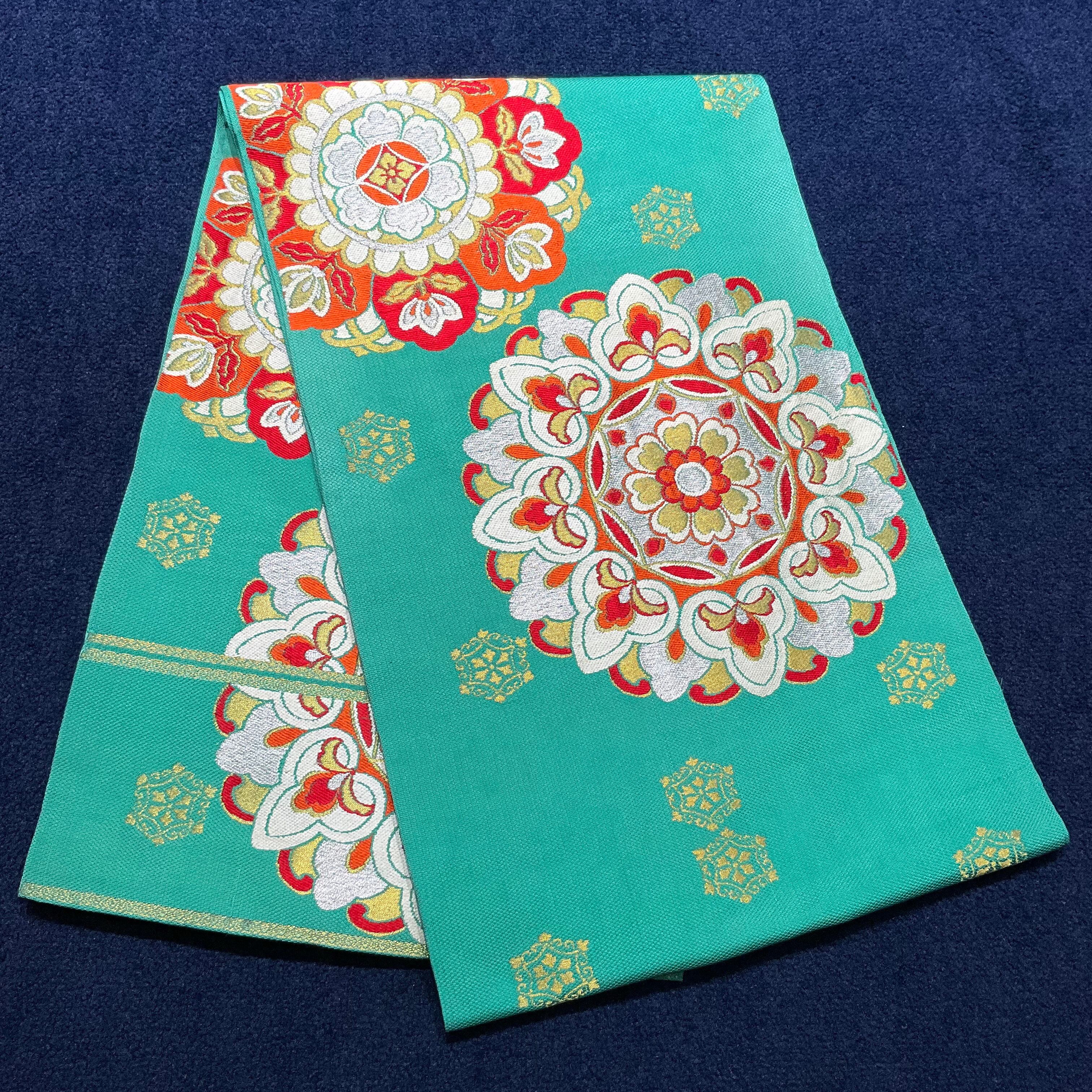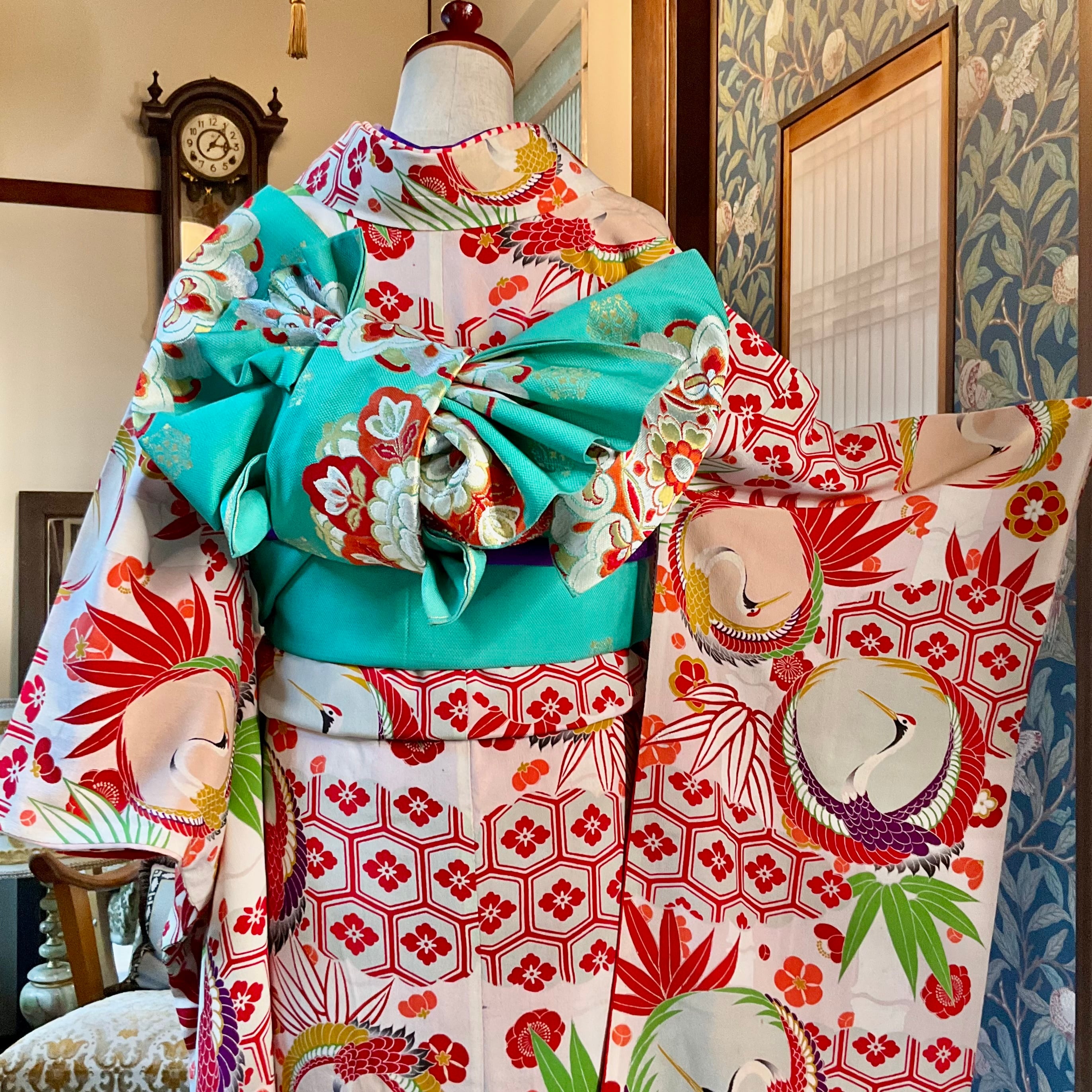 合わせた袋帯は、こちらもアンティーク、振袖の美しさを引き立てるように、可愛らしさも持ち合わせた、ピーコックグリーン