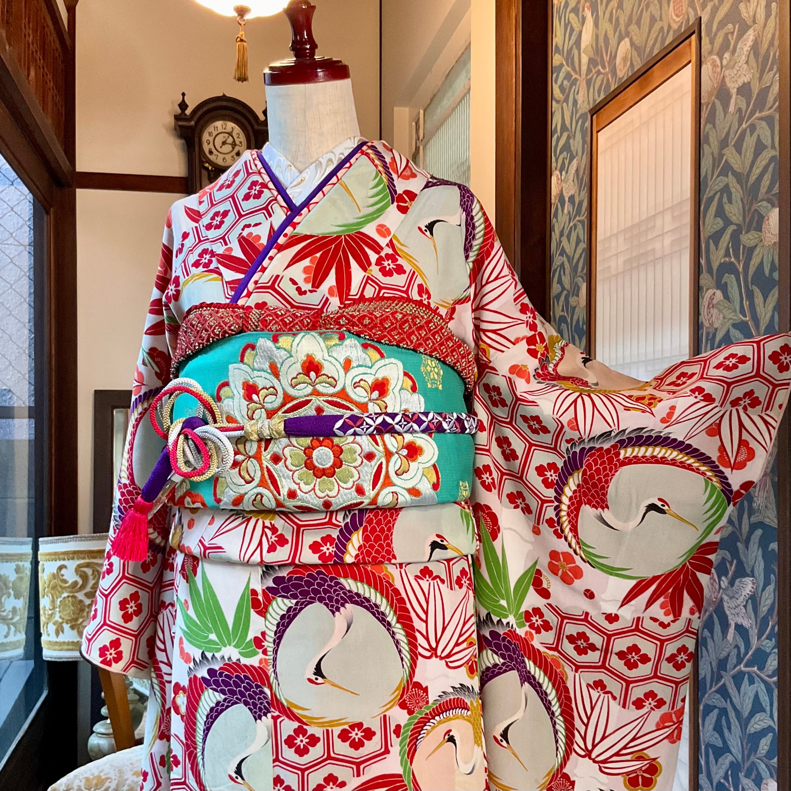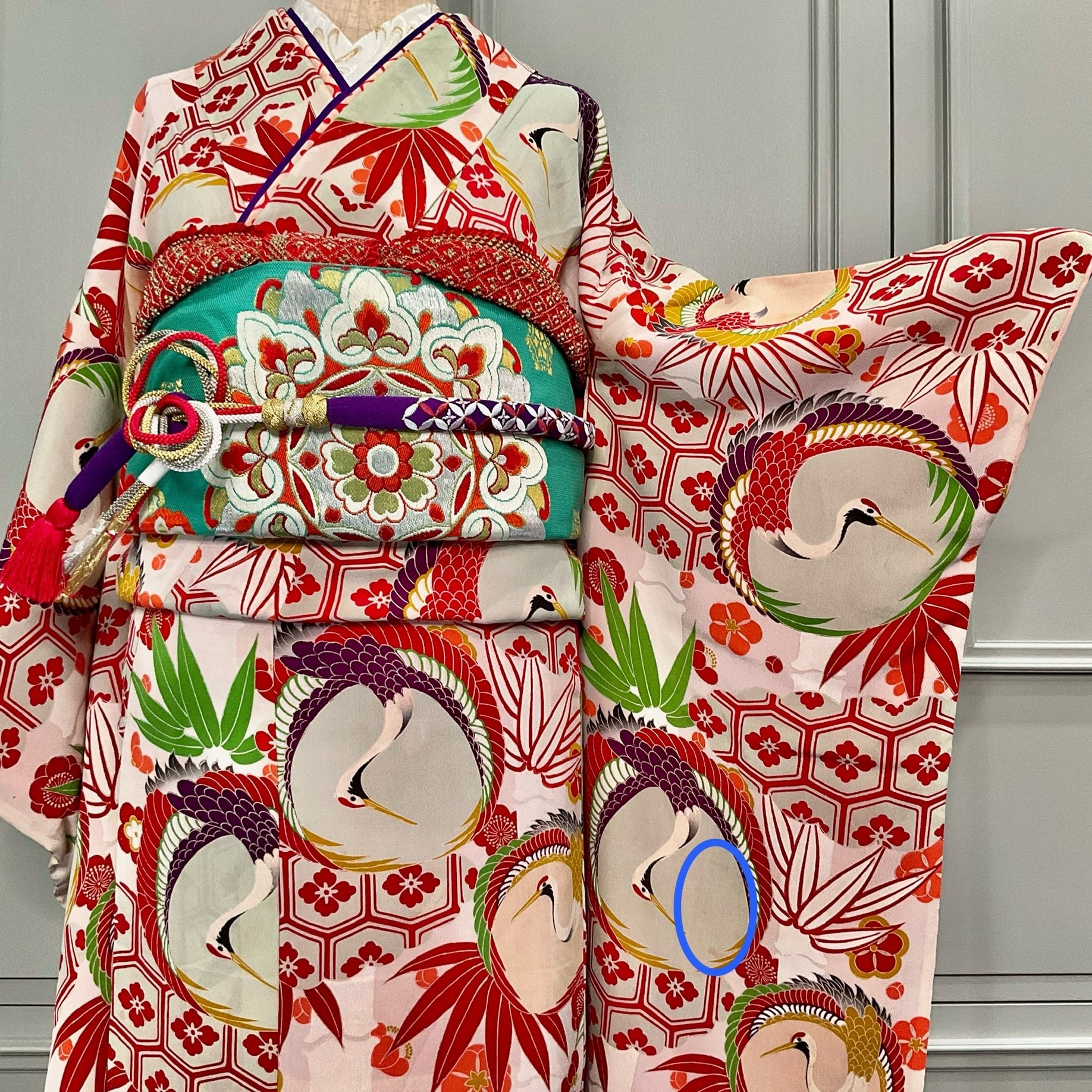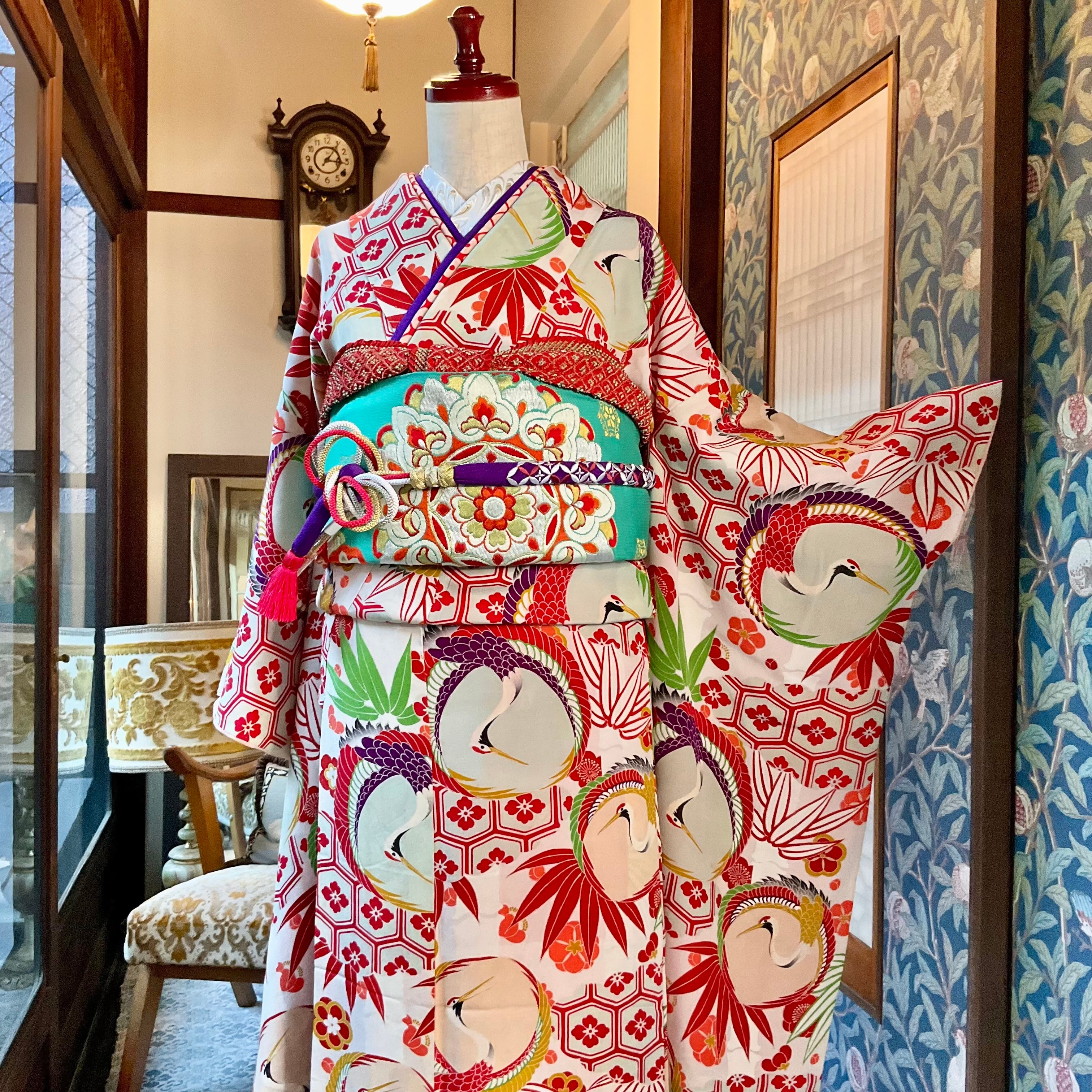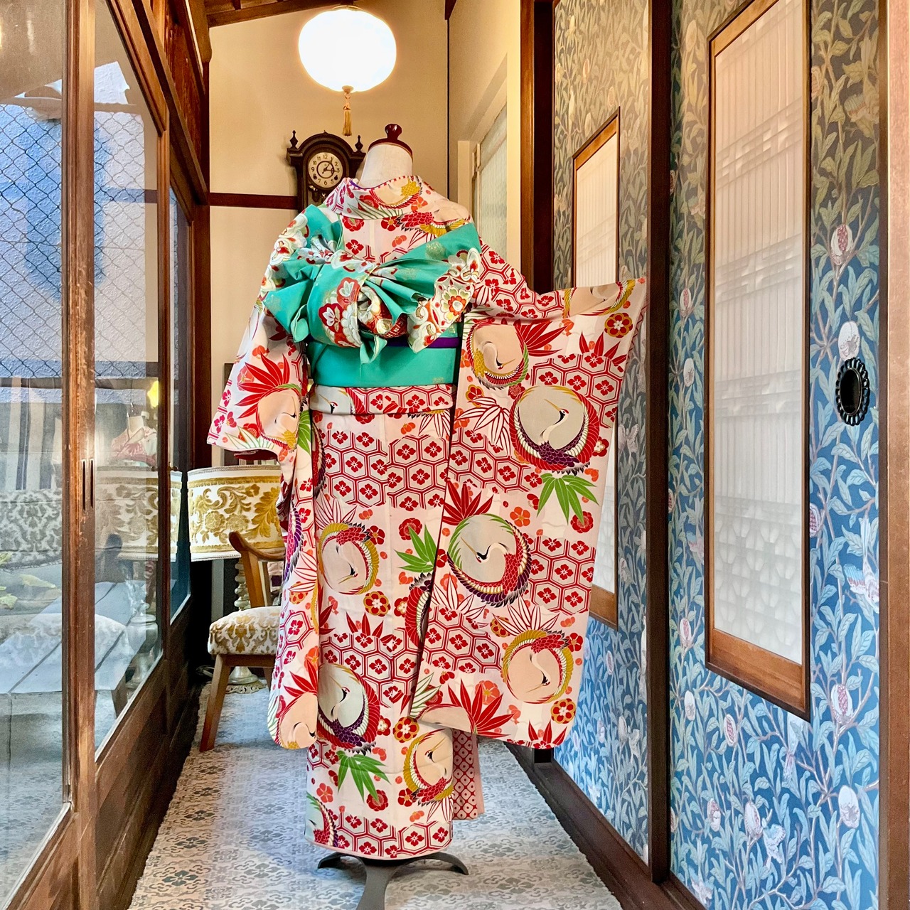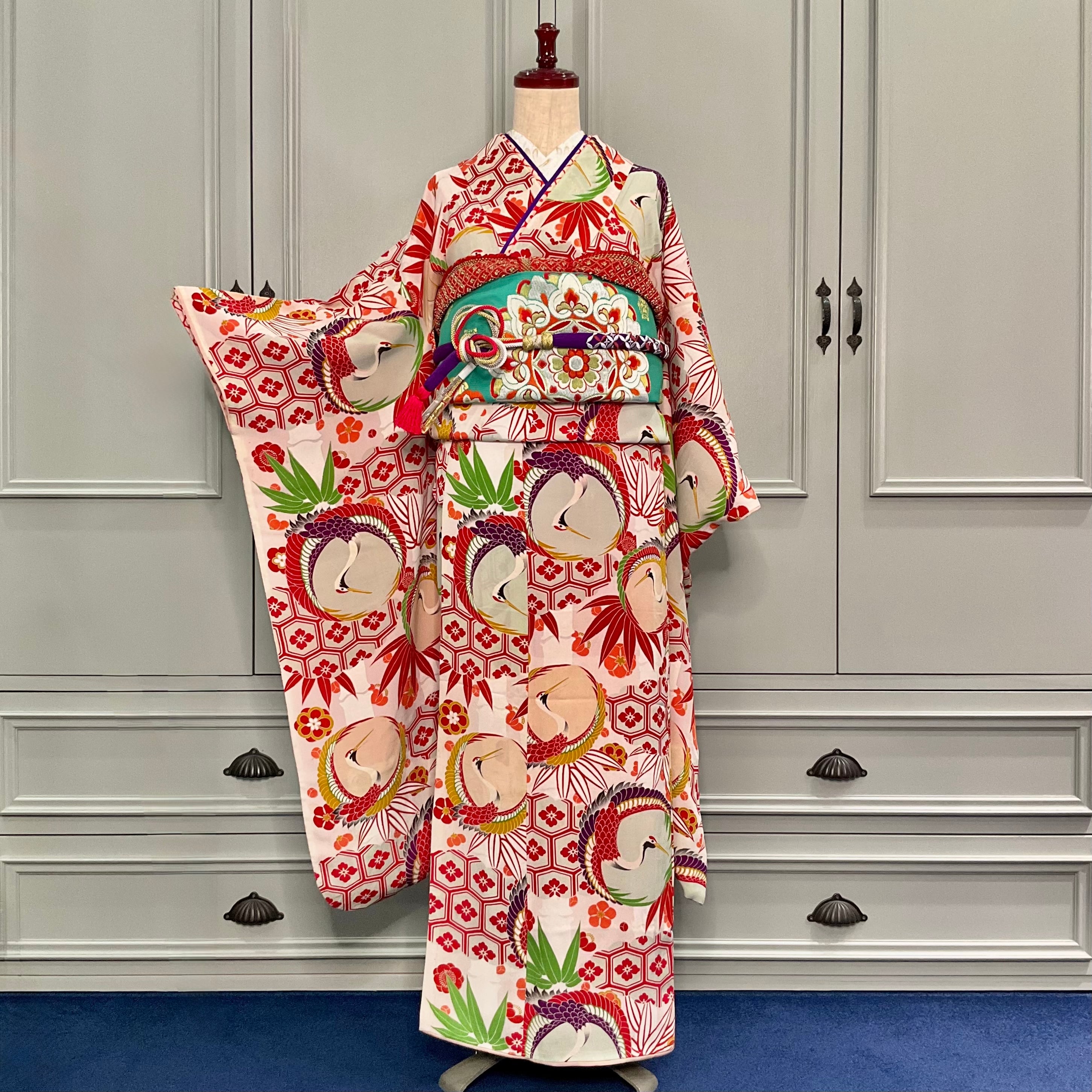 アイボリーの地色に、鮮やかなレッドの亀甲花菱、静かに羽を休める鶴たちは円を描くようにデザインされ、華やぎある一着✨