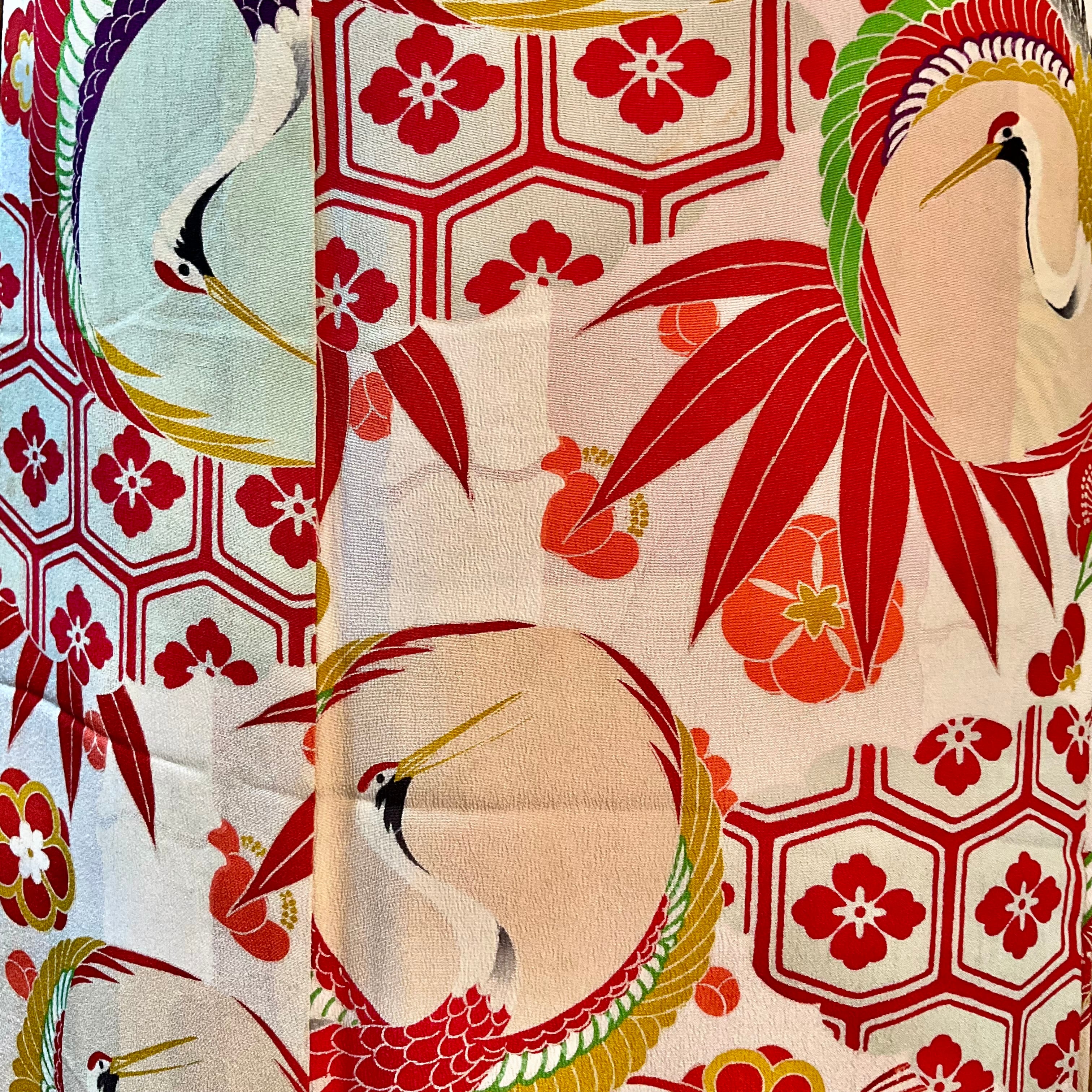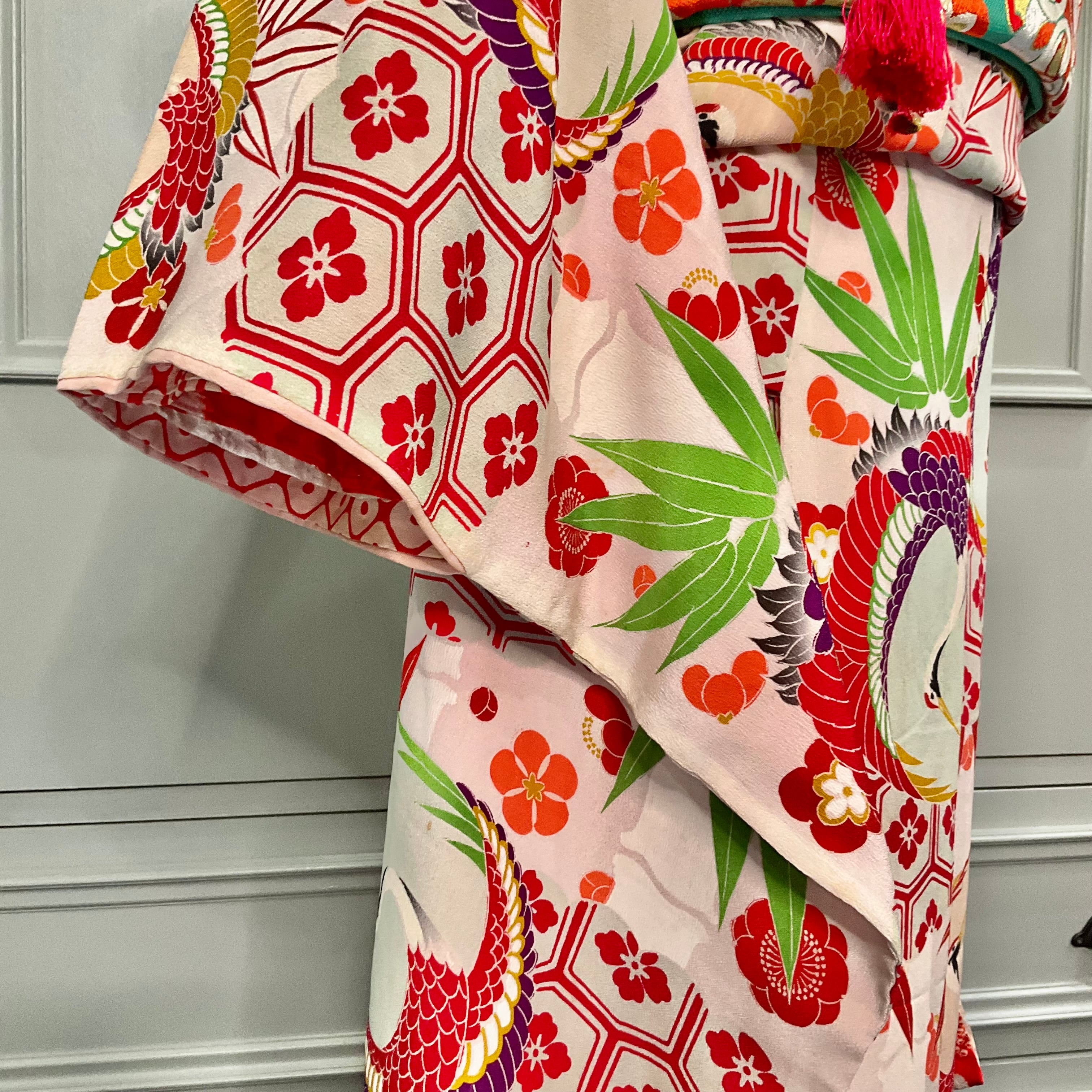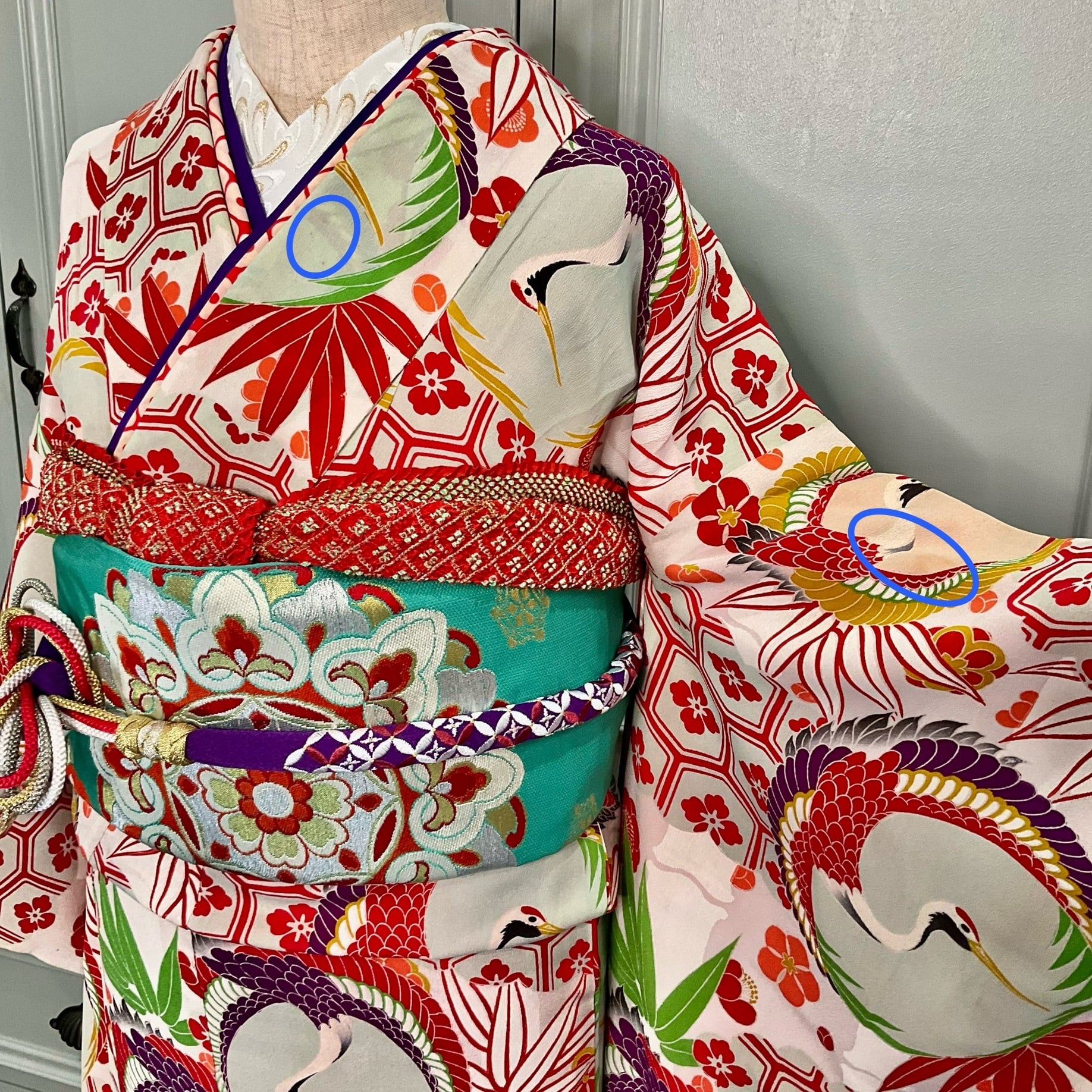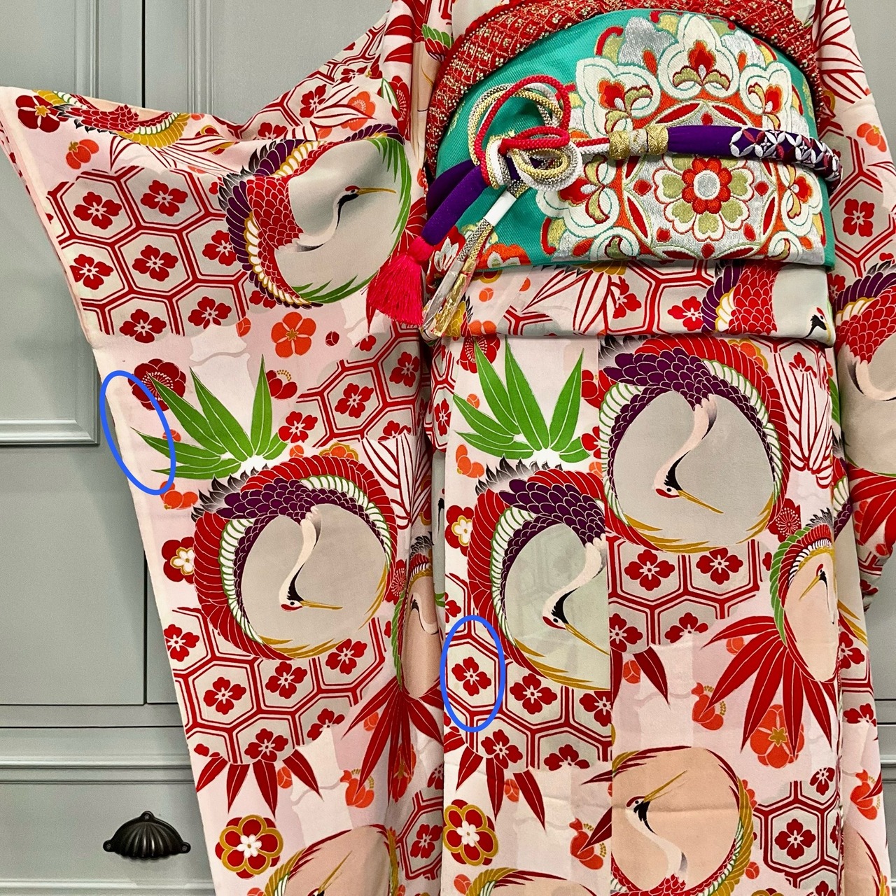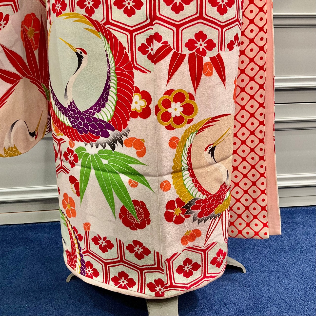 アイボリーの地色に、鮮やかなレッドの亀甲花菱、静かに羽を休める鶴たちは円を描くようにデザインされ、華やぎある一着✨