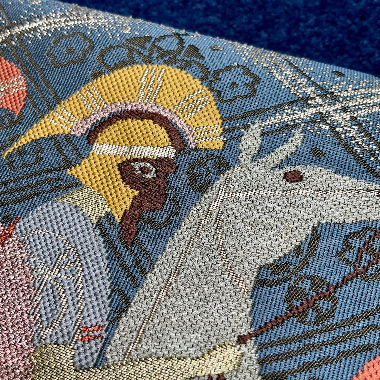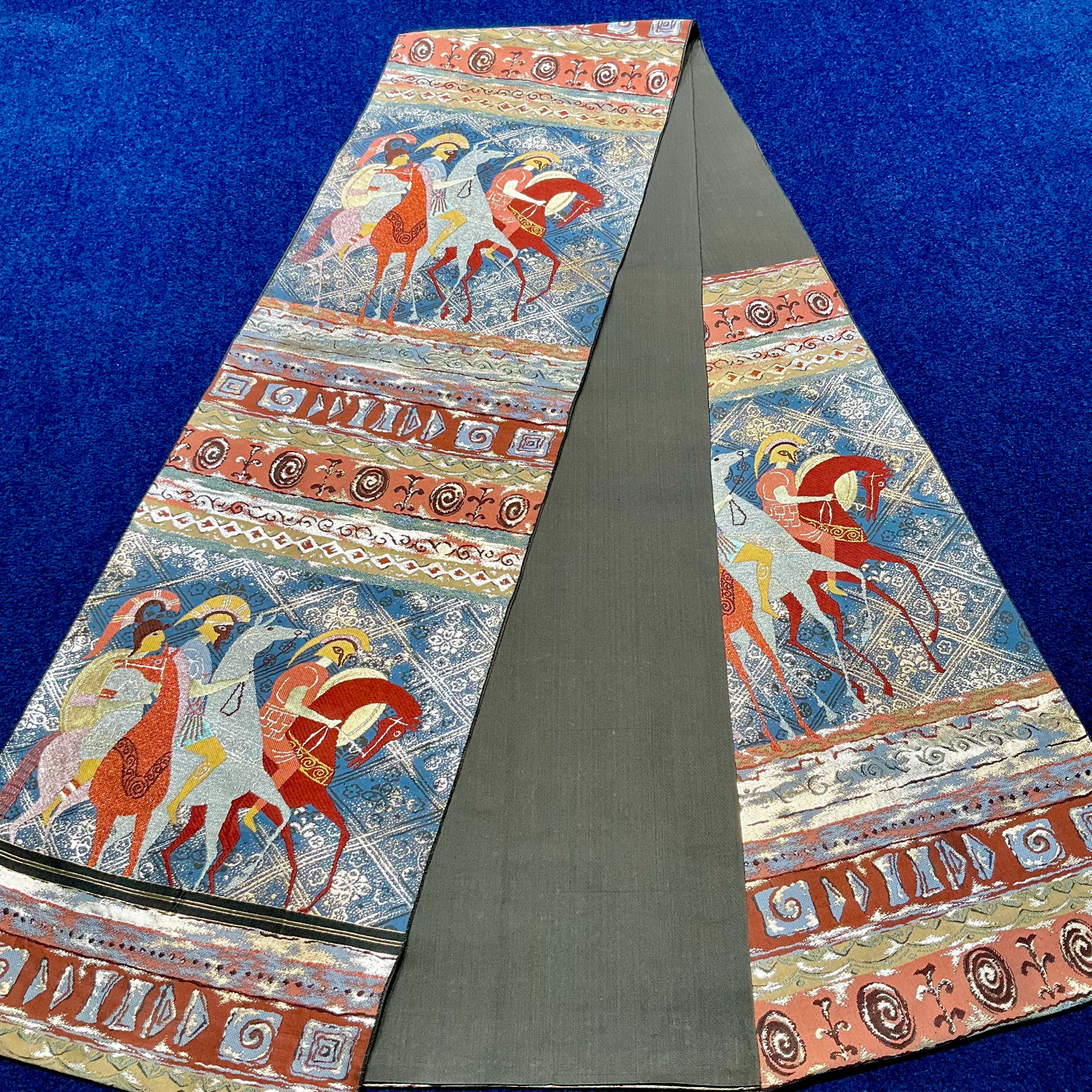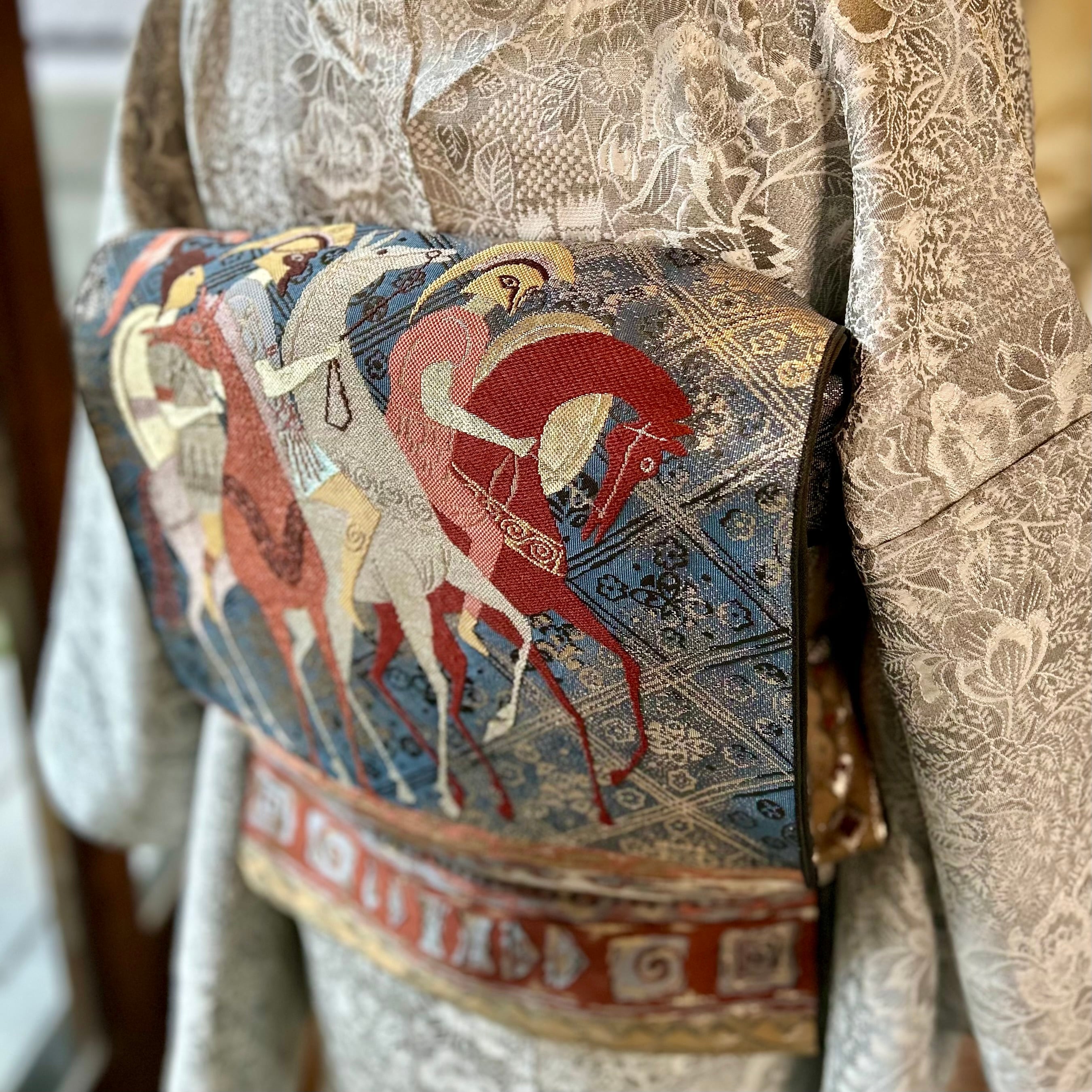 ブルー×ブラウン系の地色に、オリエンタルな乗馬模様が織り出された袋帯です✨