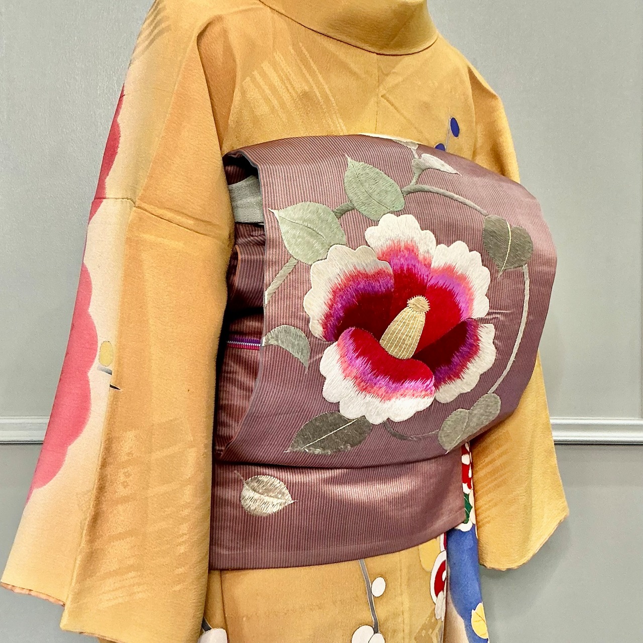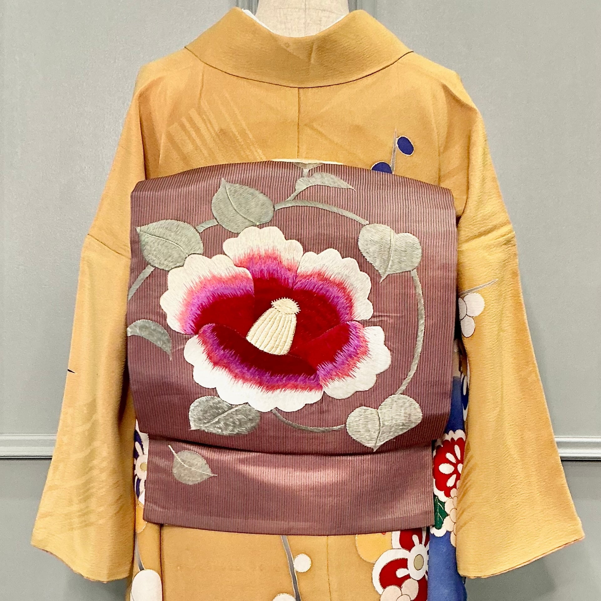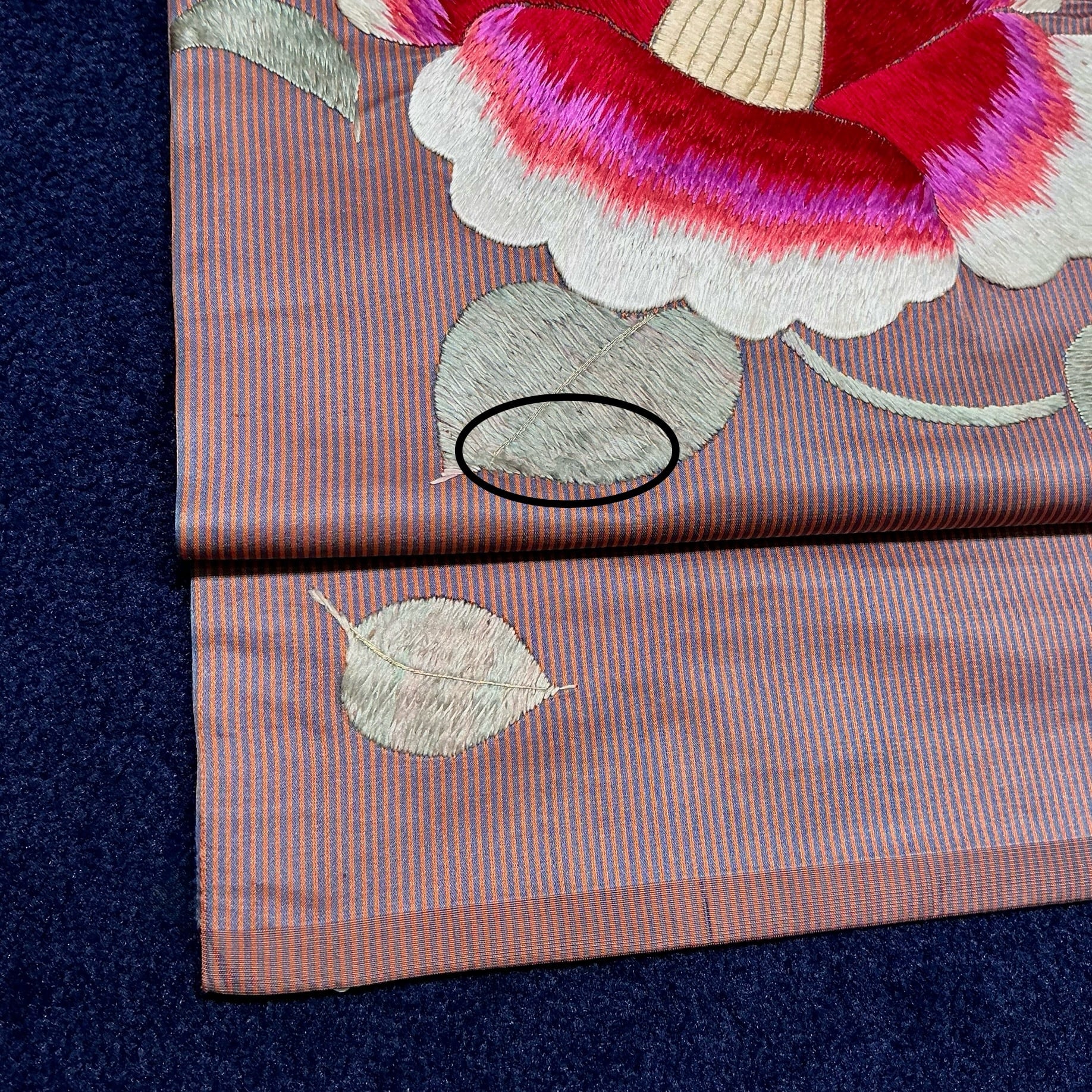 くすみピンク×ブルーグレーの細かい縞の繻子地に、大きな椿の刺繍が美しいアンティーク名古屋帯です