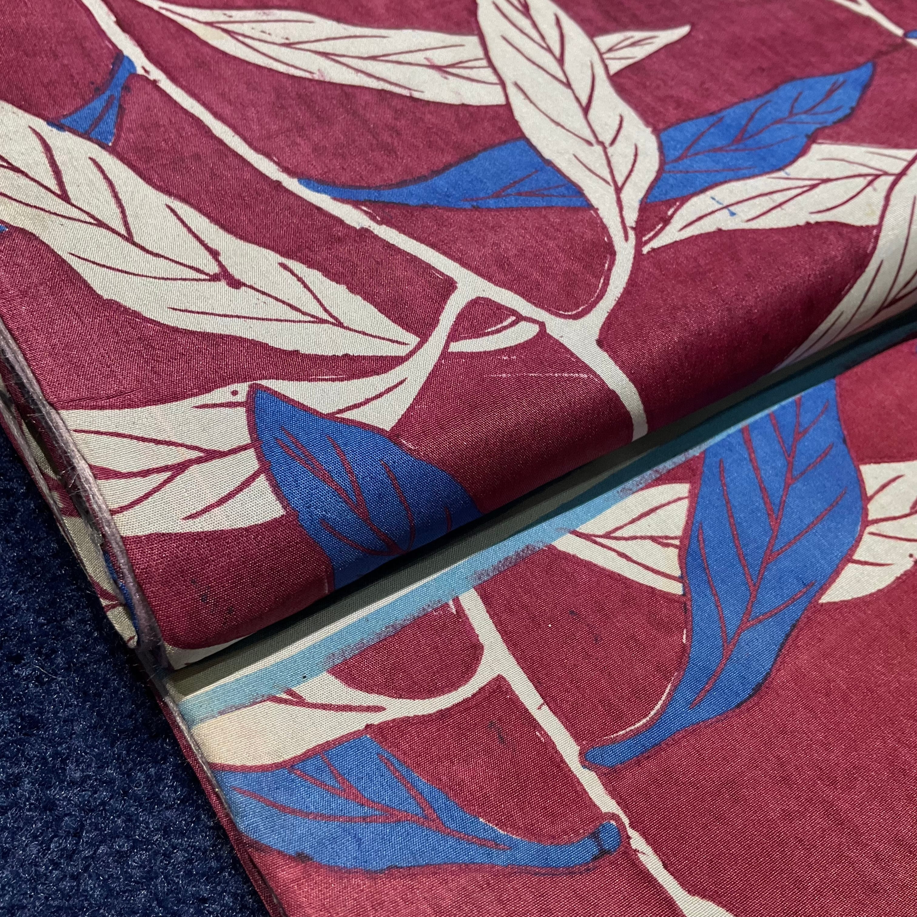 ワインブラウン地に、ブルーとオフホワイトの葉っぱの模様が描かれた、染めのアンティーク昼夜帯 (開き名古屋帯) です