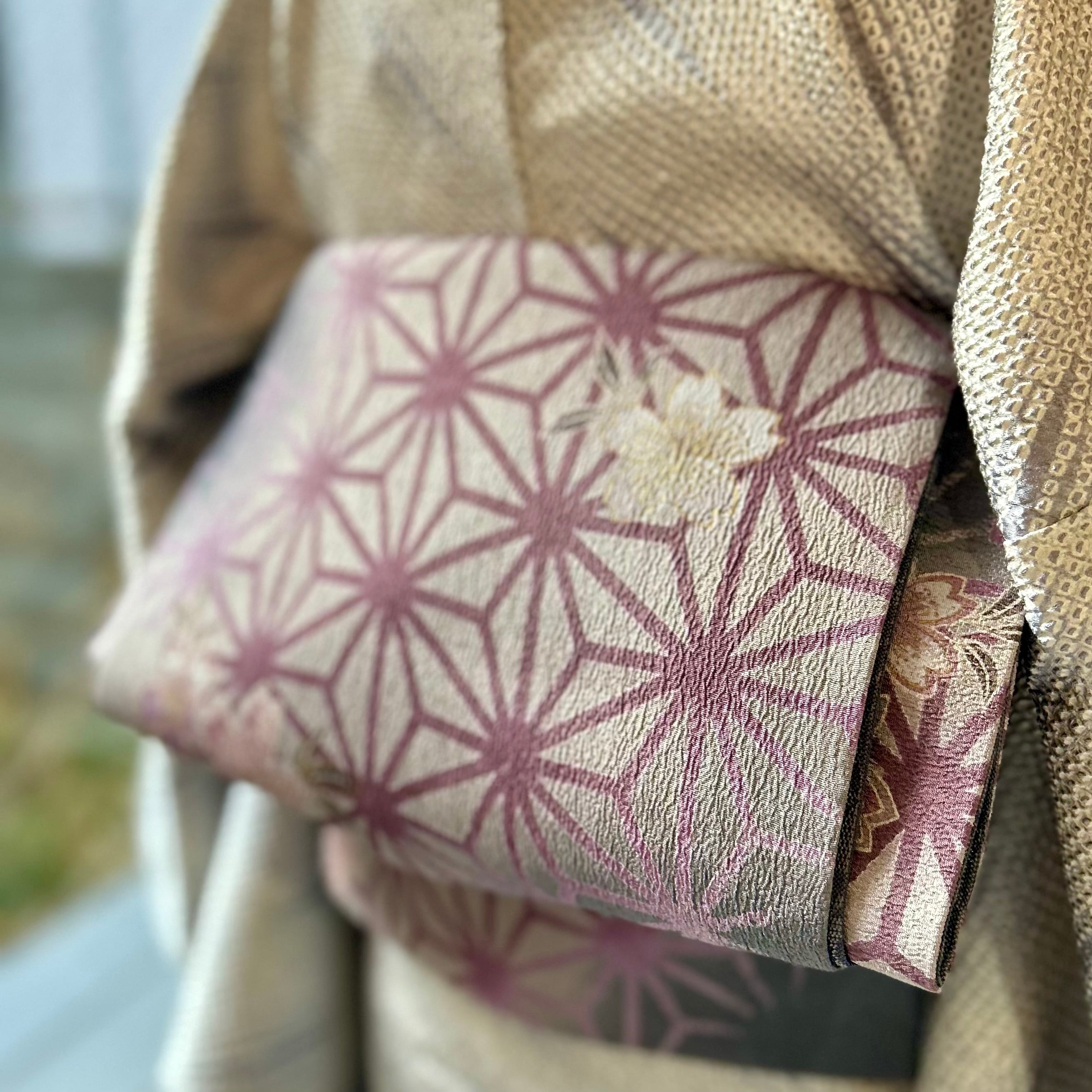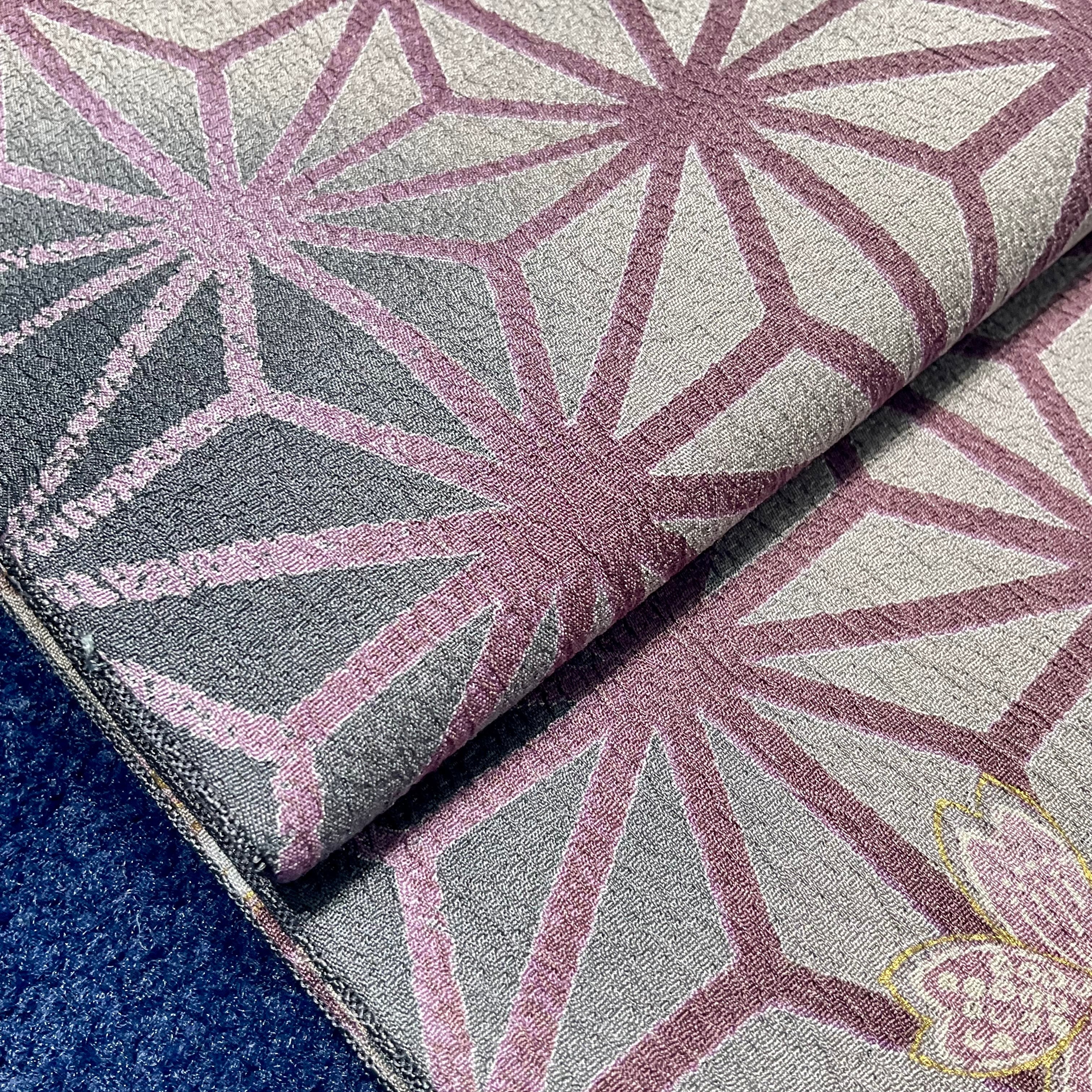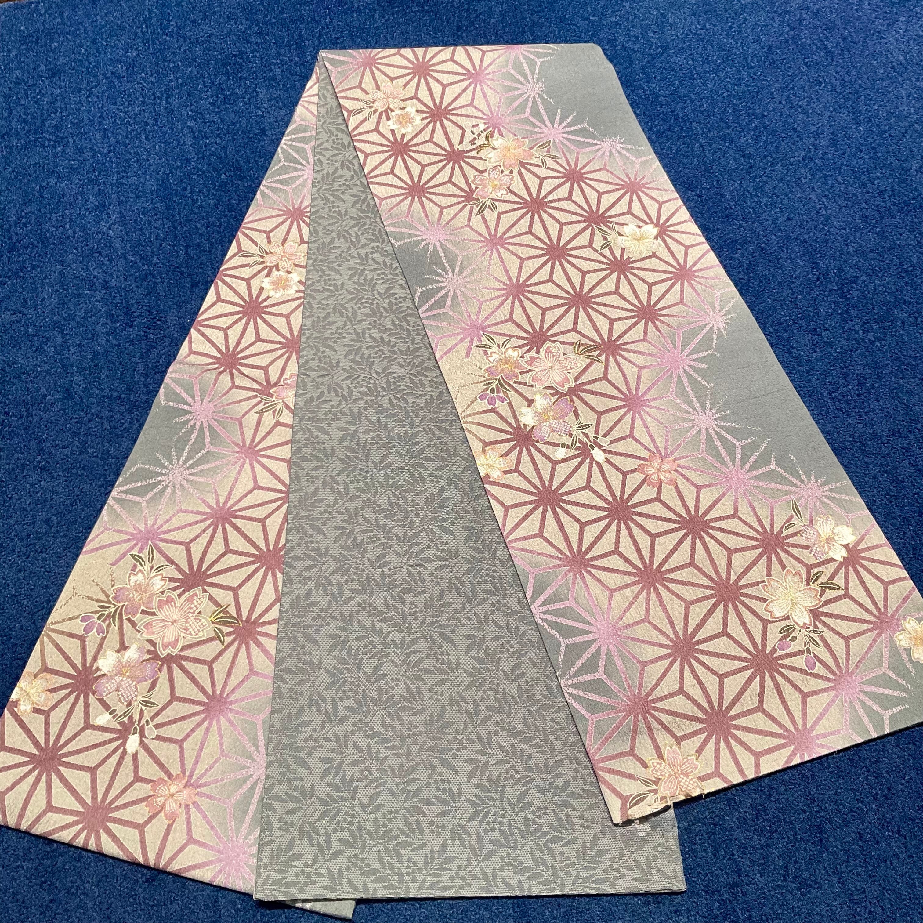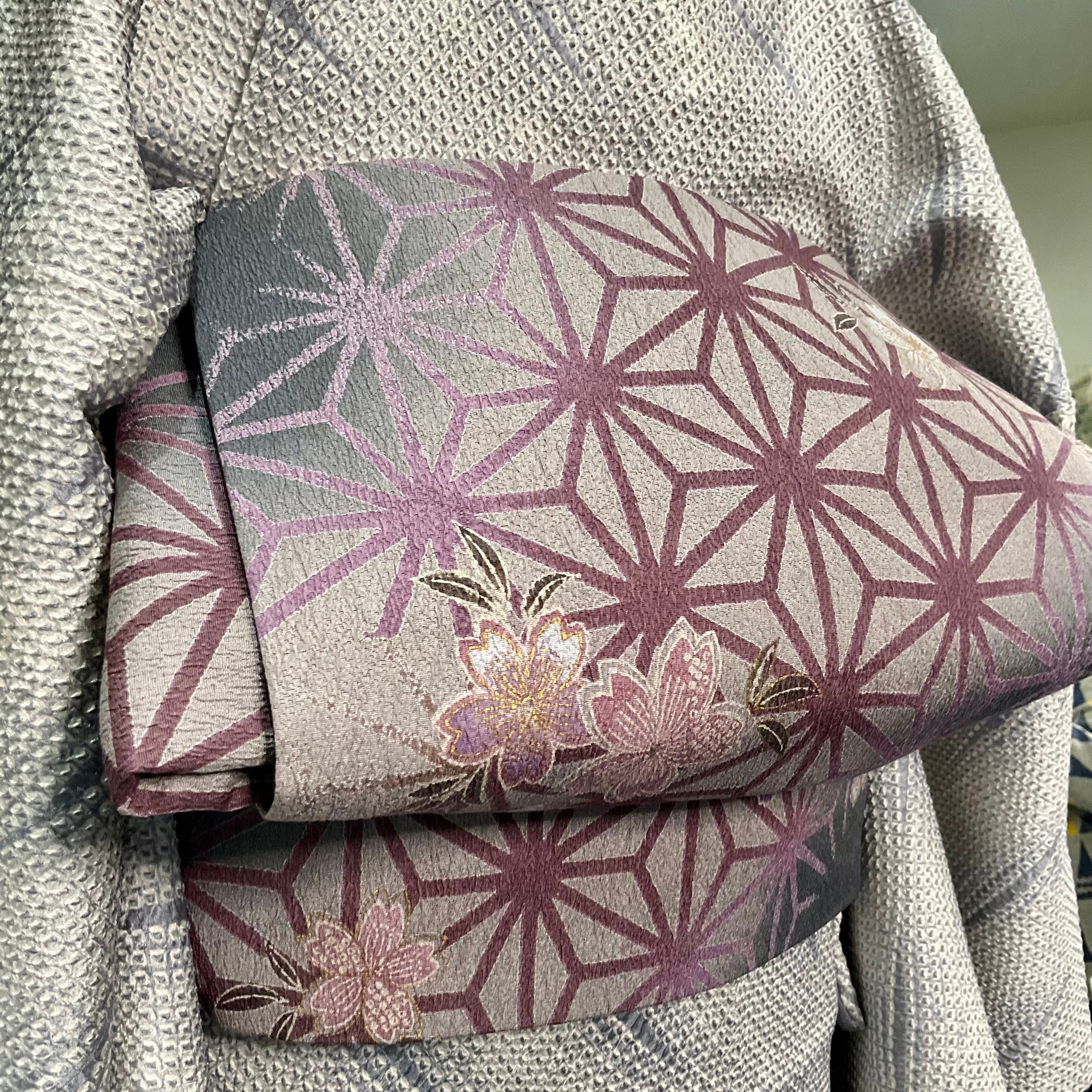 幽玄の麻の葉*未使用品 麻の葉 破れ麻の葉 桜 グレー パープル 染め帯 京袋帯 名古屋帯 B412