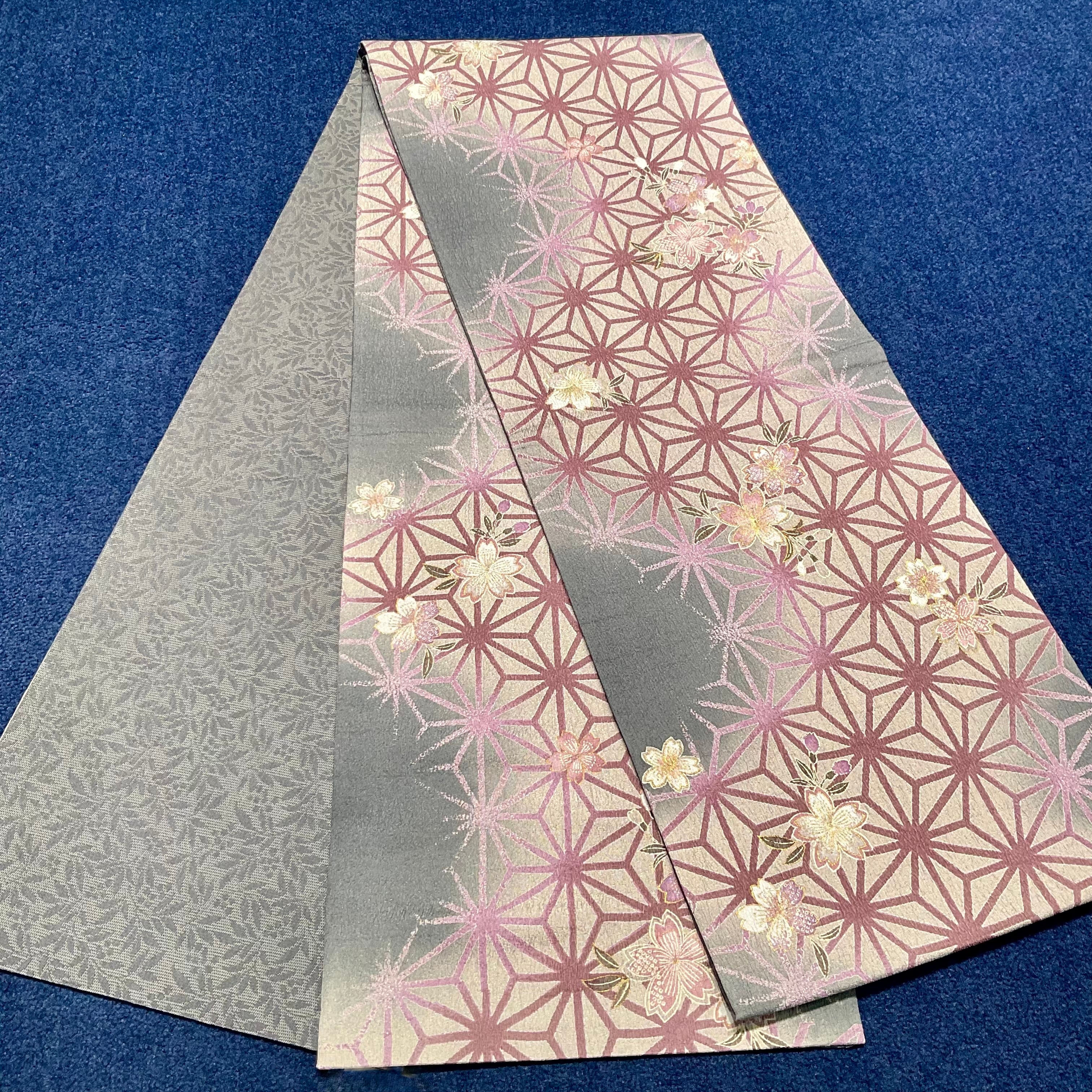灰×紫のグラデーションが美しい地色に、桜と麻の葉模様がデザインされた未使用品の名古屋帯です