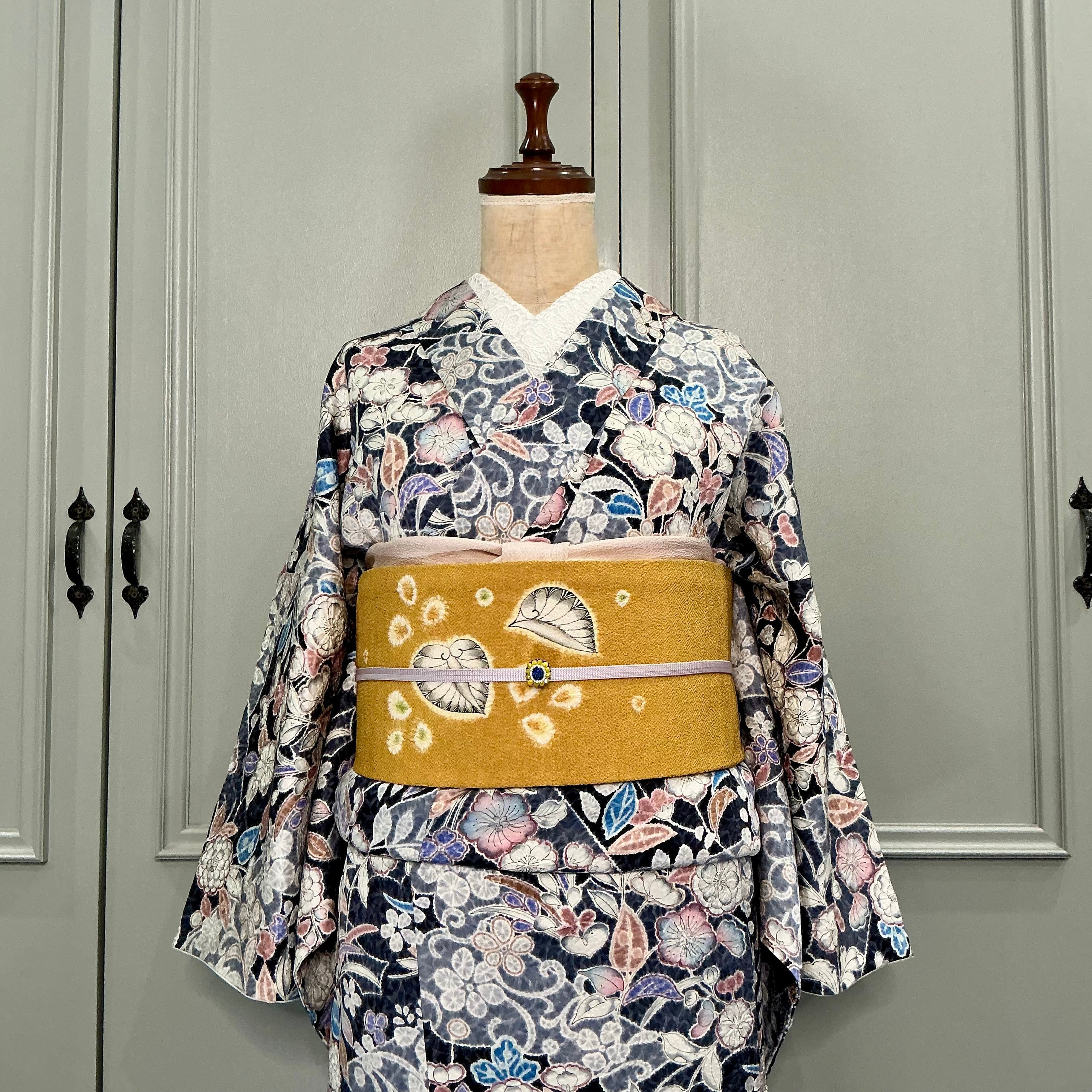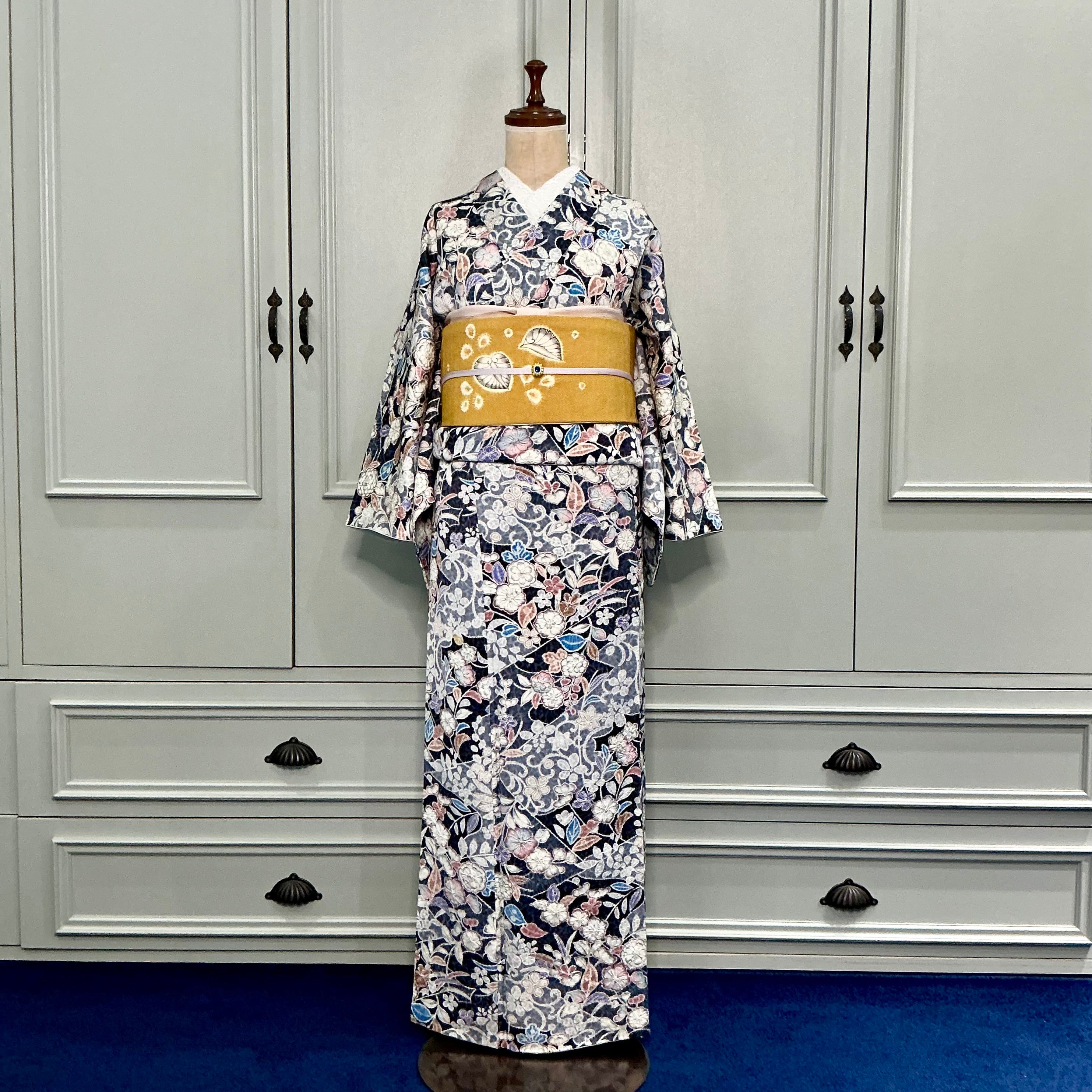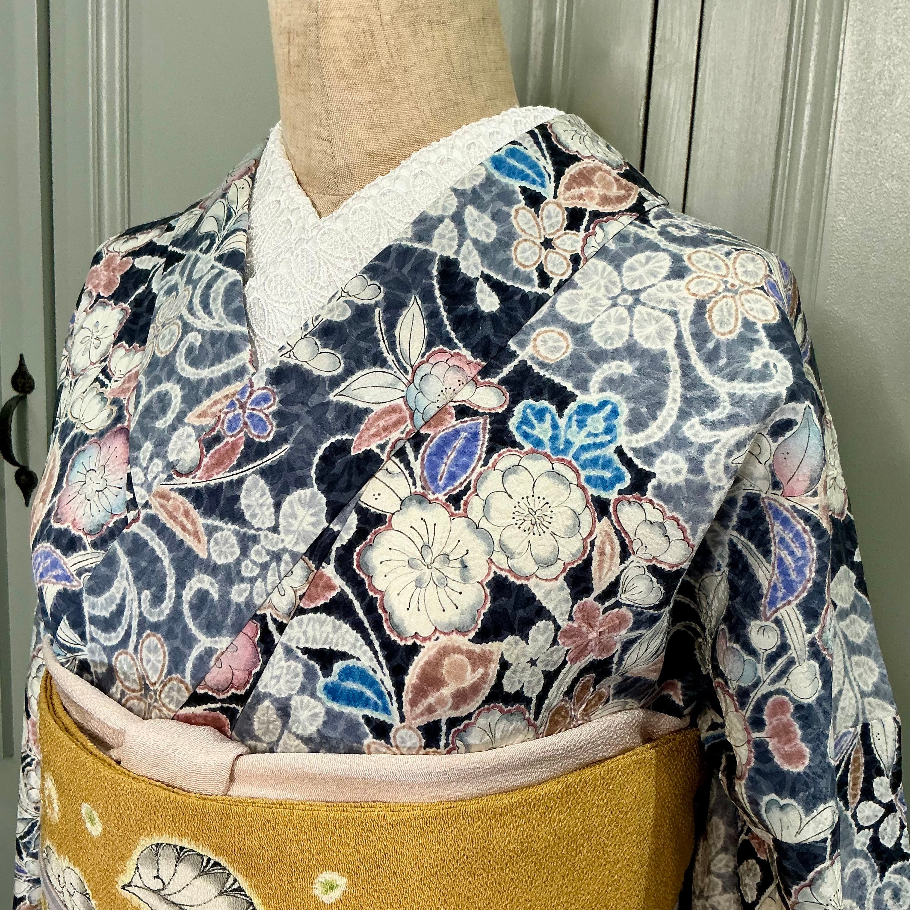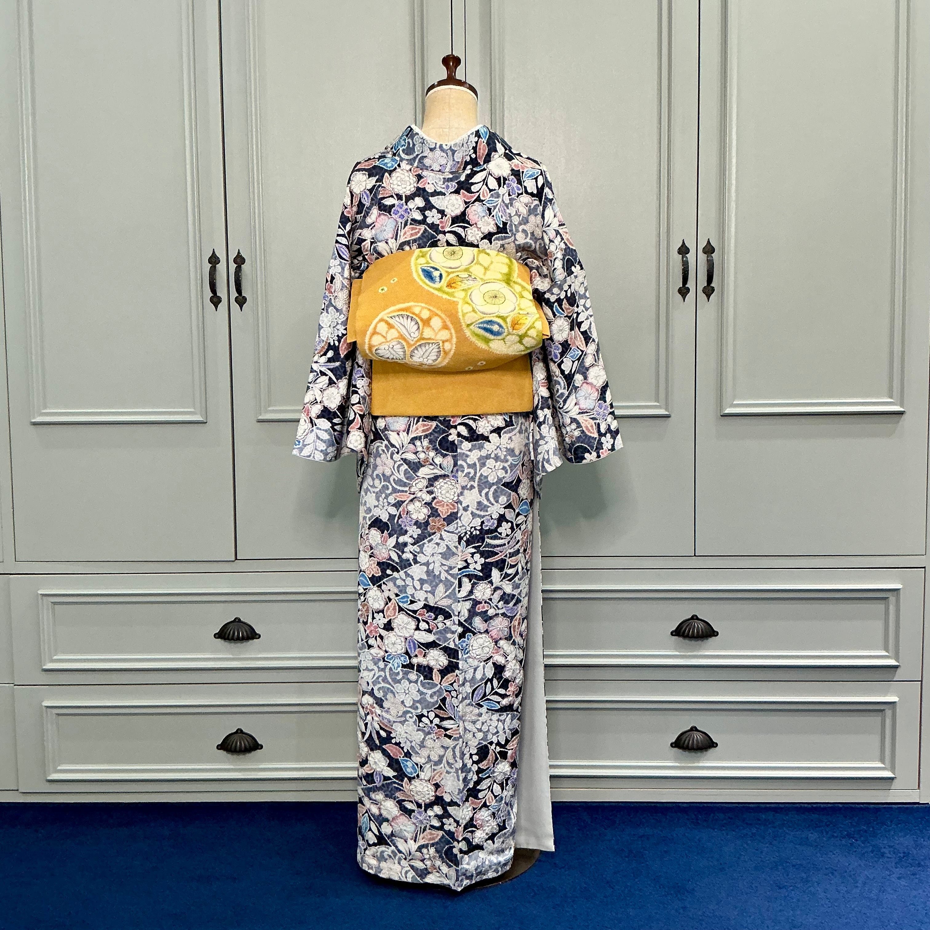 ネイビー×ブルーグレーの地色に辻ヶ花調の美しいデザインが華やかな小紋着物です