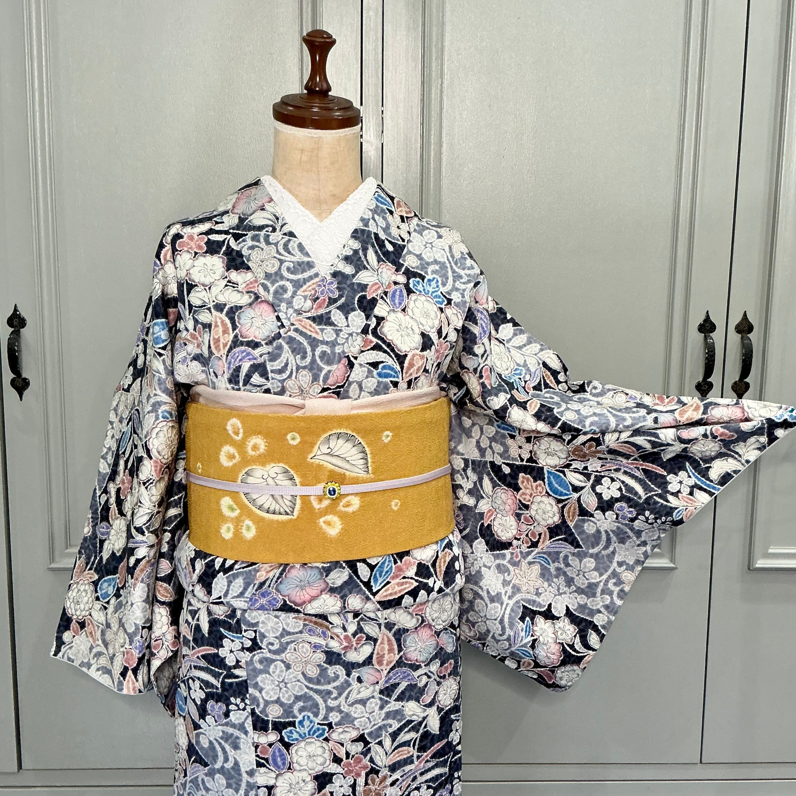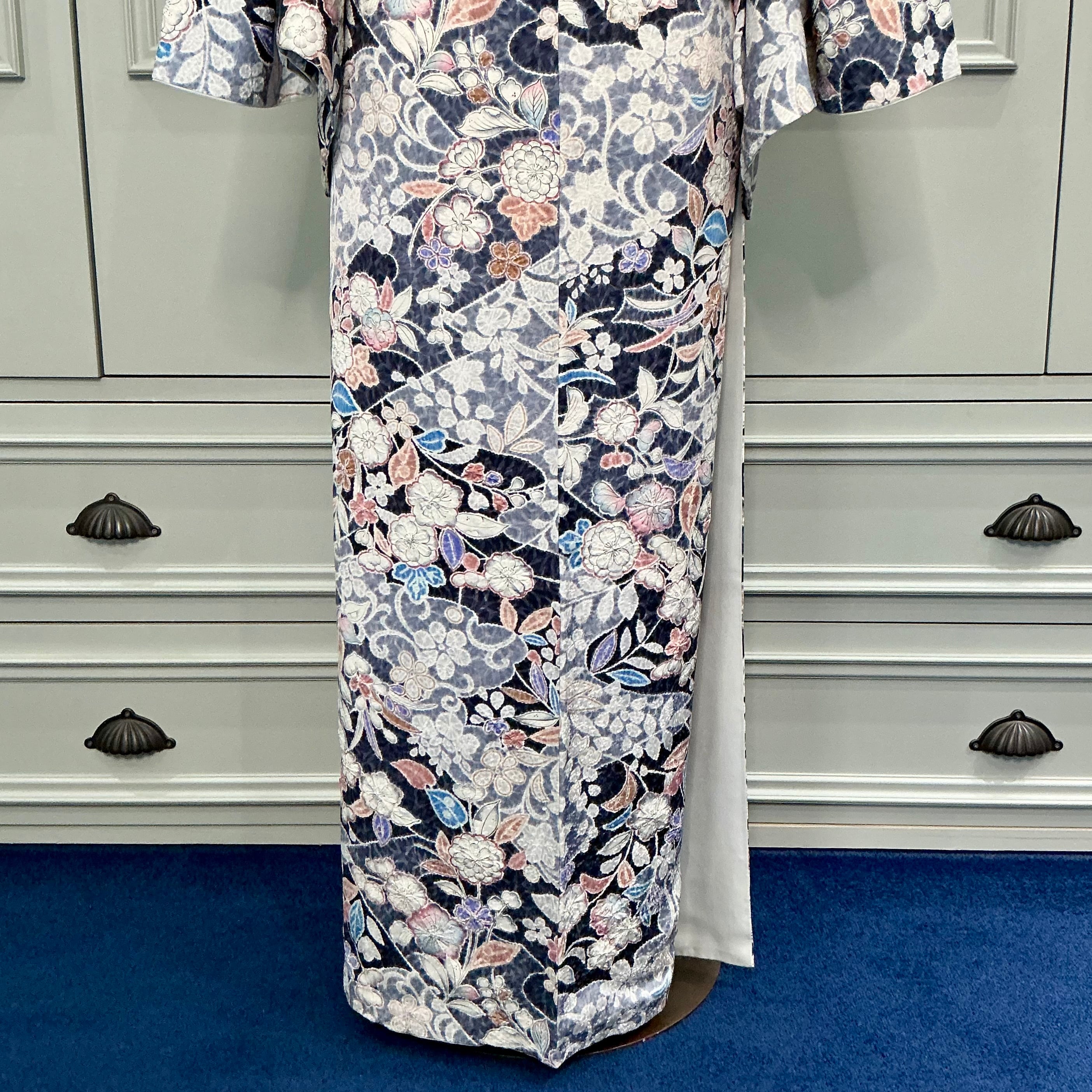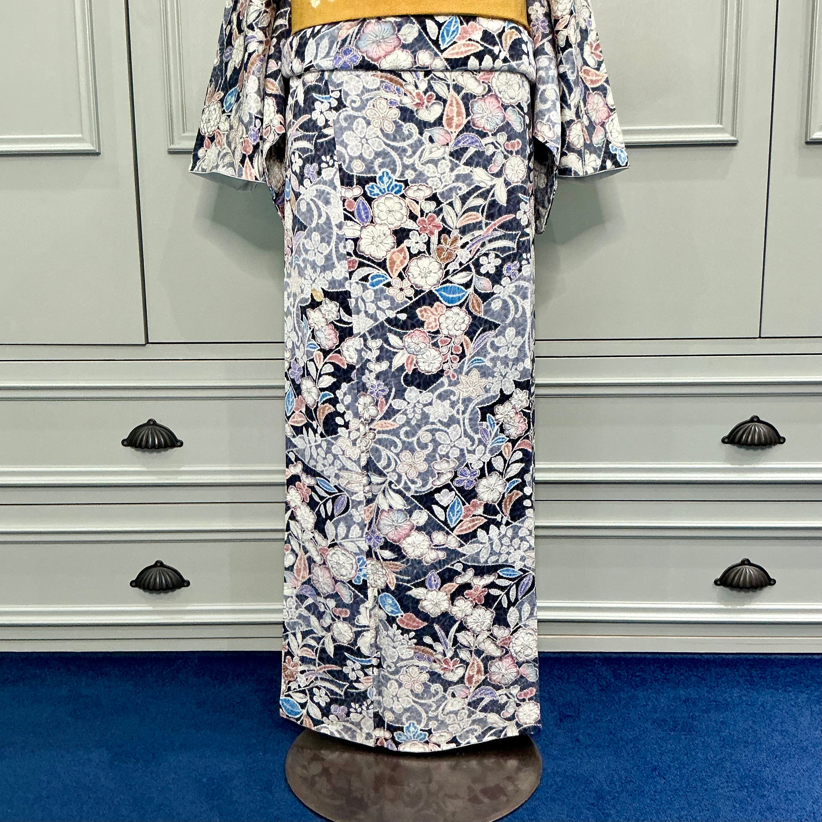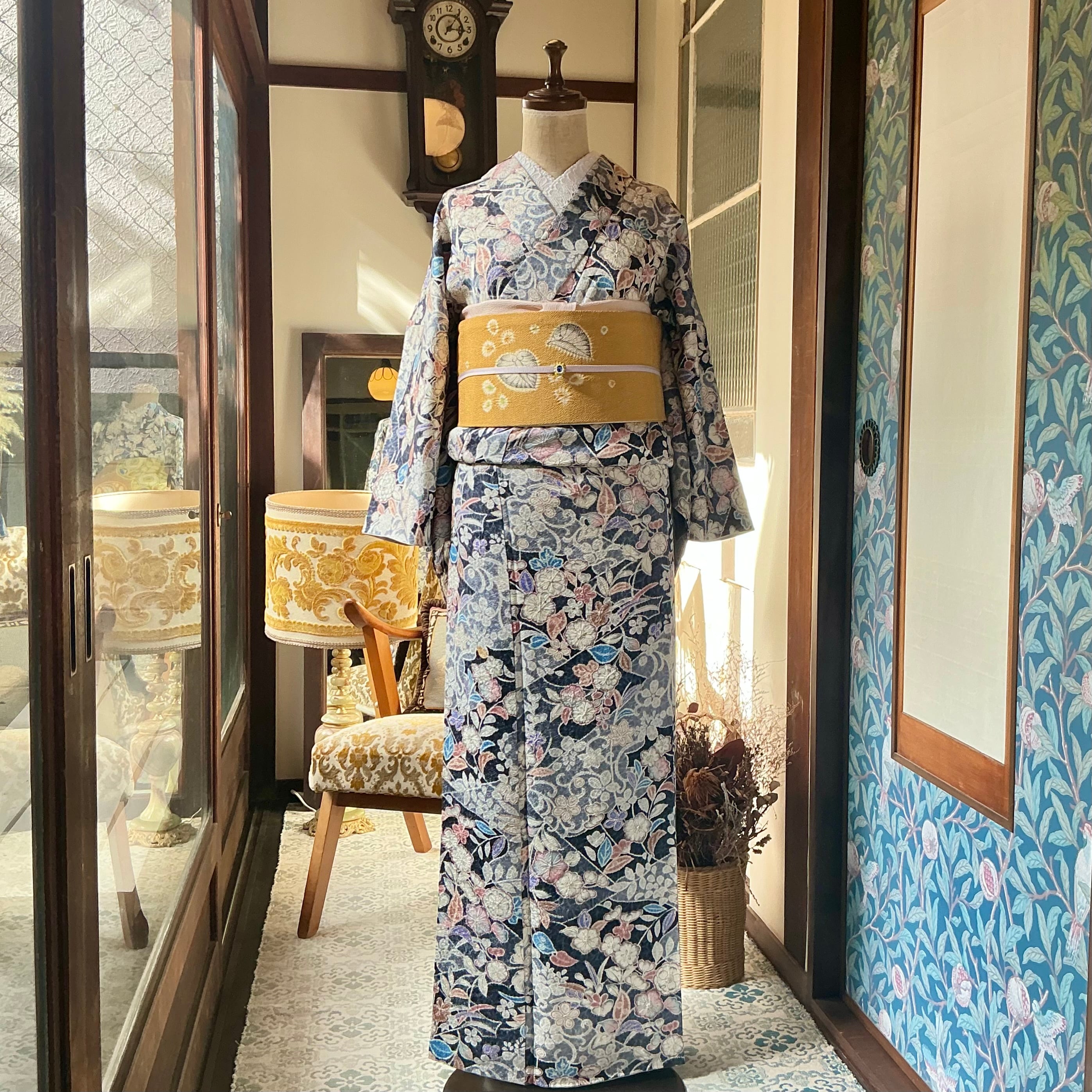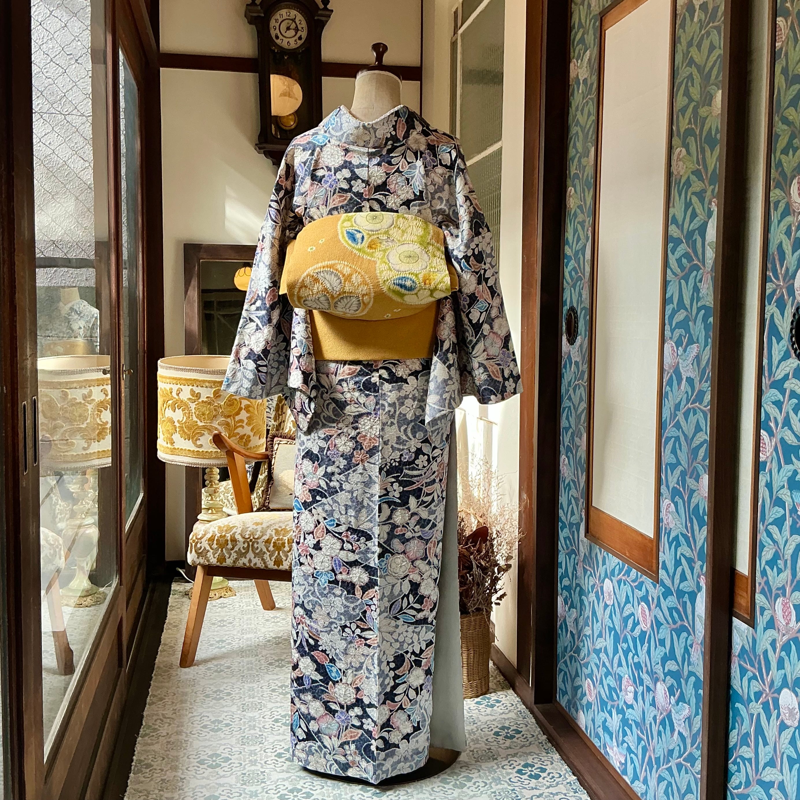 ネイビー×ブルーグレーの地色に辻ヶ花調の美しいデザインが華やかな小紋着物です