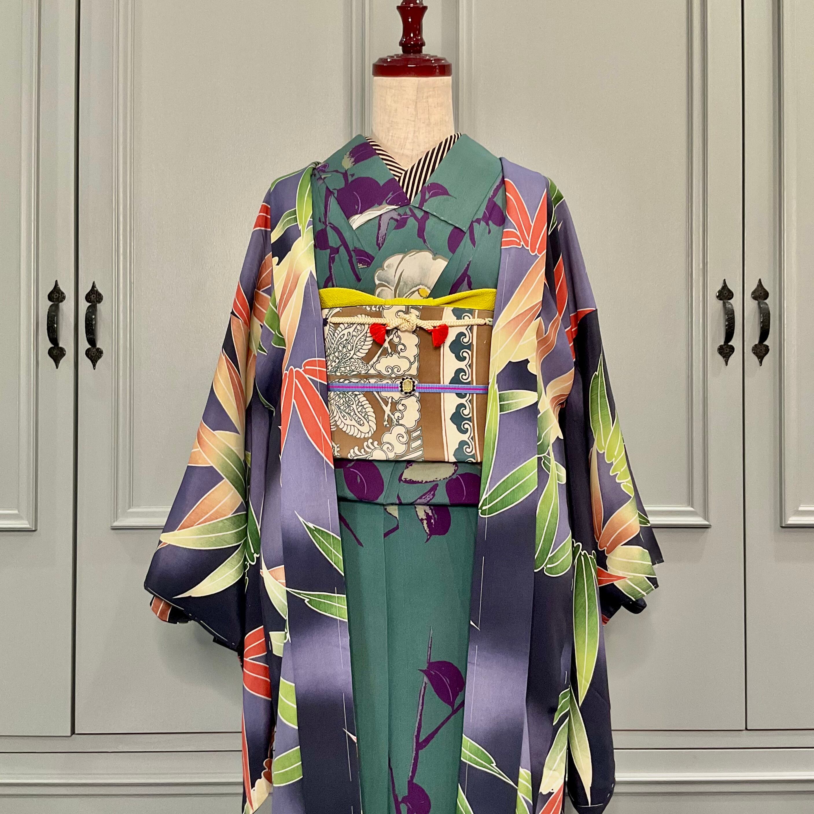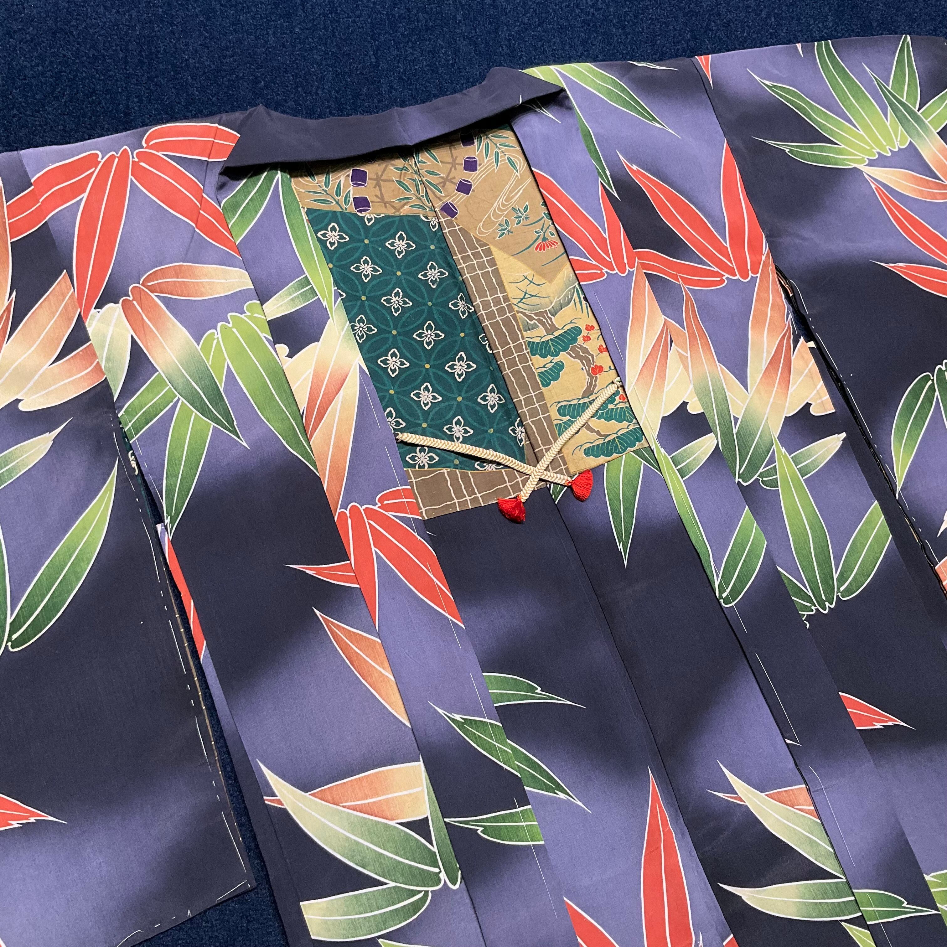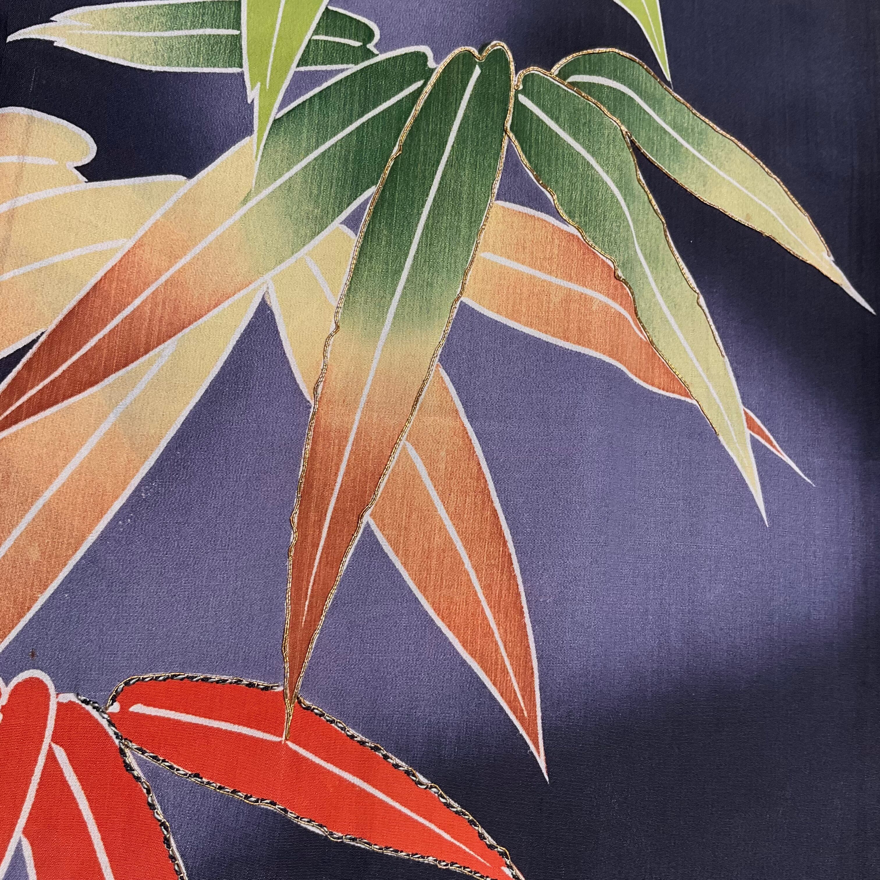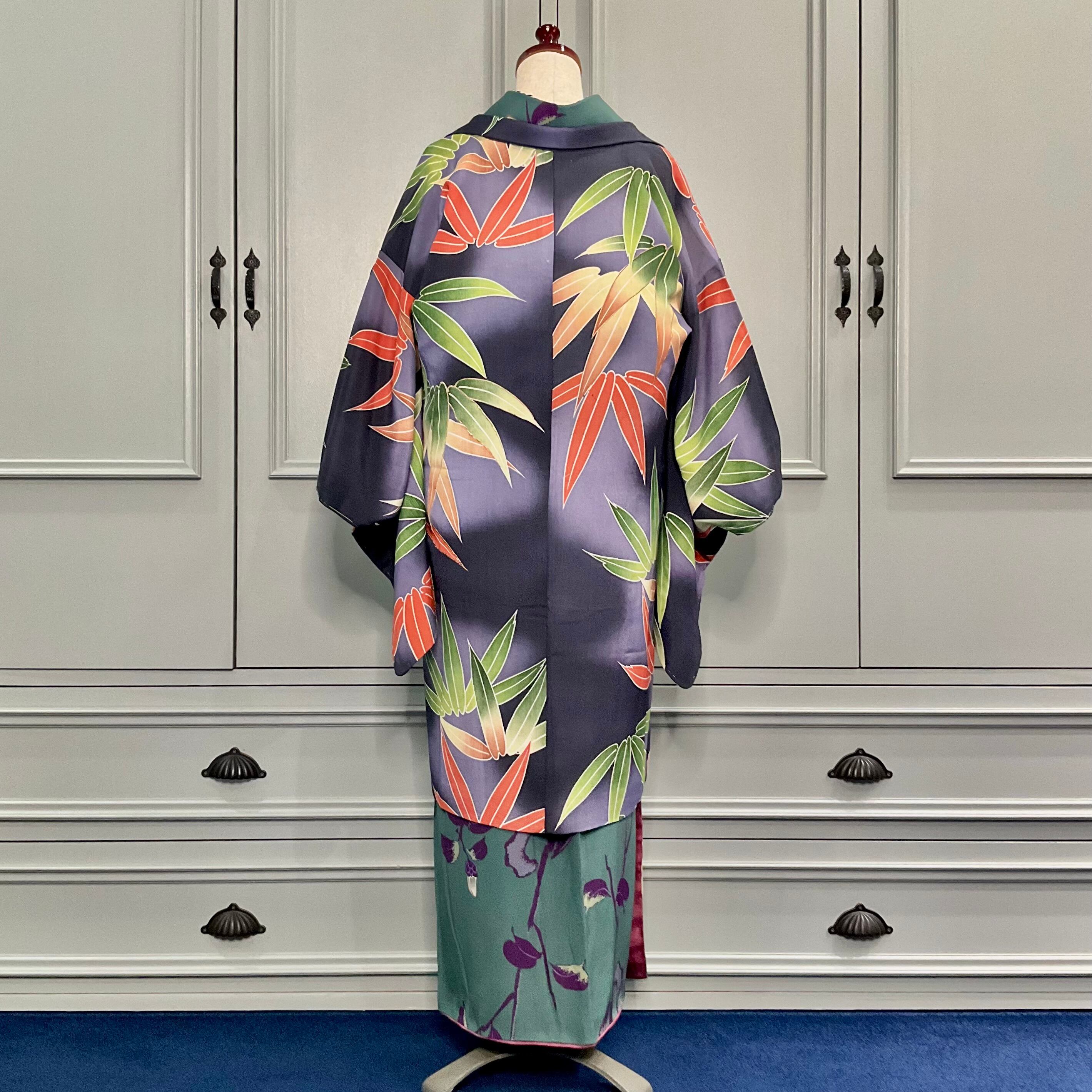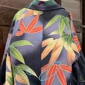墨黒の暈し地に、グリーンとオレンジの大きな笹が描かれたアンティーク長羽織です