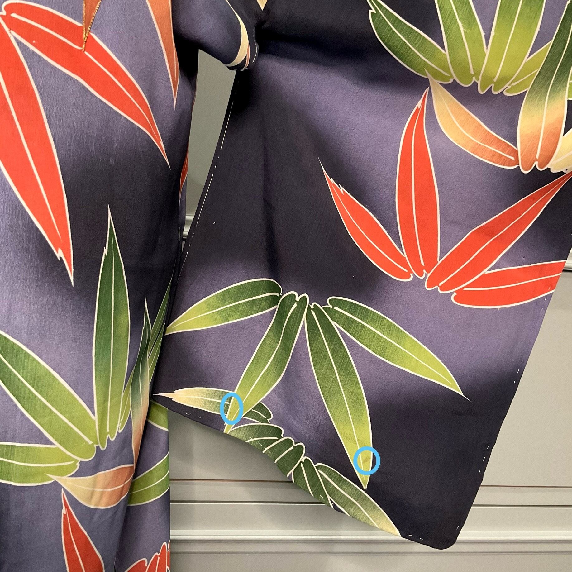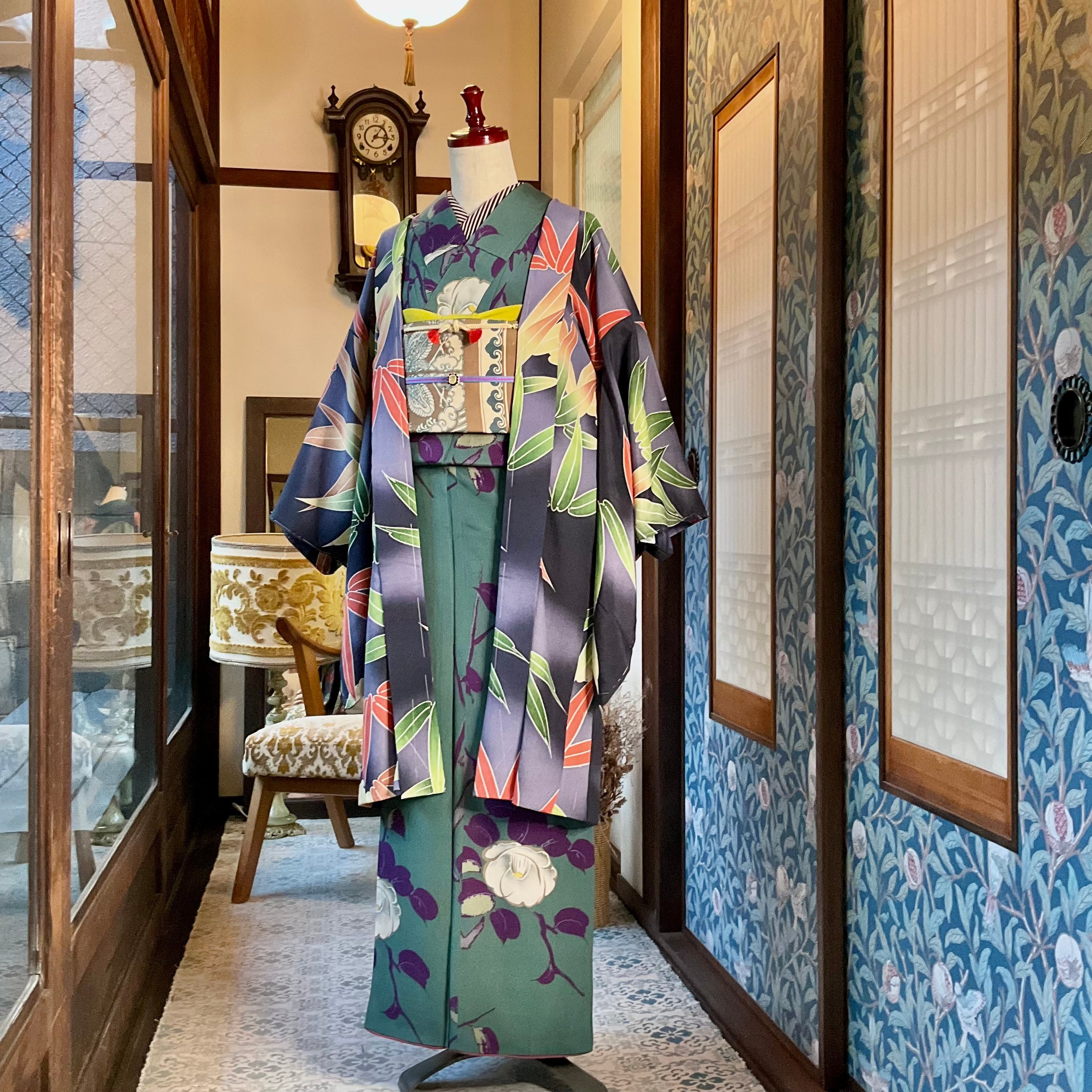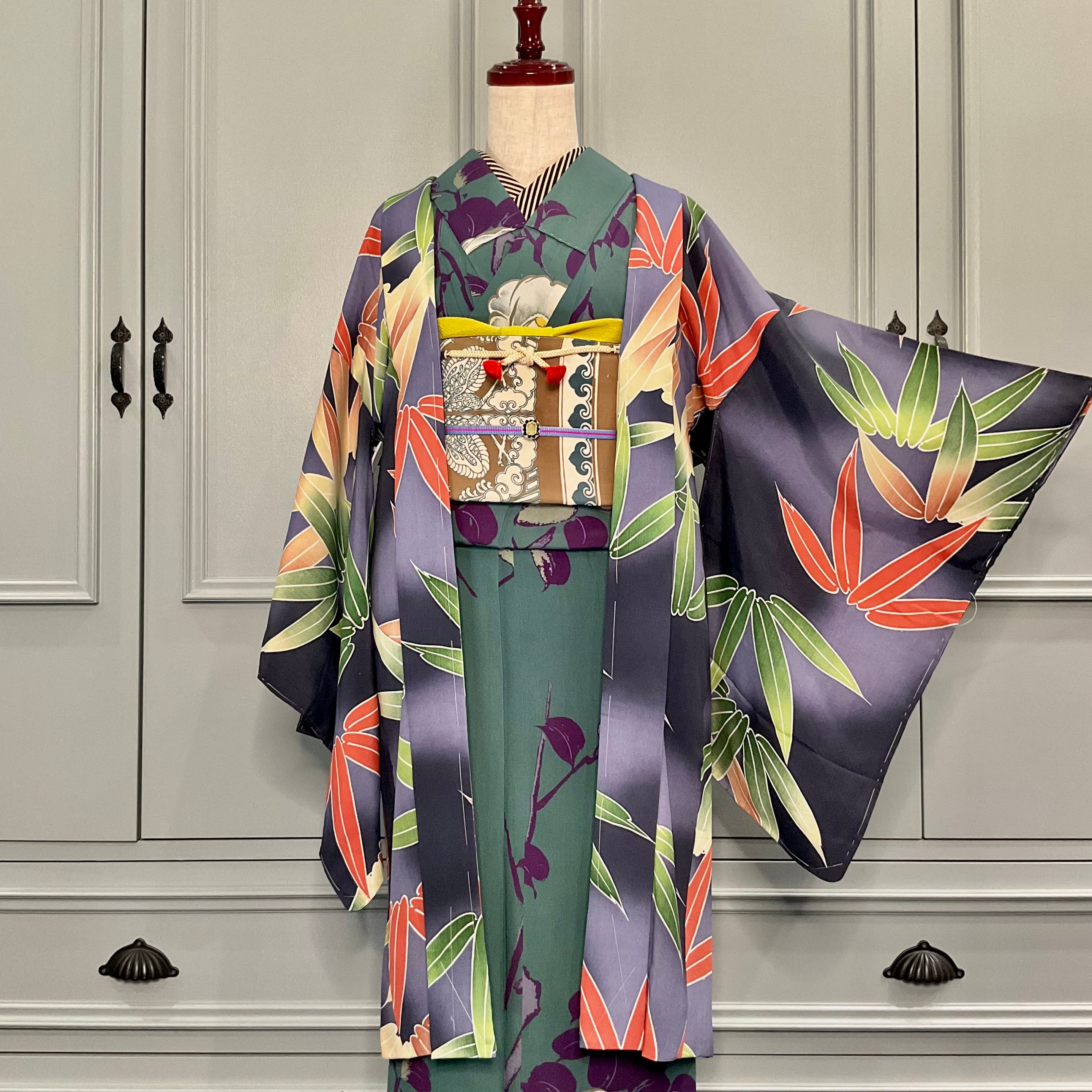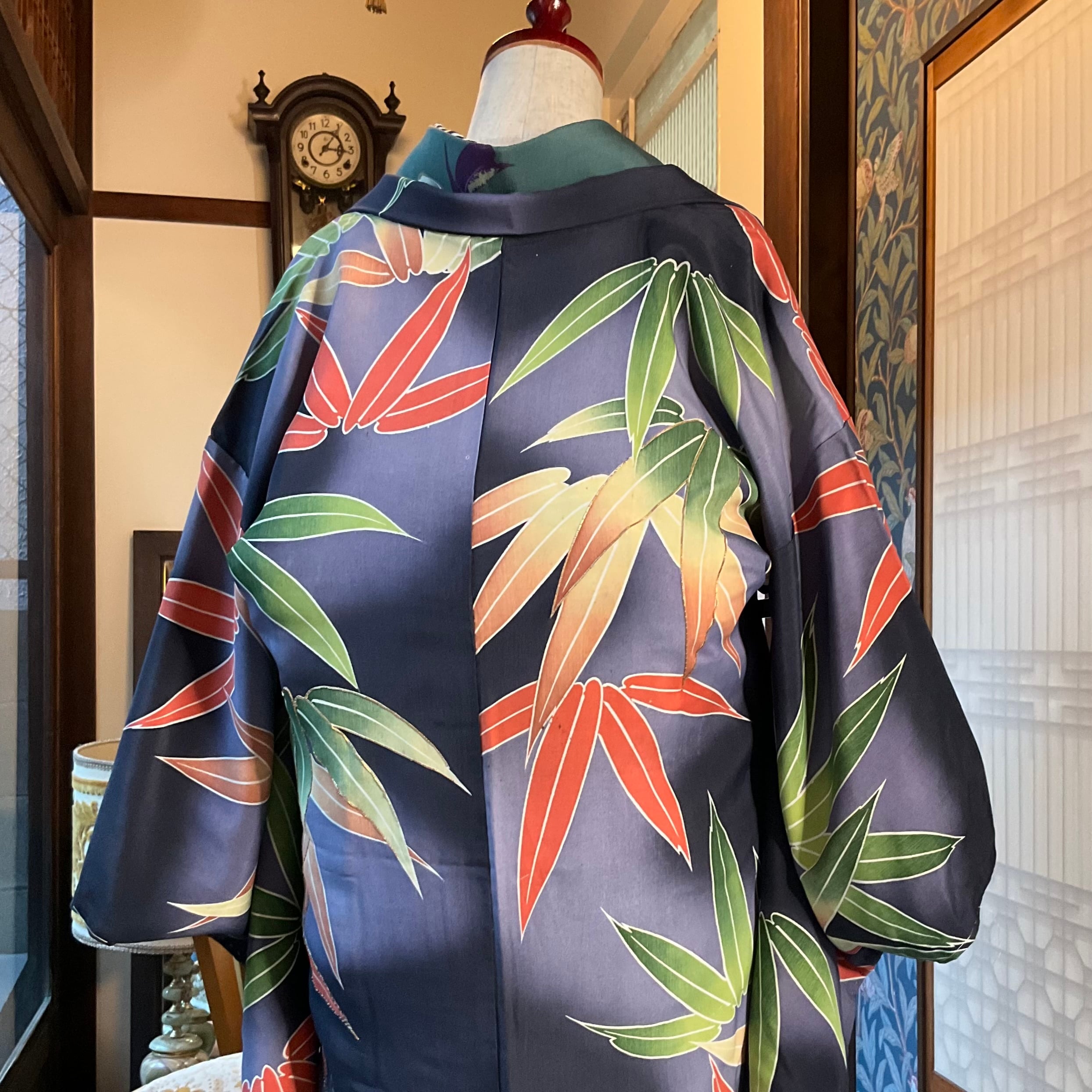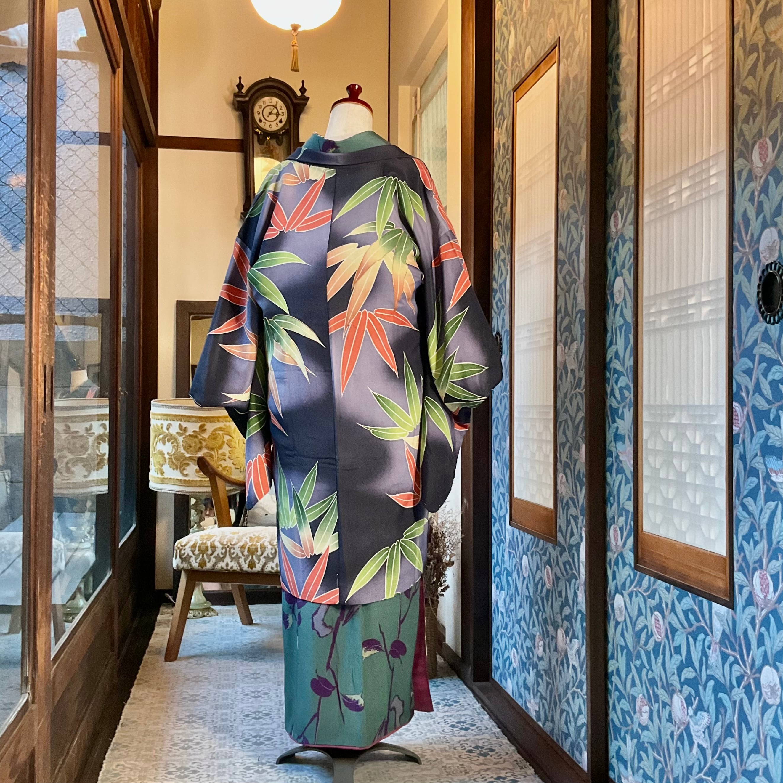 墨黒の暈し地に、グリーンとオレンジの大きな笹が描かれたアンティーク長羽織です