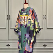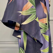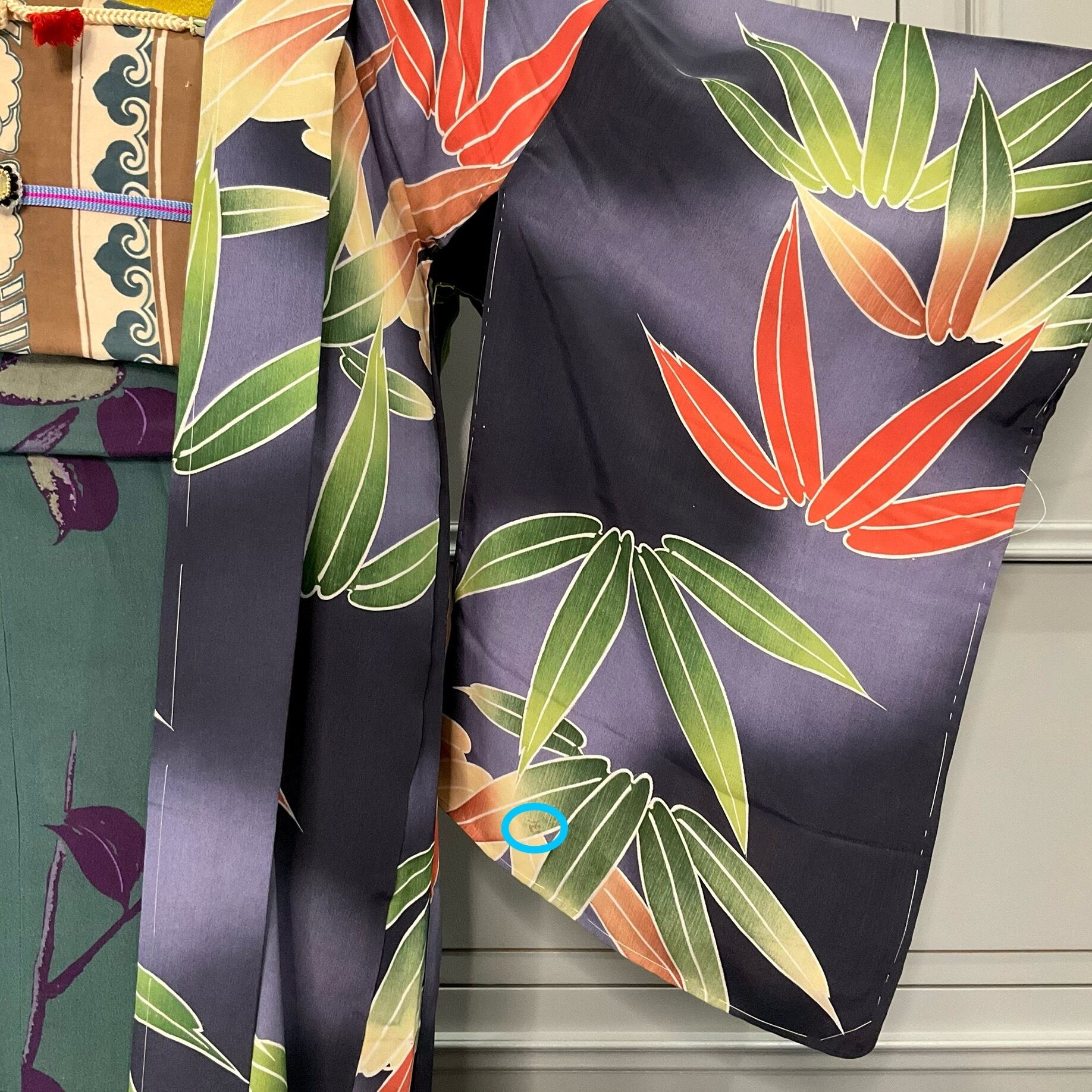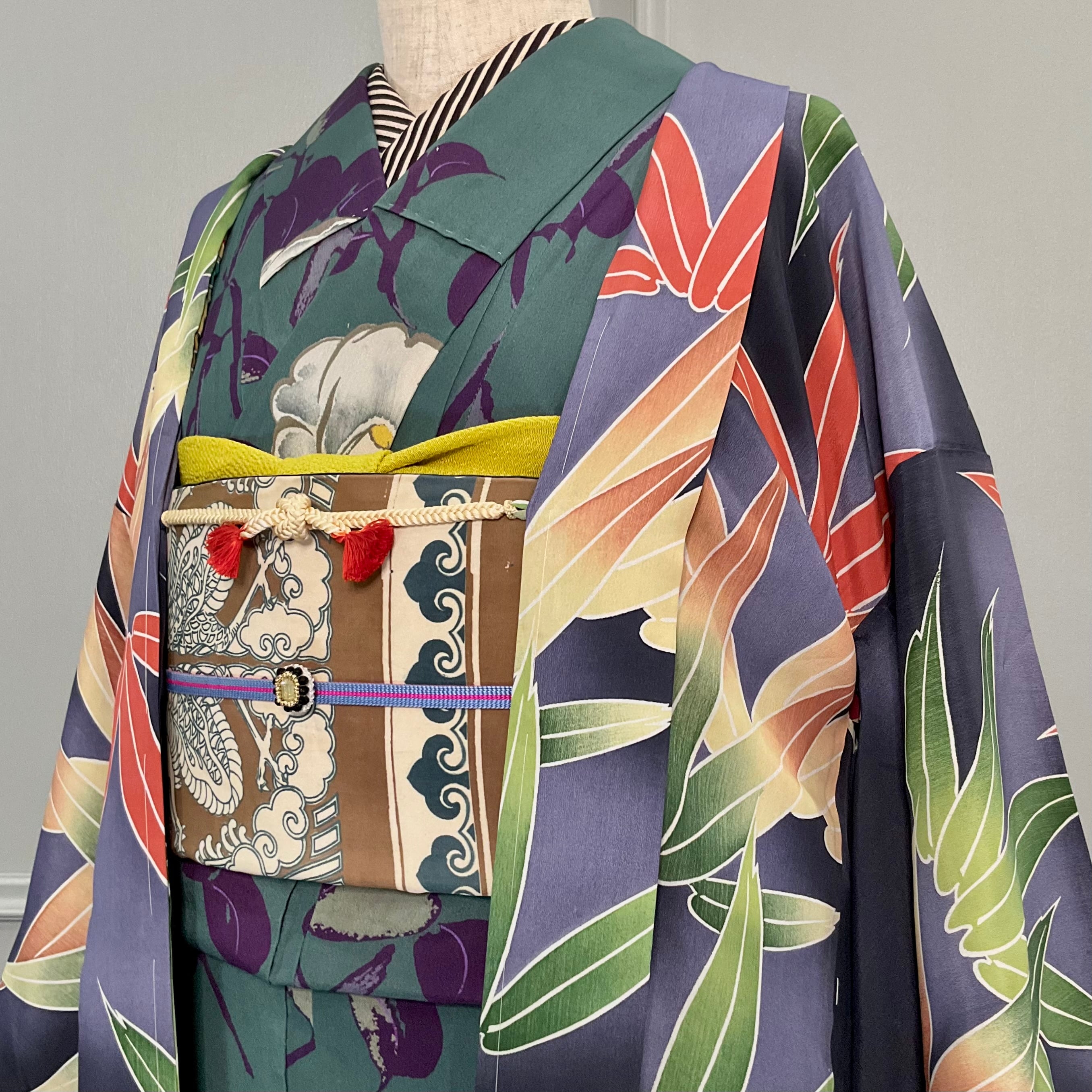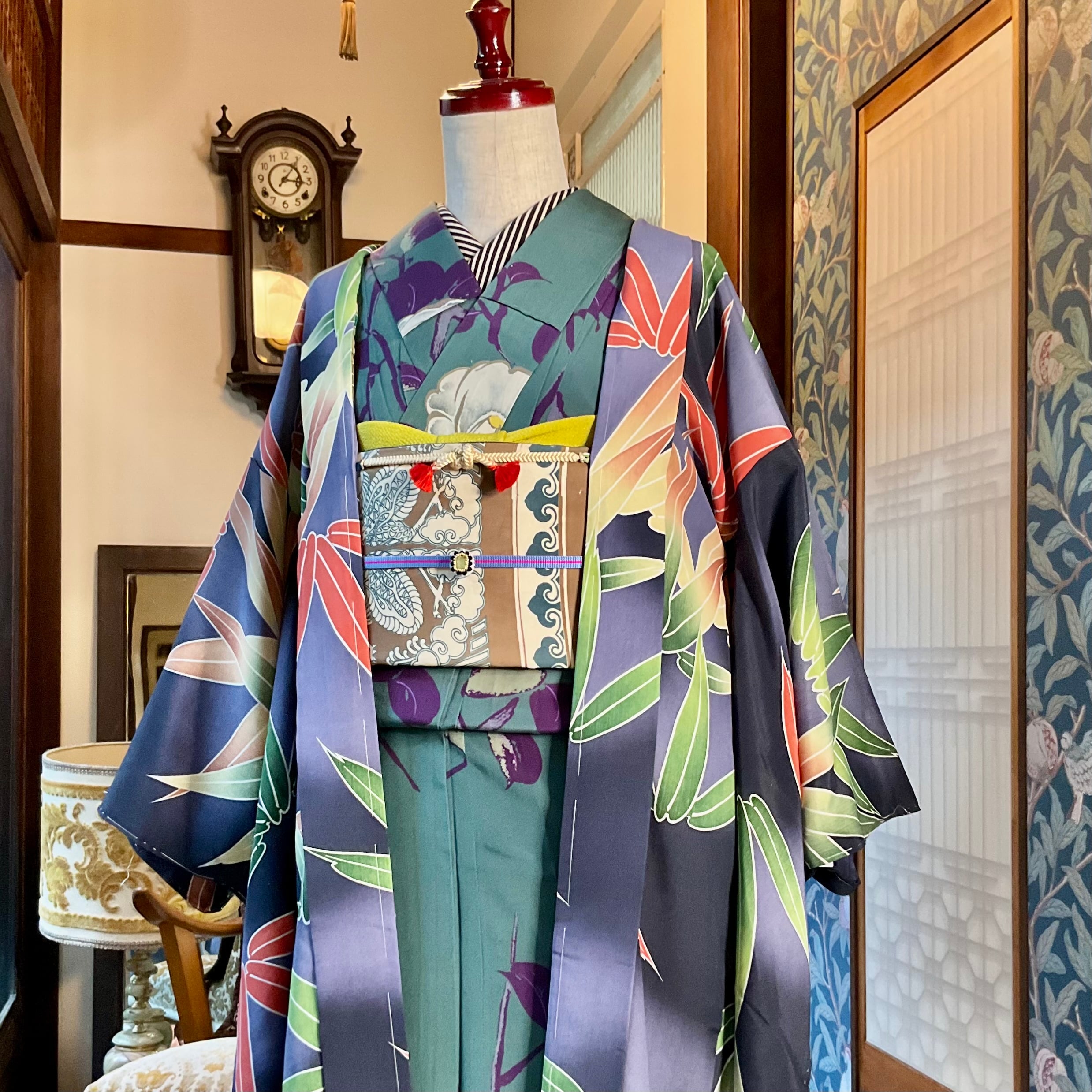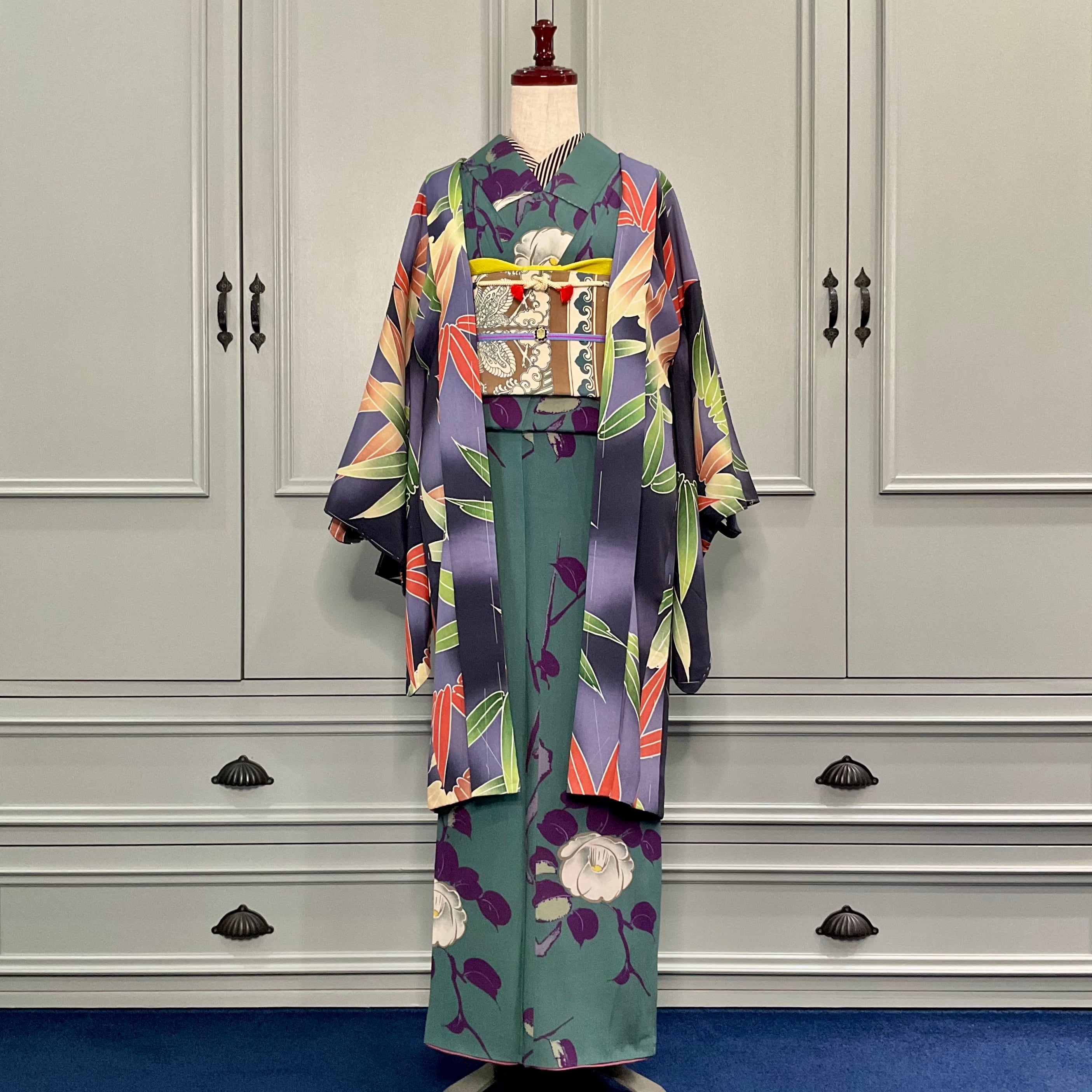 墨黒の暈し地に、グリーンとオレンジの大きな笹が描かれたアンティーク長羽織です