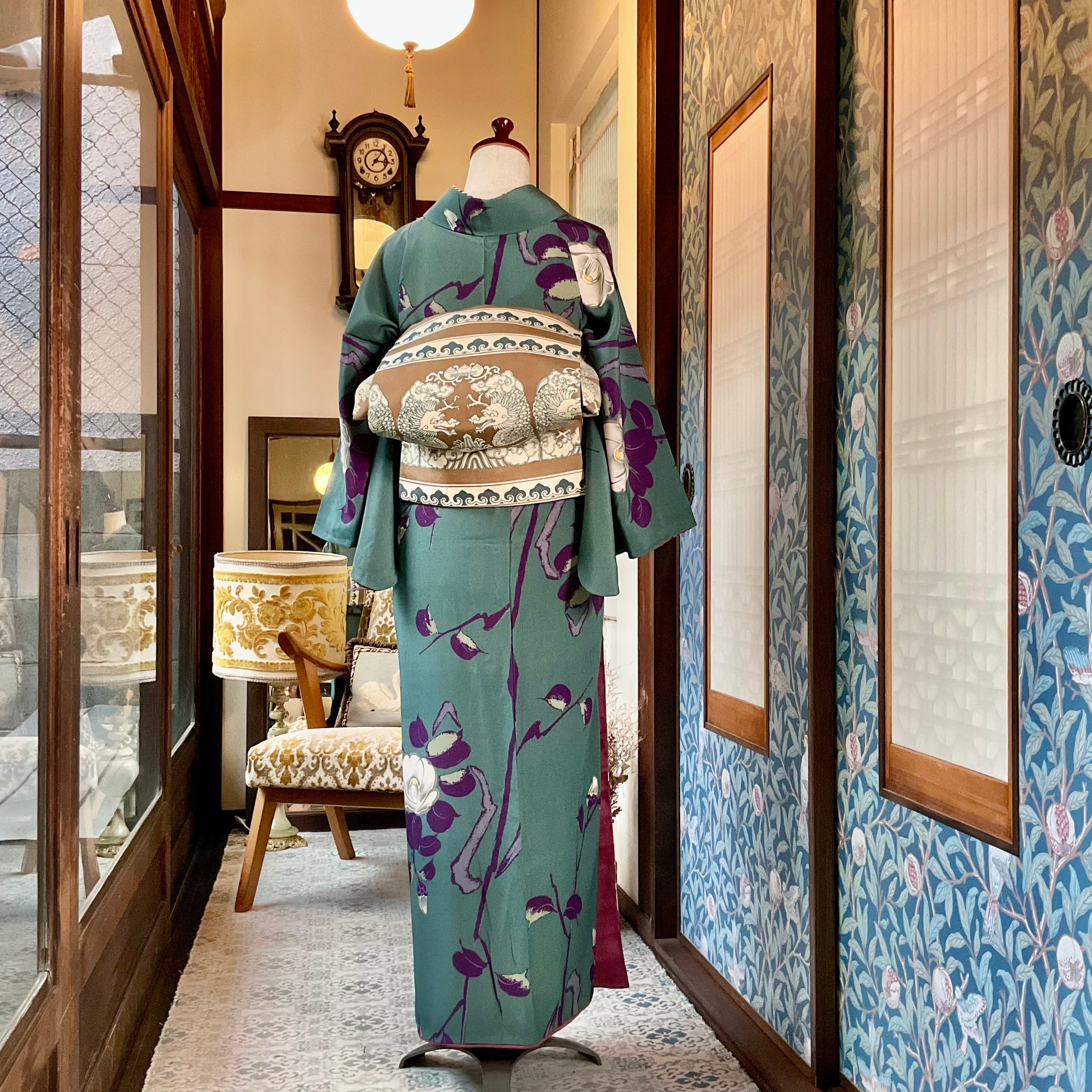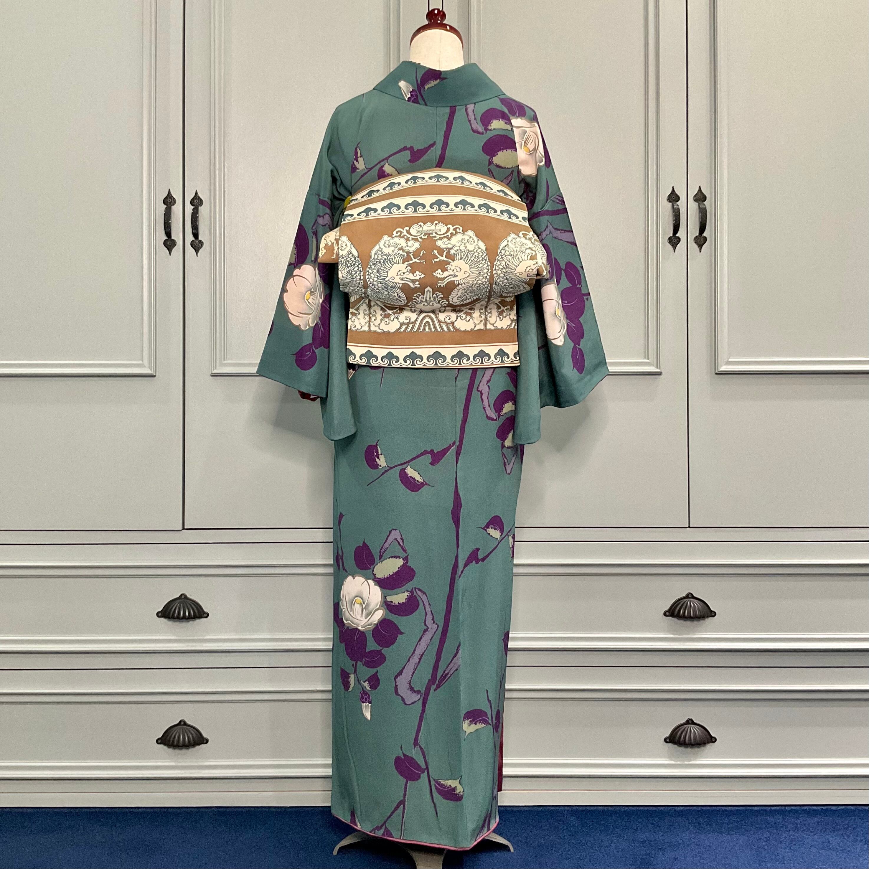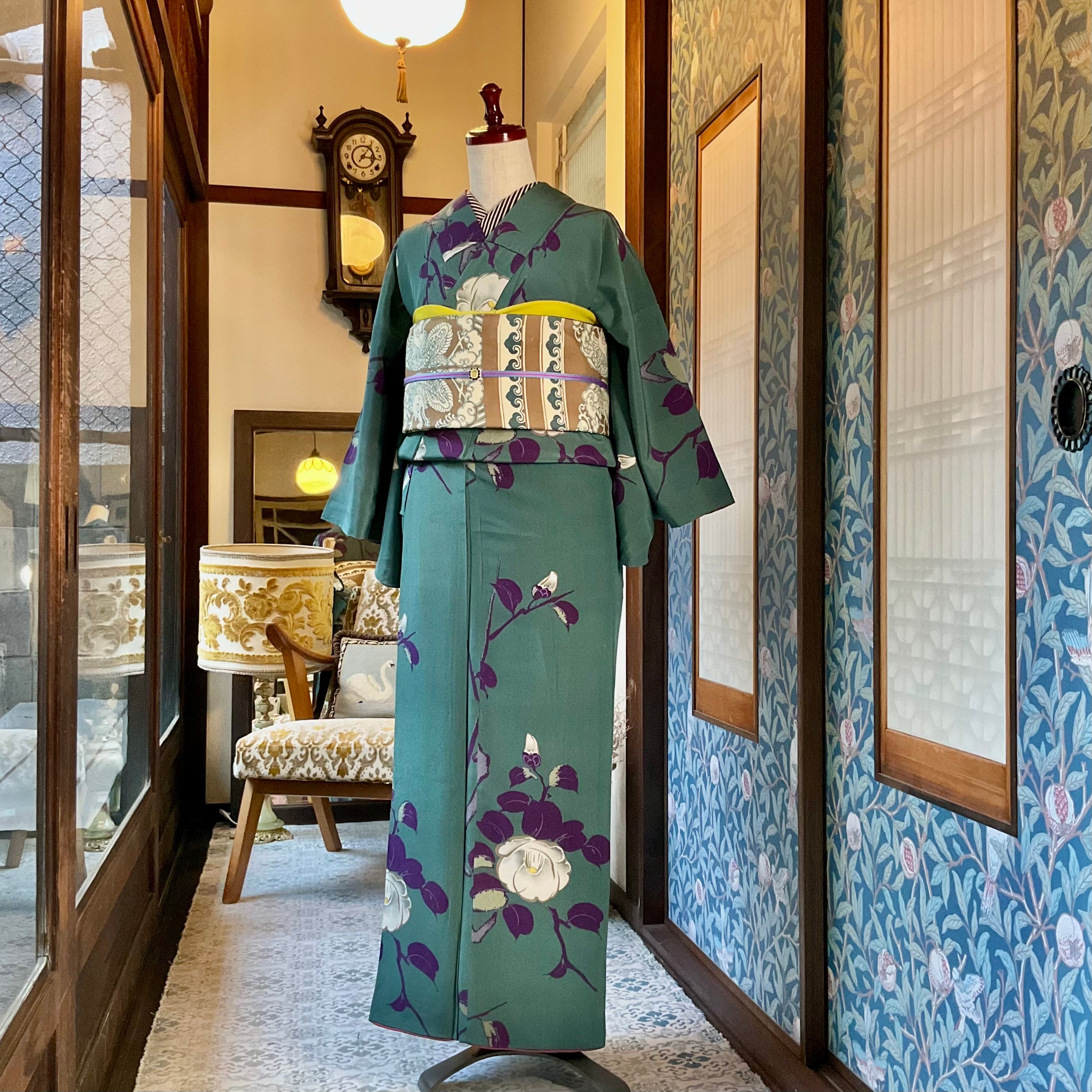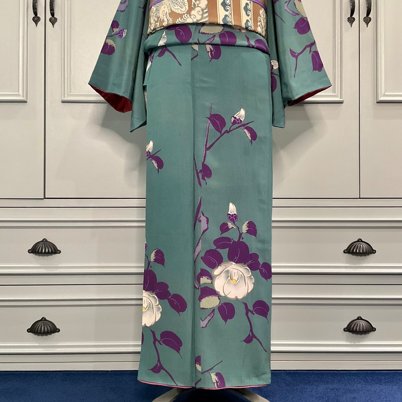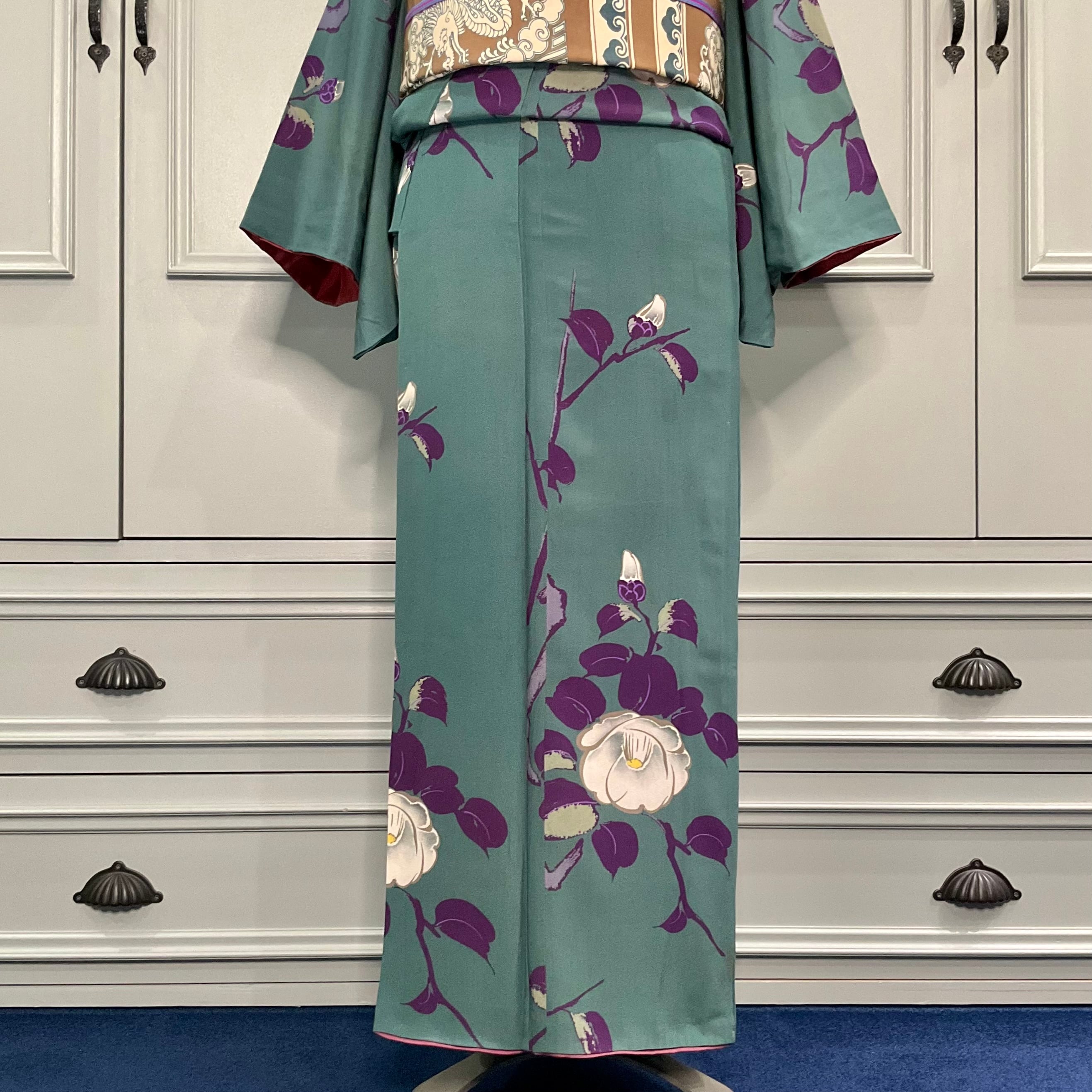くすみグリーン地に、白い椿の模様が描かれた袷のアンティーク小紋着物です