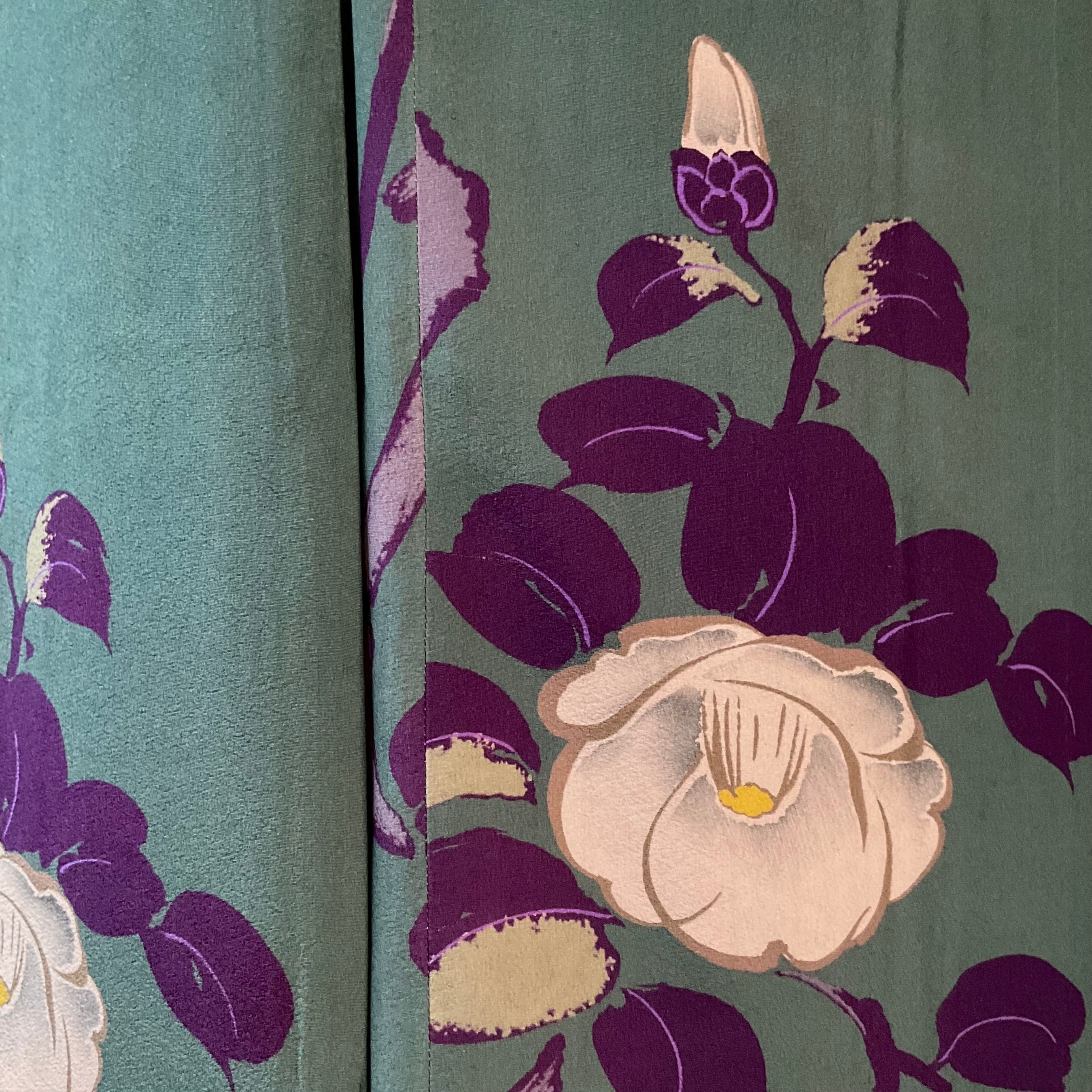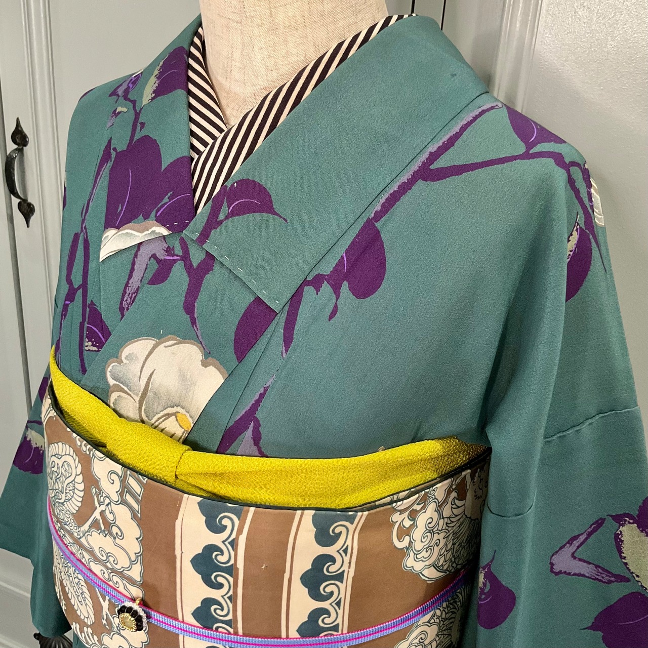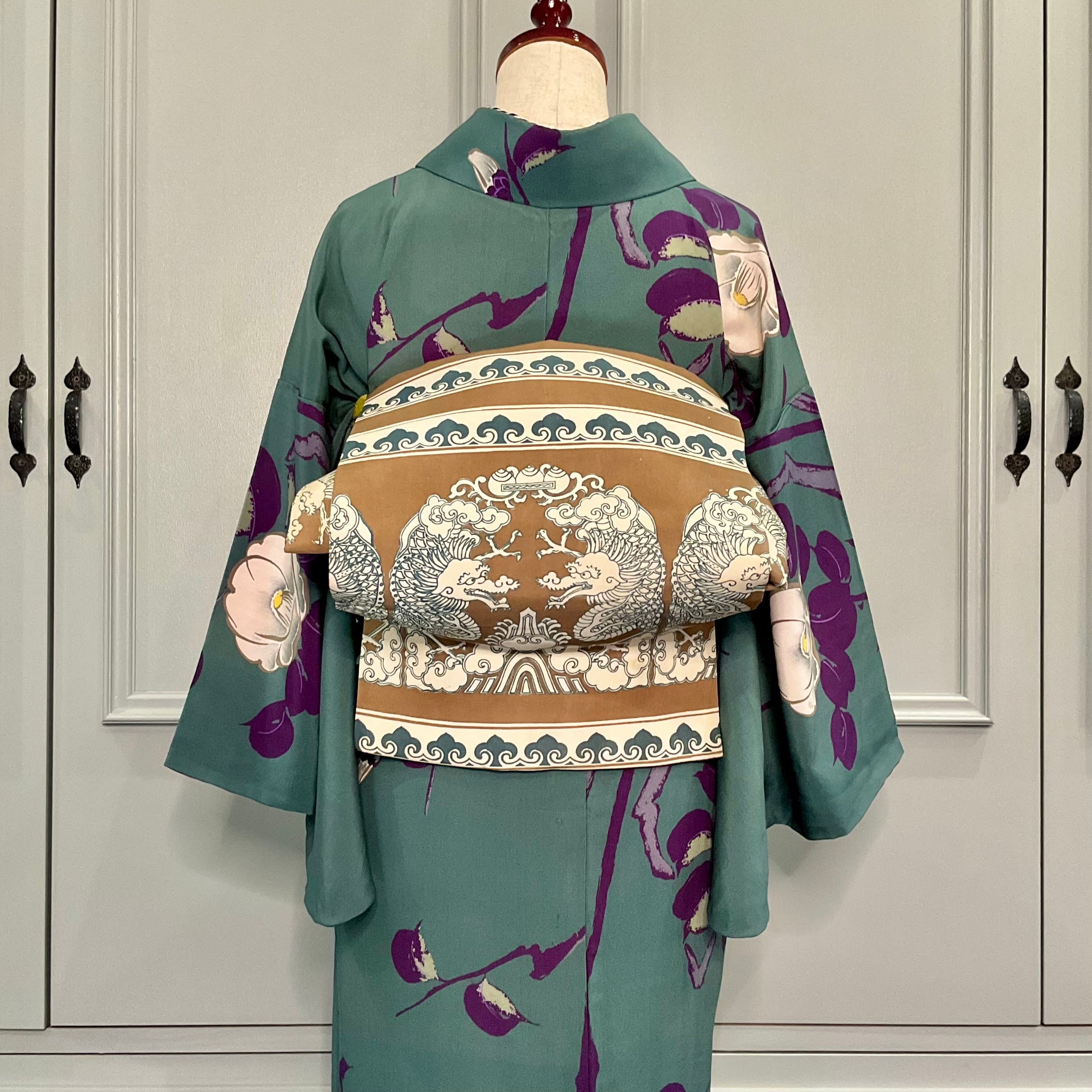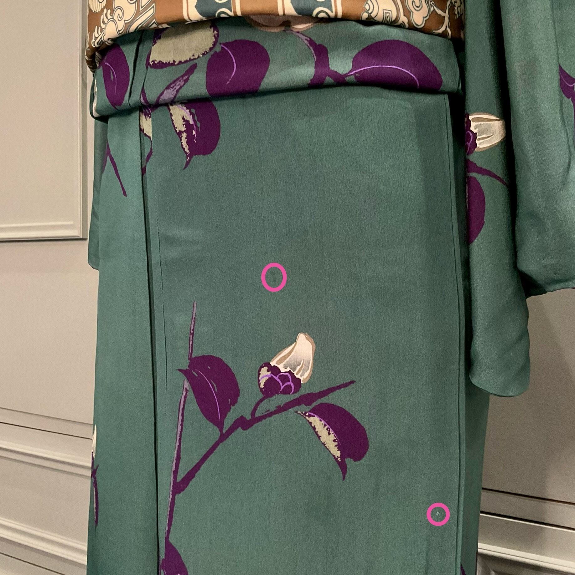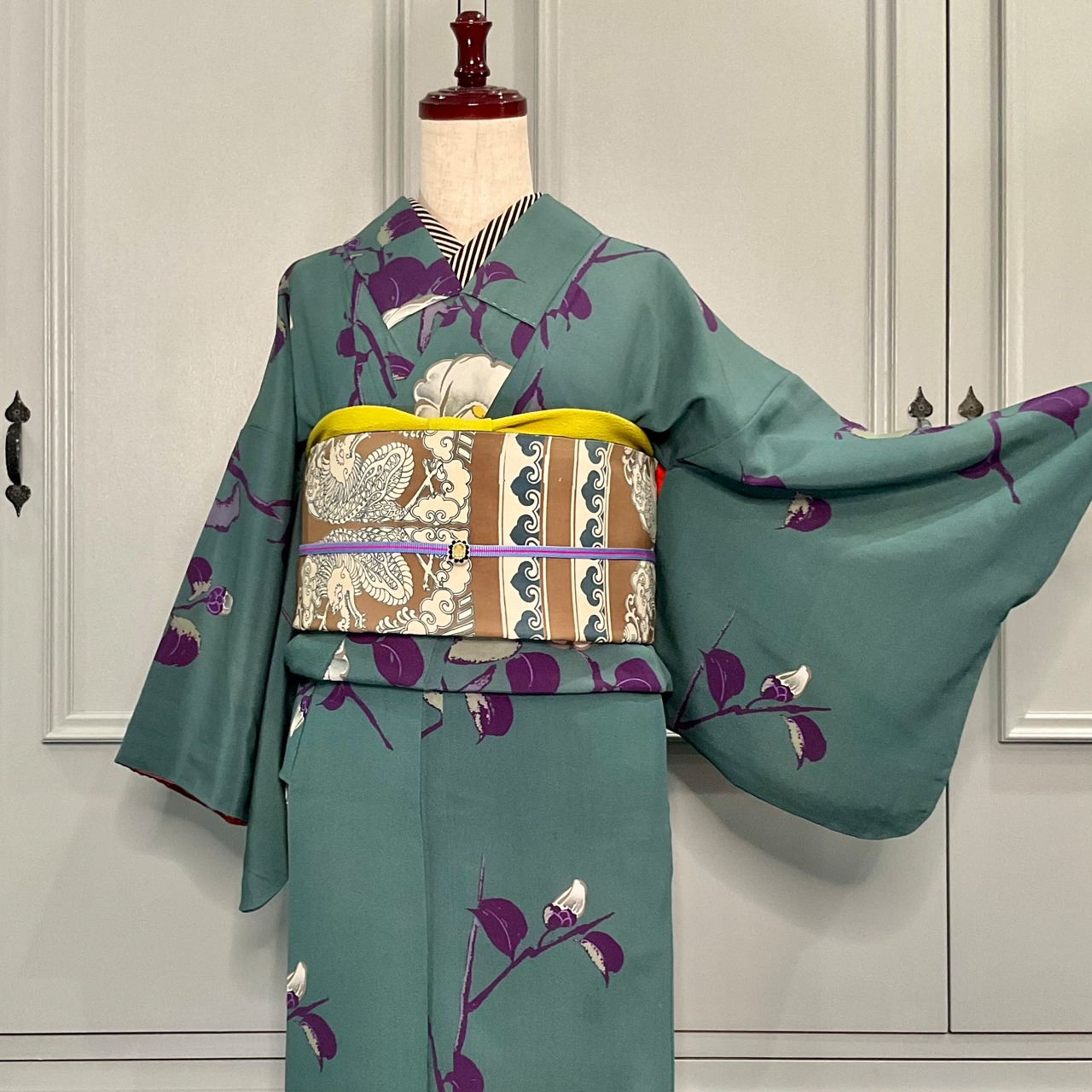 くすみグリーン地に、白い椿の模様が描かれた袷のアンティーク小紋着物です