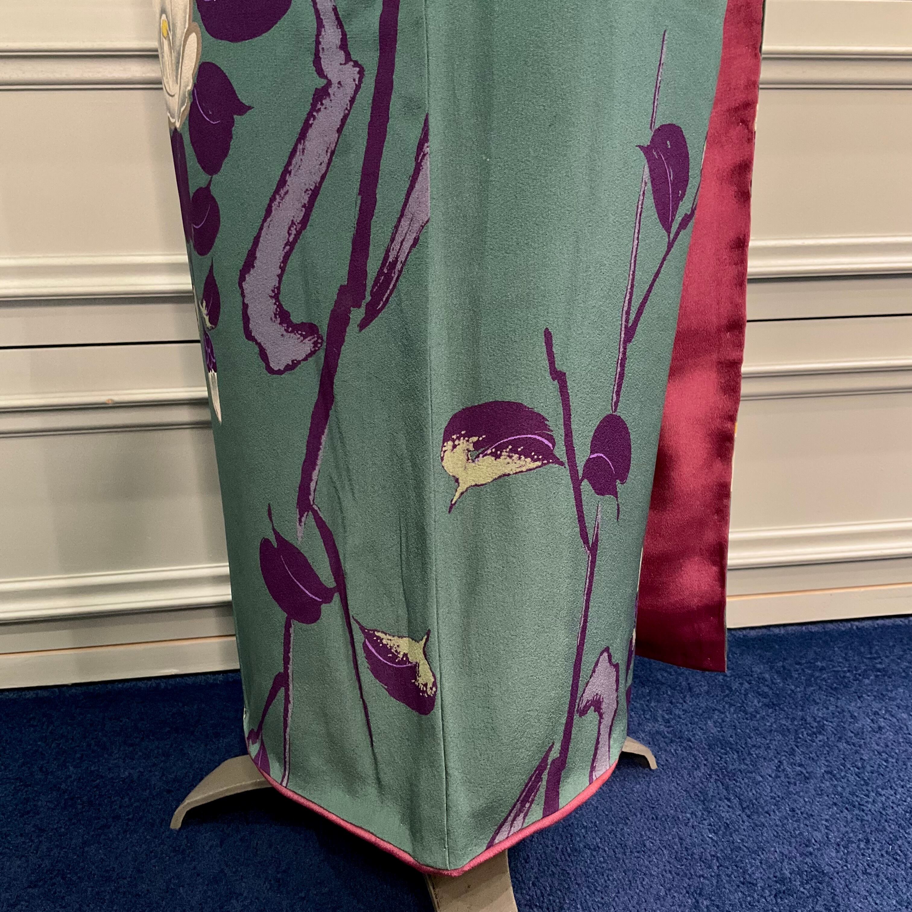 錆翠の白椿*くすみグリーン 緑 つばき 花 アンティーク小紋着物 B416