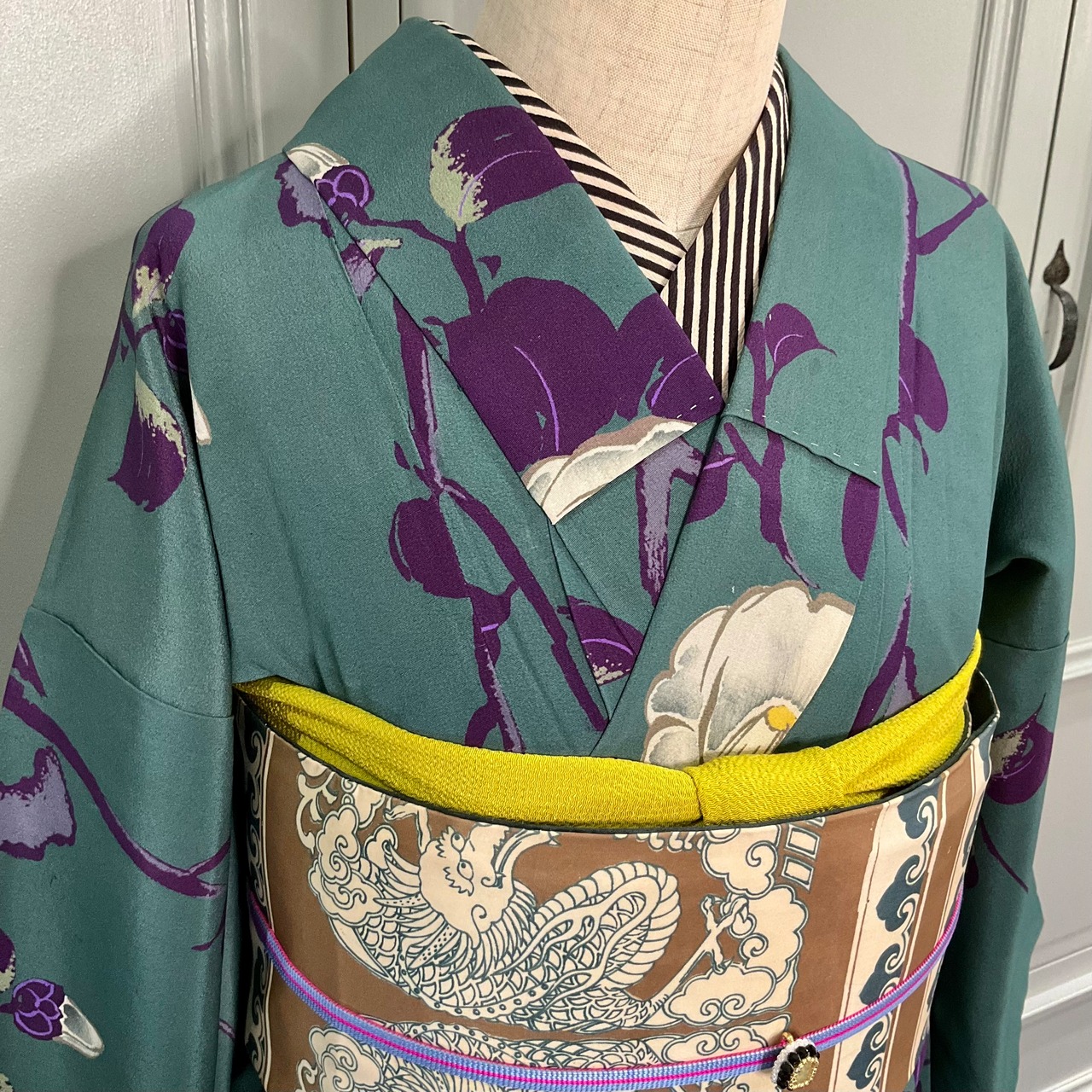 ○合わせたアンティーク昼夜帯、オリジナル帯揚げライムグリーン、オリジナル三分紐リバーシブルライン サックスブルー×オーキッドピンクもwebshop掲載品です♪