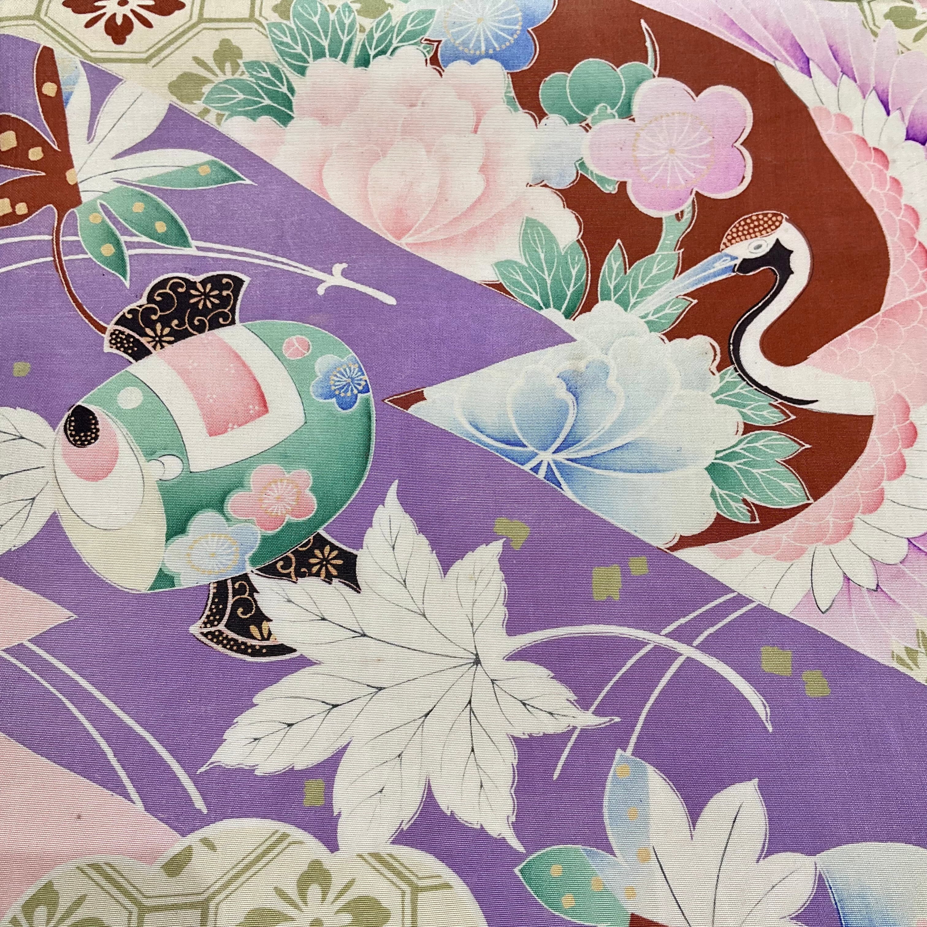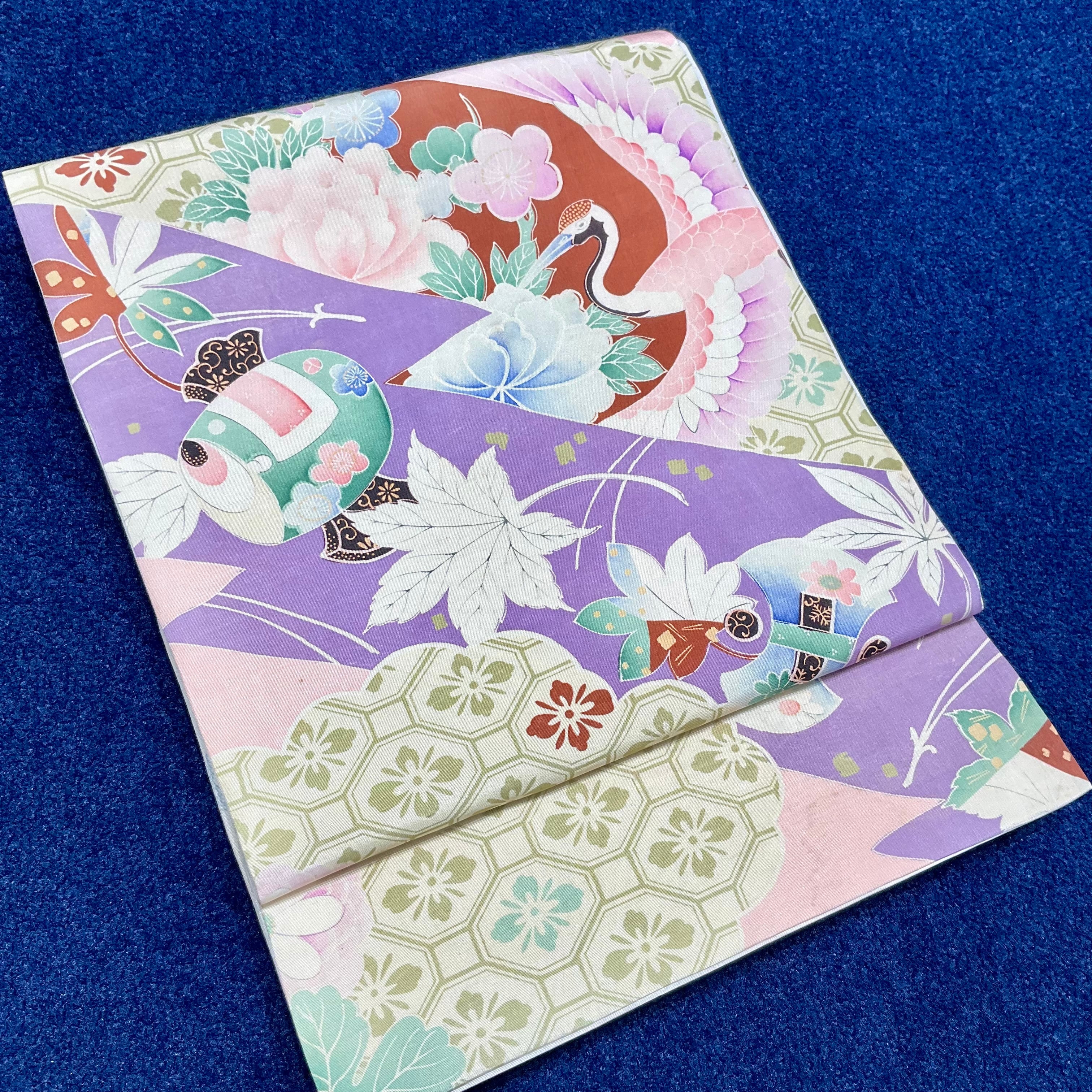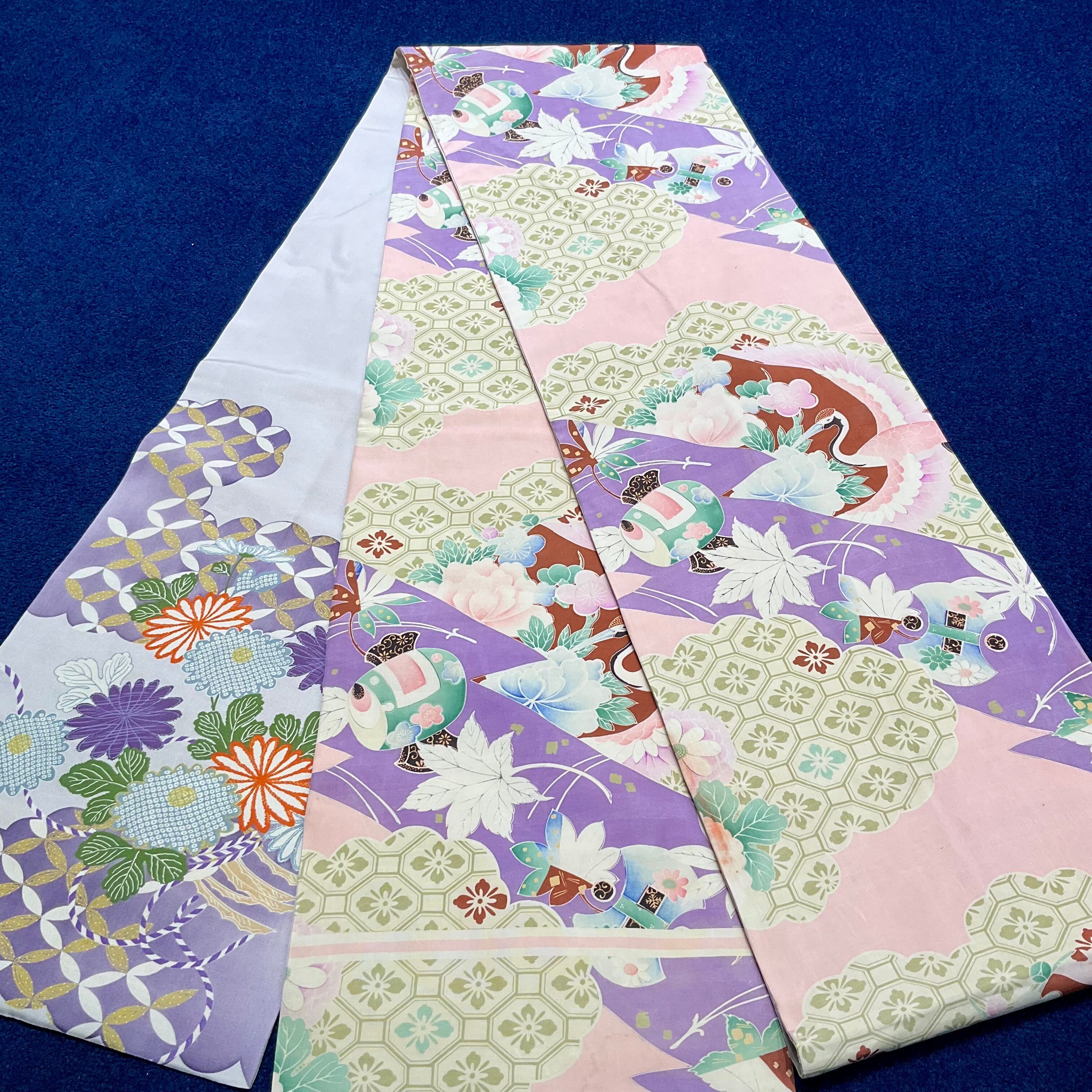 パープル×ピンク地に、鶴や宝尽し、亀甲花菱、紅葉やお花の模様が染められたリバーシブルのアンティーク昼夜帯 (開き名古屋帯) です