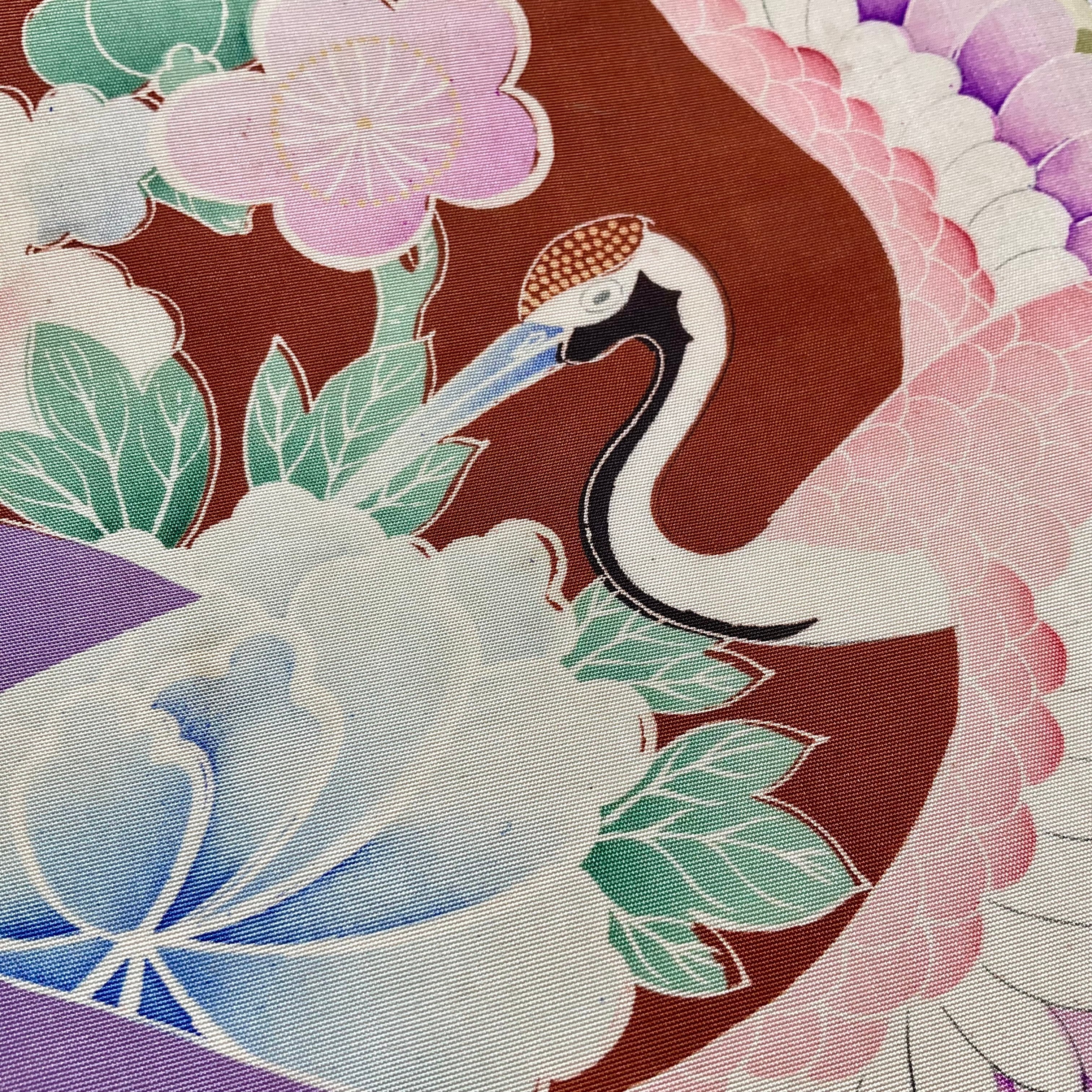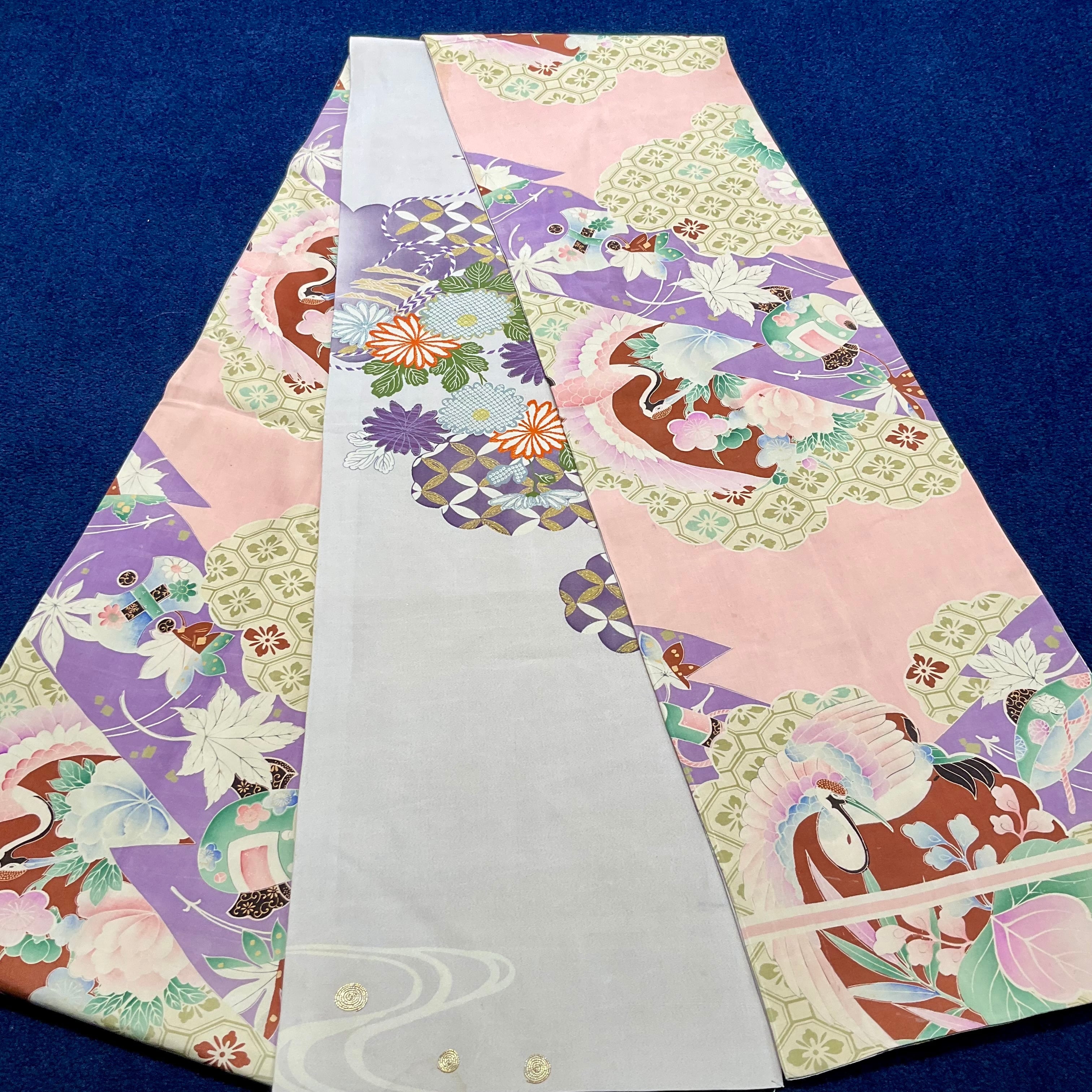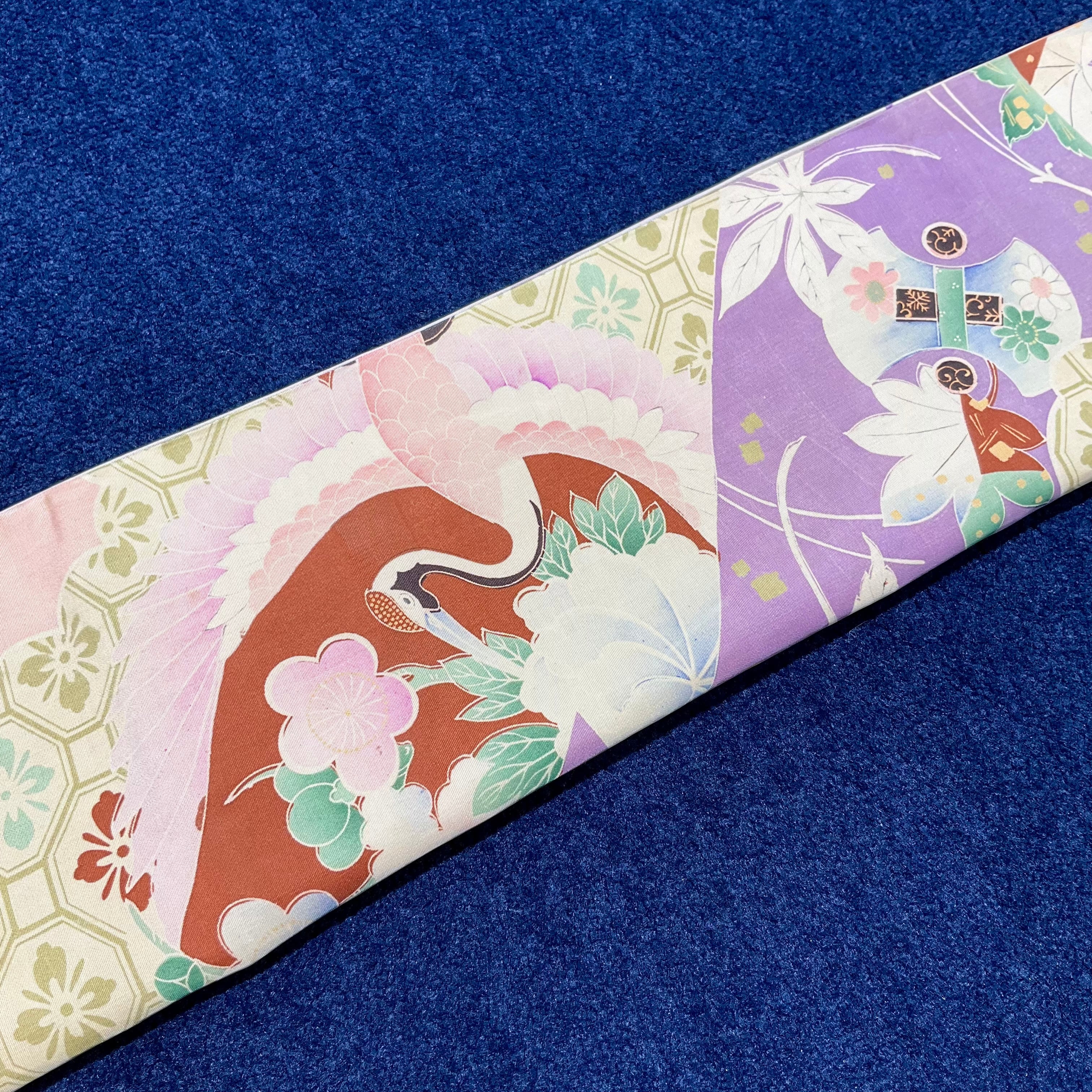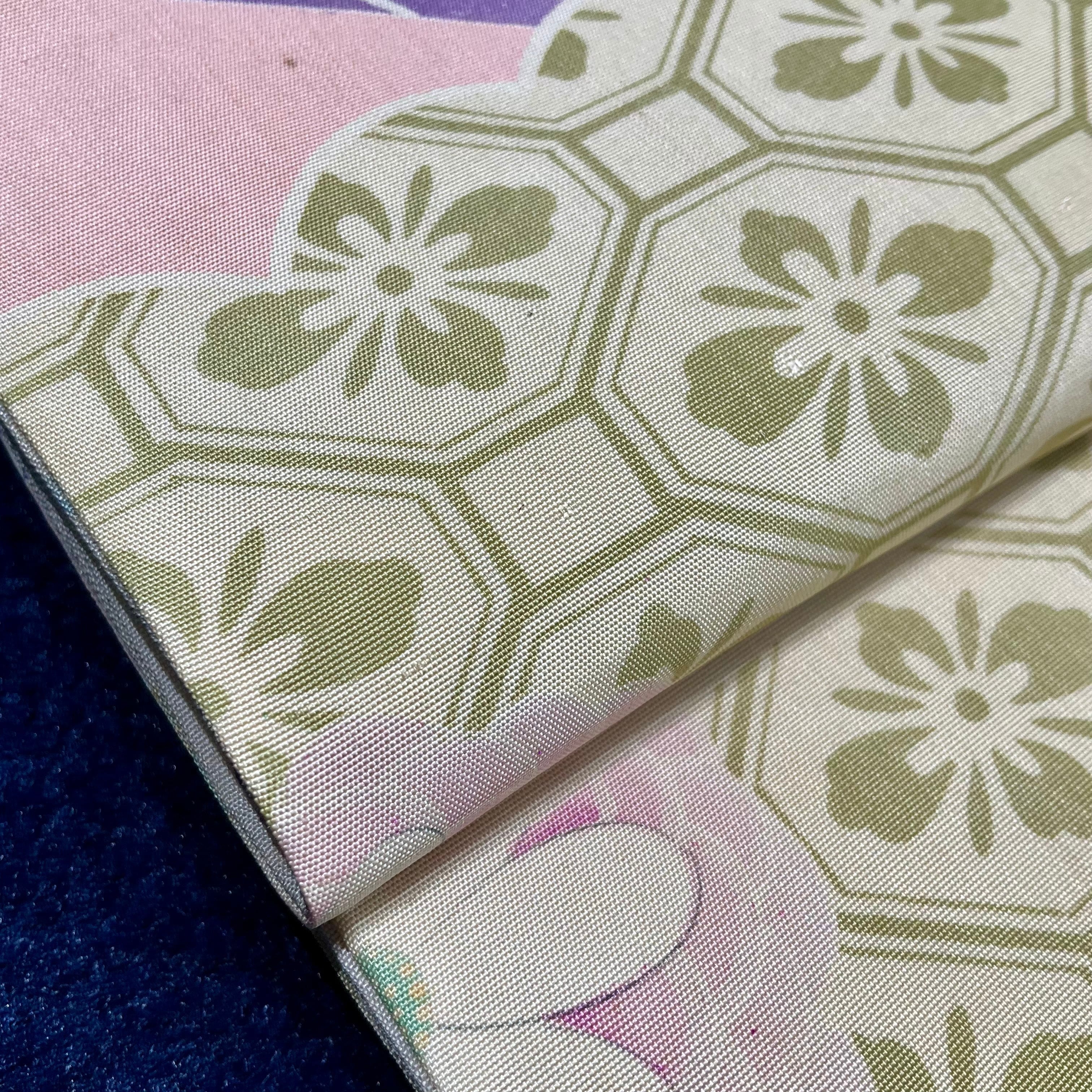 初春の鶴の宴*宝尽し 亀甲花菱 雲取り 紅葉 菊 リバーシブル パープル ピンク 染め帯 古典 アンティーク昼夜帯 開き名古屋帯 B421