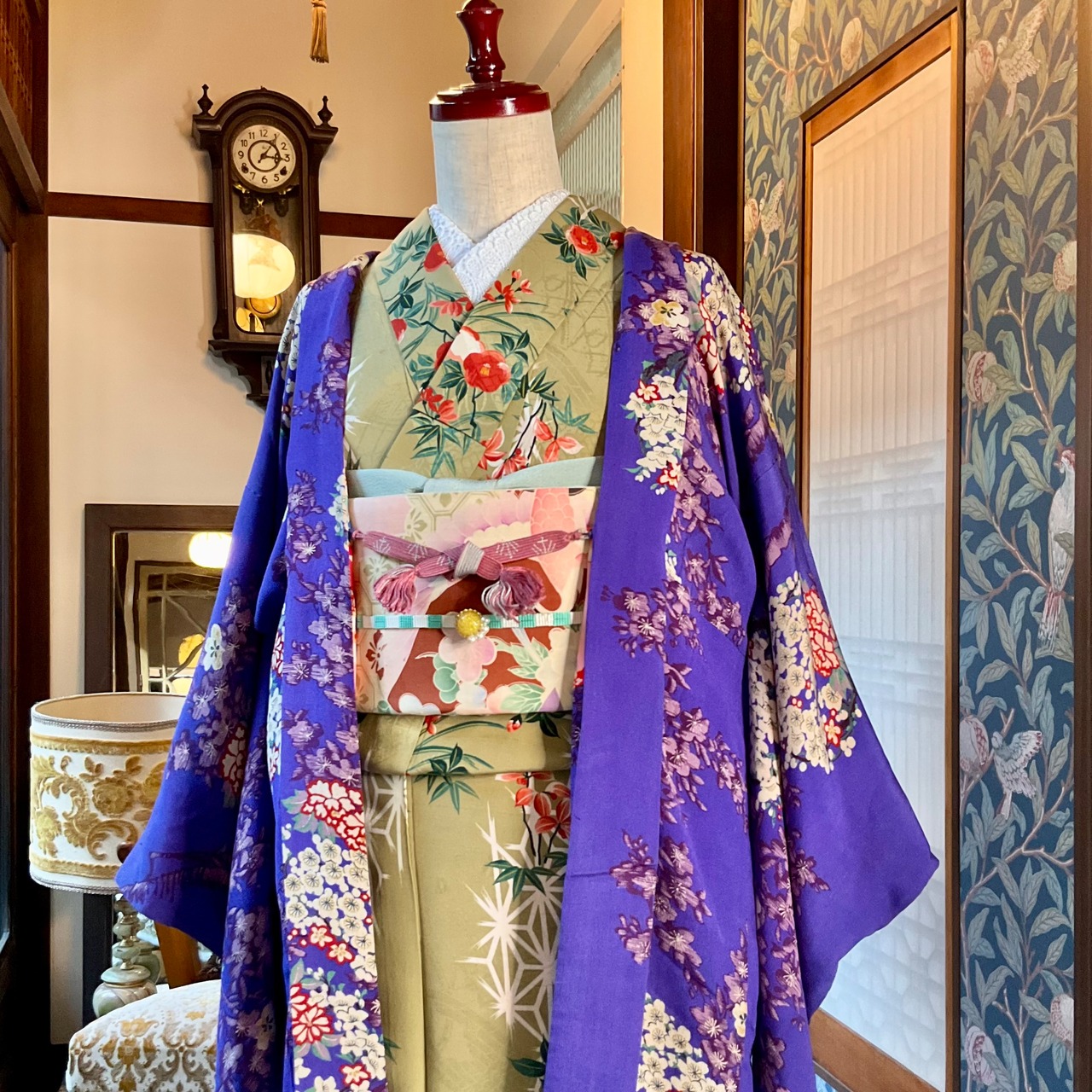 ○合わせたアンティーク小紋着物、アンティーク昼夜帯、オリジナル帯揚げグリーンラテ、オリジナル三分紐しましまグリーン×白もWebshop掲載品です♪
