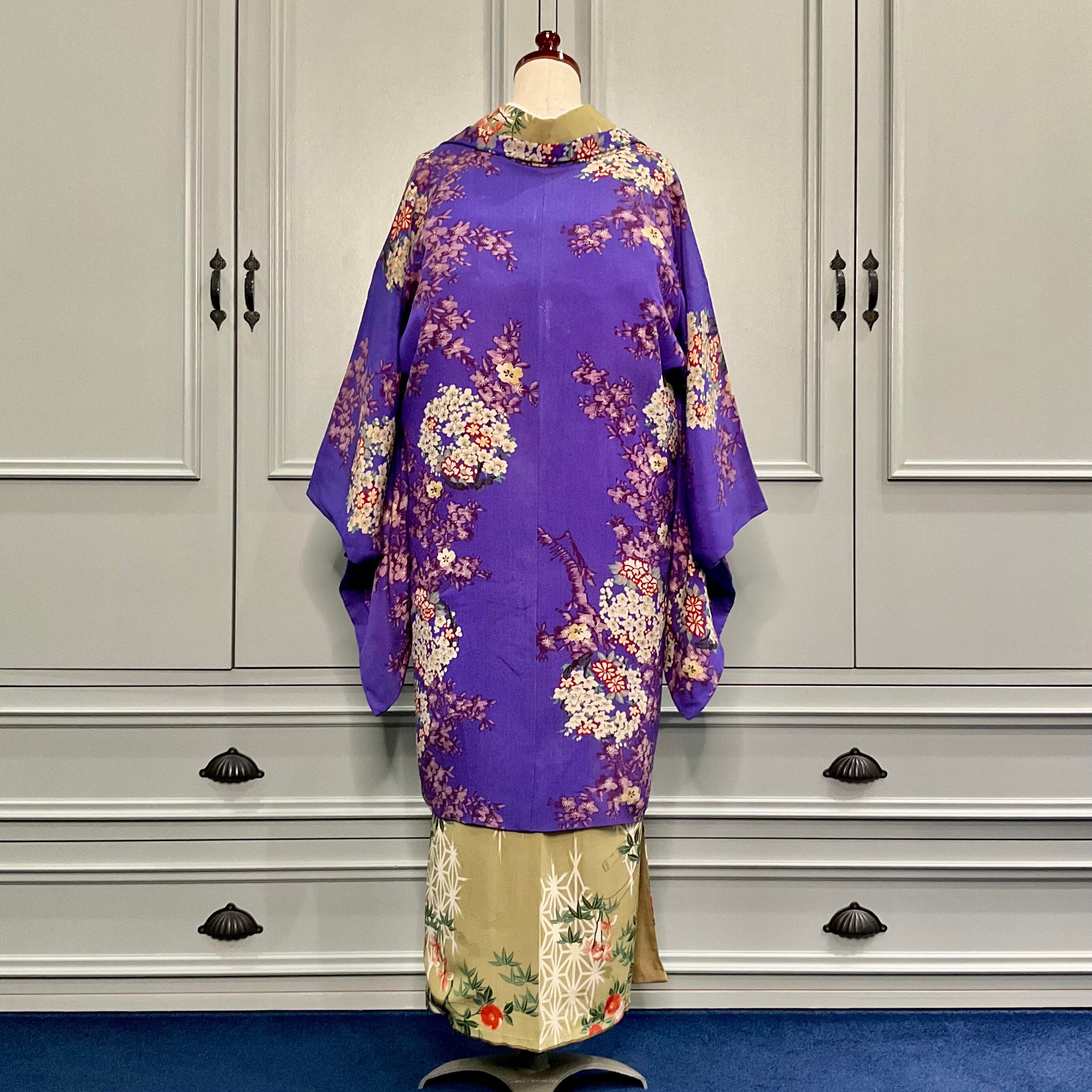 紫幻のおぼろ花*小花 花丸 パープル 紫 縮緬 アンティーク長羽織 B422