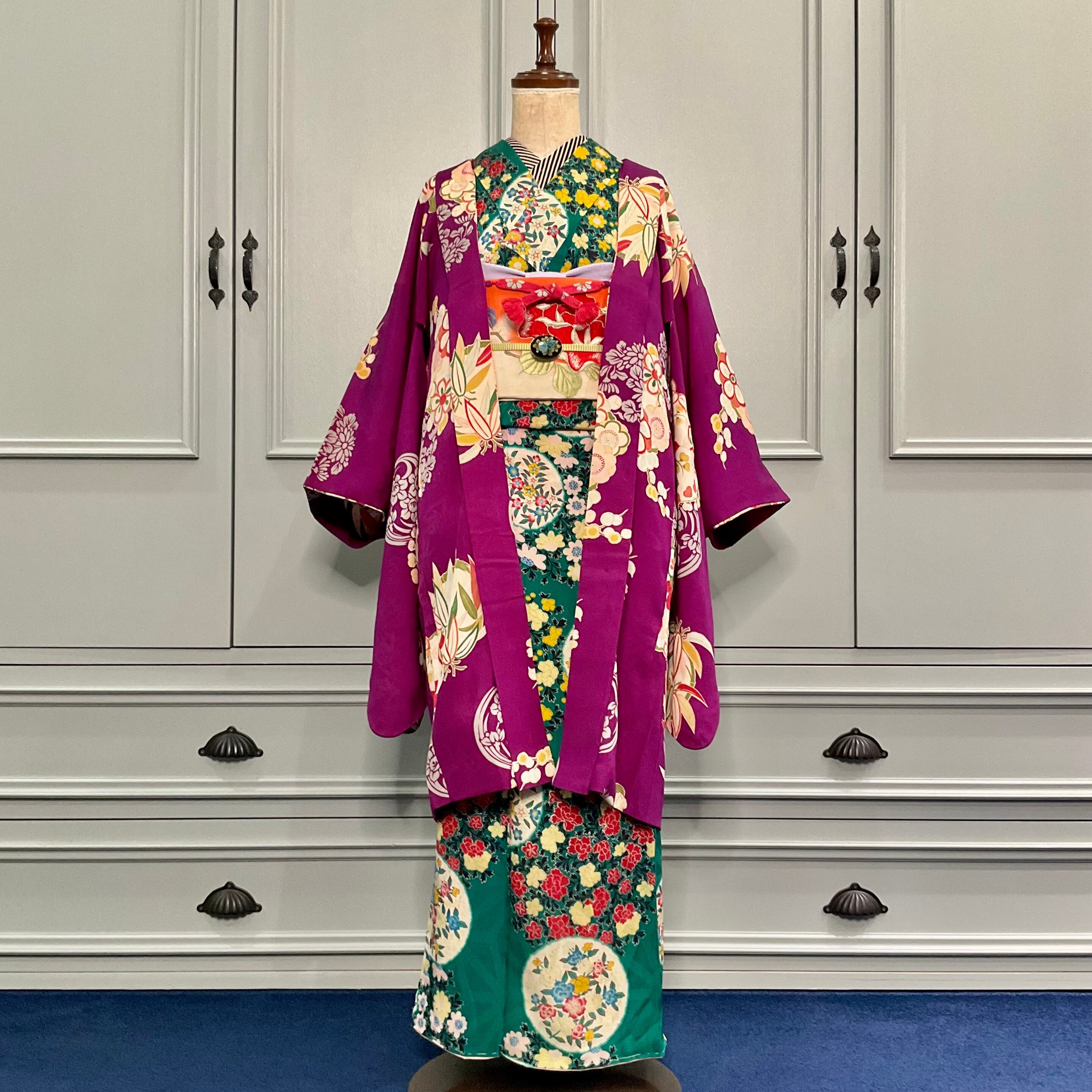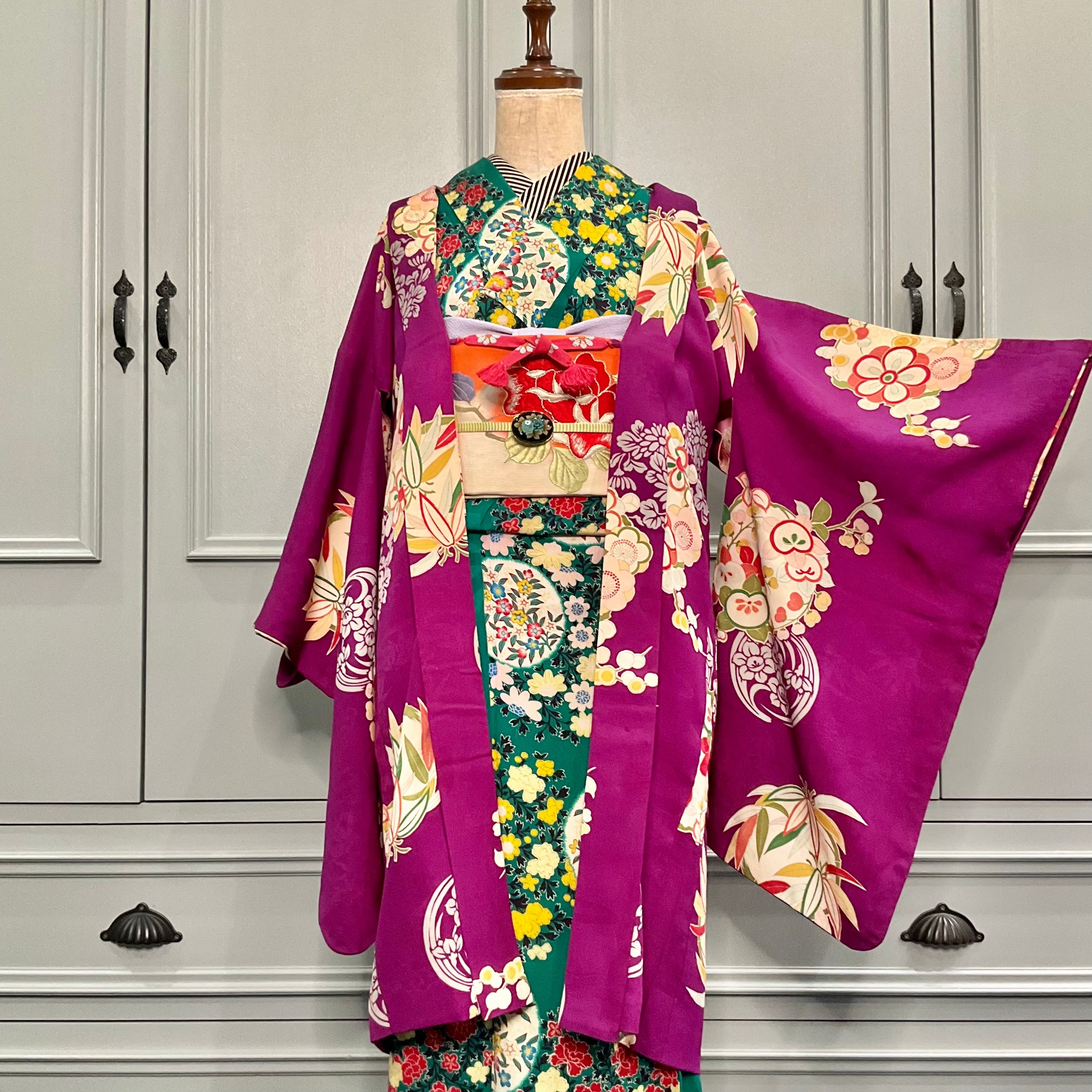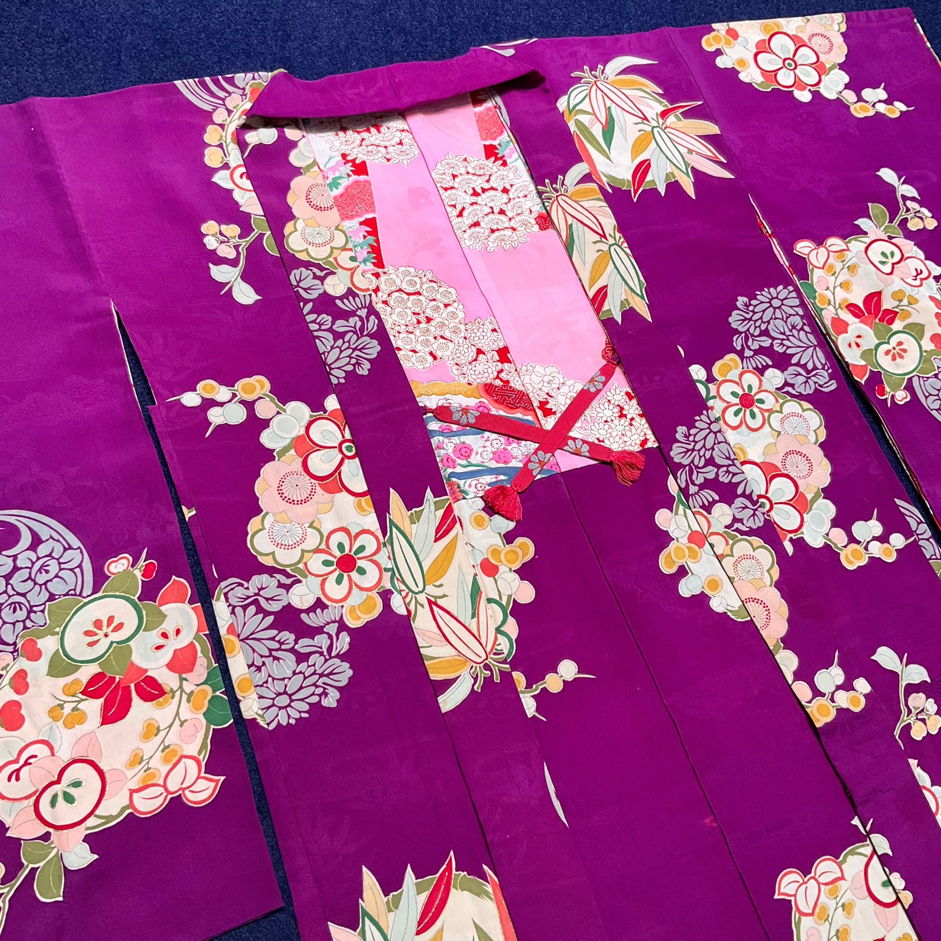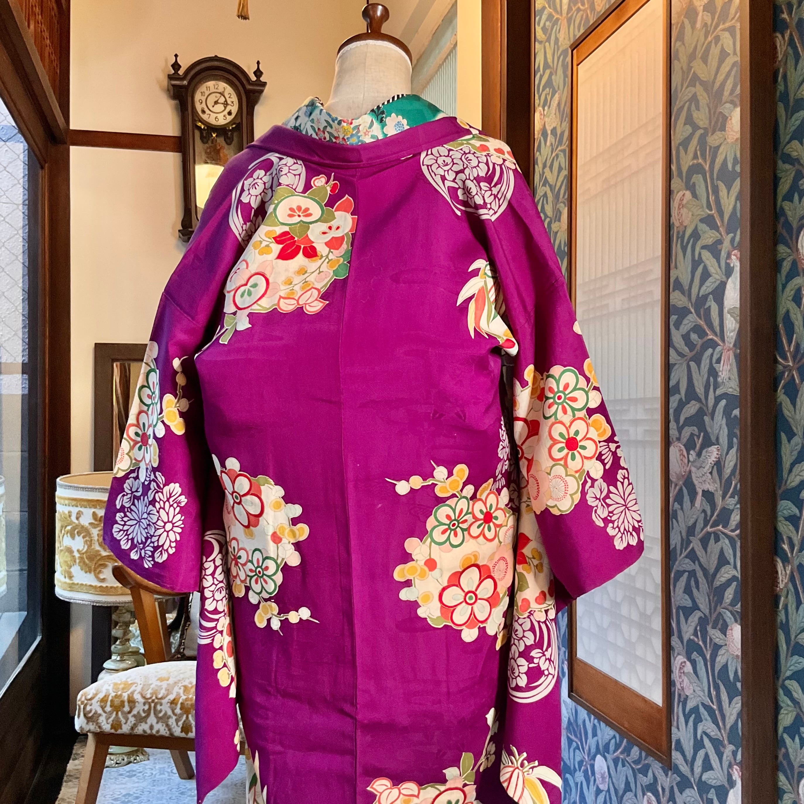 アンティークらしい発色の綺麗なパープル地に、華やかな色づかいの梅や橘、笹などの花丸が美しい一着✨️