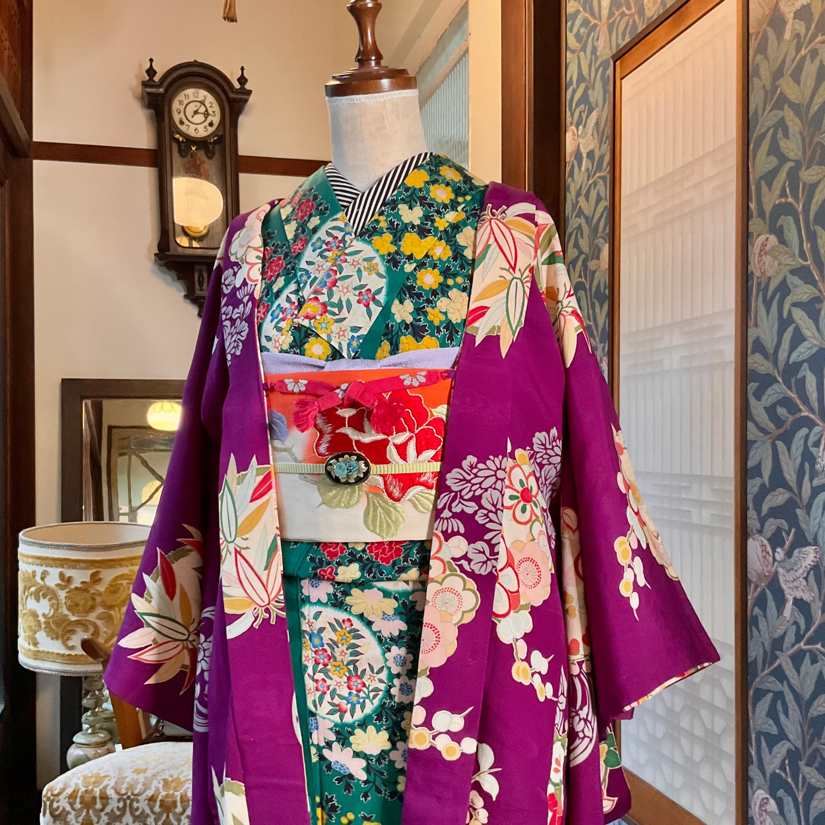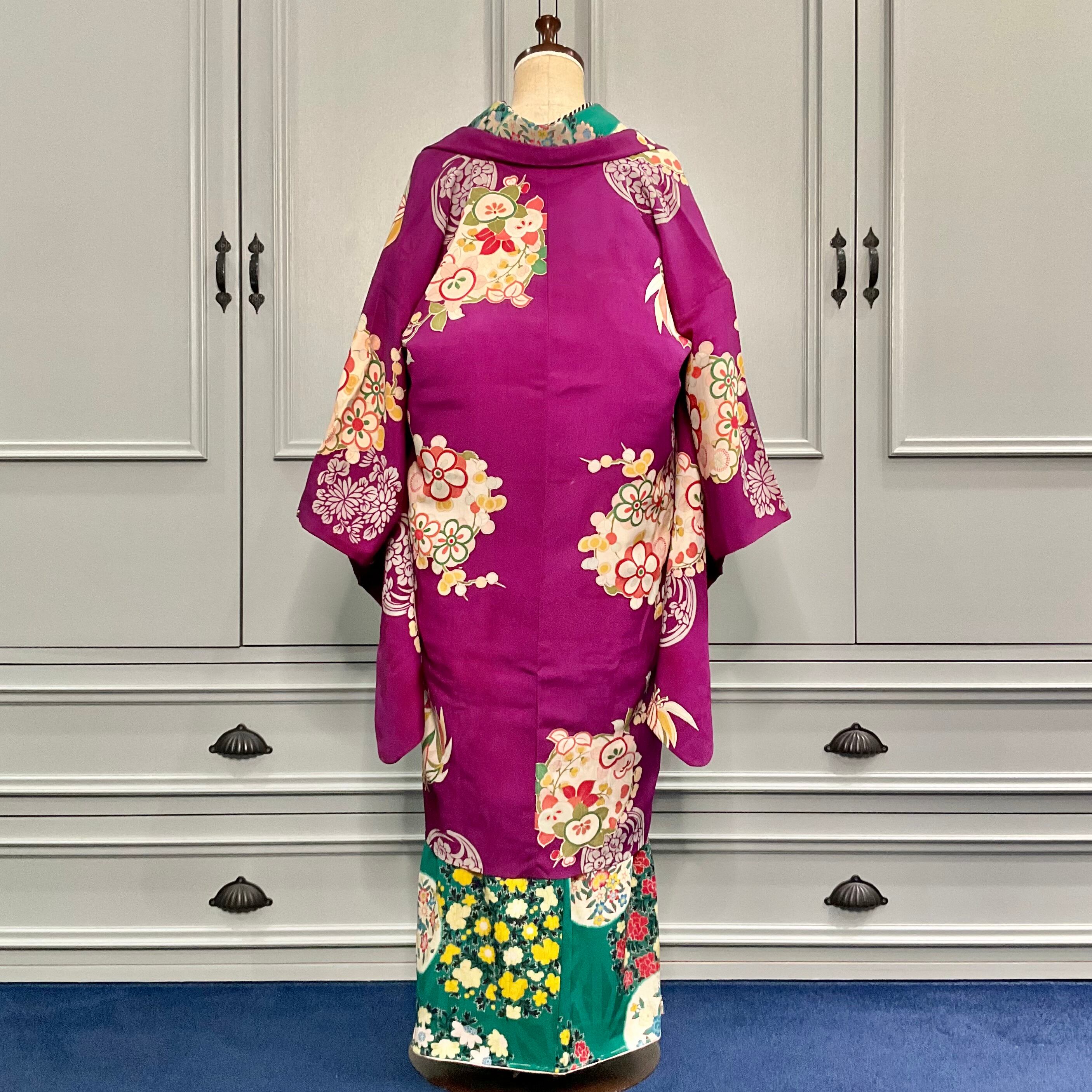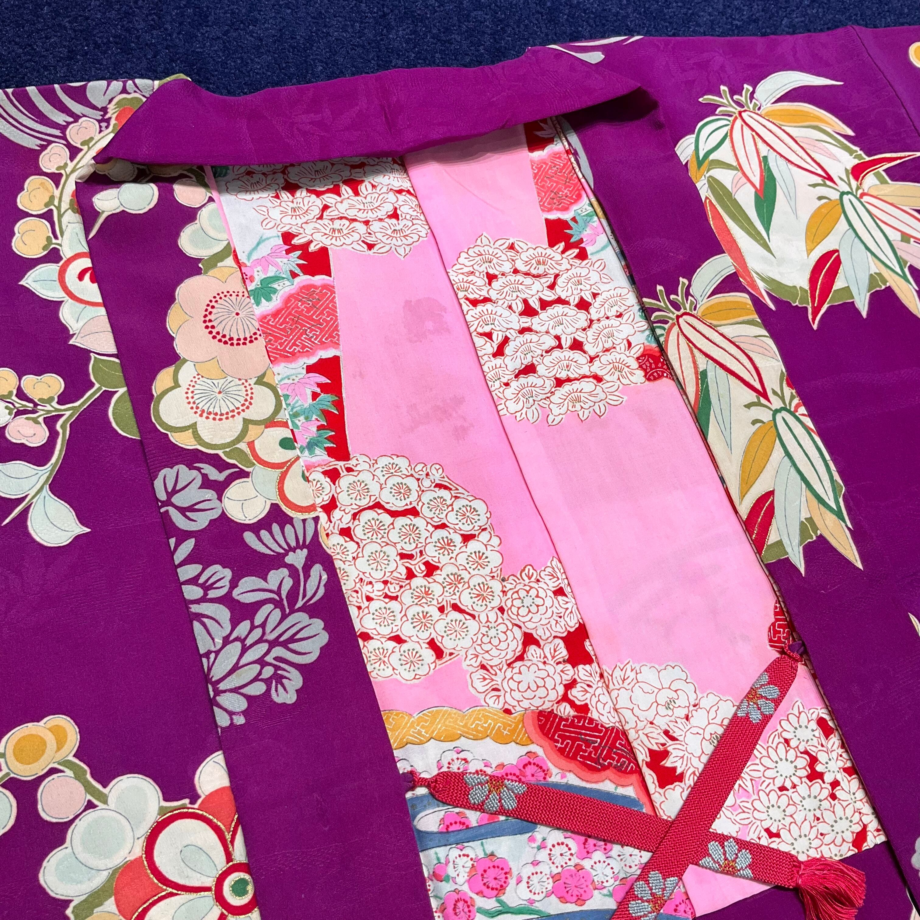 アンティークらしい発色の綺麗なパープル地に、華やかな色づかいの梅や橘、笹などの花丸が美しい一着✨️