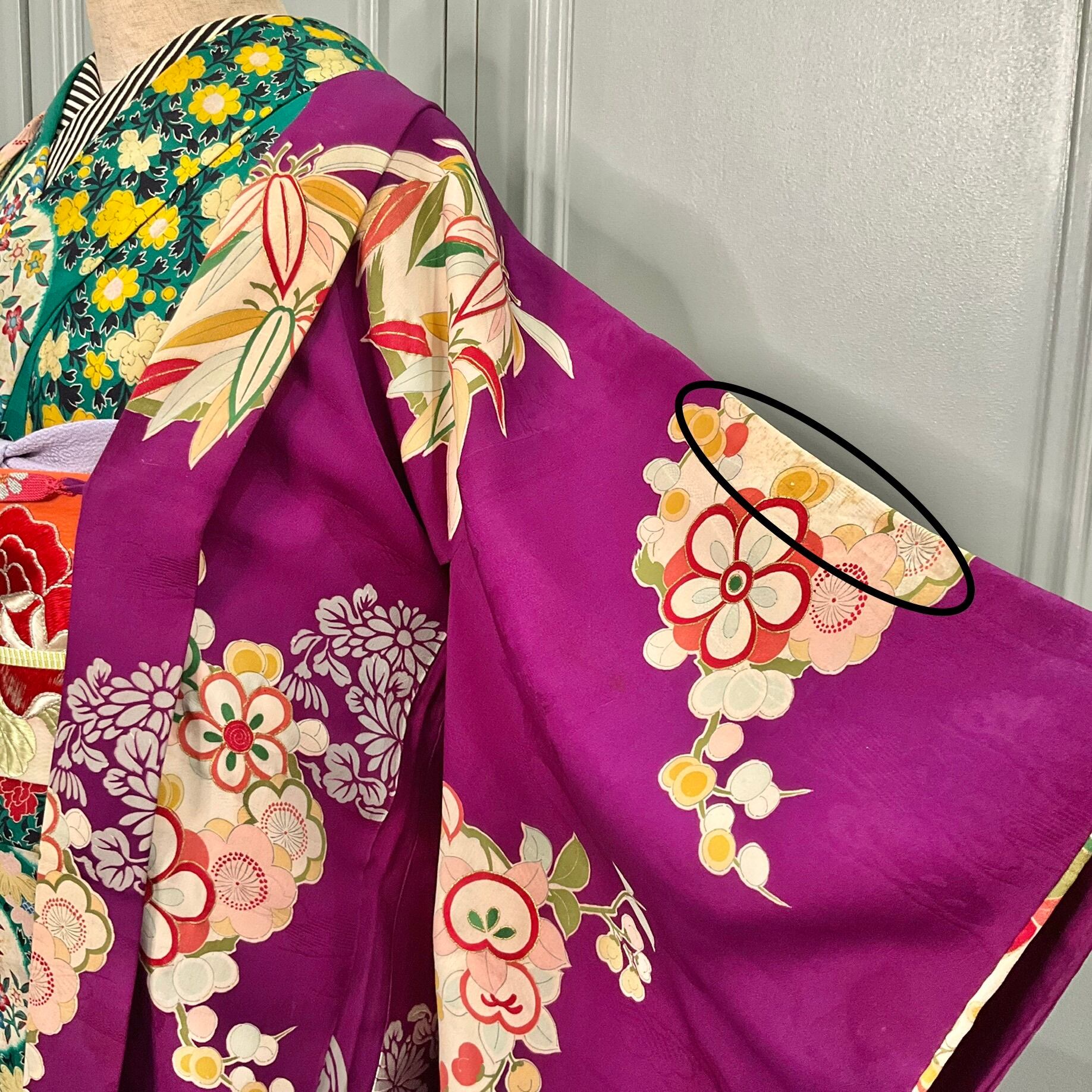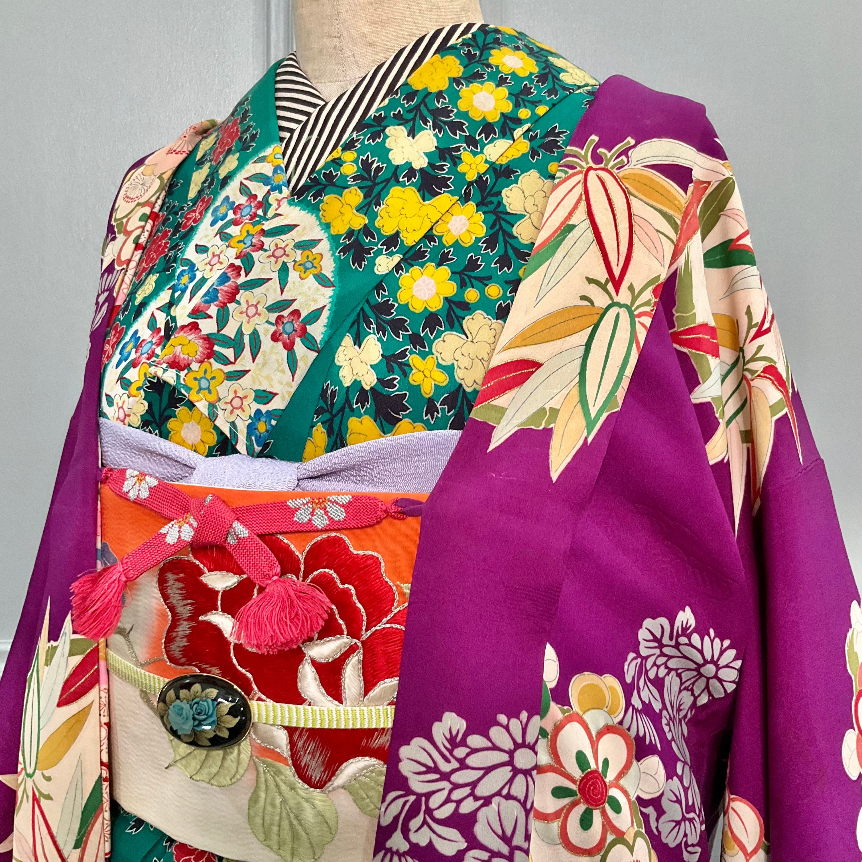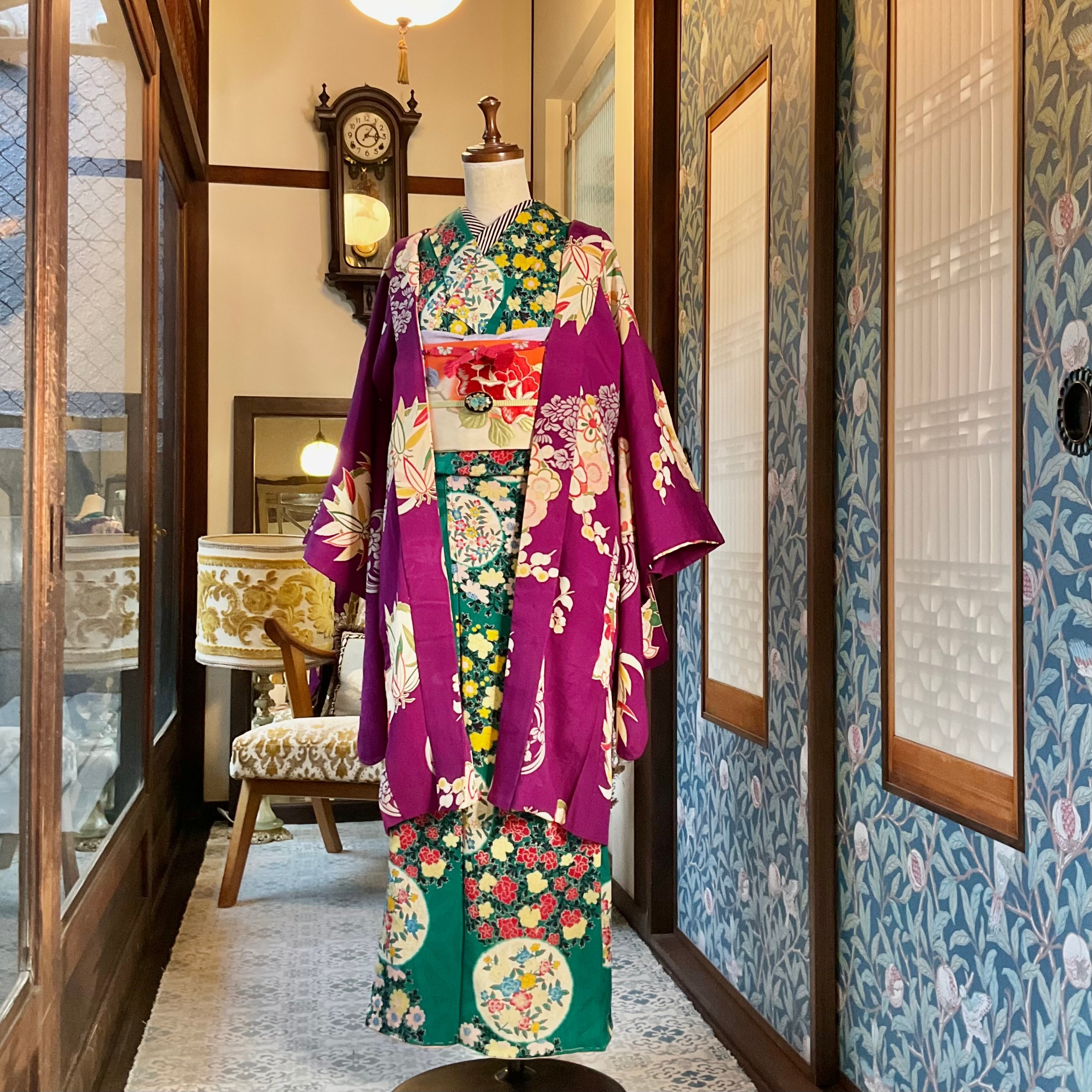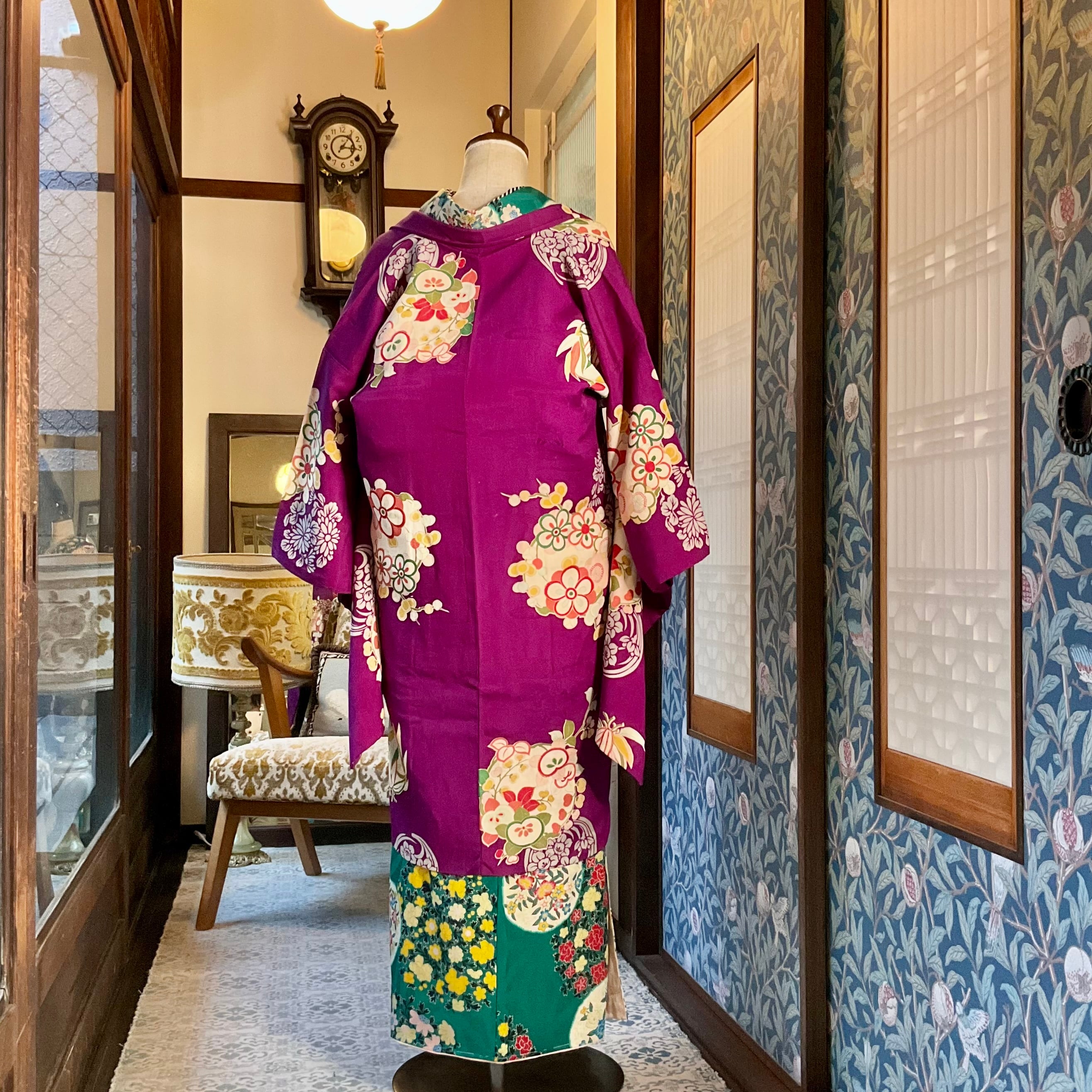 アンティークらしい発色の綺麗なパープル地に、華やかな色づかいの梅や橘、笹などの花丸が美しい一着✨️