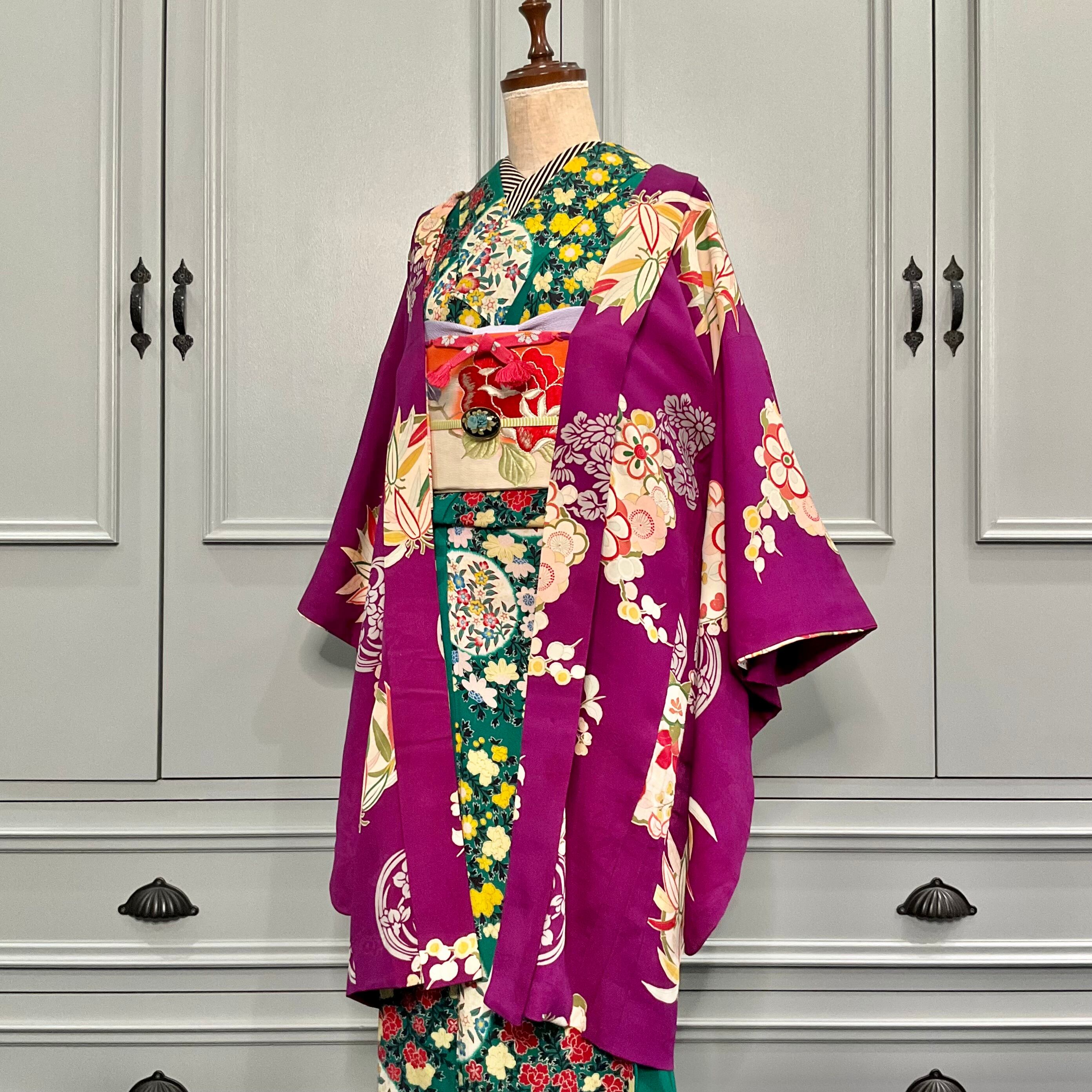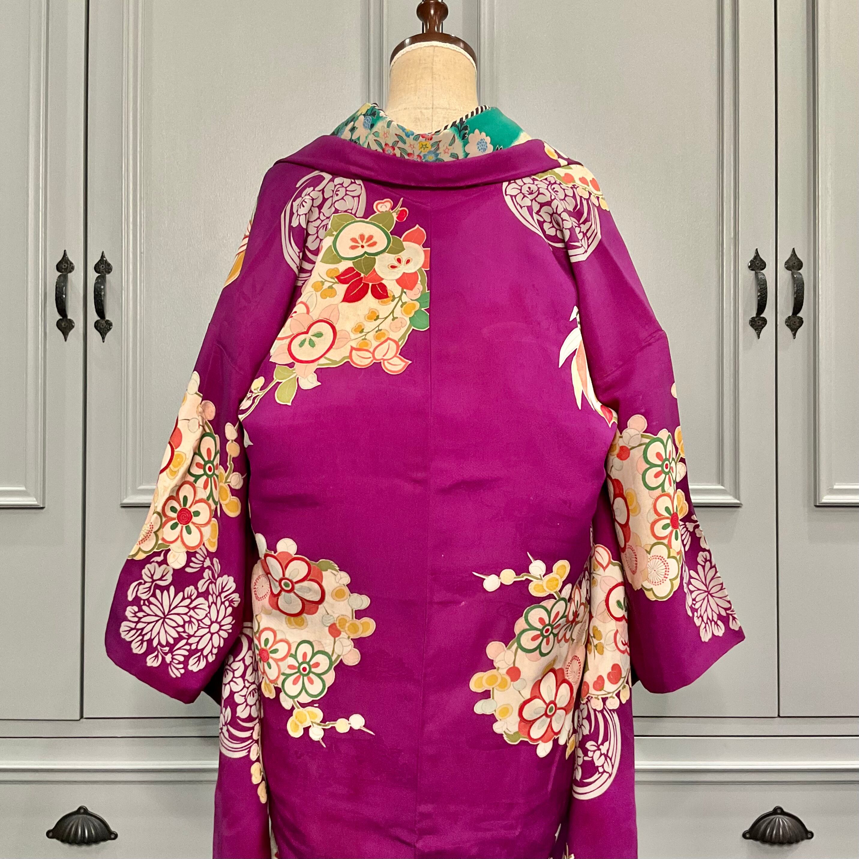 紅紫に花丸*パープル 赤紫 梅 橘 笹 竹 花 アンティーク長羽織 B424