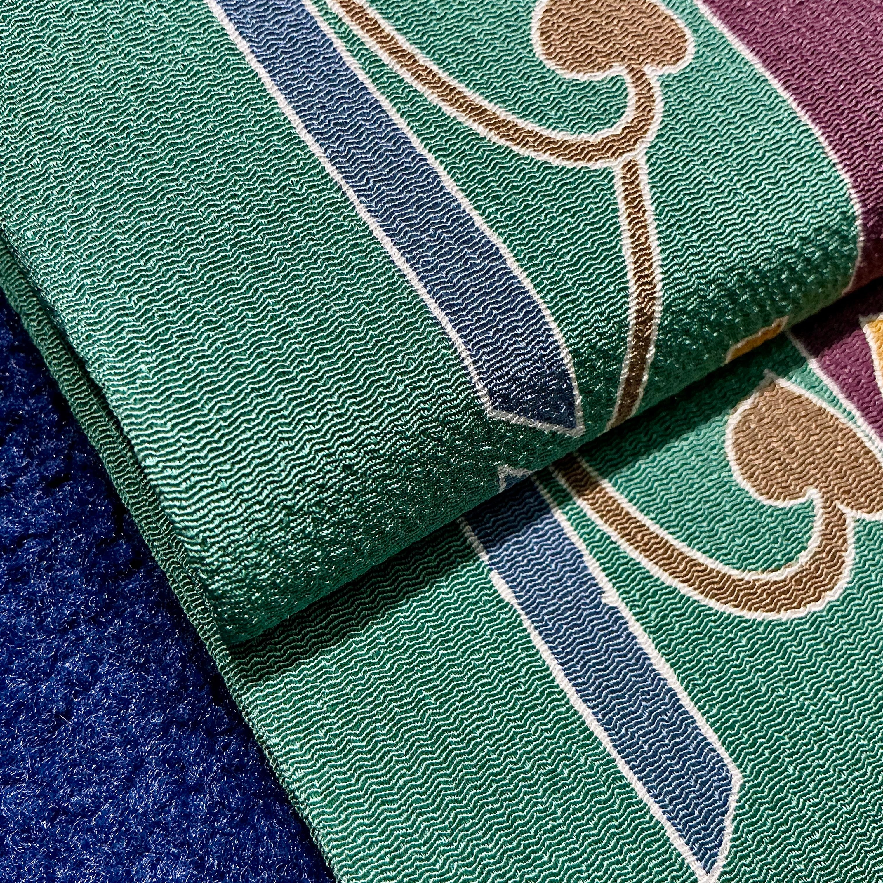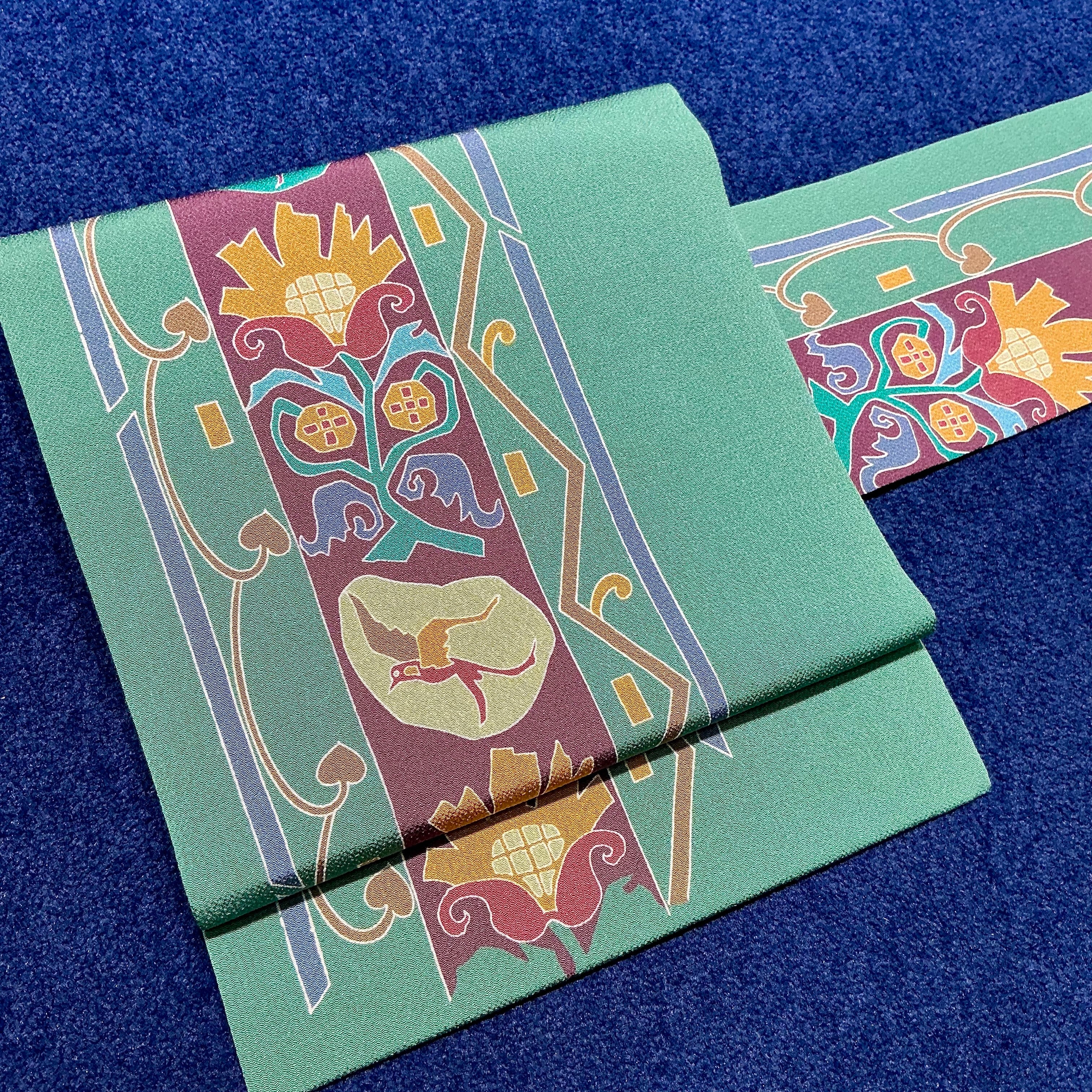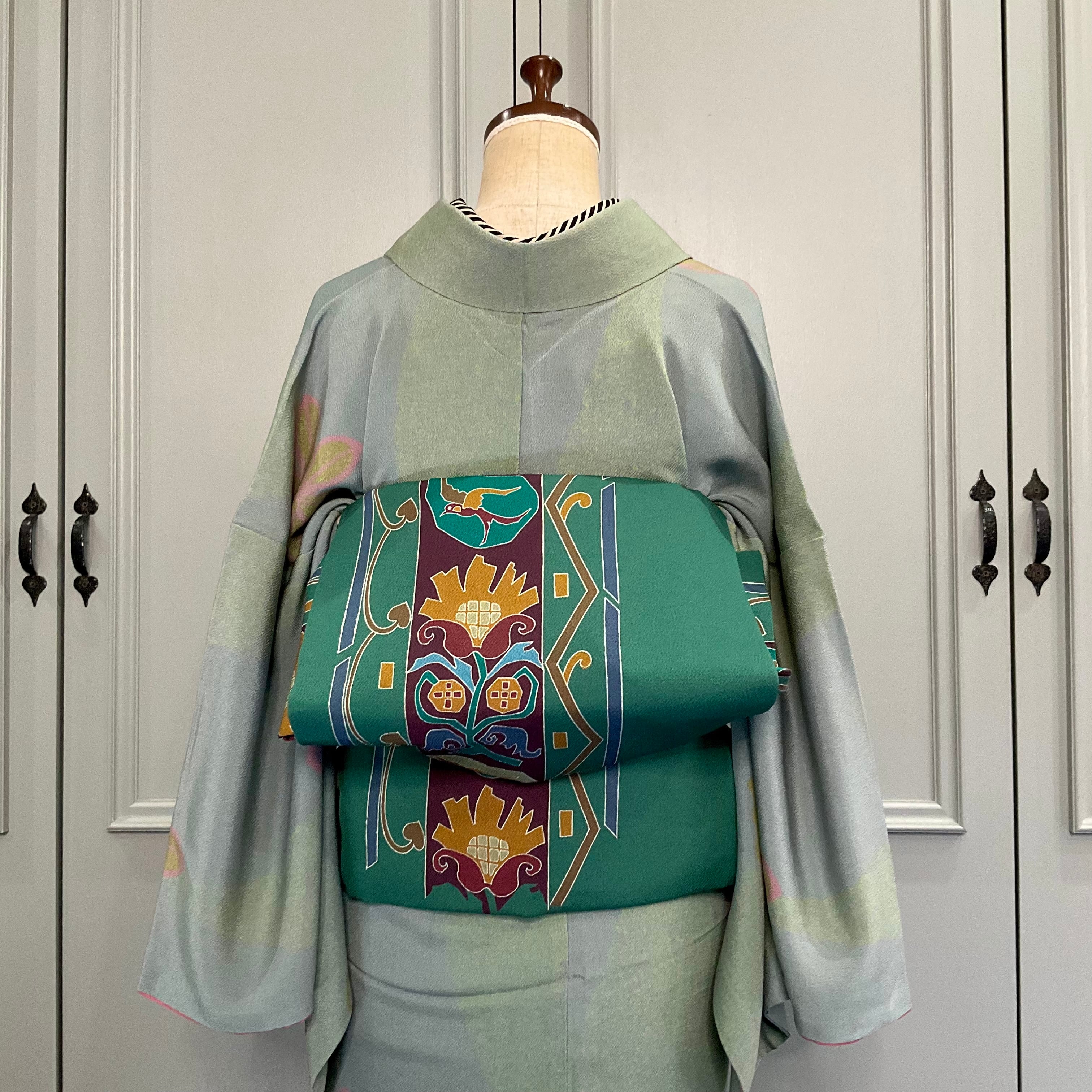 少し落ち着いた青緑系のスレートグリーンの地色に幾何学模様や花や鳥が描かれたちょっぴり異国情緒溢れる、ちりめん地の名古屋帯です