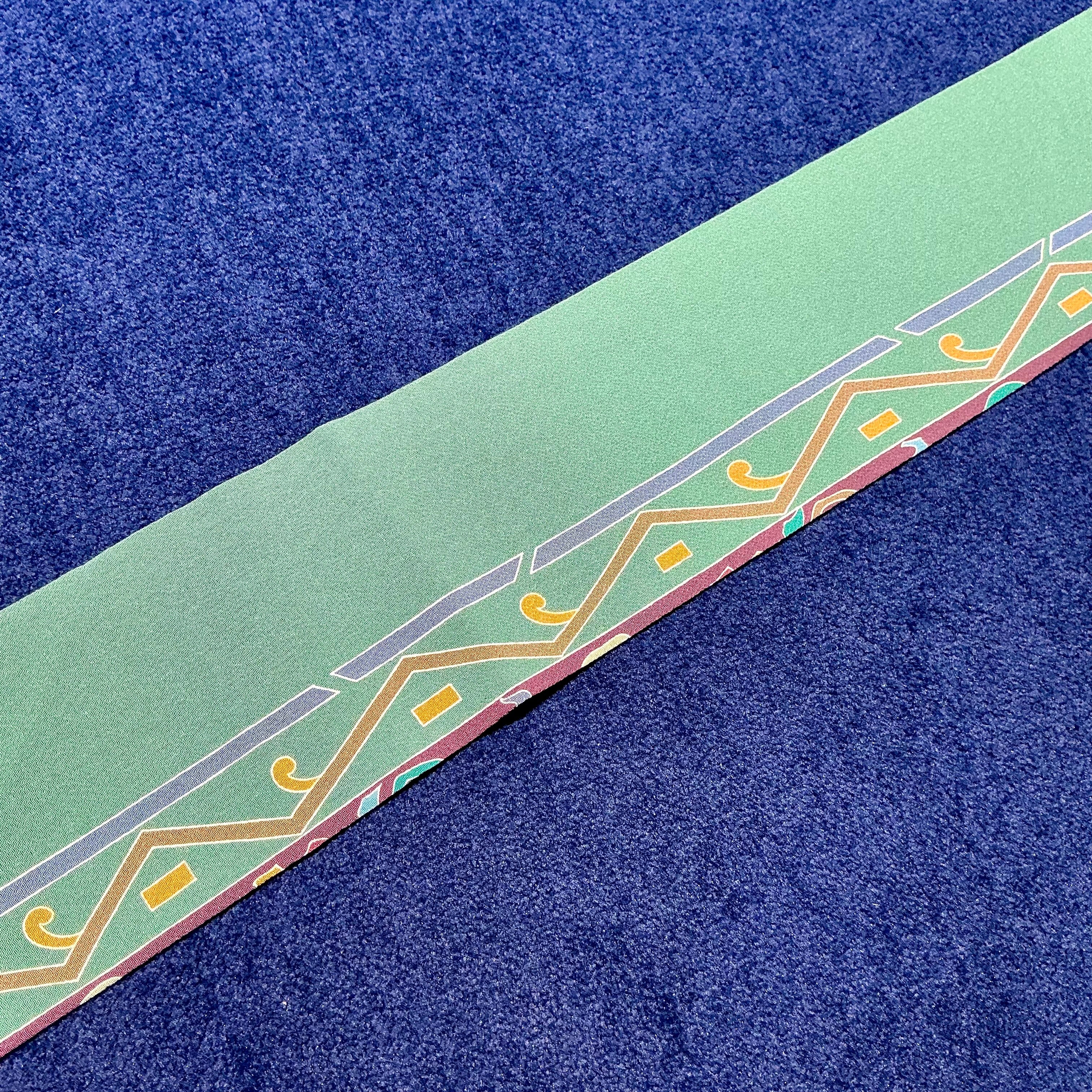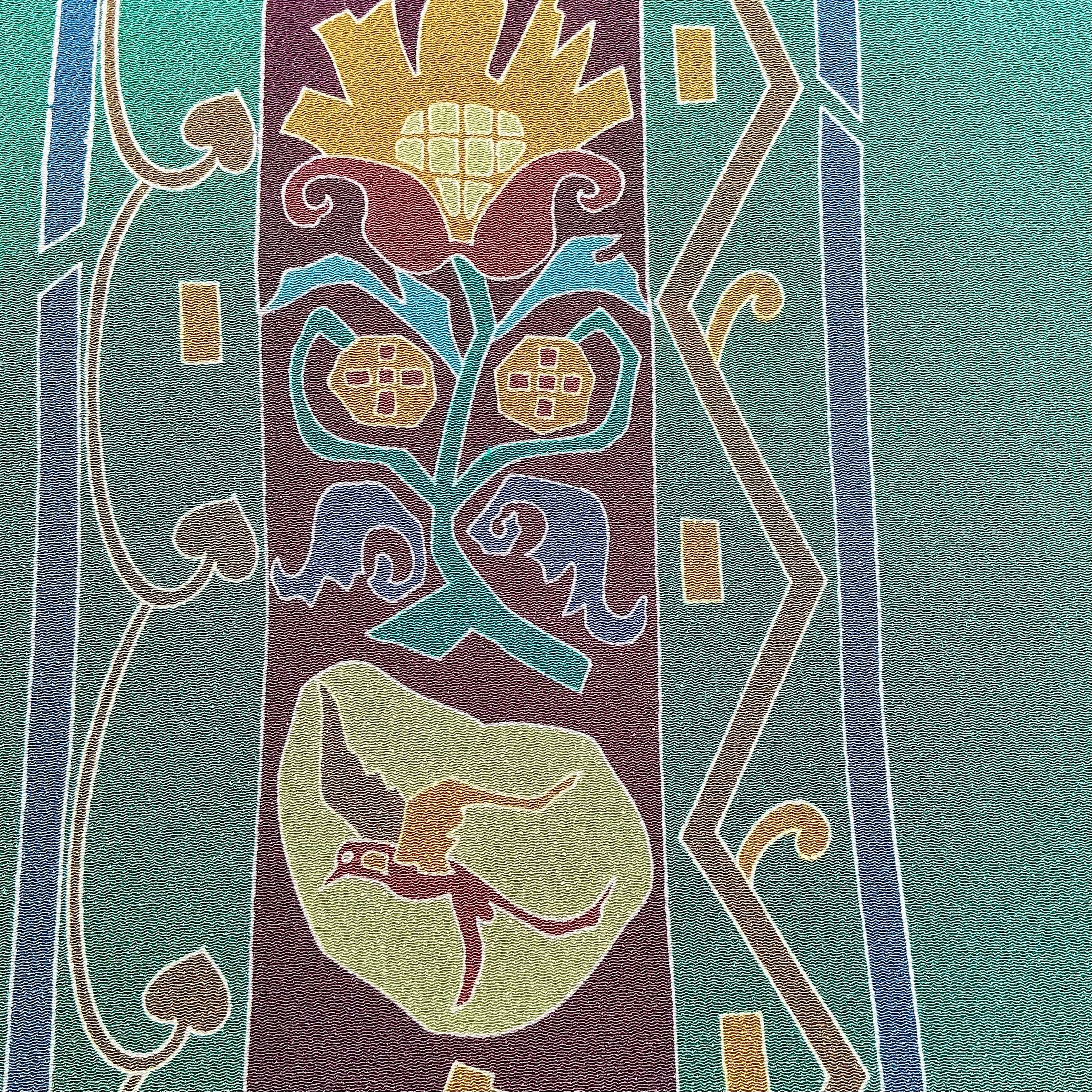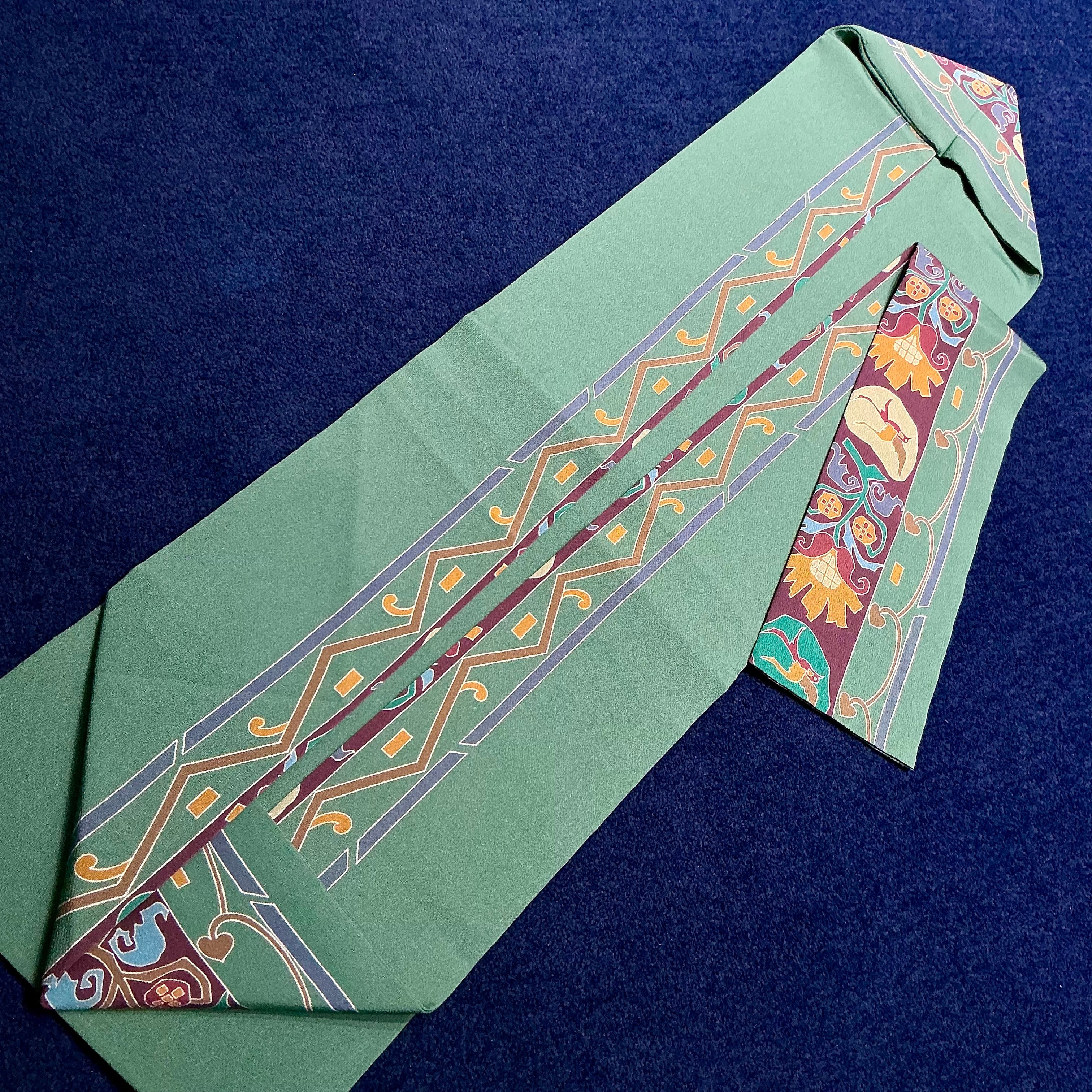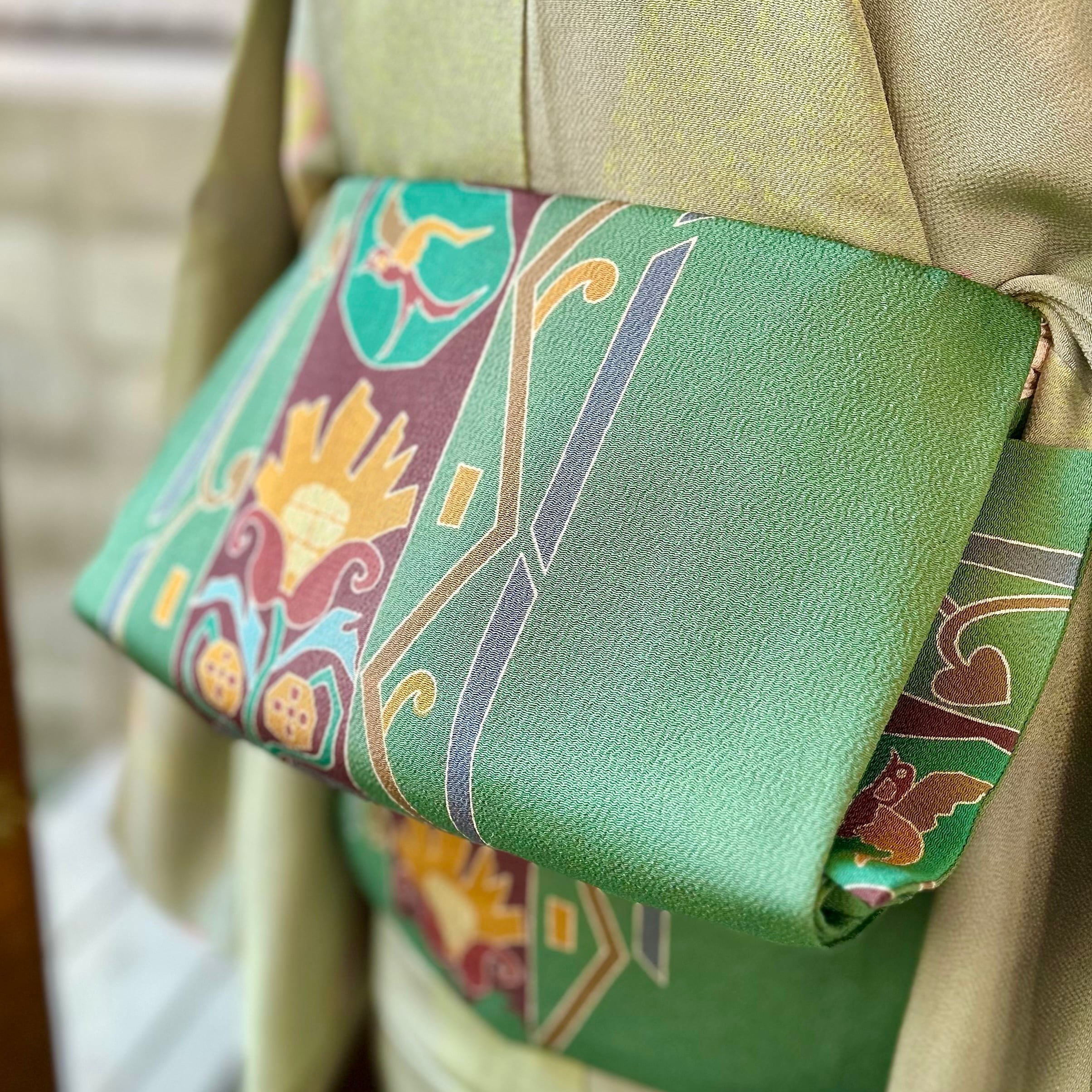 少し落ち着いた青緑系のスレートグリーンの地色に幾何学模様や花や鳥が描かれたちょっぴり異国情緒溢れる、ちりめん地の名古屋帯です