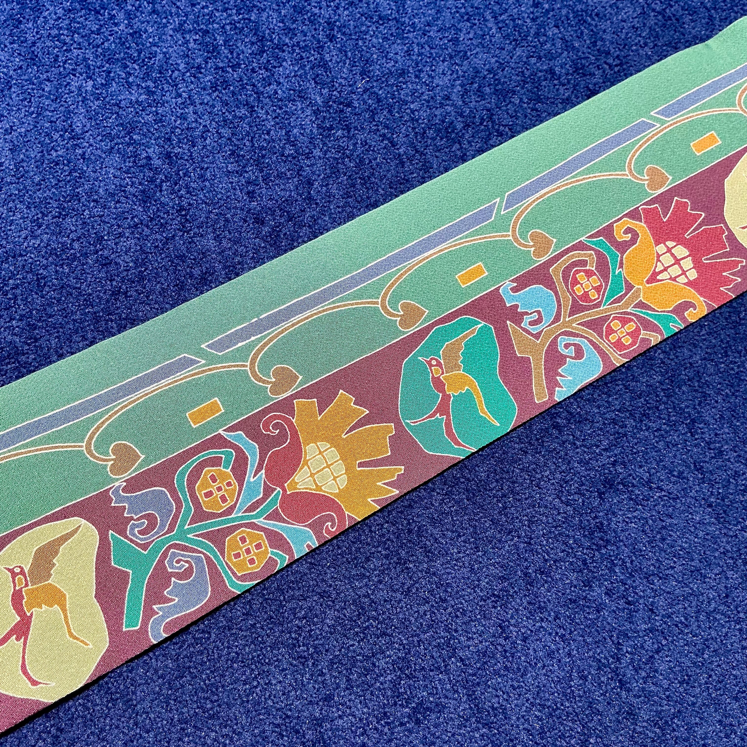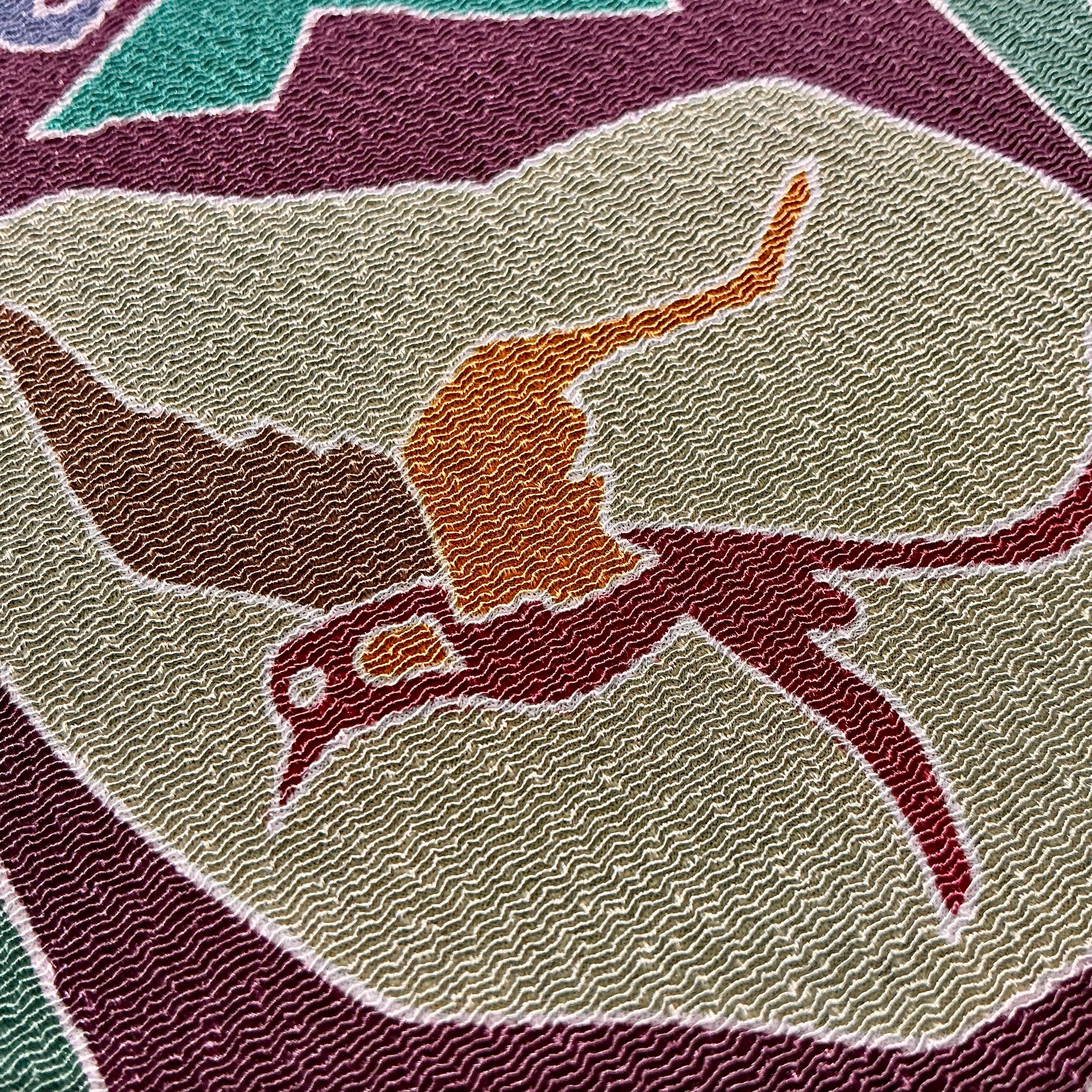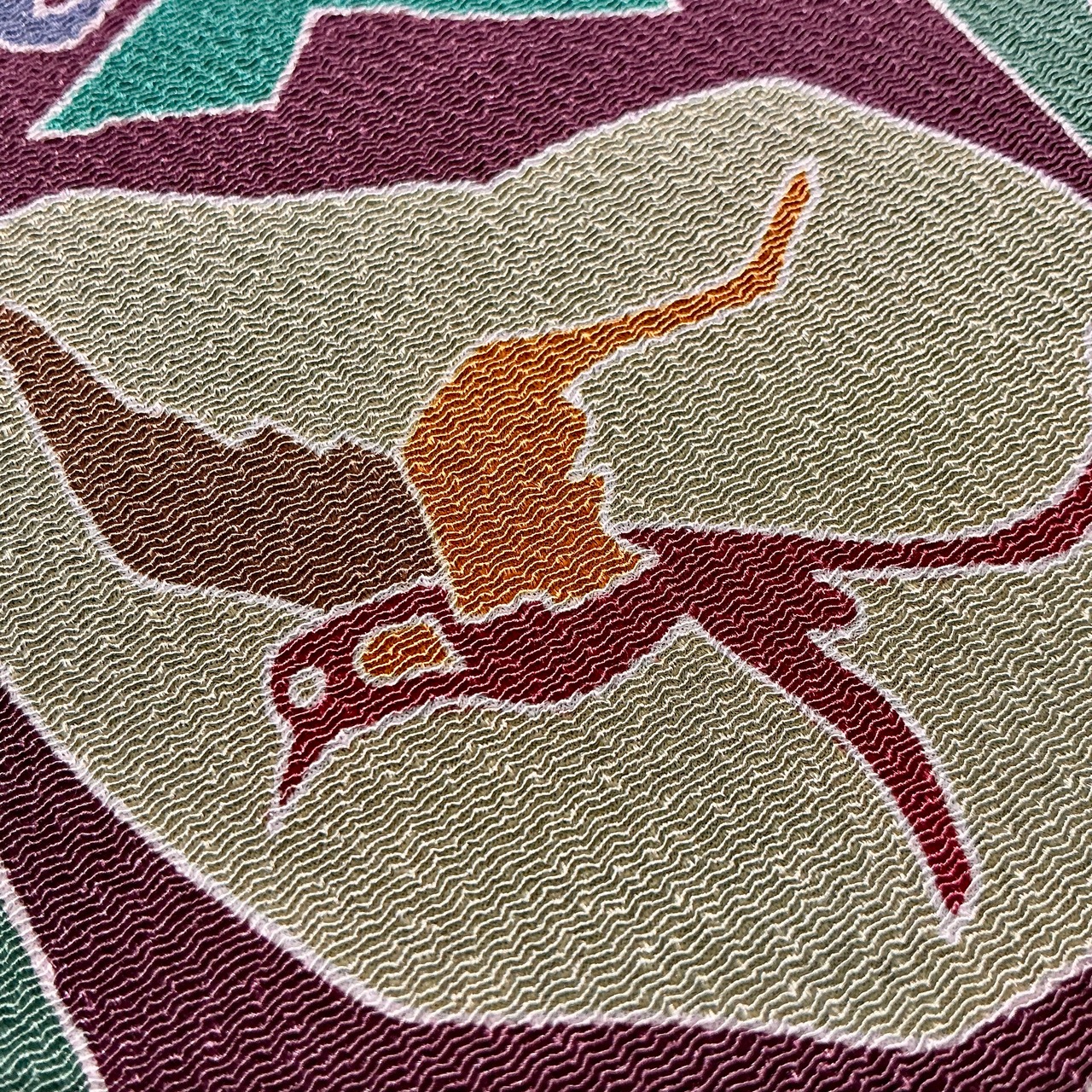 ふっくらとシボを帯びたちりめん地に、鳥や花、幾何学的なデザインがオリエンタルな雰囲気で素敵✨