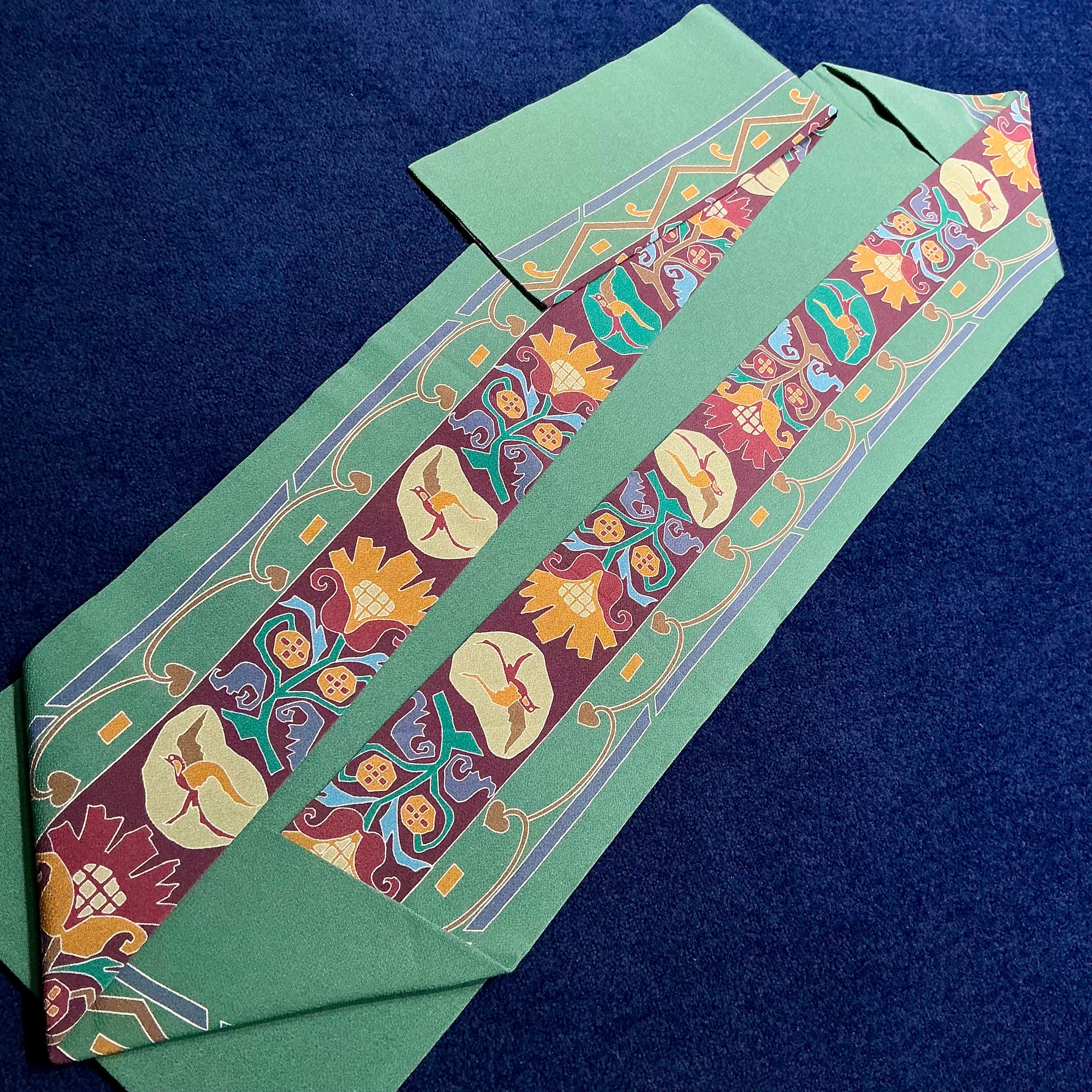 翠緑の楽園*オリエンタル bird 花モチーフ 鳥 グリーン ブルー カジュアル 縮緬 名古屋帯 B429
