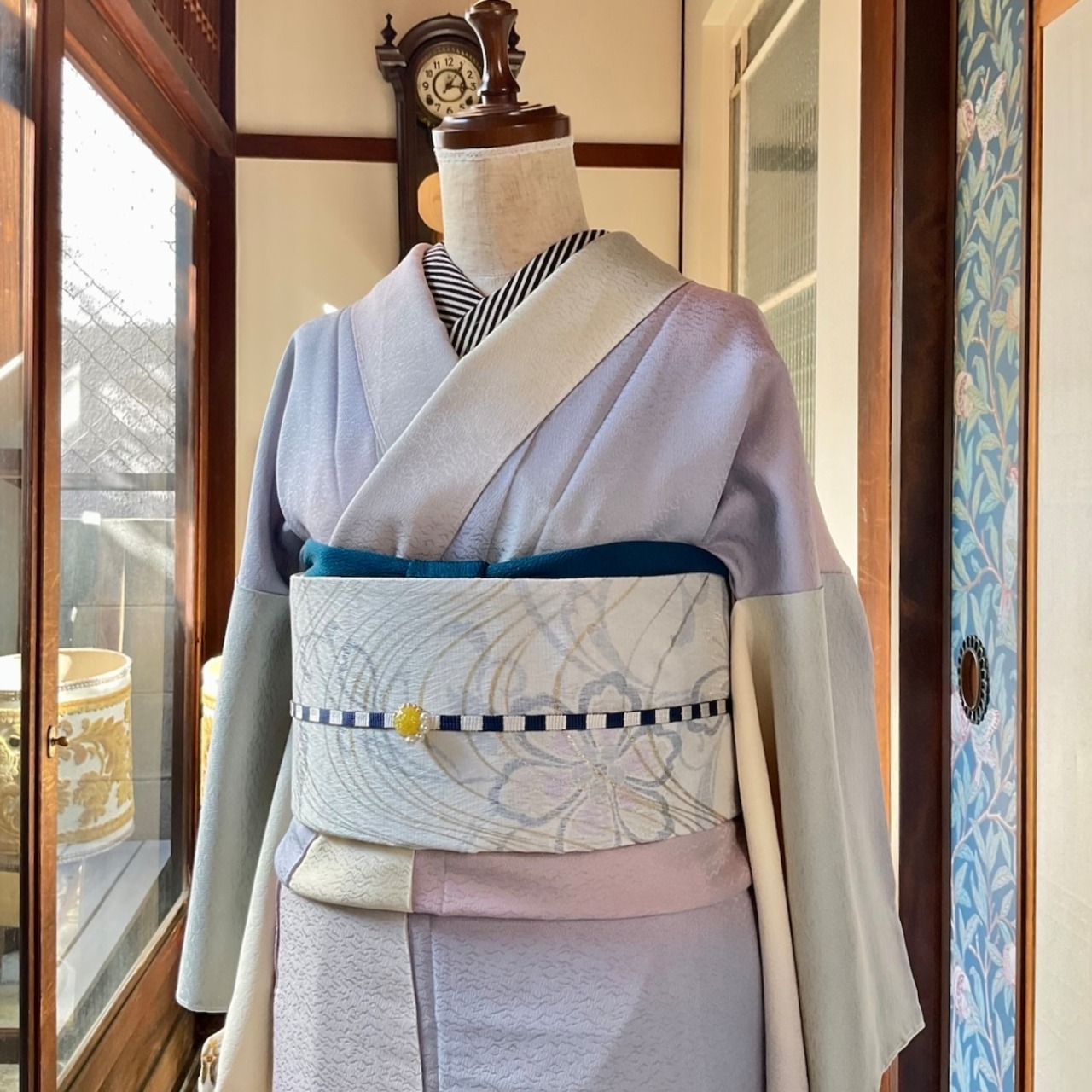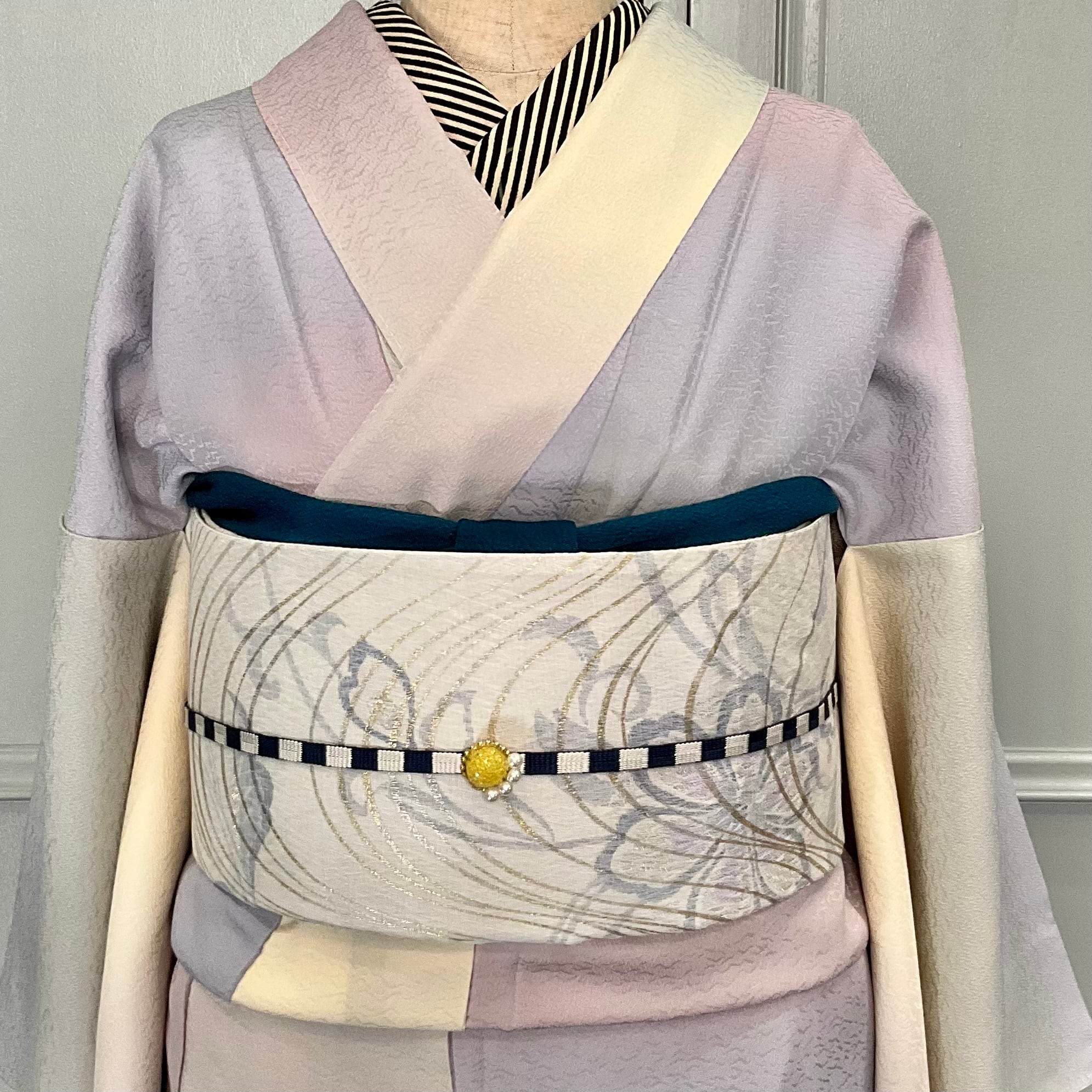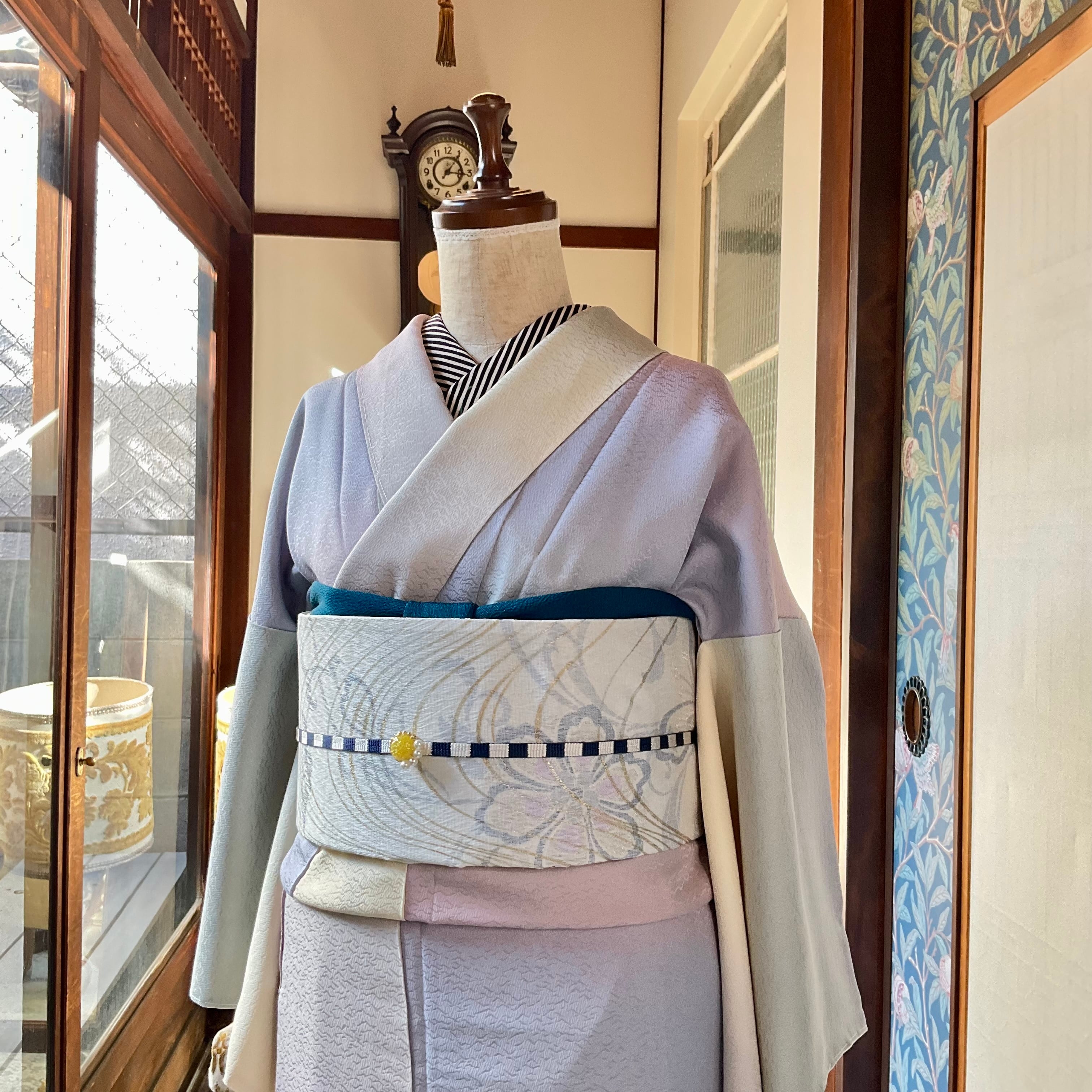 ○合わせた着物とオリジナル帯揚げビリジアングリーンとオリジナル三分紐しましまネイビーも web shop掲載品です♪