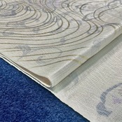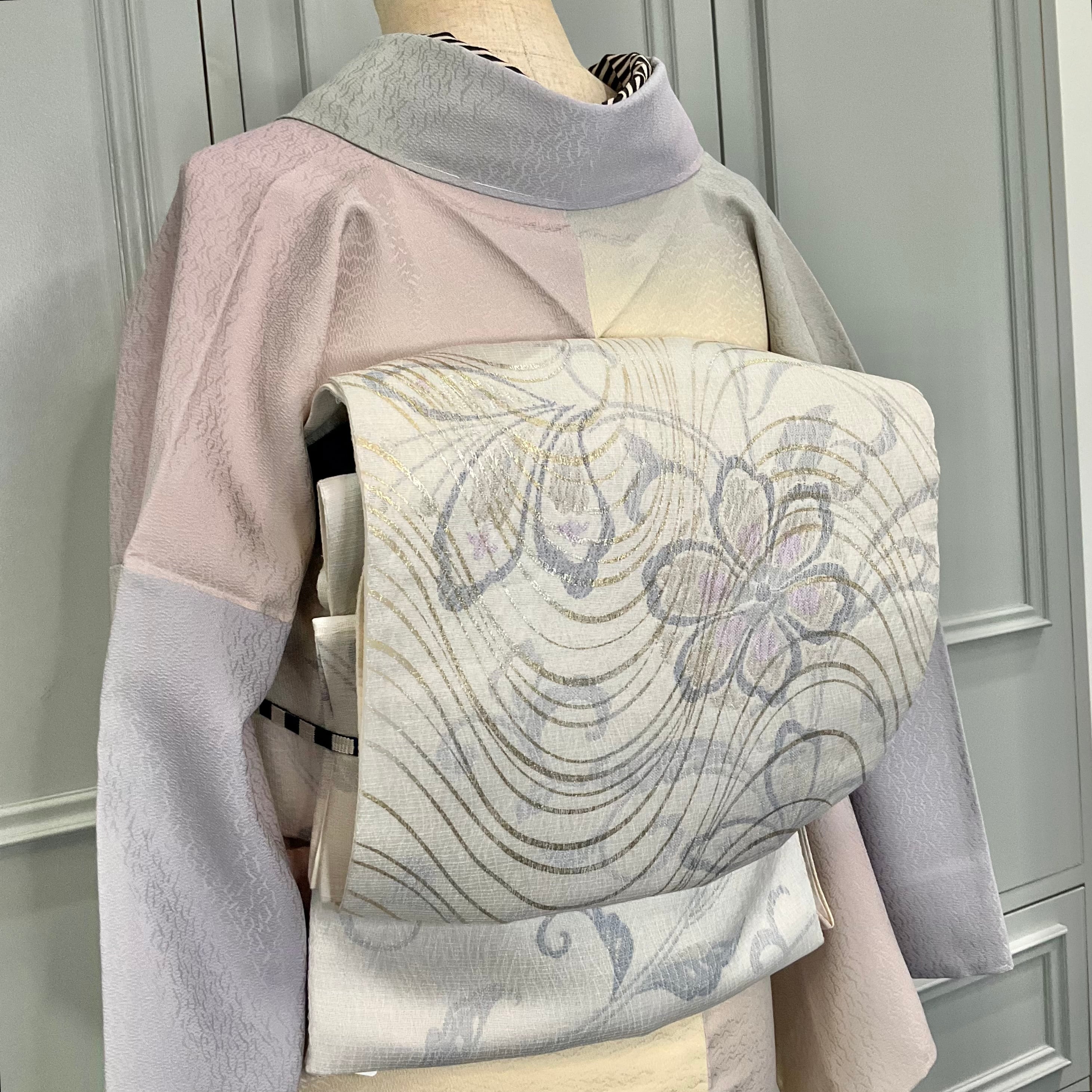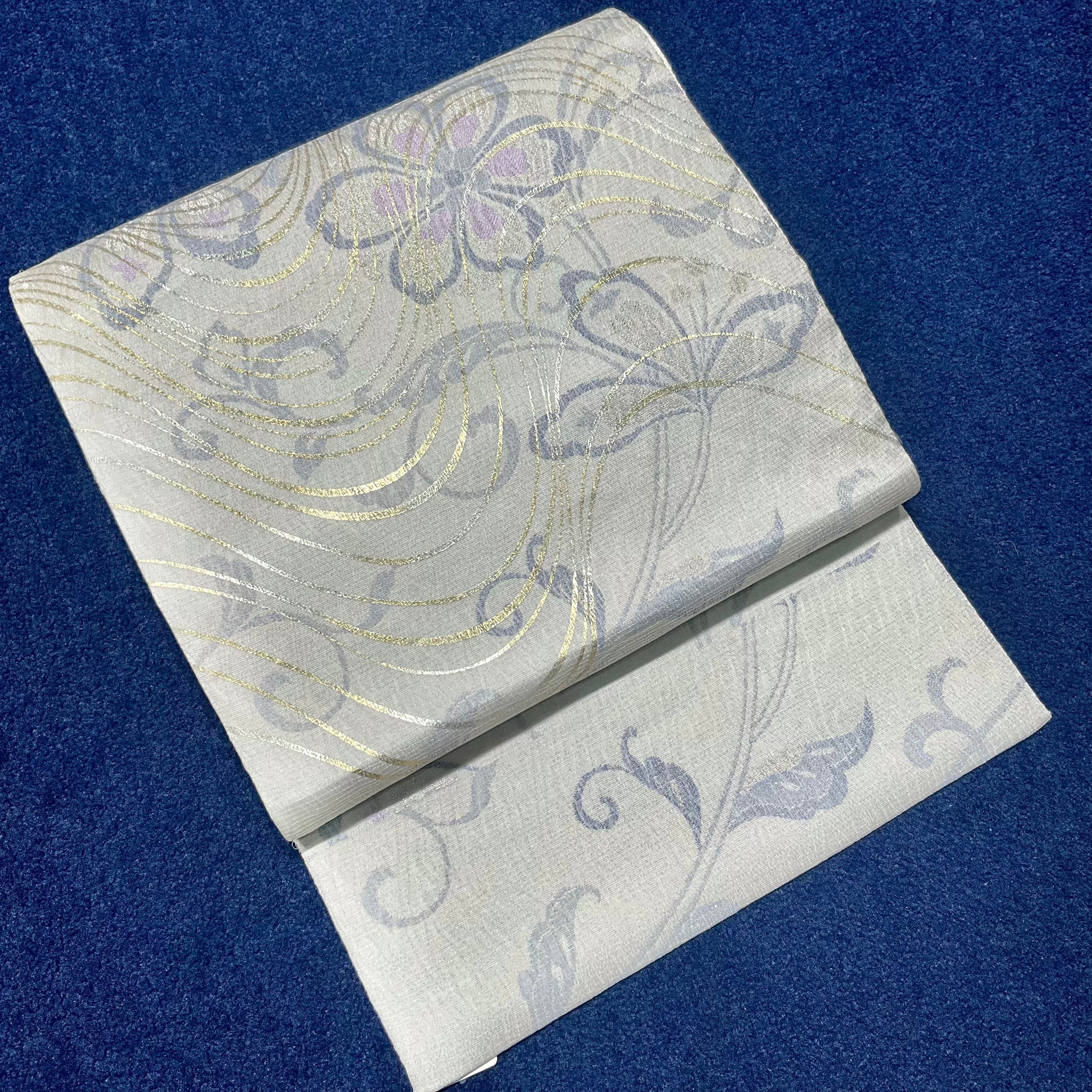 淡いグレー地に抽象的な花が描かれた洒落袋帯です