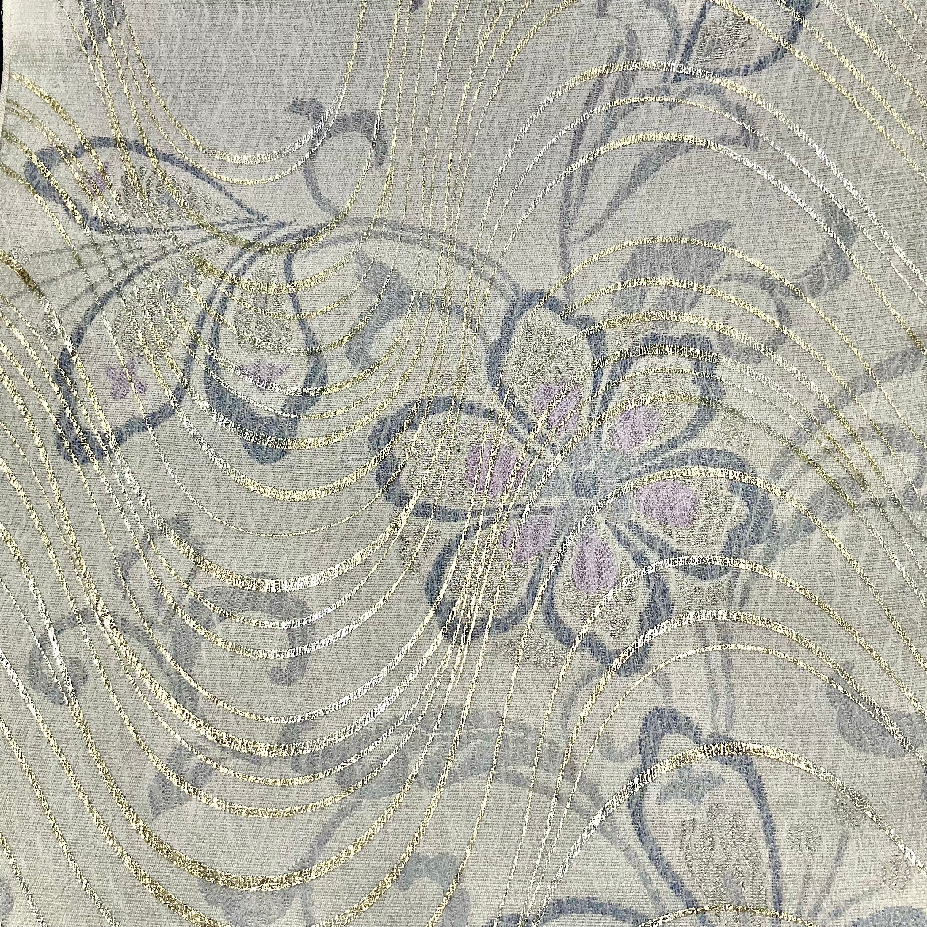 ややシャリ感のある生地に、やさしい花模様と流れるように描かれたほんのり金銀の模様が上品な染め帯です
