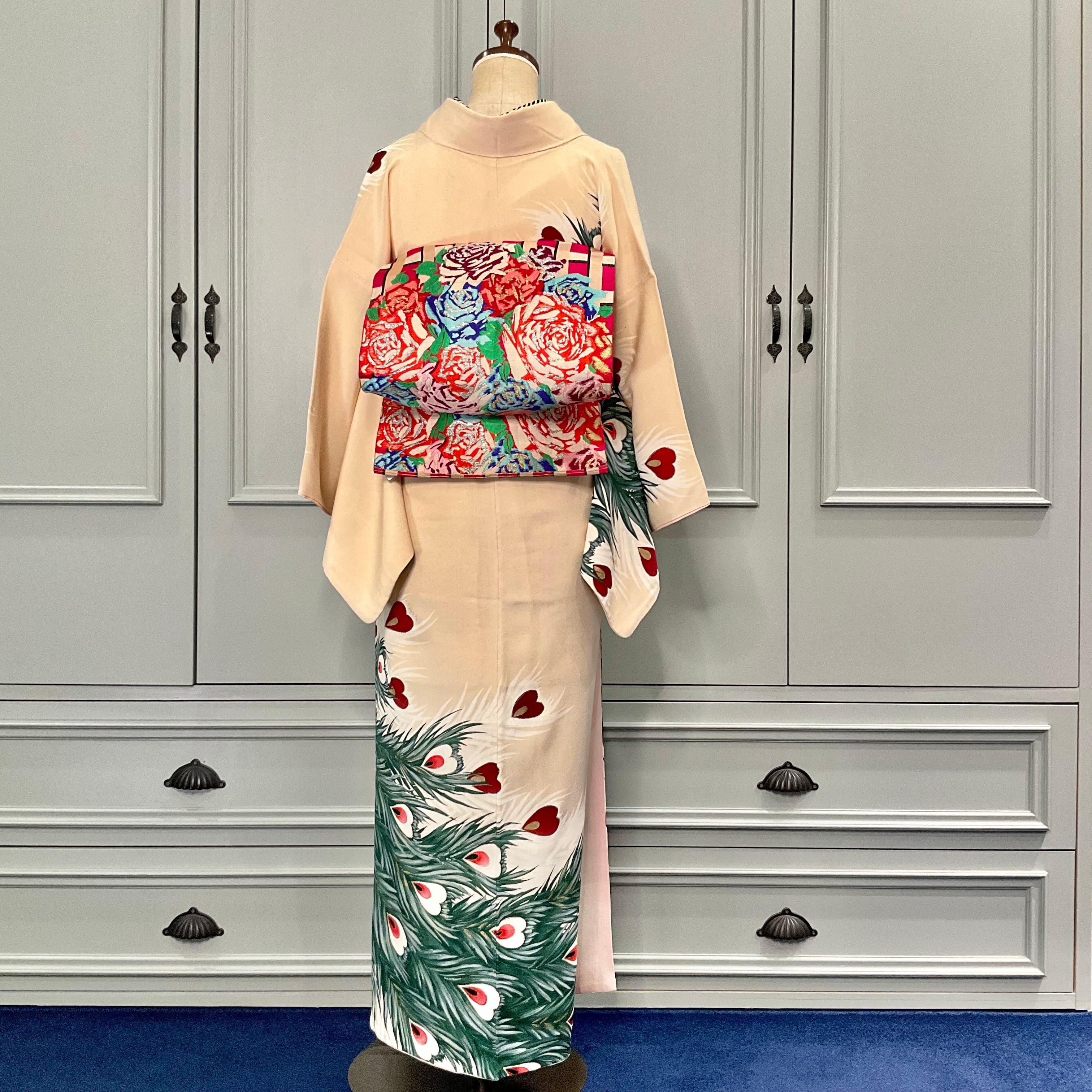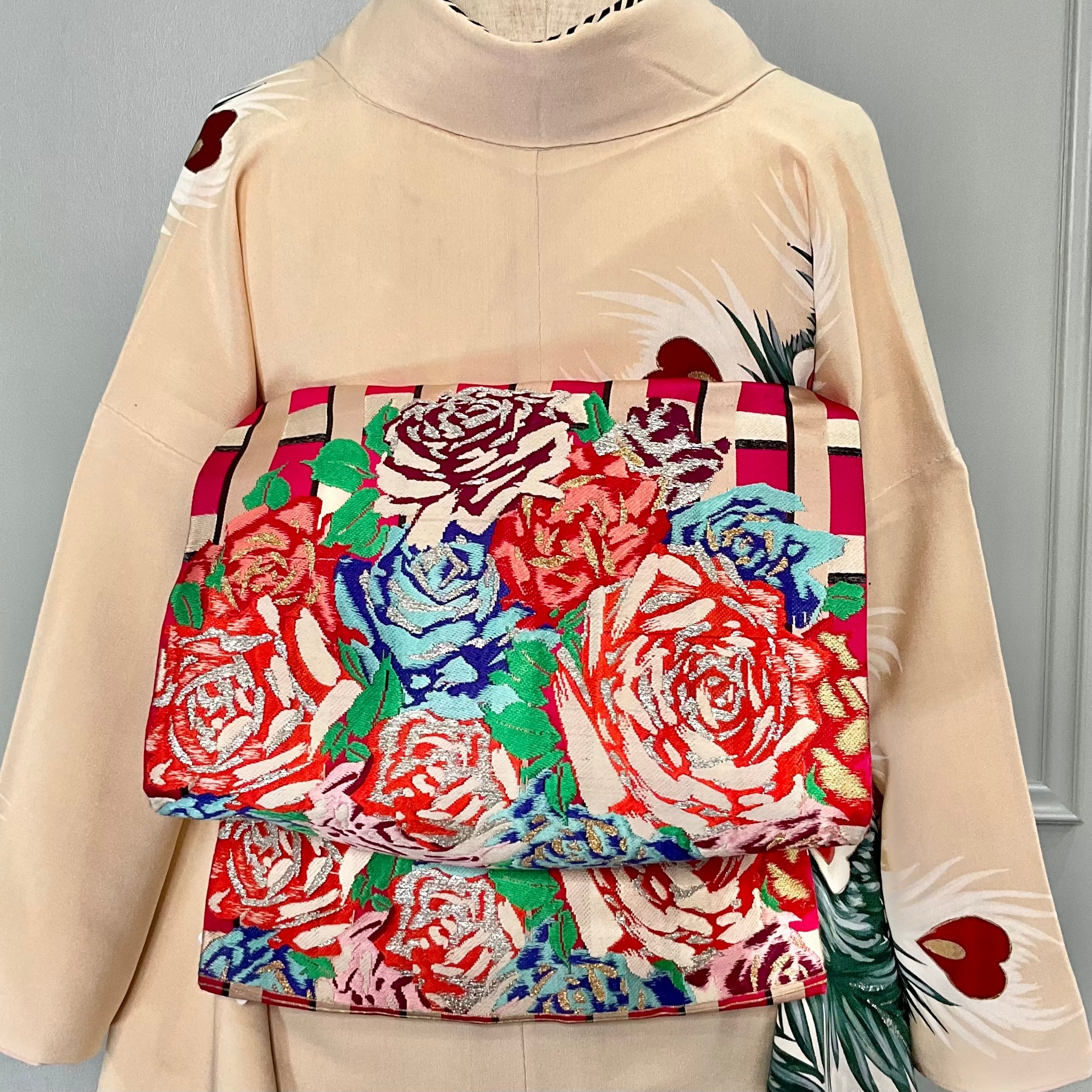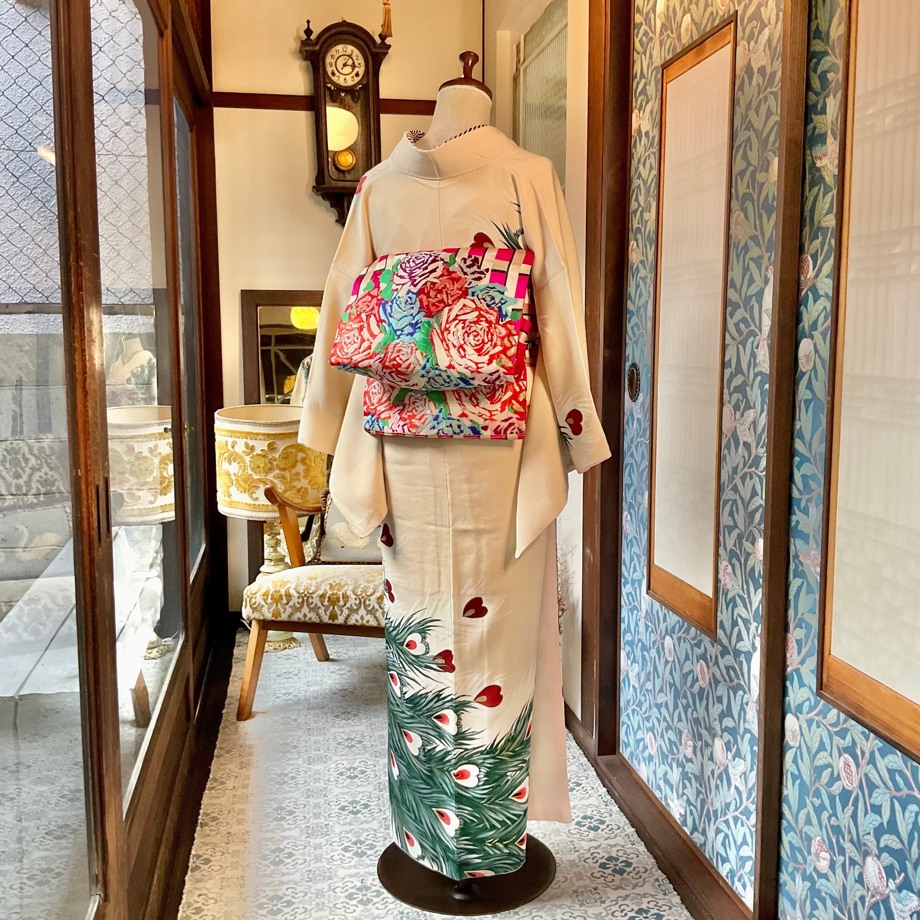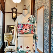 今回のコーディネートのように、アンティークの訪問着や付下げをカジュアルに装いたい時にも華やぎます♩