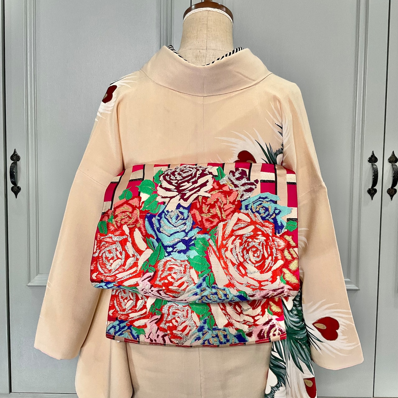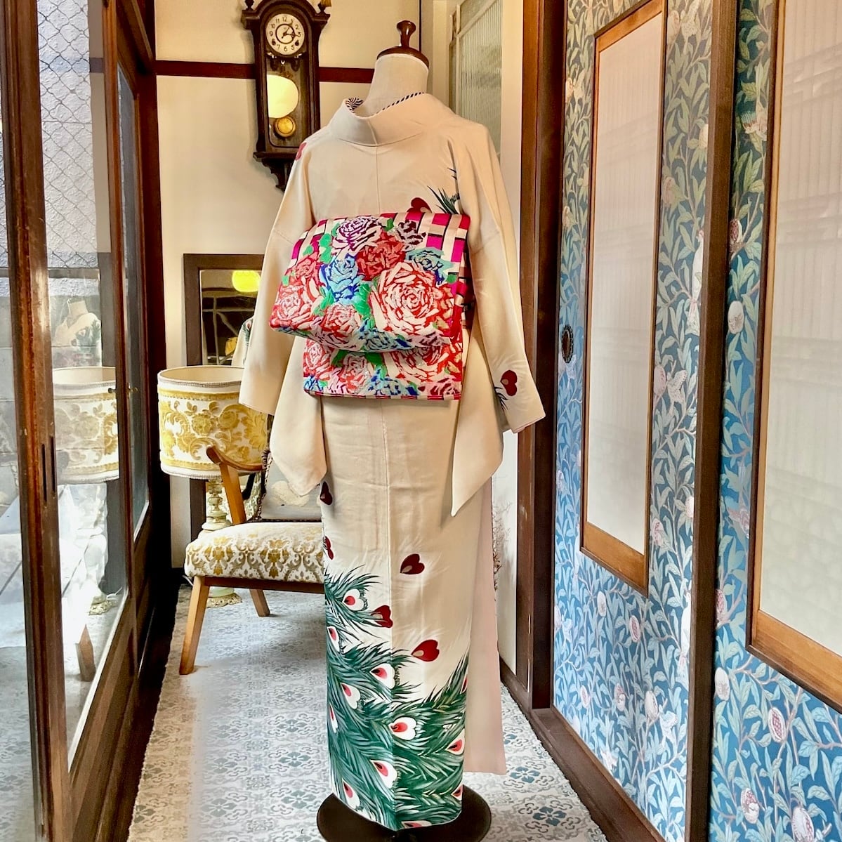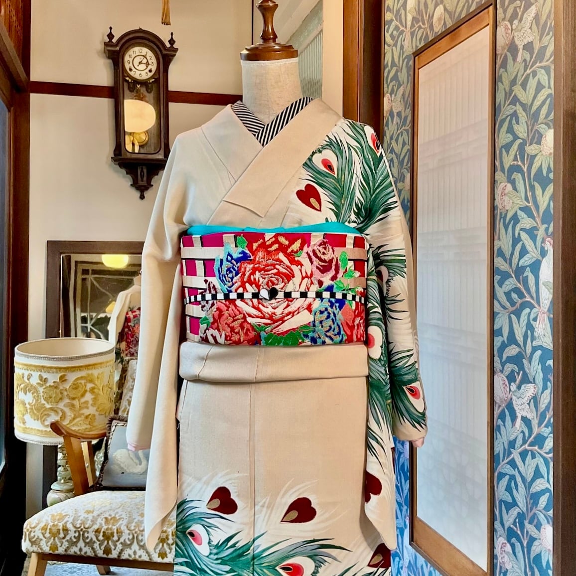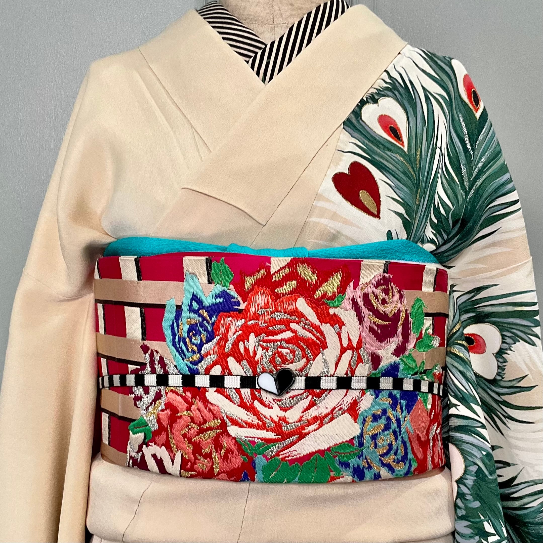 今回のコーディネートのように、アンティークの訪問着や付下げをカジュアルに装いたい時にも華やぎます♩