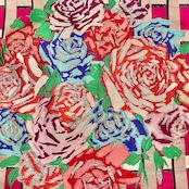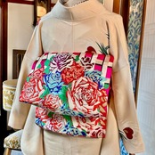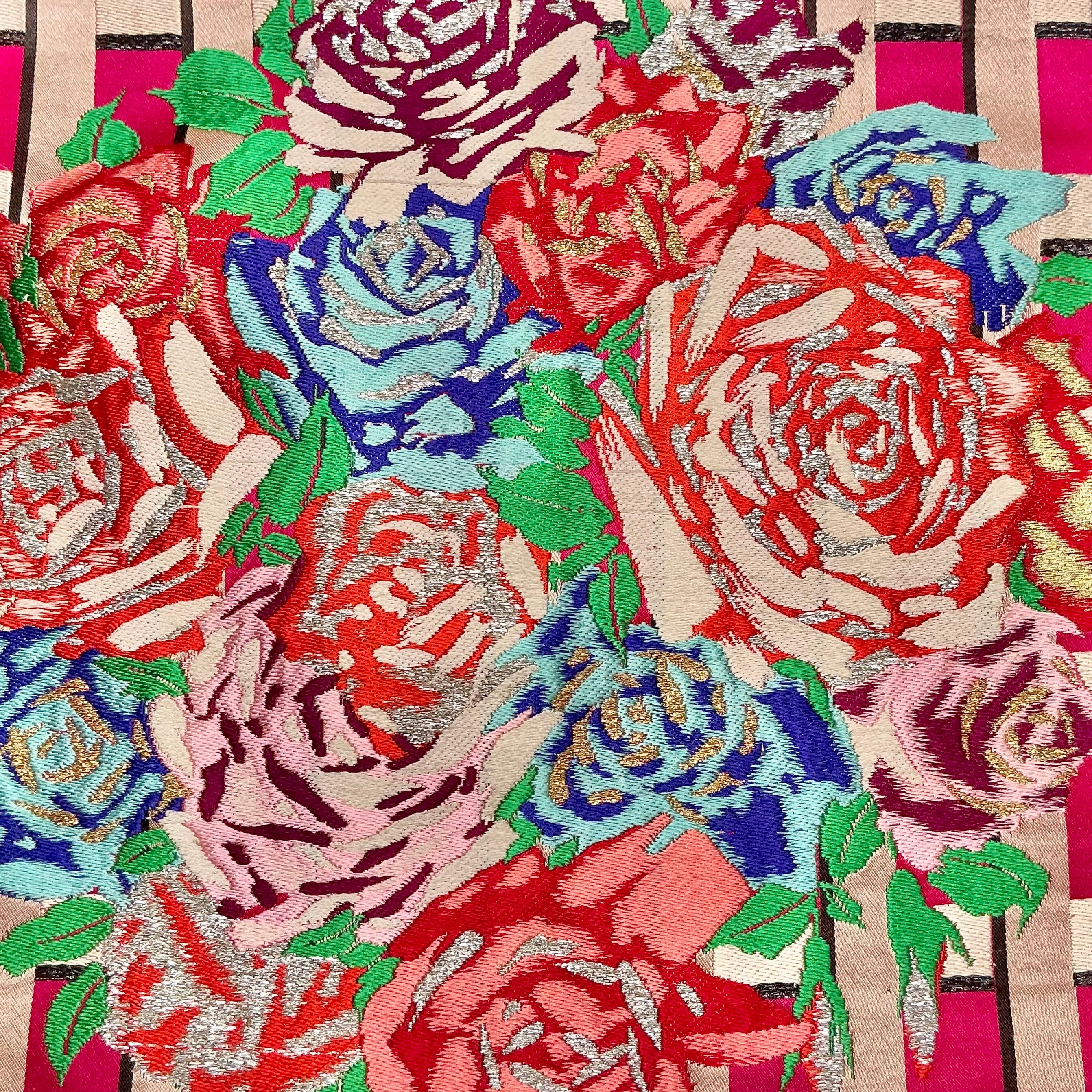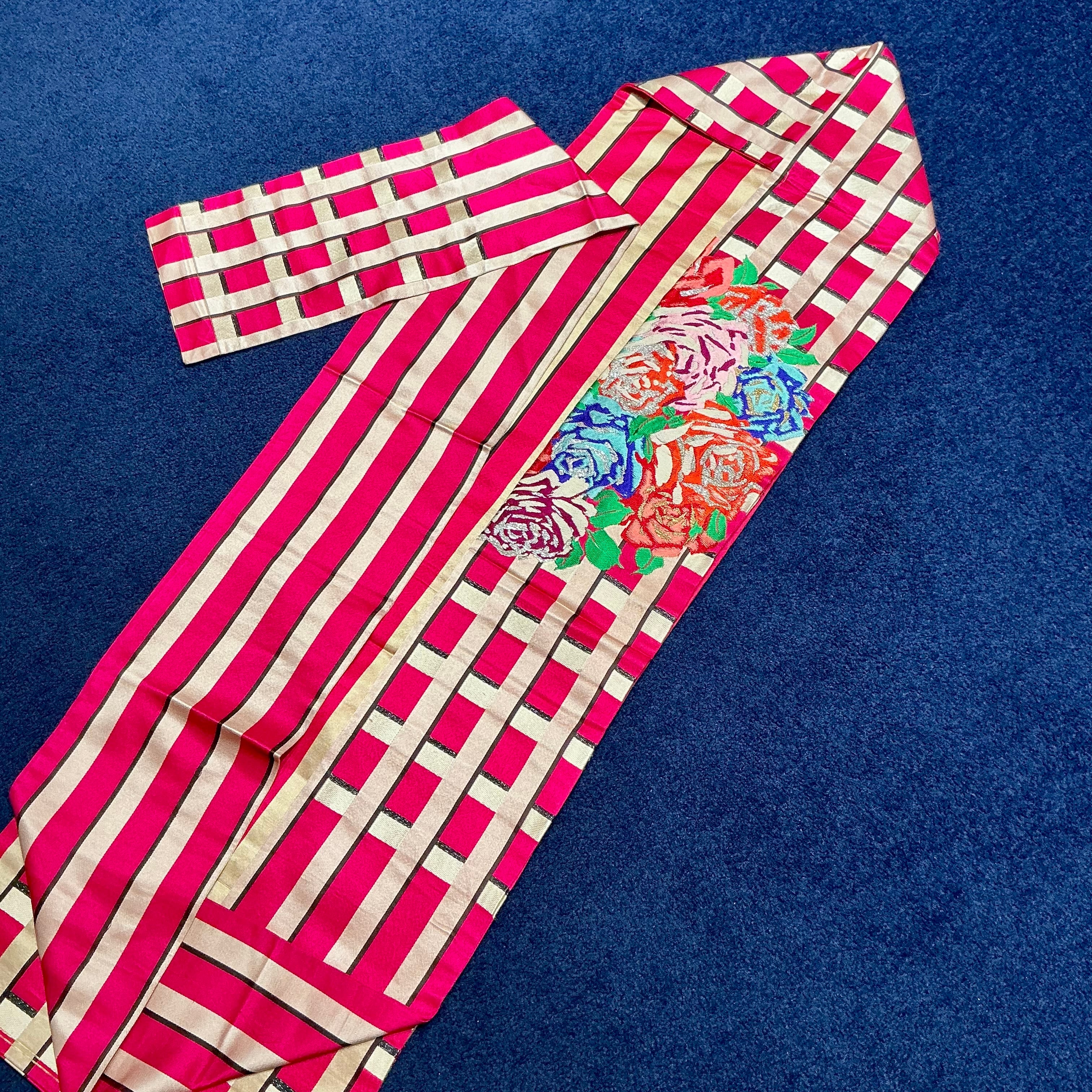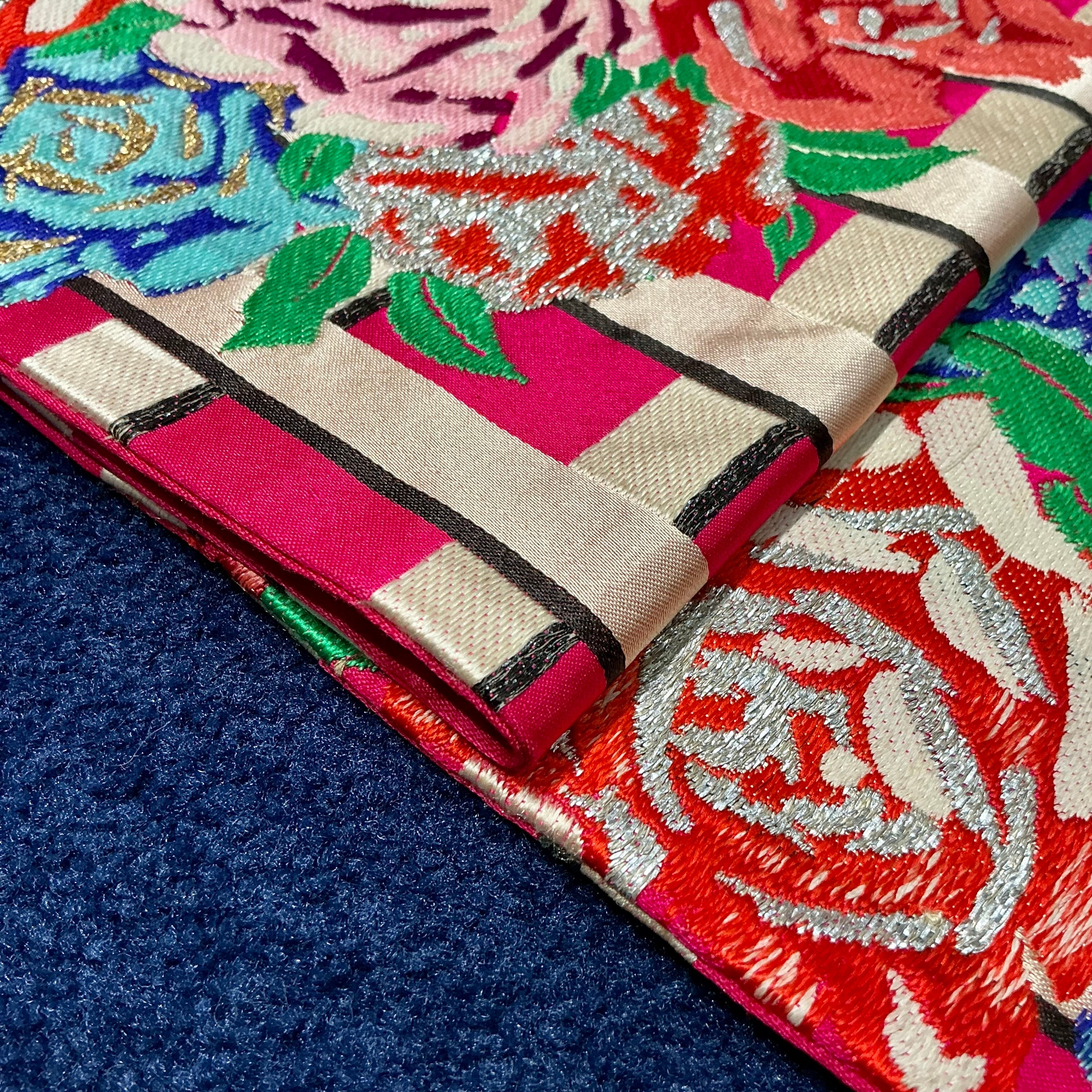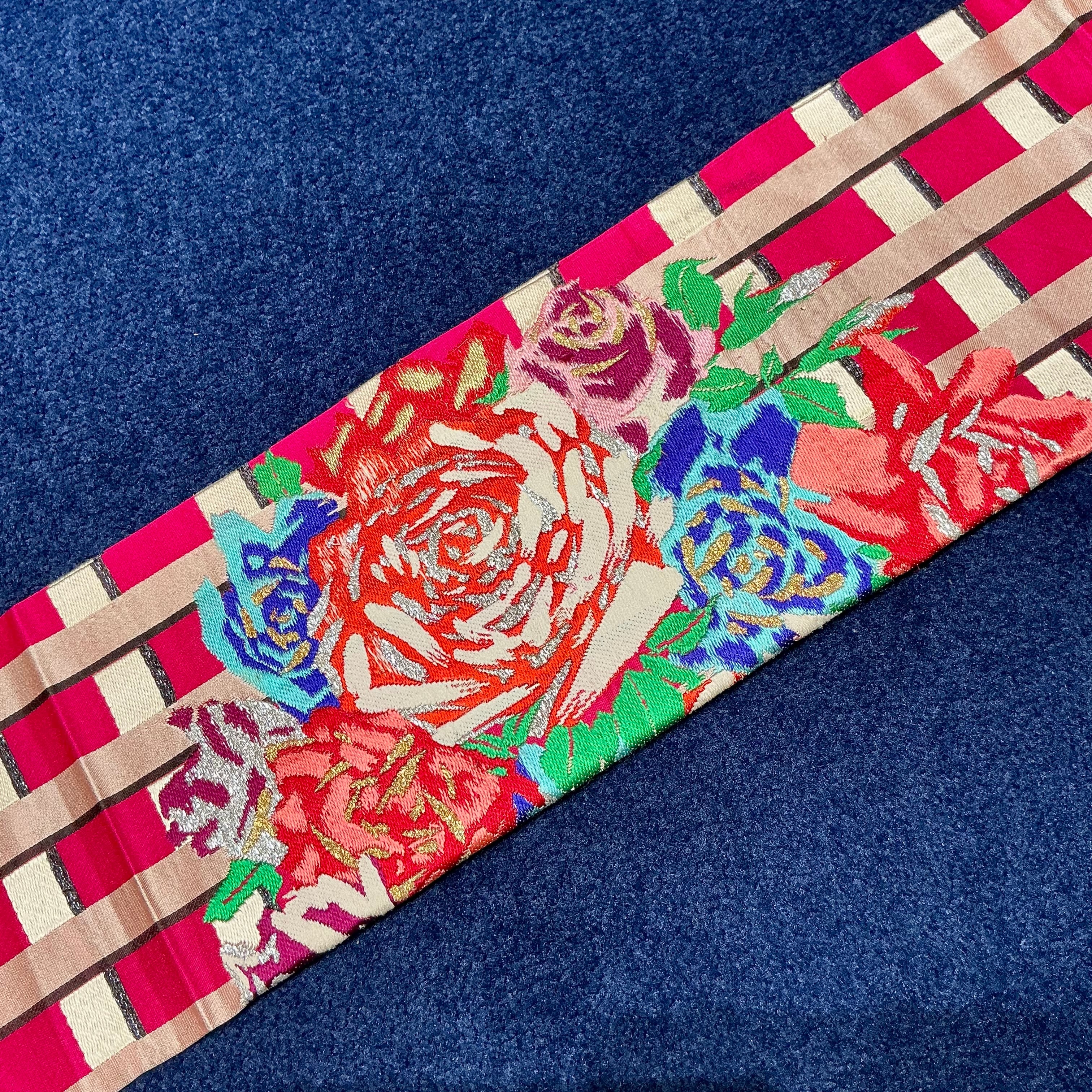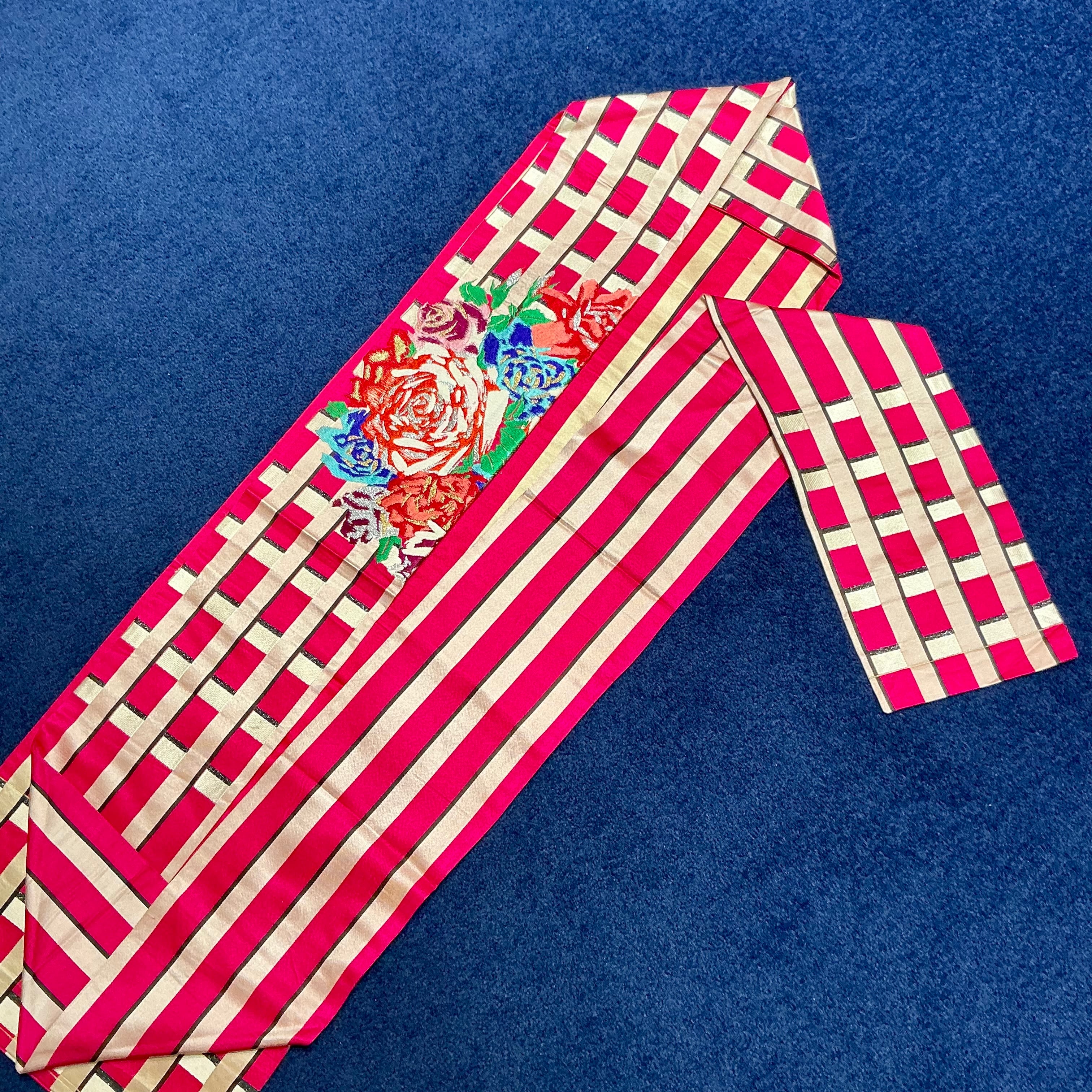 マゼンタピンクのチェック柄の地に、薔薇の織模様が目を惹くアンティーク名古屋帯です