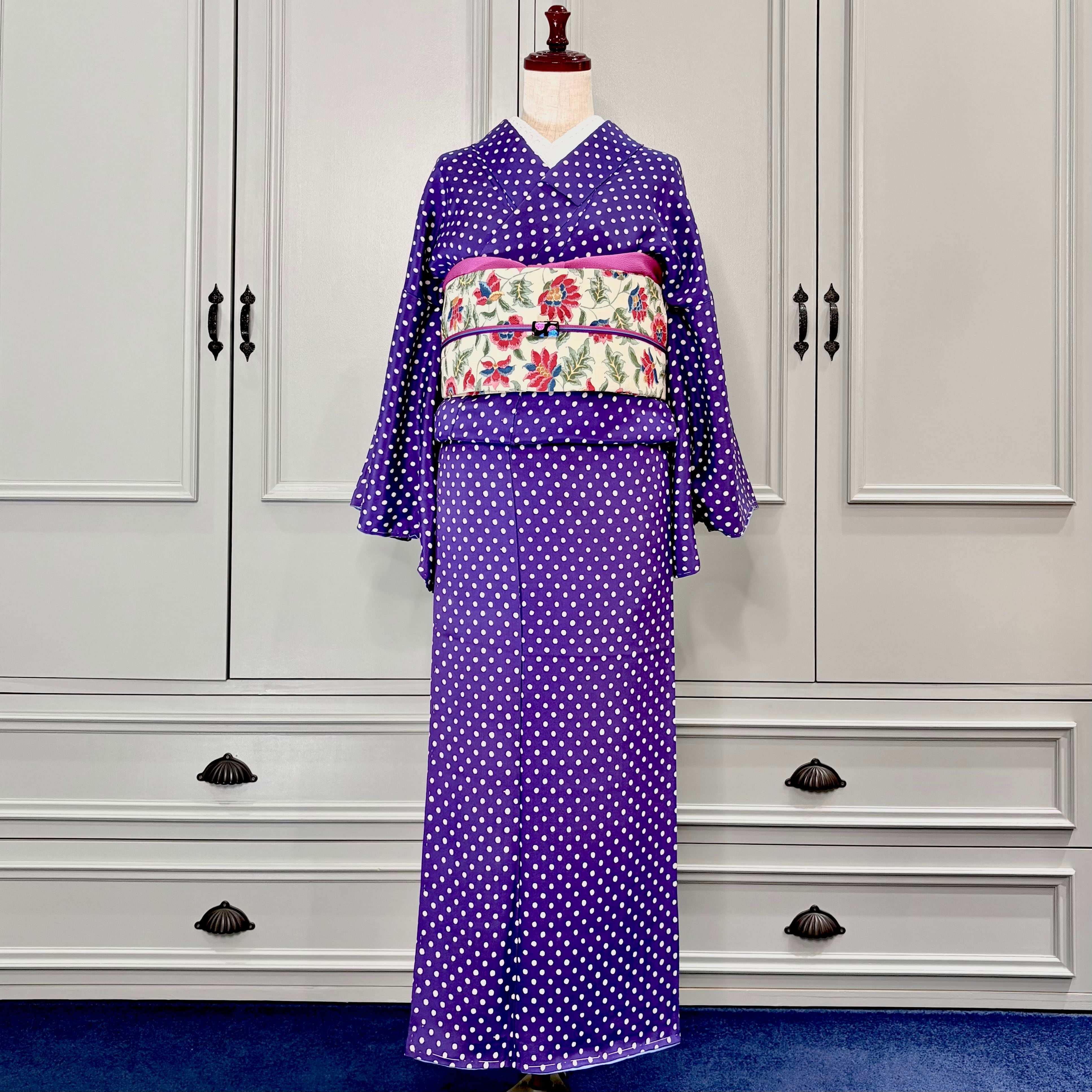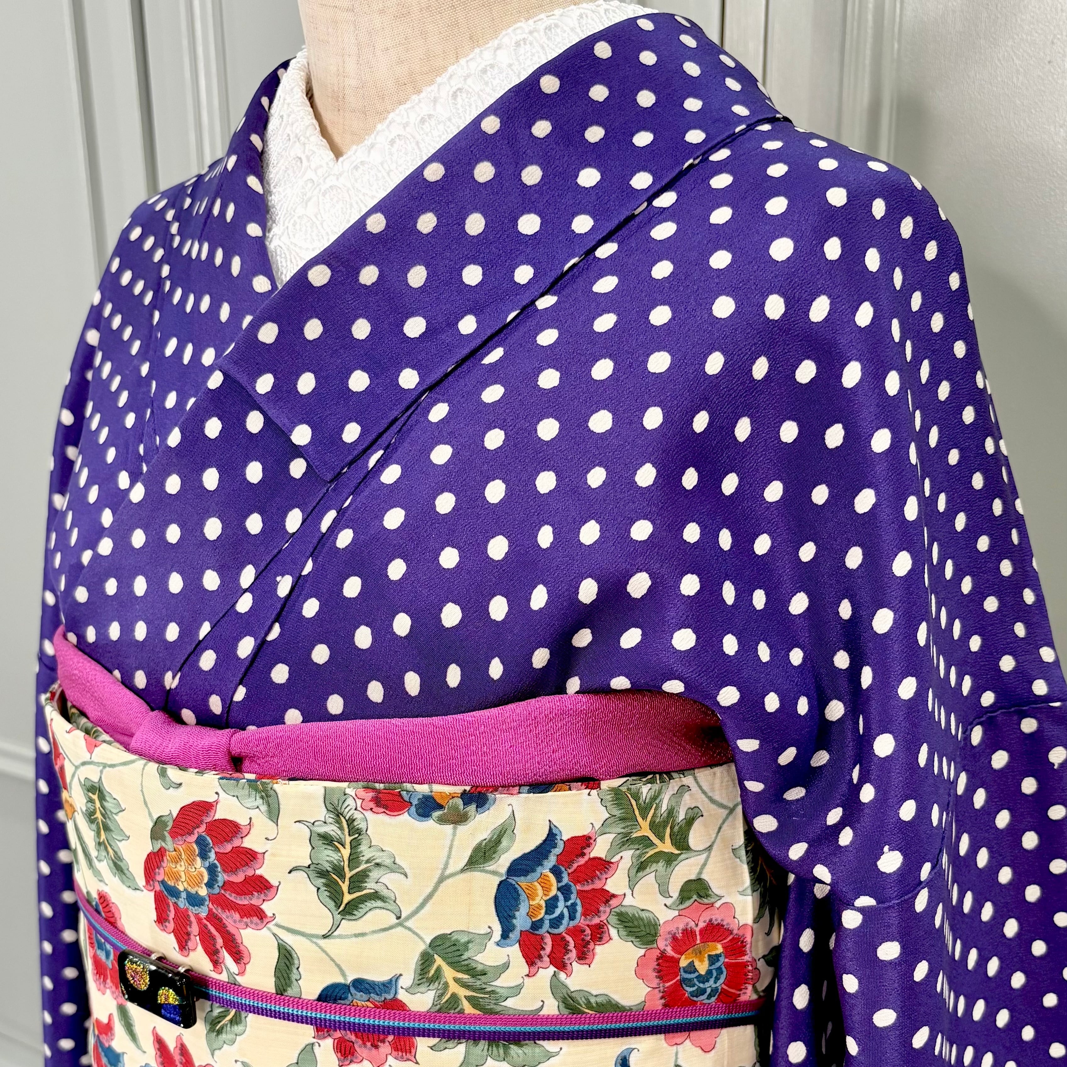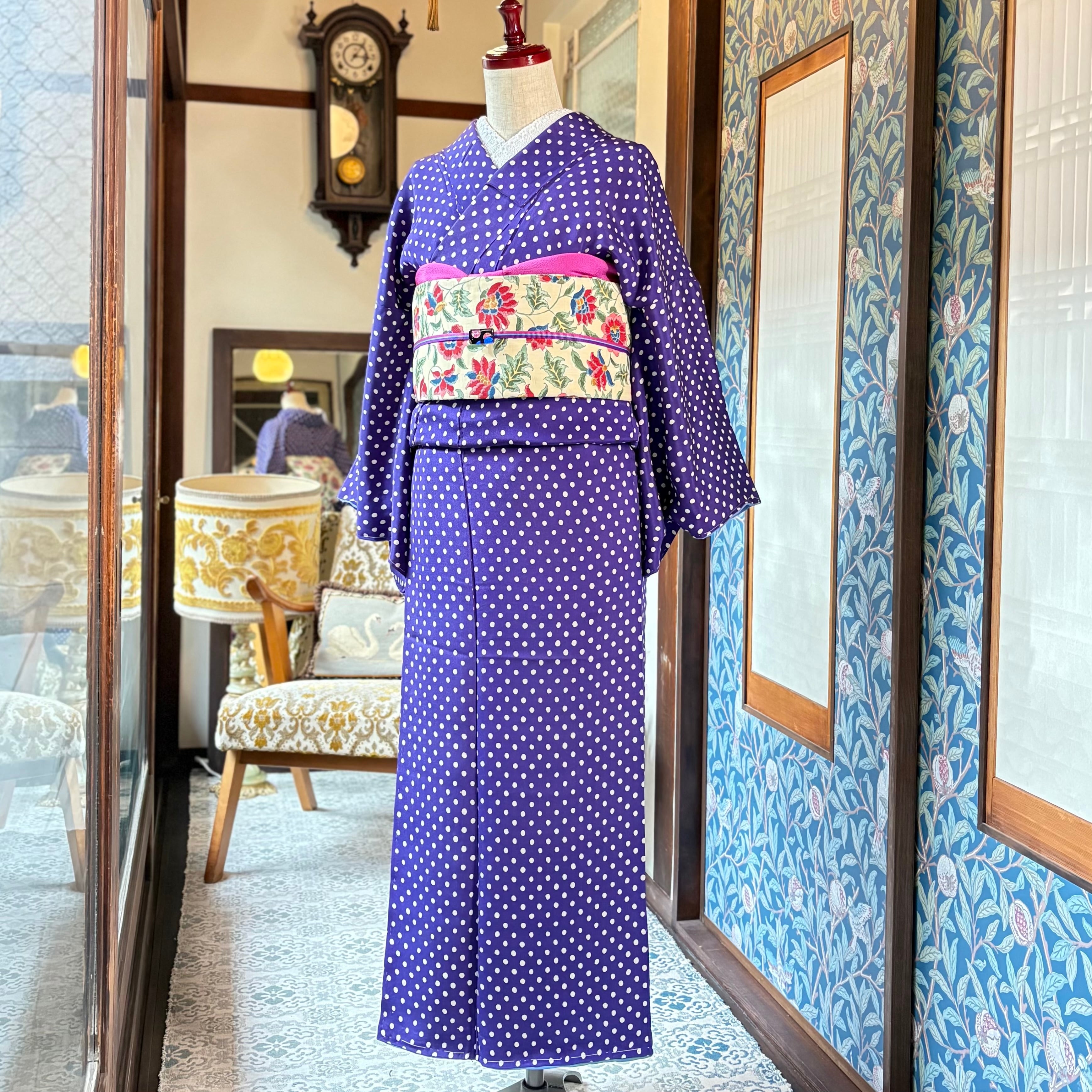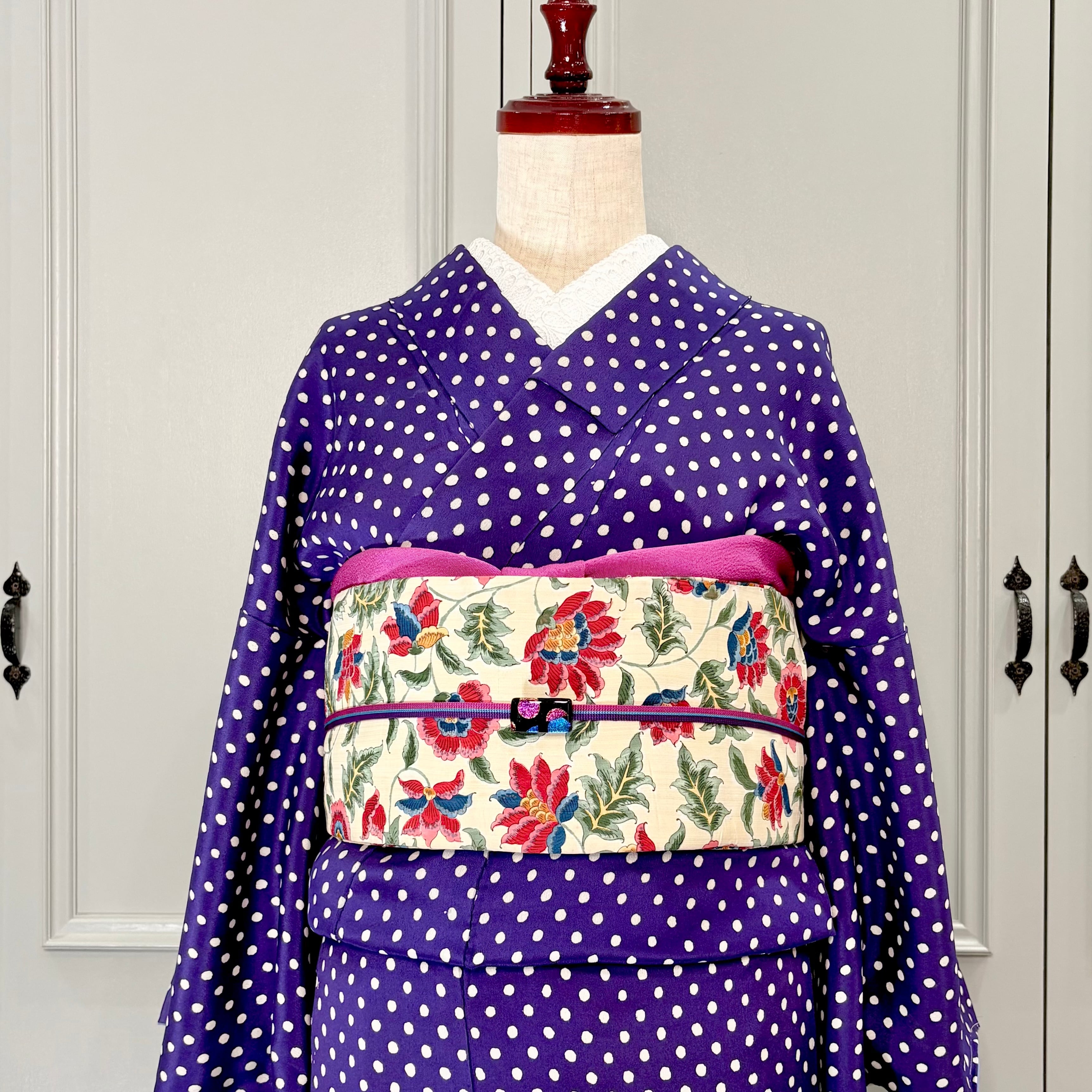 ○合わせたアンティーク名古屋帯、オリジナル帯揚げオーキッドパープル、オリジナル三分紐トリプルライン パープルもwebshop掲載品です♪