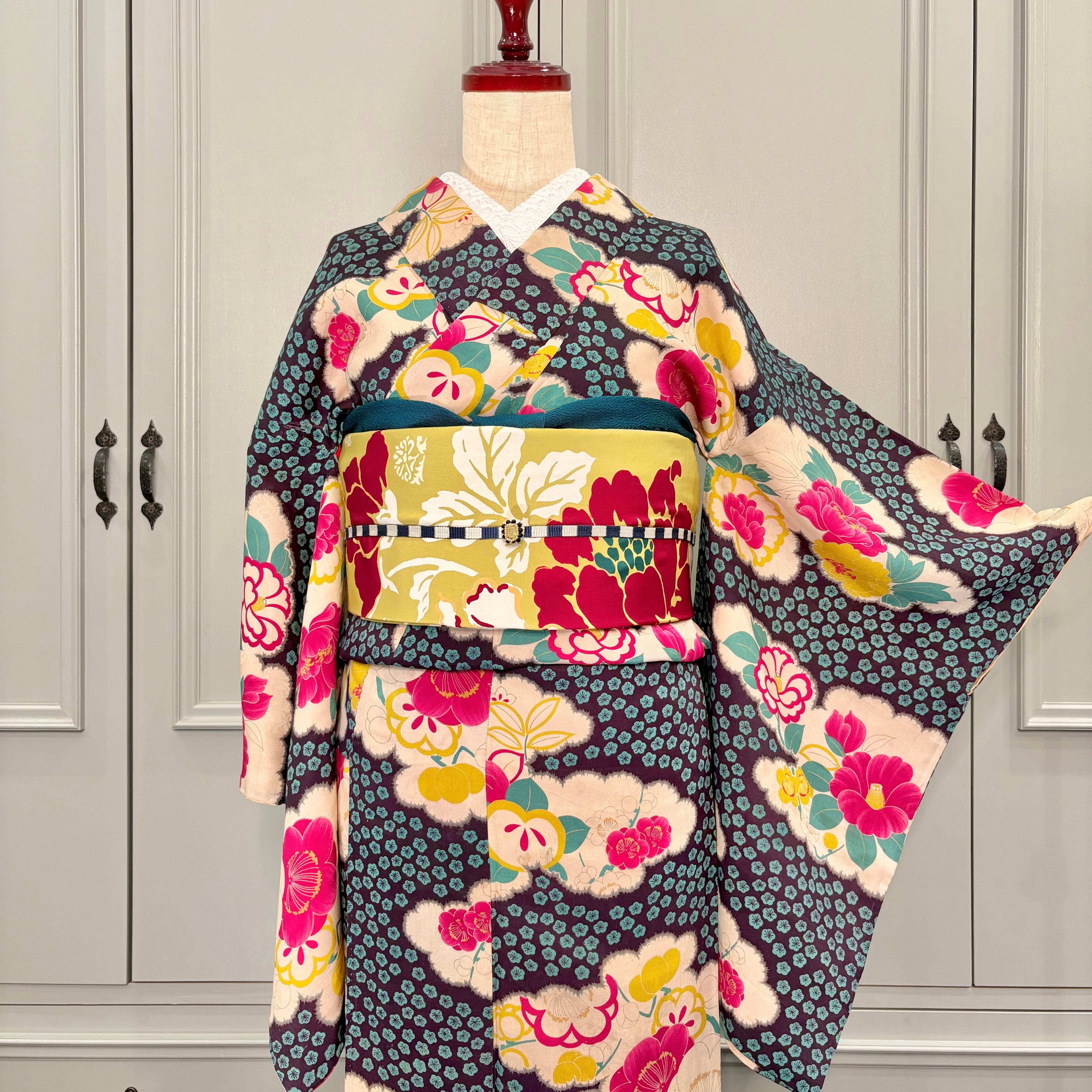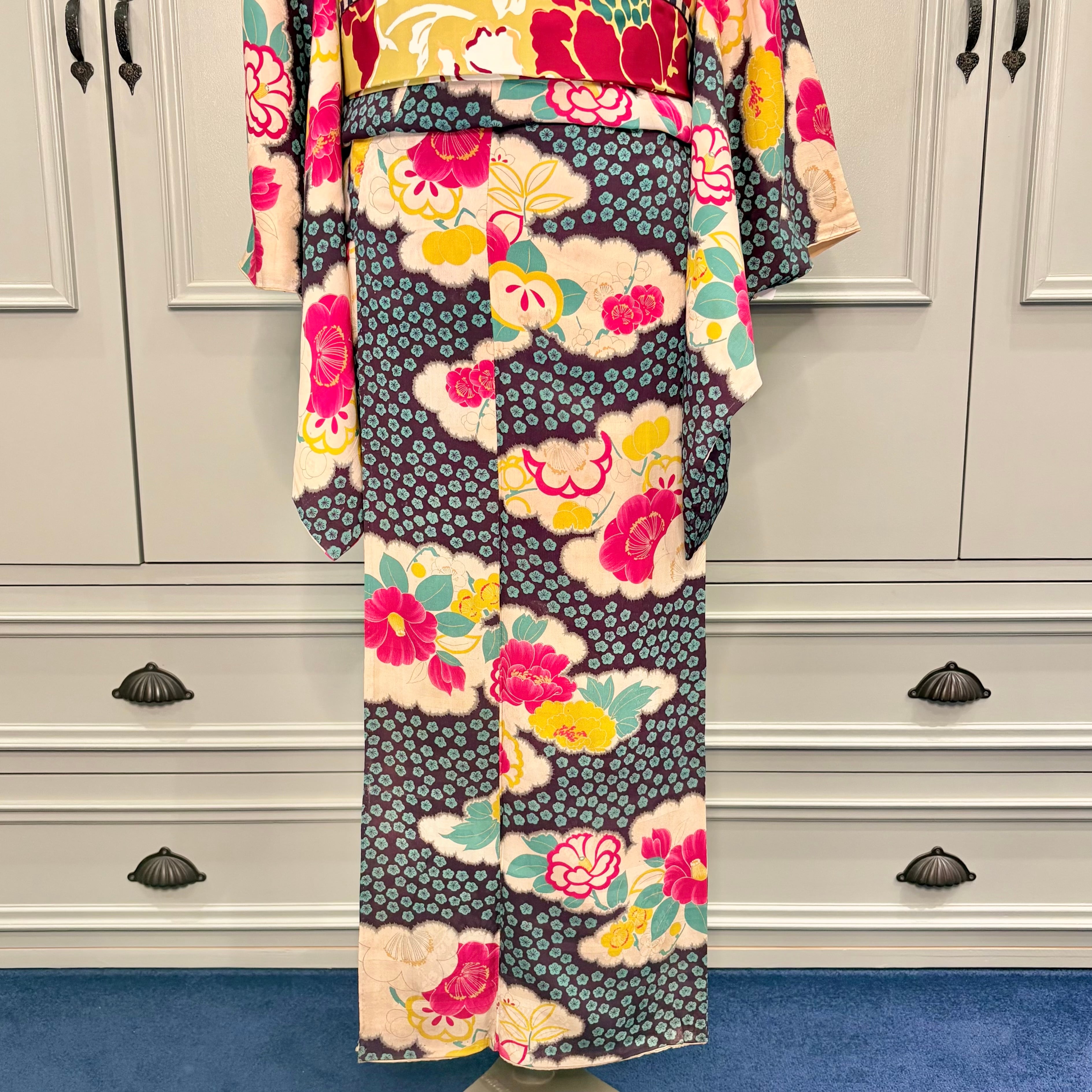 ダークグレーの地に、梅や牡丹、椿、橘などが詰めこまれた雲取り模様が美しい一着✨
