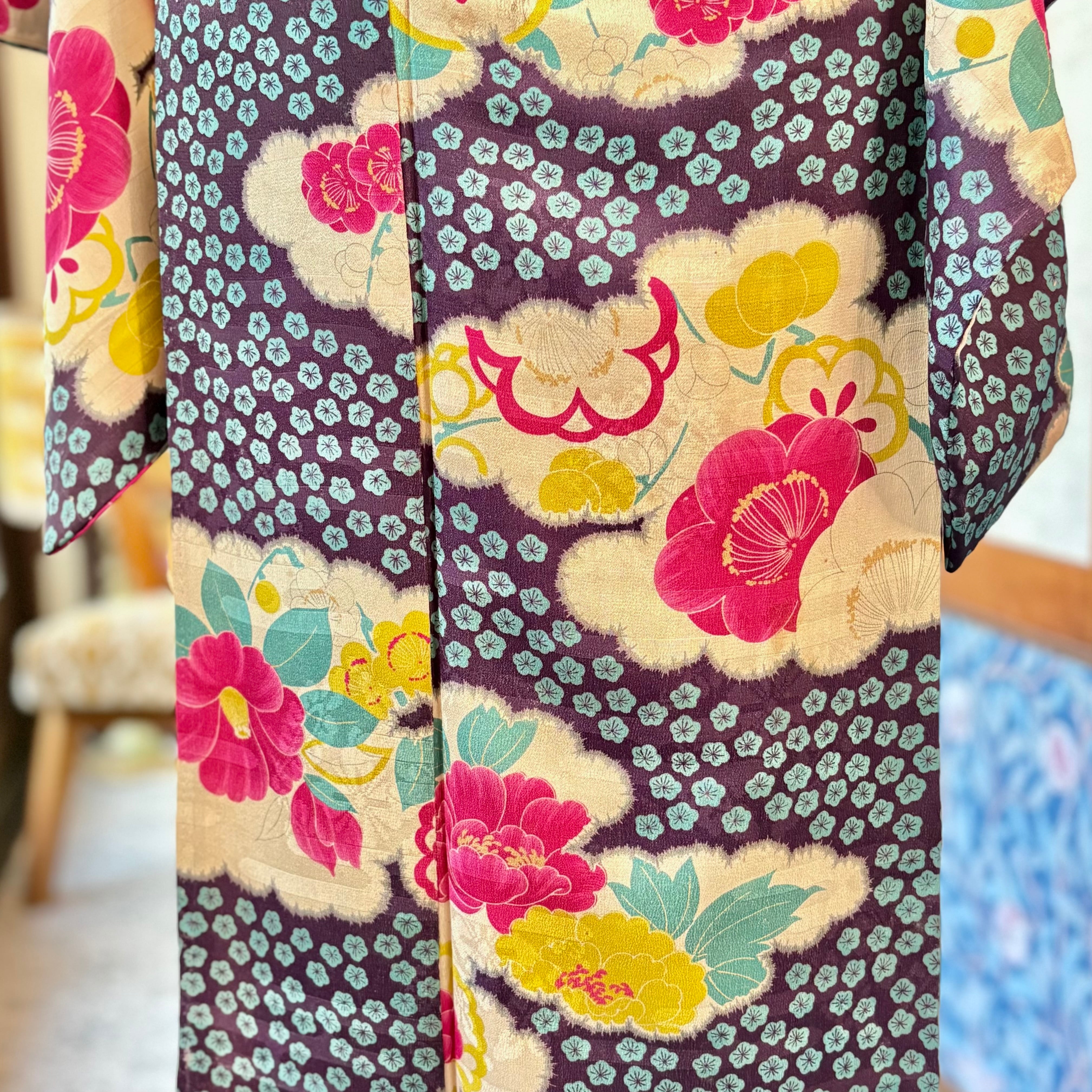 宵の花曇*雲取り 梅 ダークグレー 墨黒 紫 花 牡丹 椿 橘 立花 アンティーク小紋着物 B447