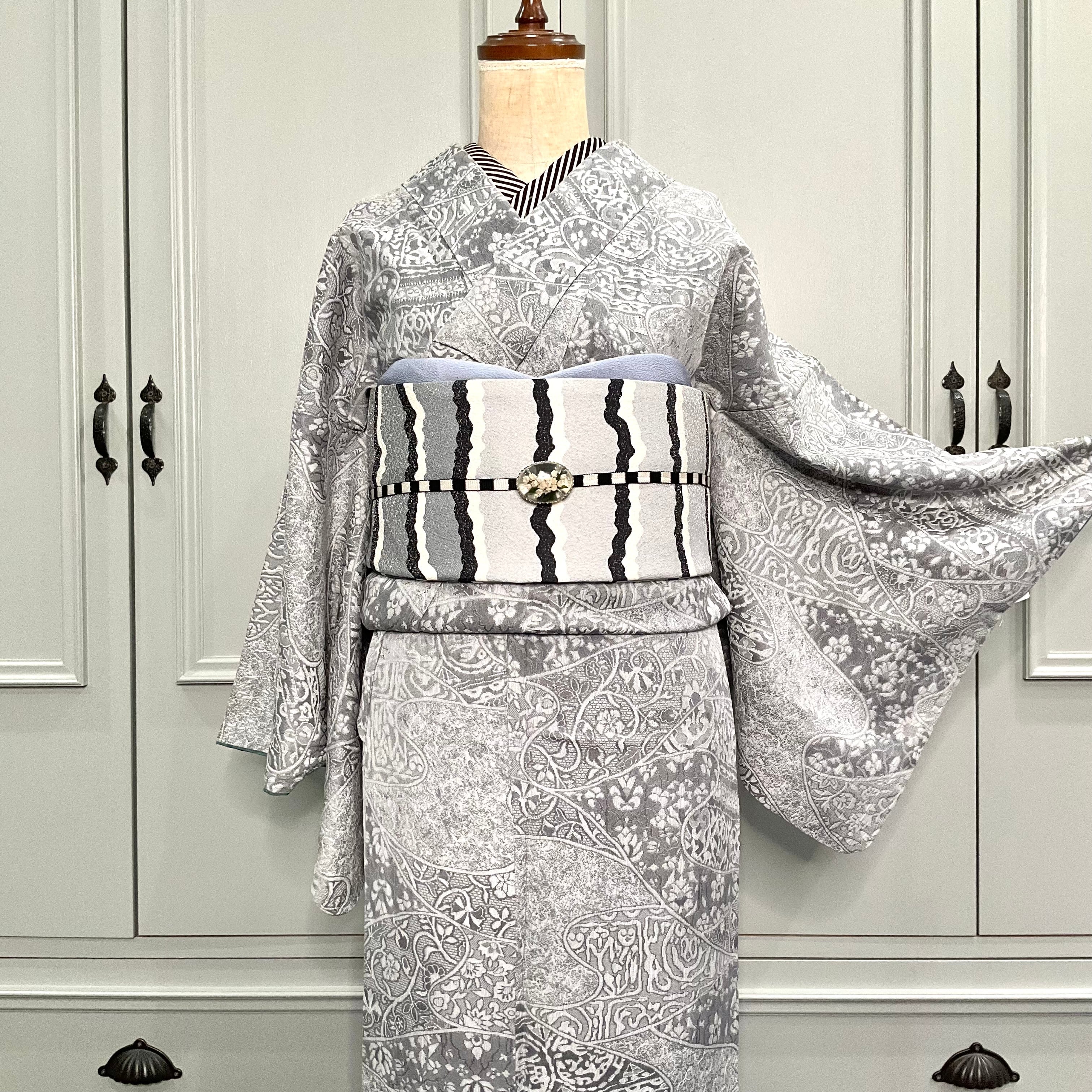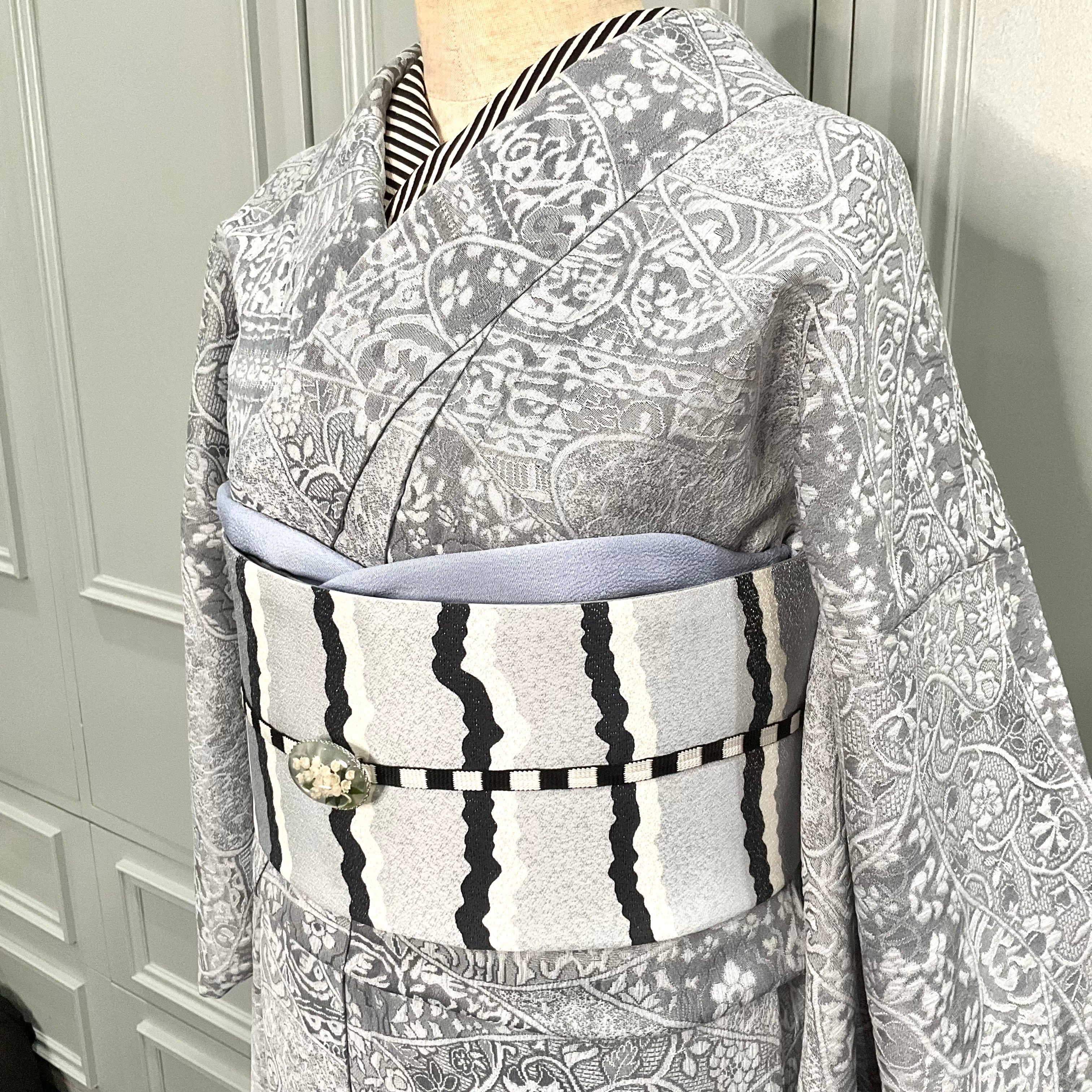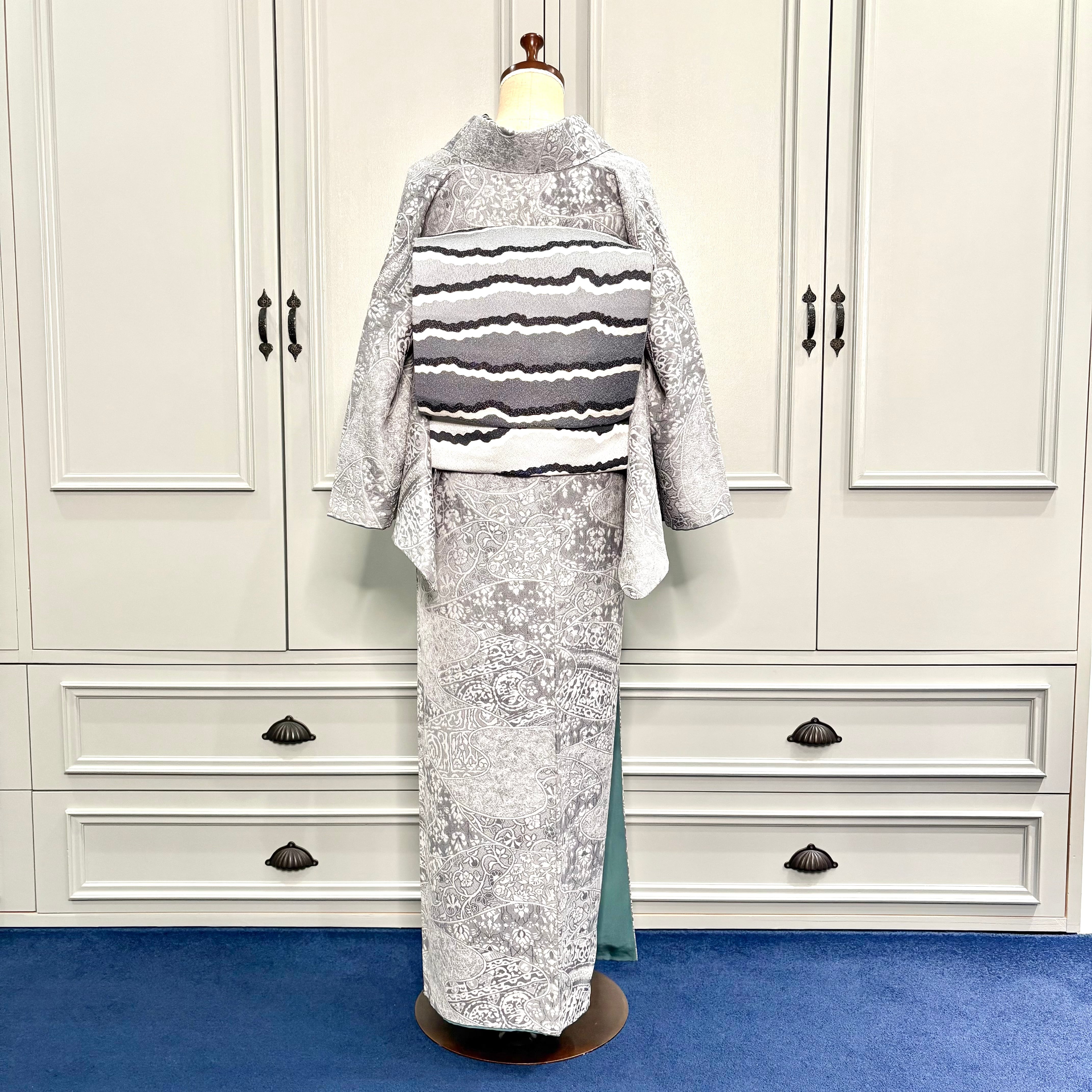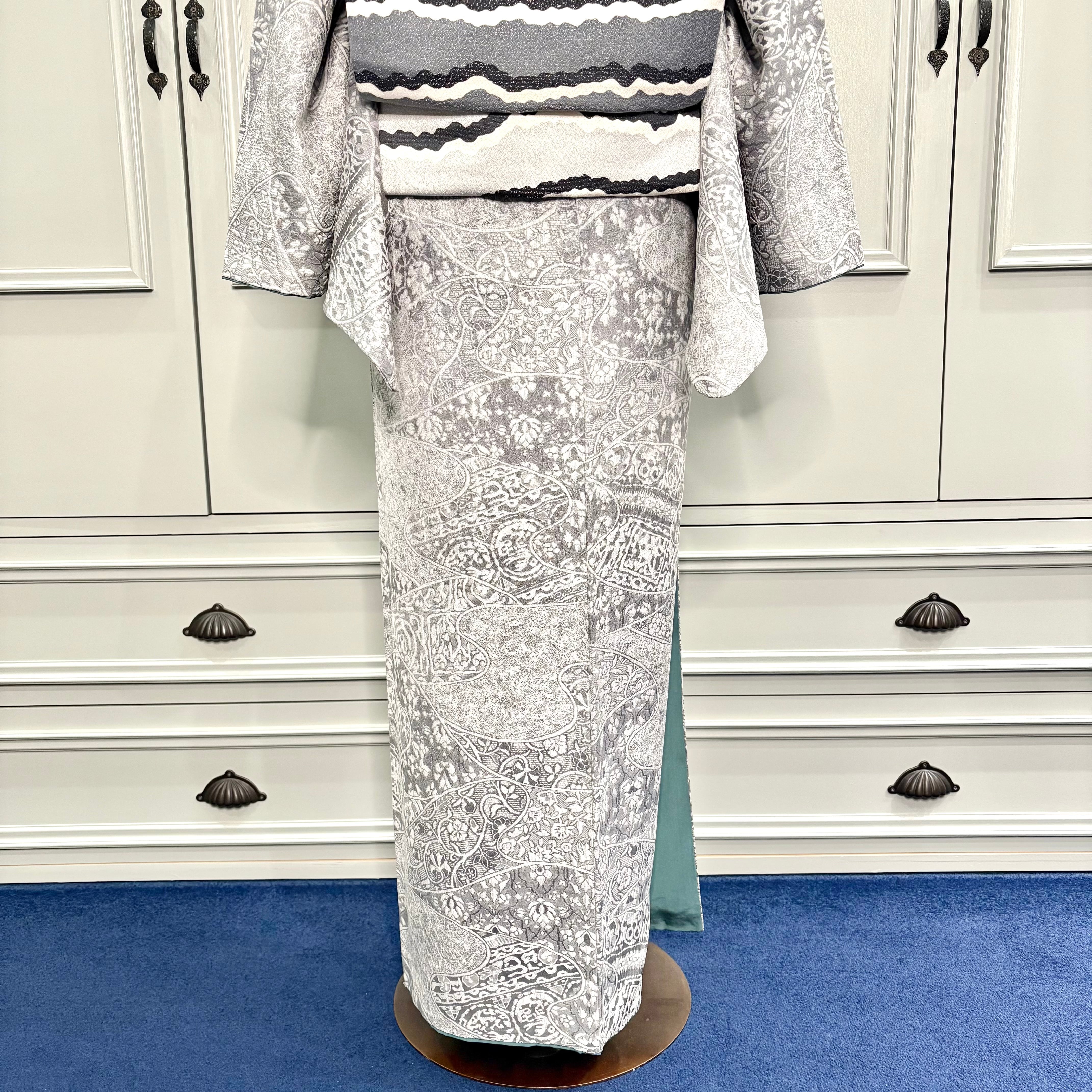 薄いグレーの地色に唐花模様などが立体的に織り出された天目織の魅力が際立つ、上品な一着✨