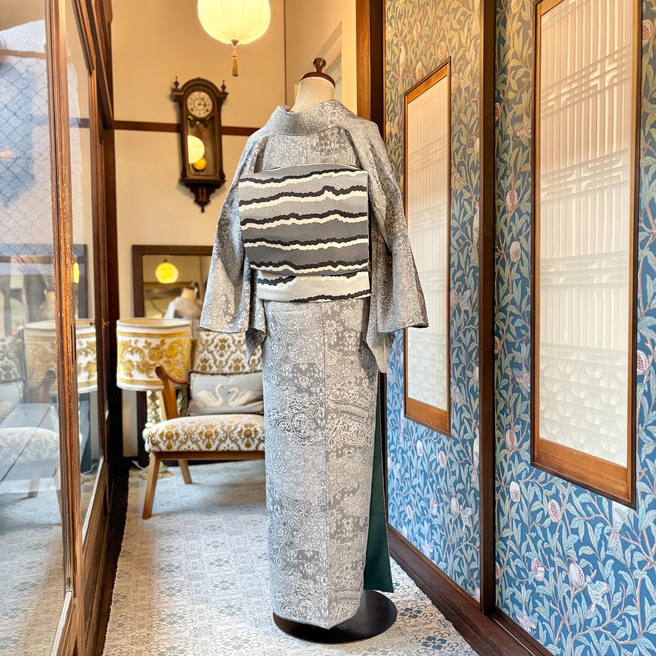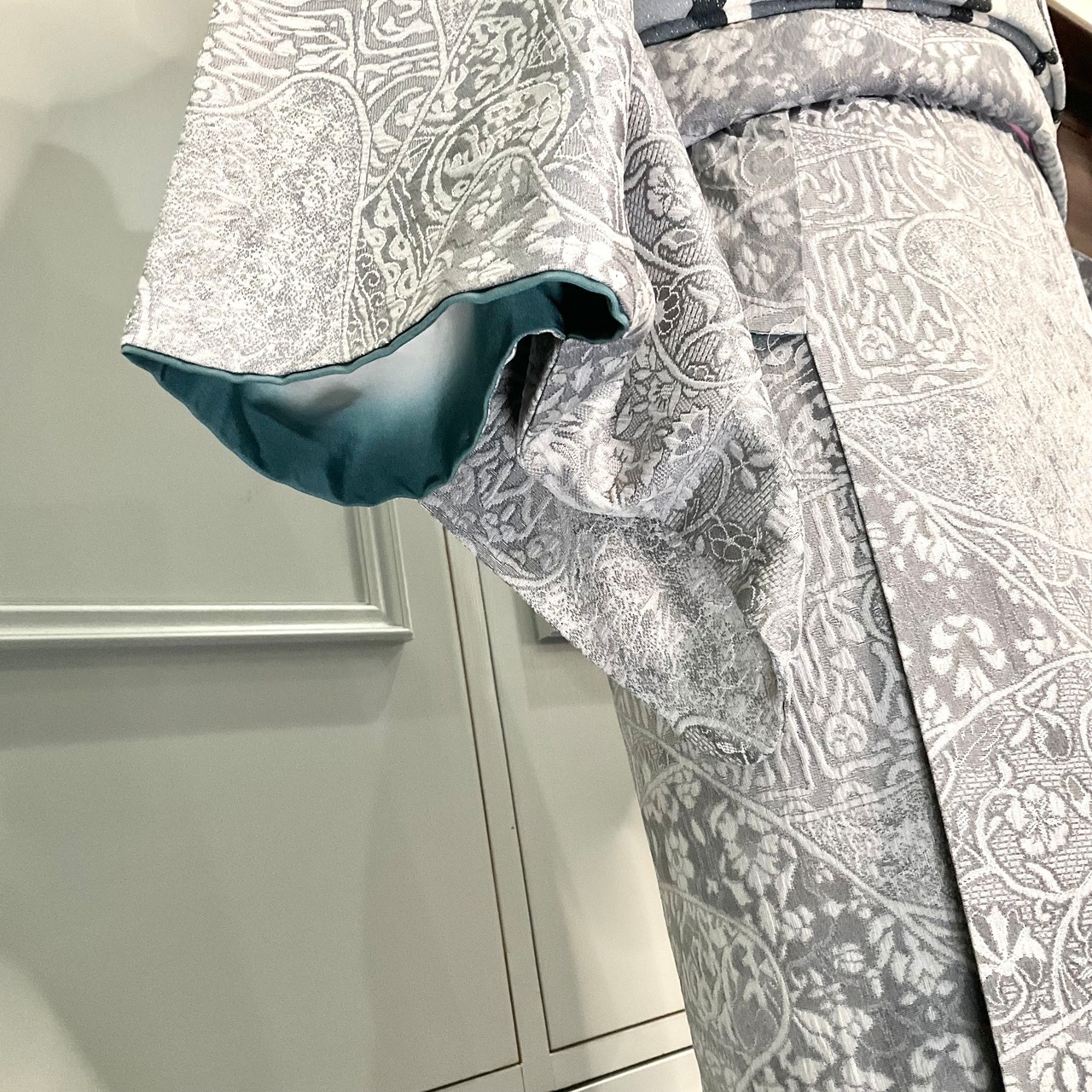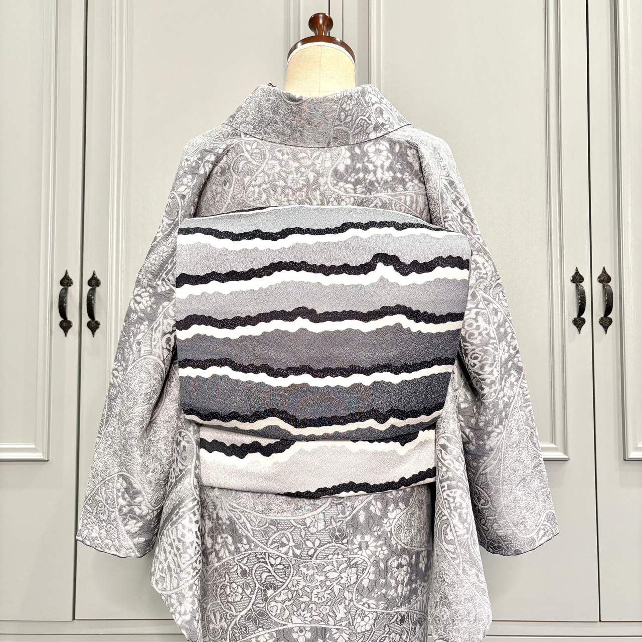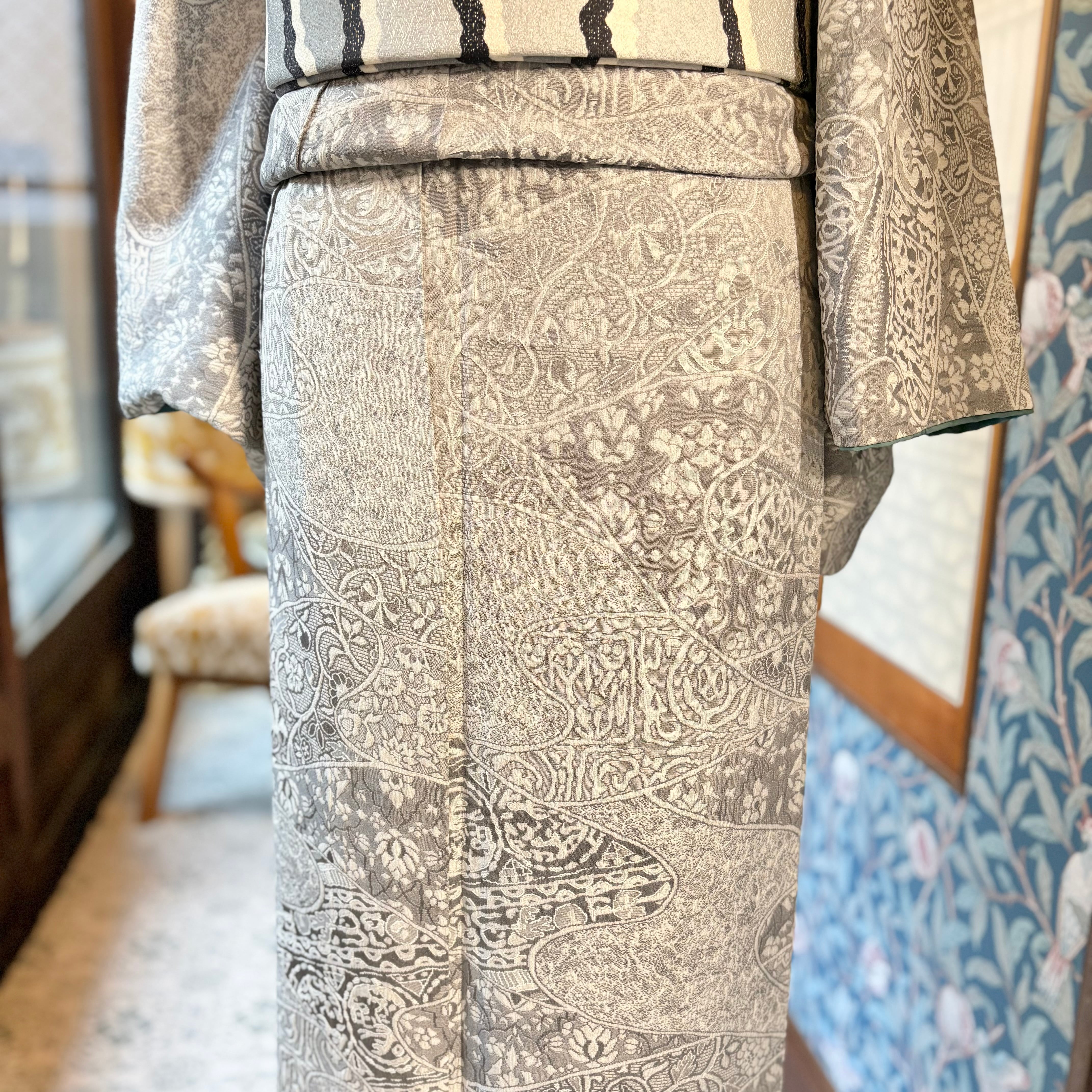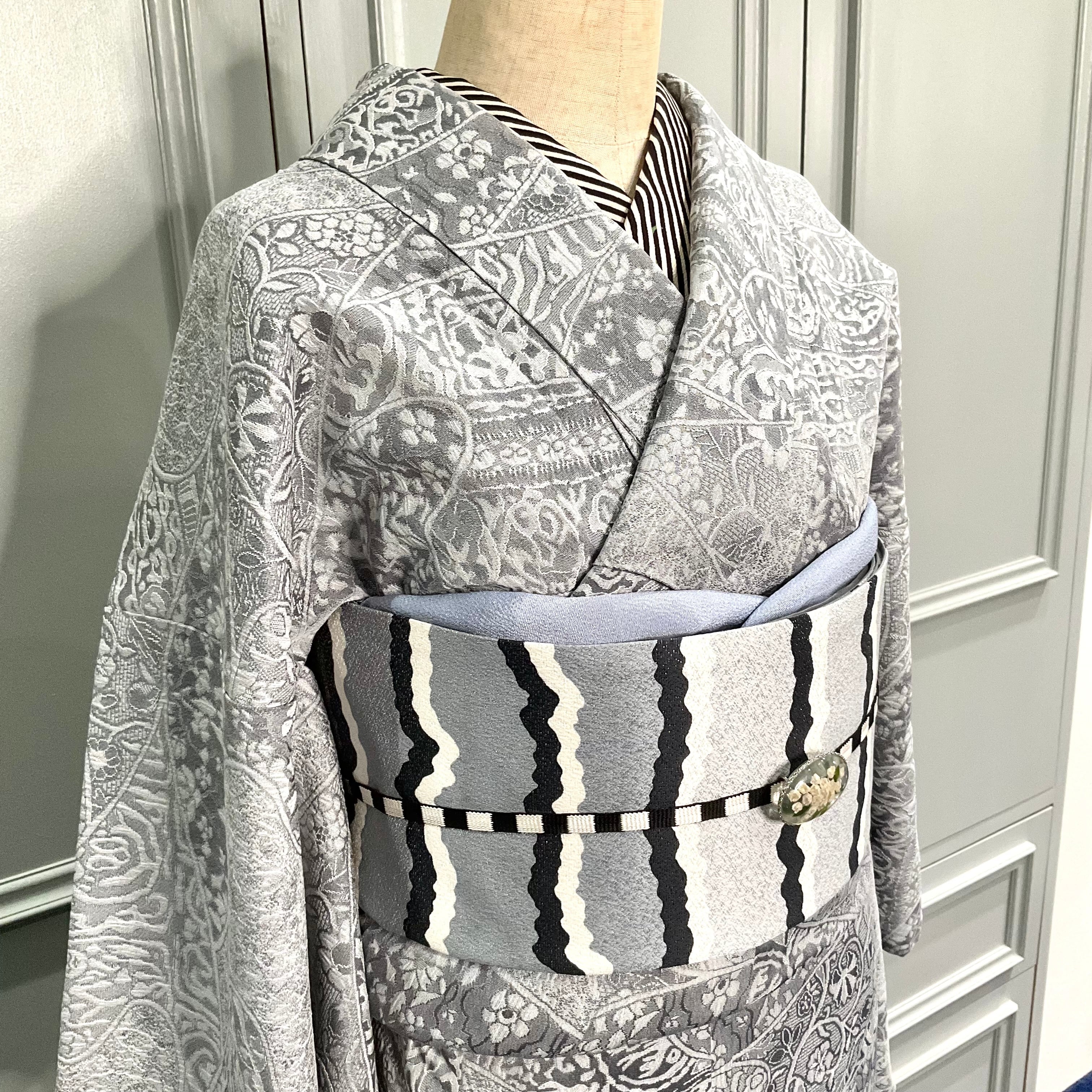 薄いグレーの地色に唐花模様などが立体的に織り出された天目織の魅力が際立つ、上品な一着✨