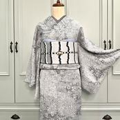 淡いグレーの地色に、更紗模様が流れるようにデザインされた小紋着物です