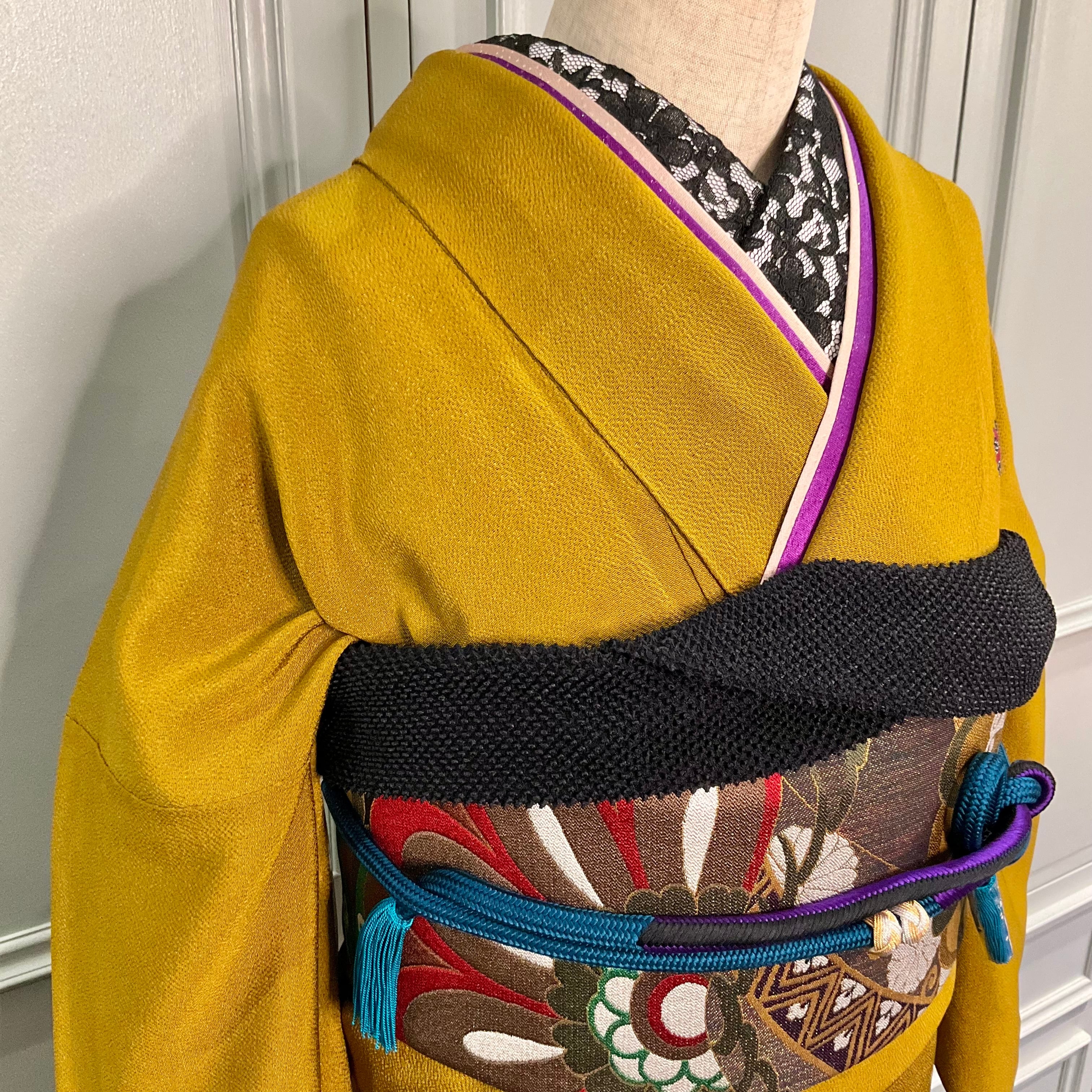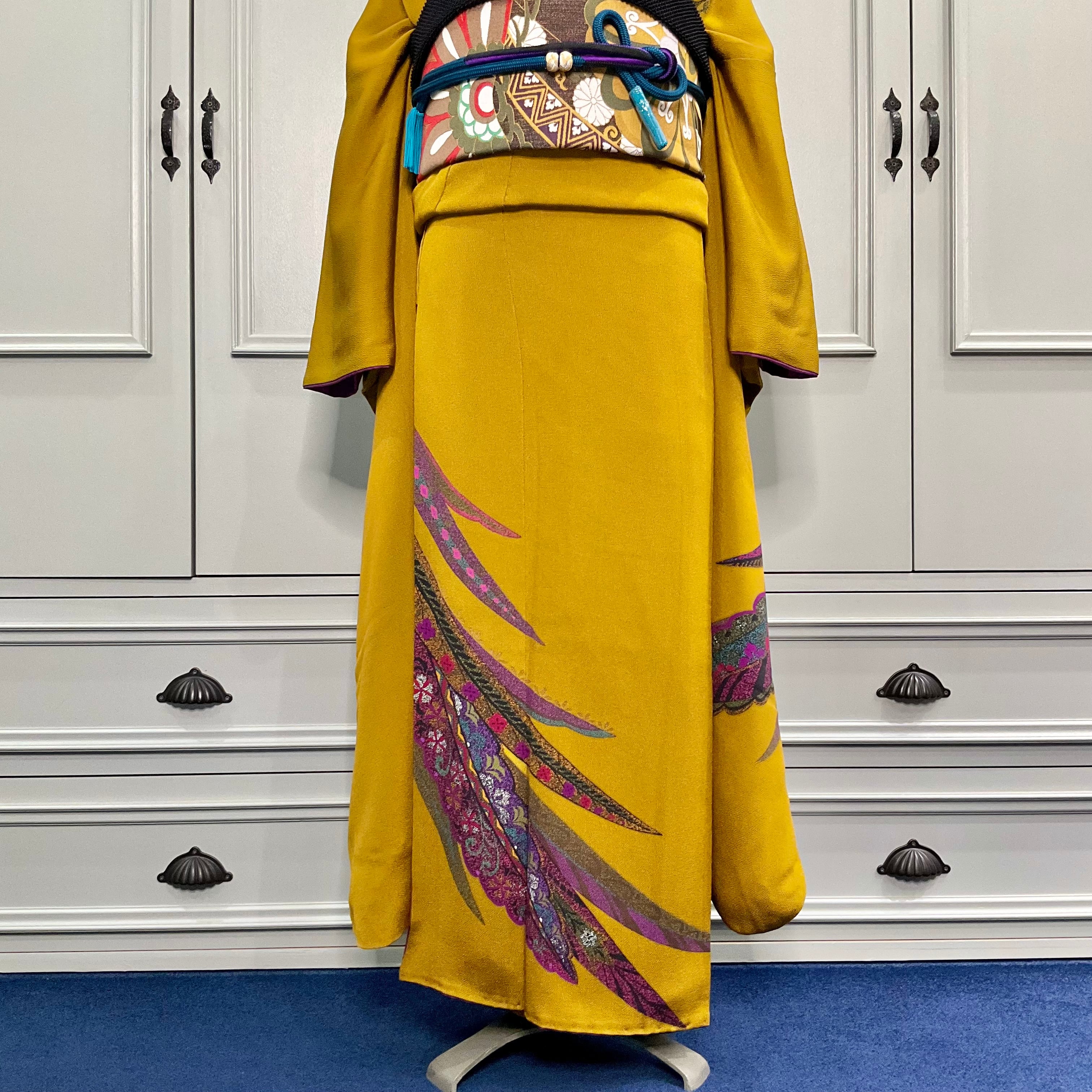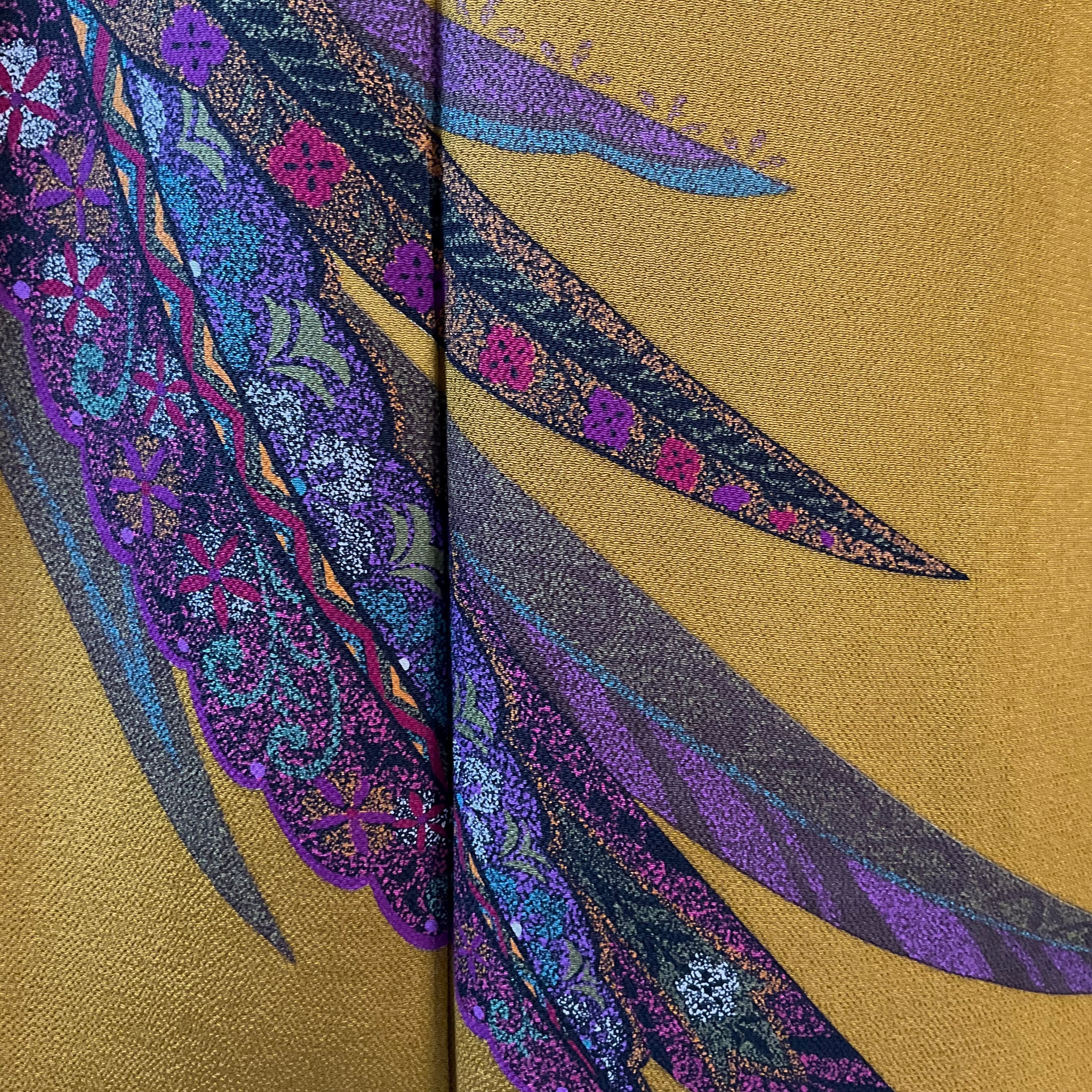 落ち着いたオーカーの地色で無地の部分が多く、パープル系の羽根のようなデザインが前裾と袖下に、胸もとにはお花が描かれ、