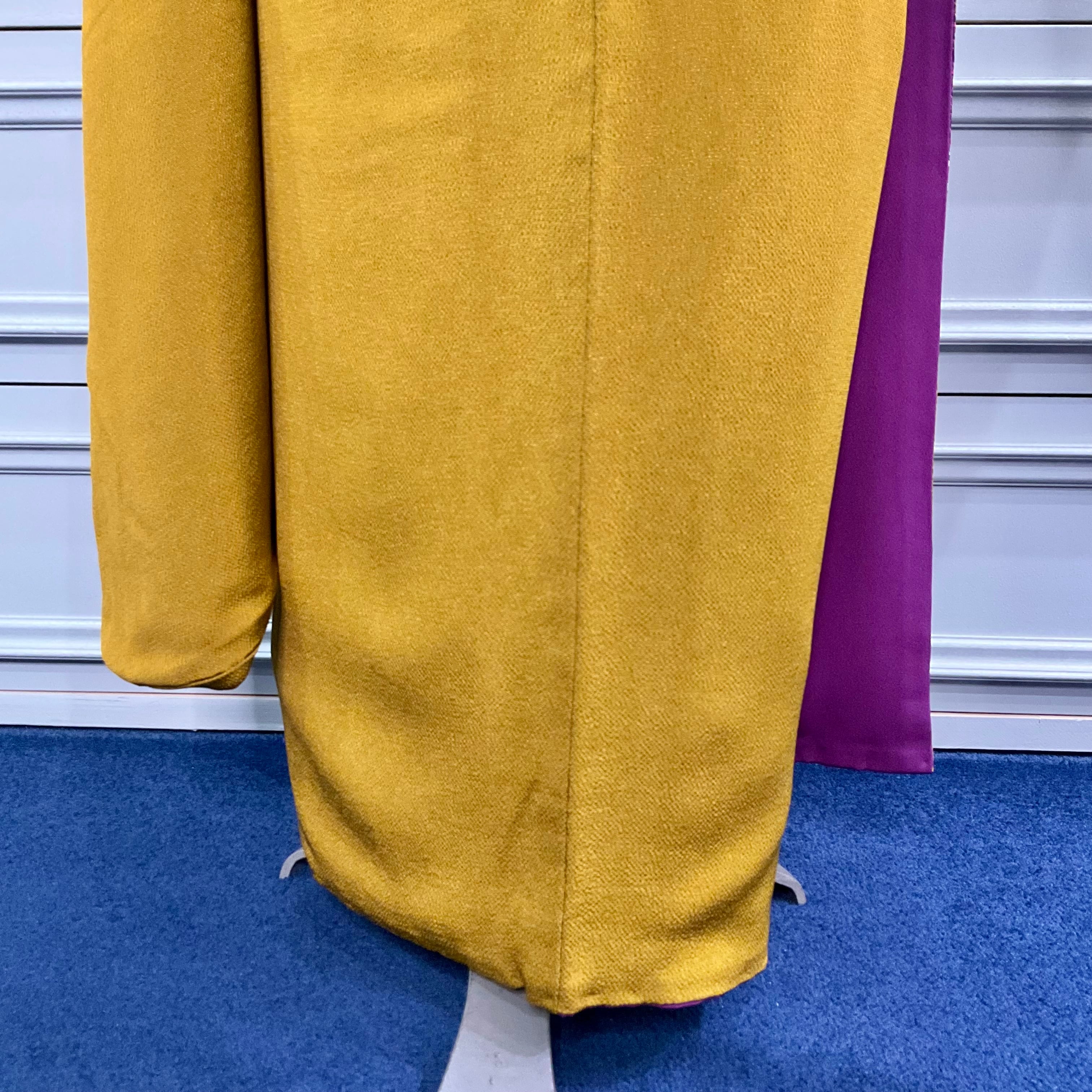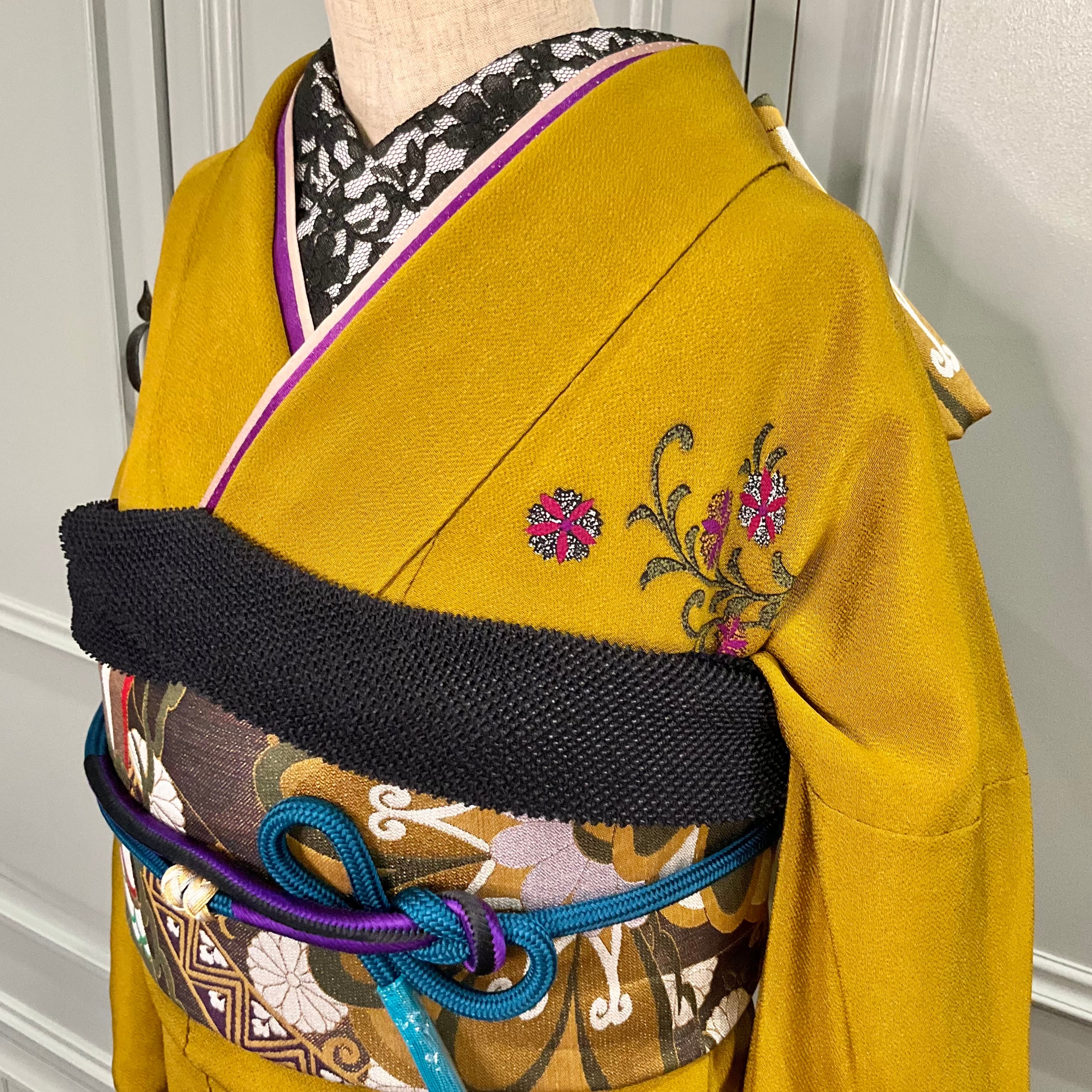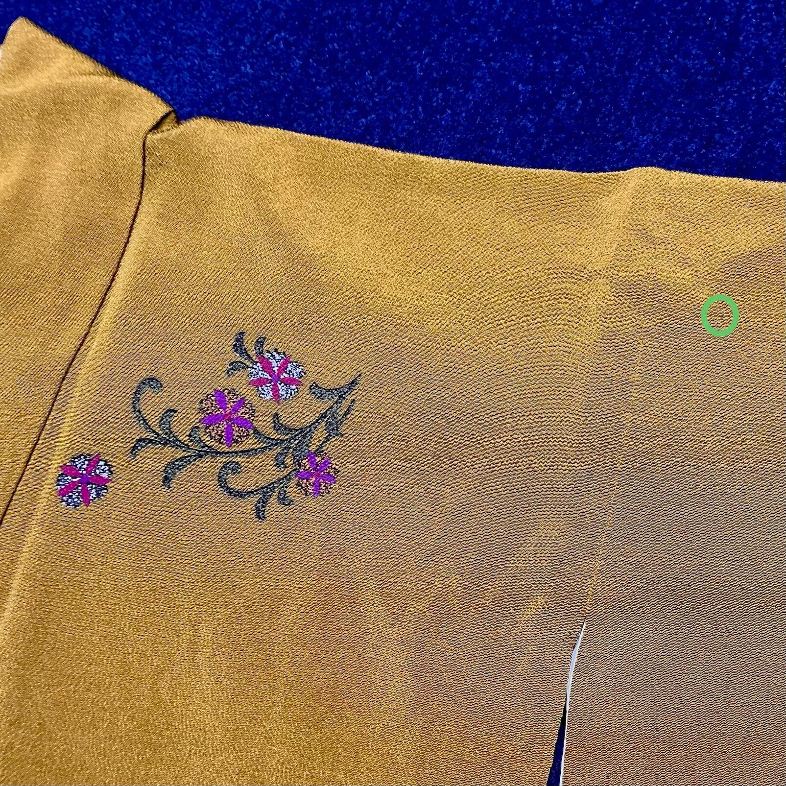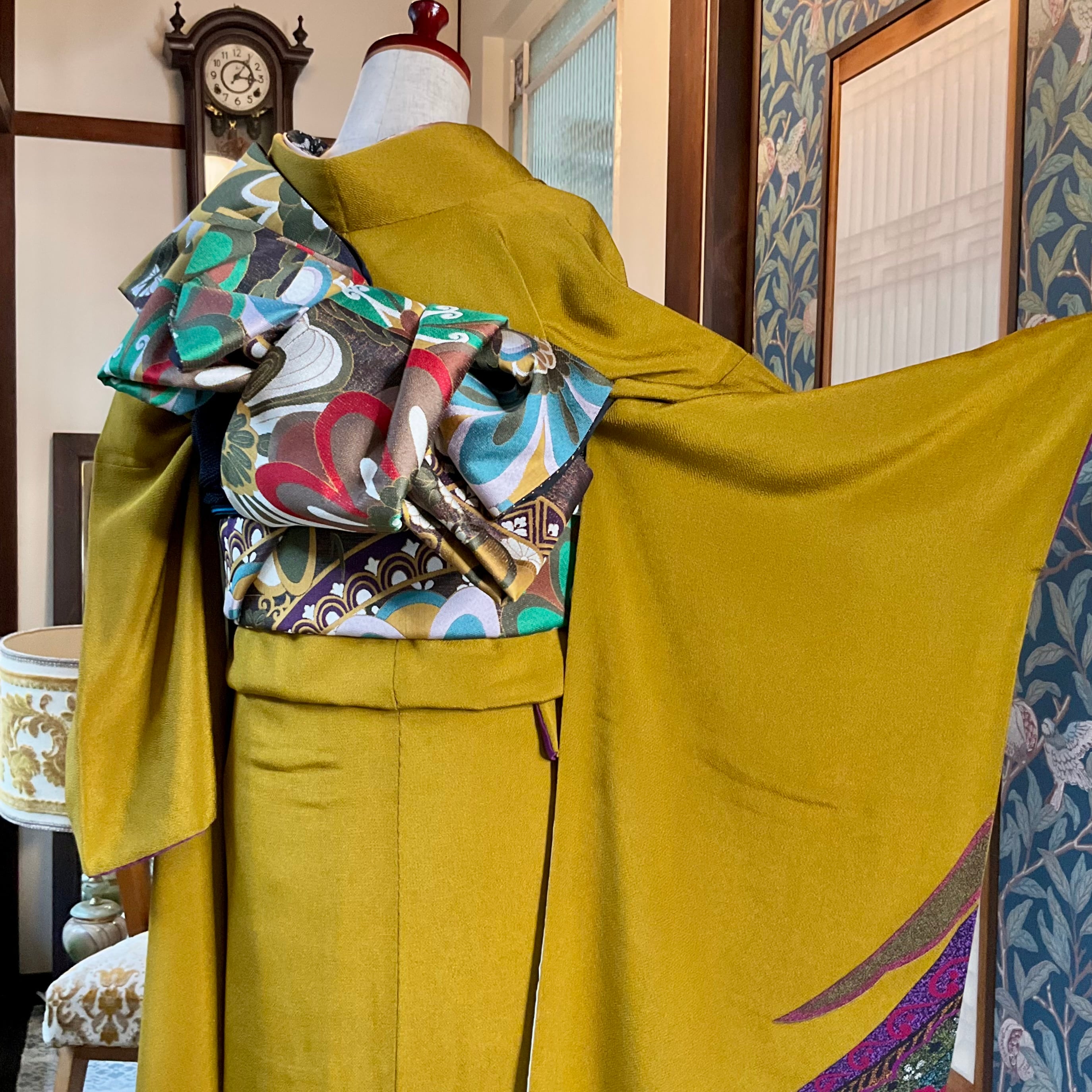 落ち着いたオーカーの地色で無地の部分が多く、パープル系の羽根のようなデザインが前裾と袖下に、胸もとにはお花が描かれ、