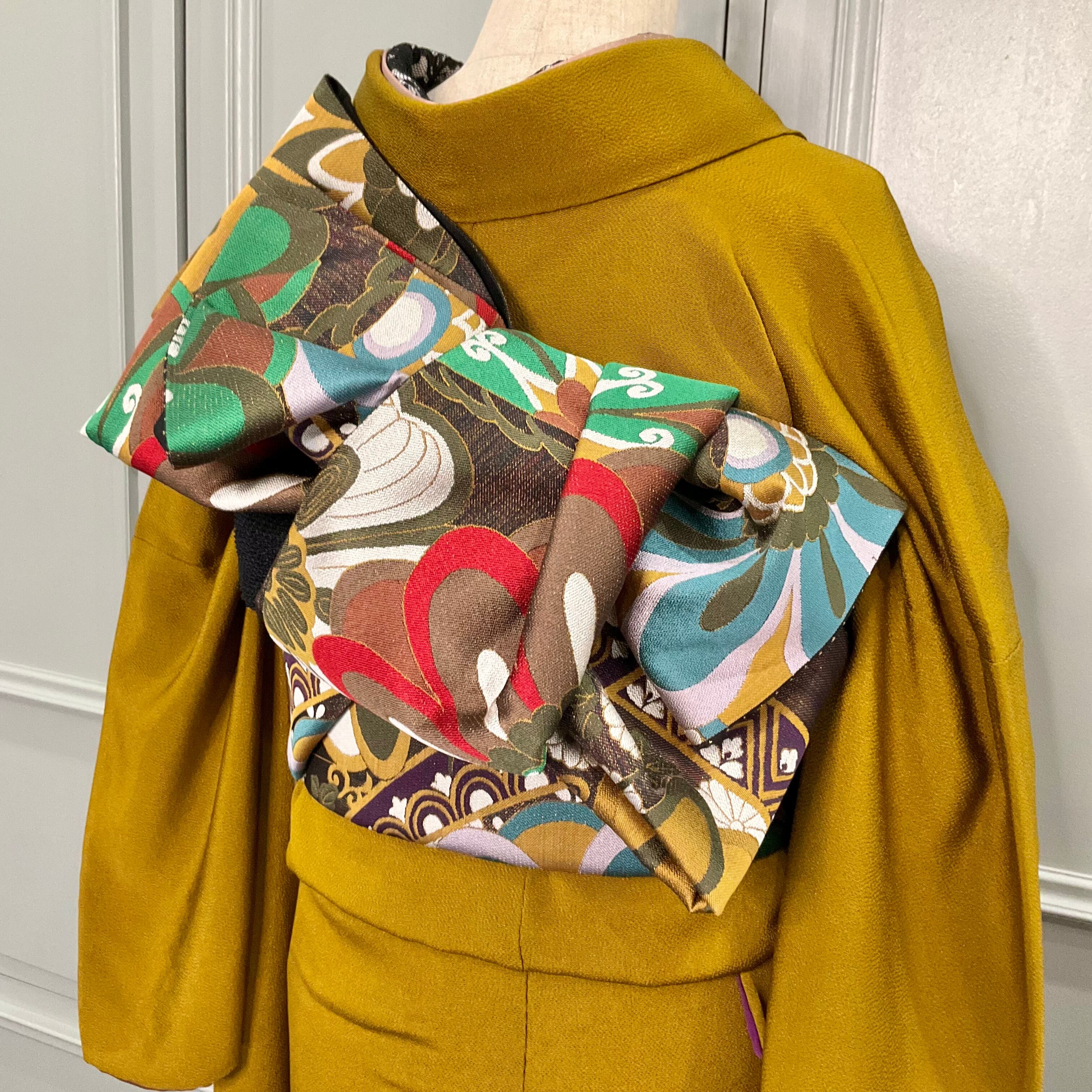 合わせた袋帯は、振袖の色柄にマッチするラメ感のあるブラック地に、マスタードや色とりどりの幾何学的なお花のデザインで華やかさも併せ持ち、お洒落な着姿に*