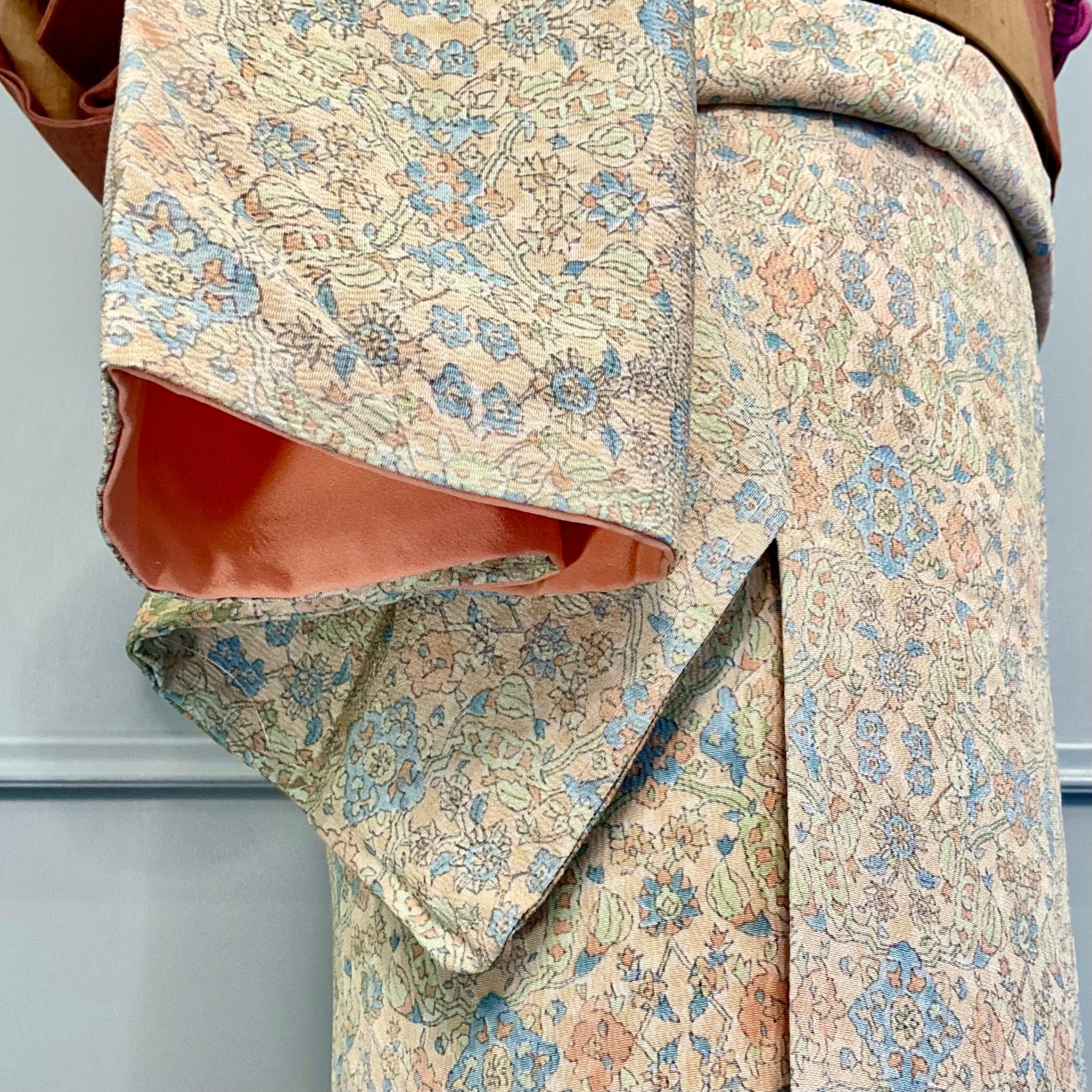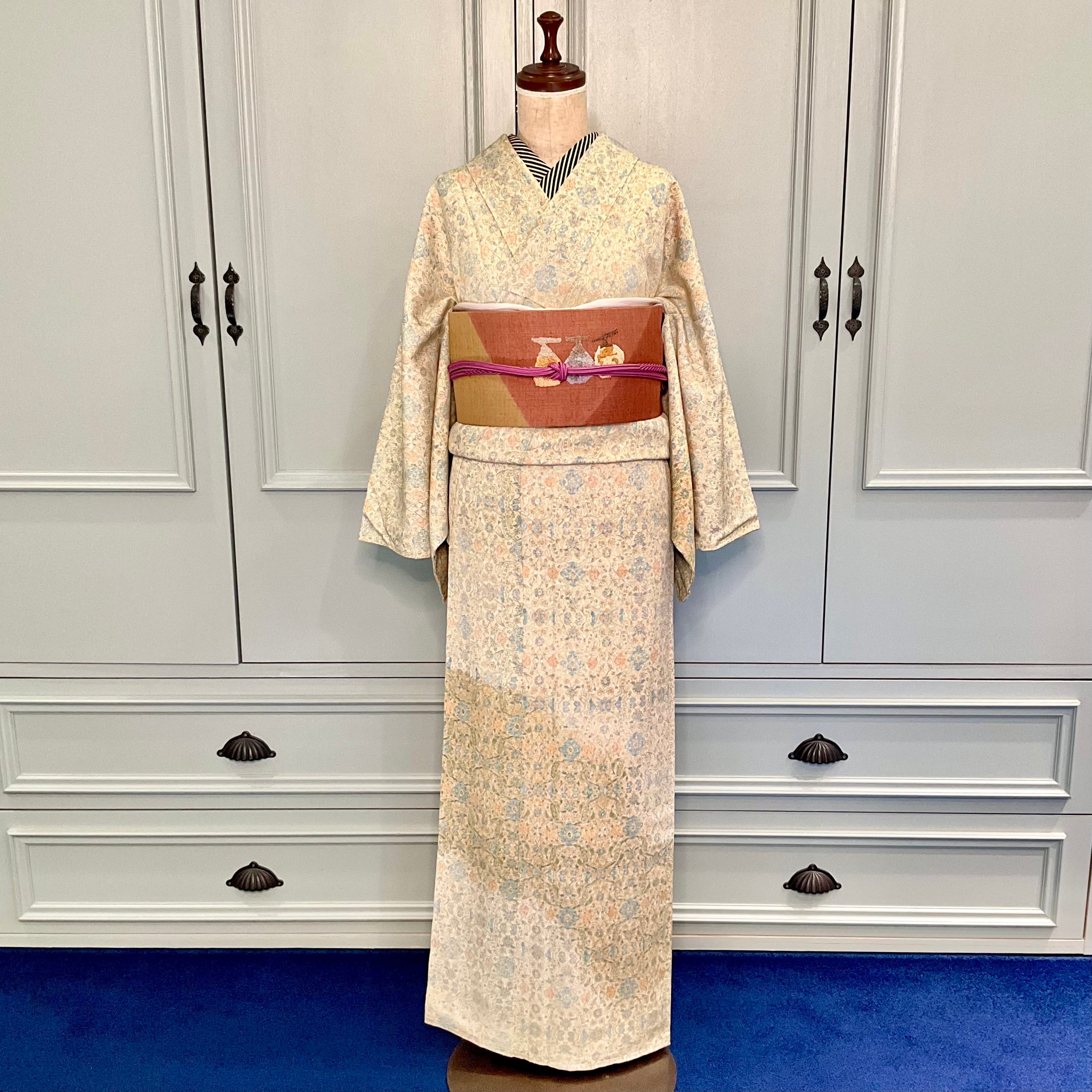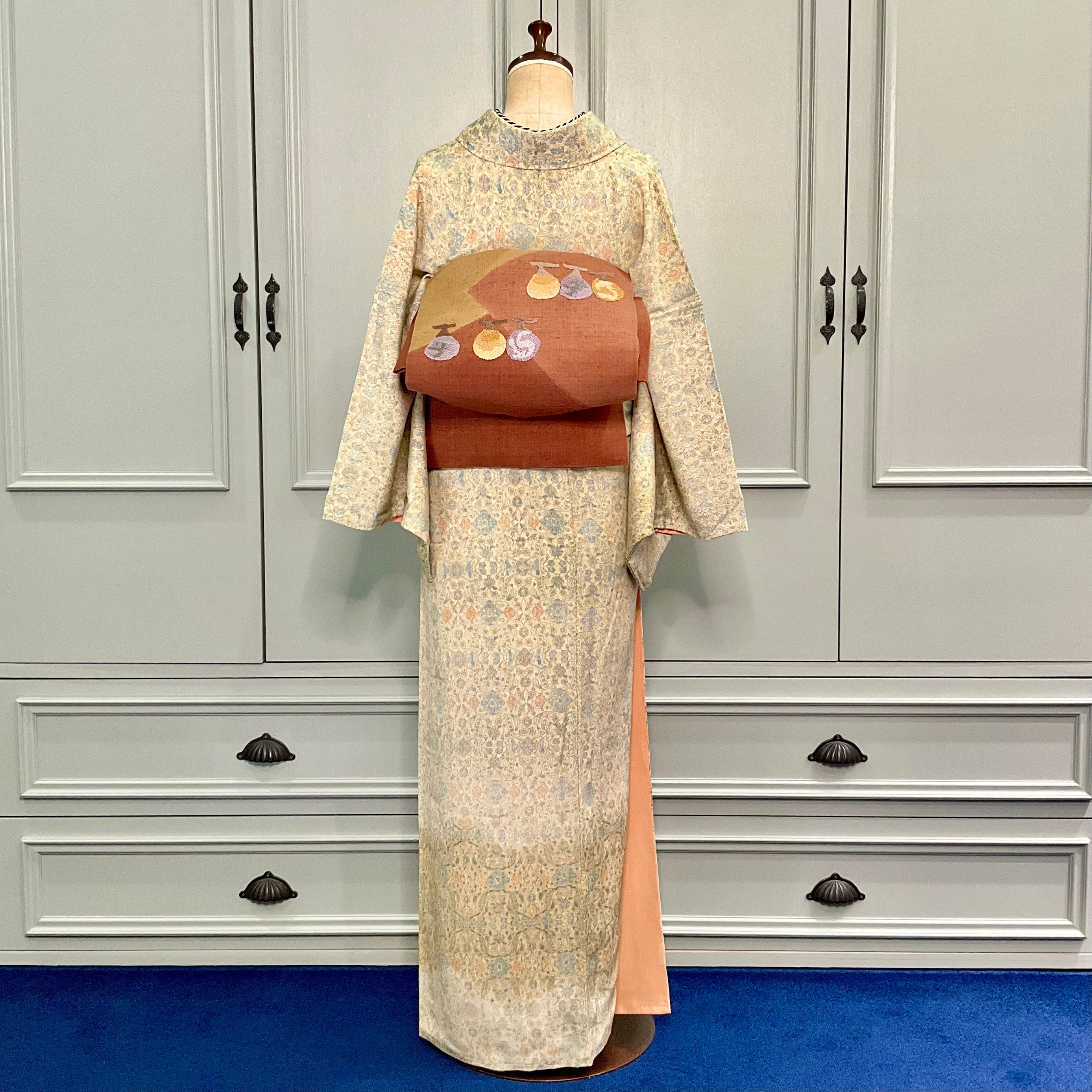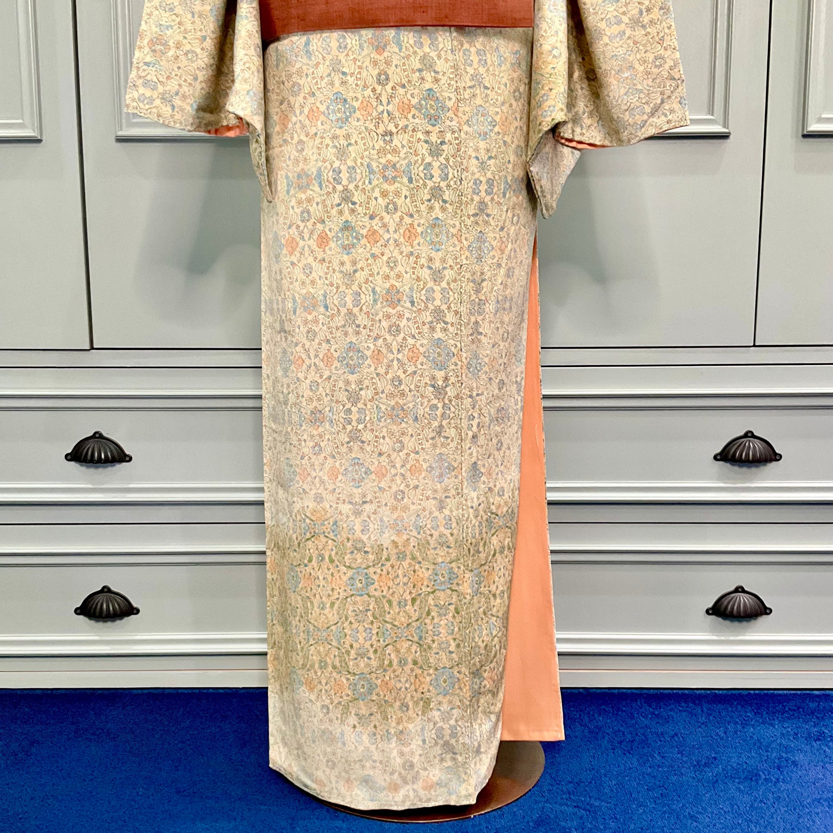 杏子色の地色に細やかな更紗模様が美しいカジュアル感のある付け下げ小紋着物です